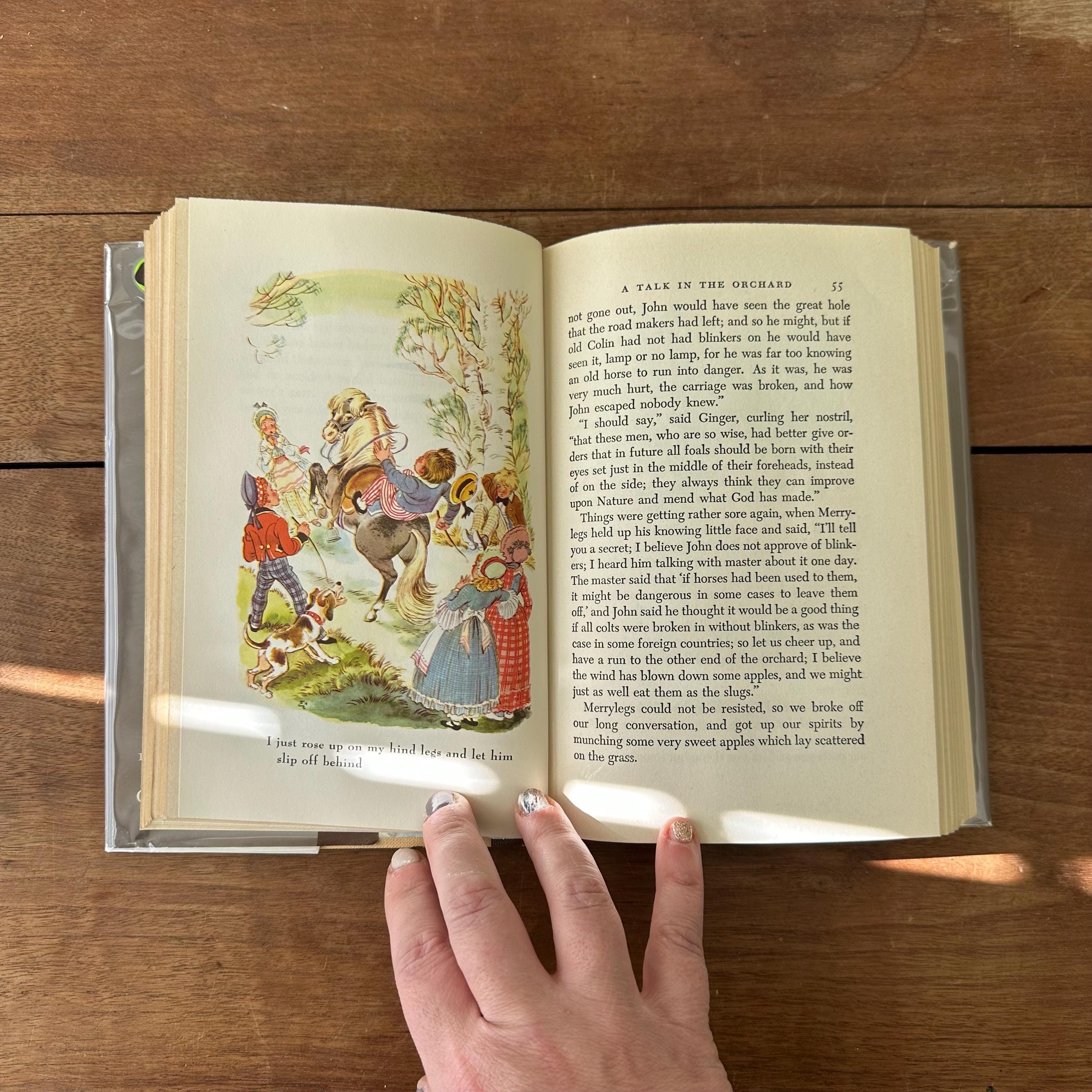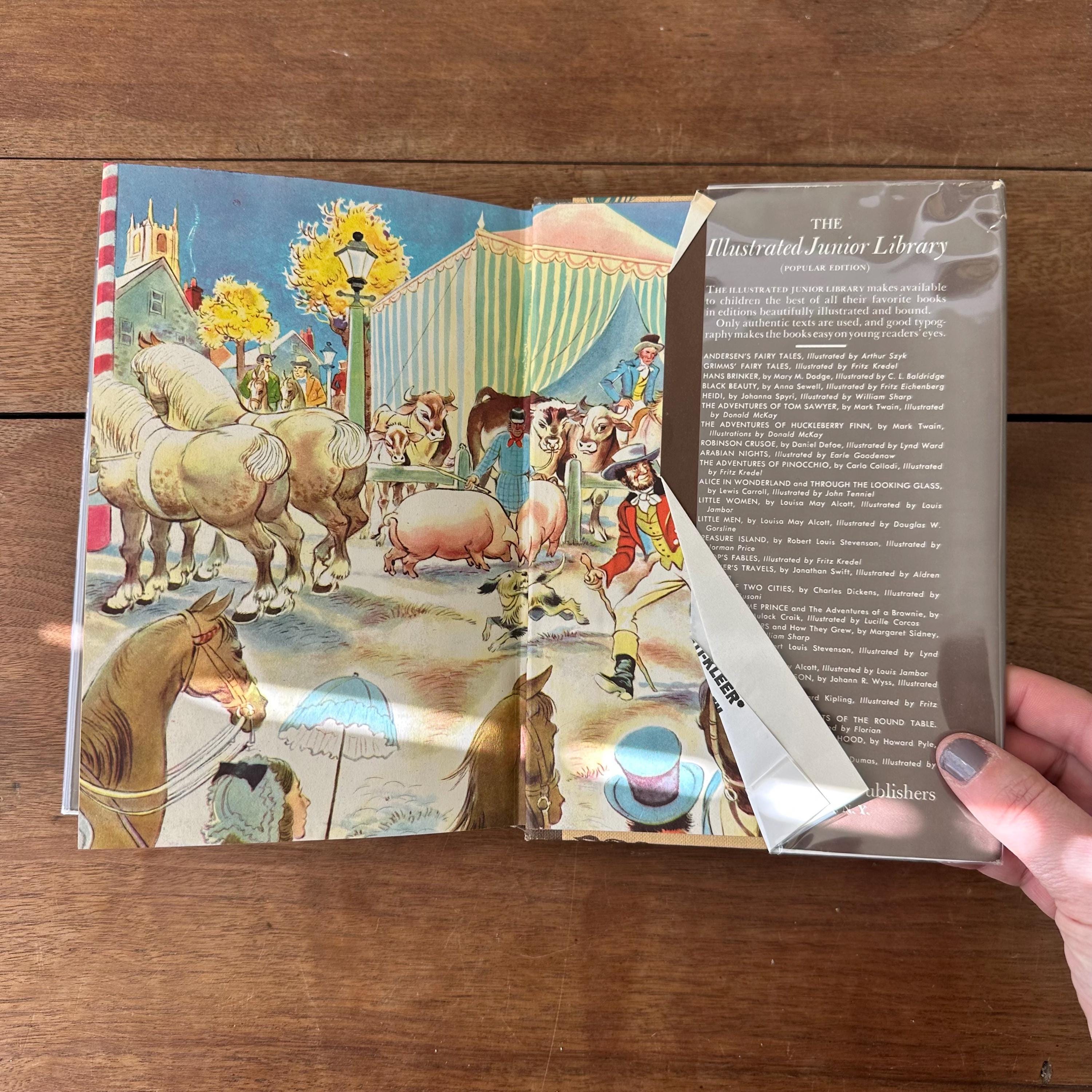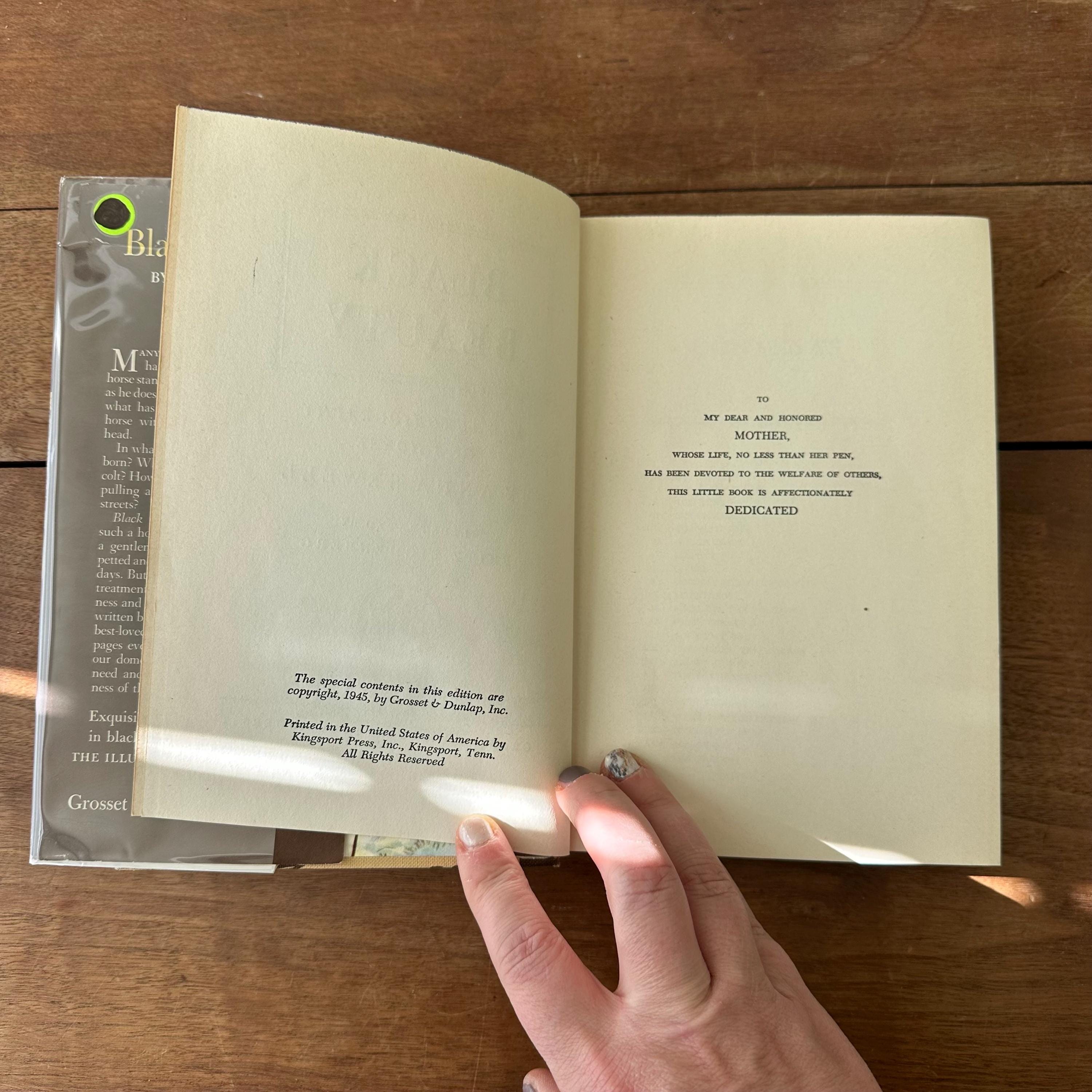This is the 1945 Illustrated Junior Library edition of Black Beauty by Anna Sewell, published by Grosset & Dunlap. It has its original full color dust jacket featuring an illustrated scene from the book that wraps to the spine. Underneath, the book has light and dark brown covers with a repeating turquoise horse head pattern. The end pages inside the inside front and back covers are also illustrated in color. The book is illustrated with black and white illustrations as well as full color illustration plates by Fritz Eichenberg. There are 288 pages.
