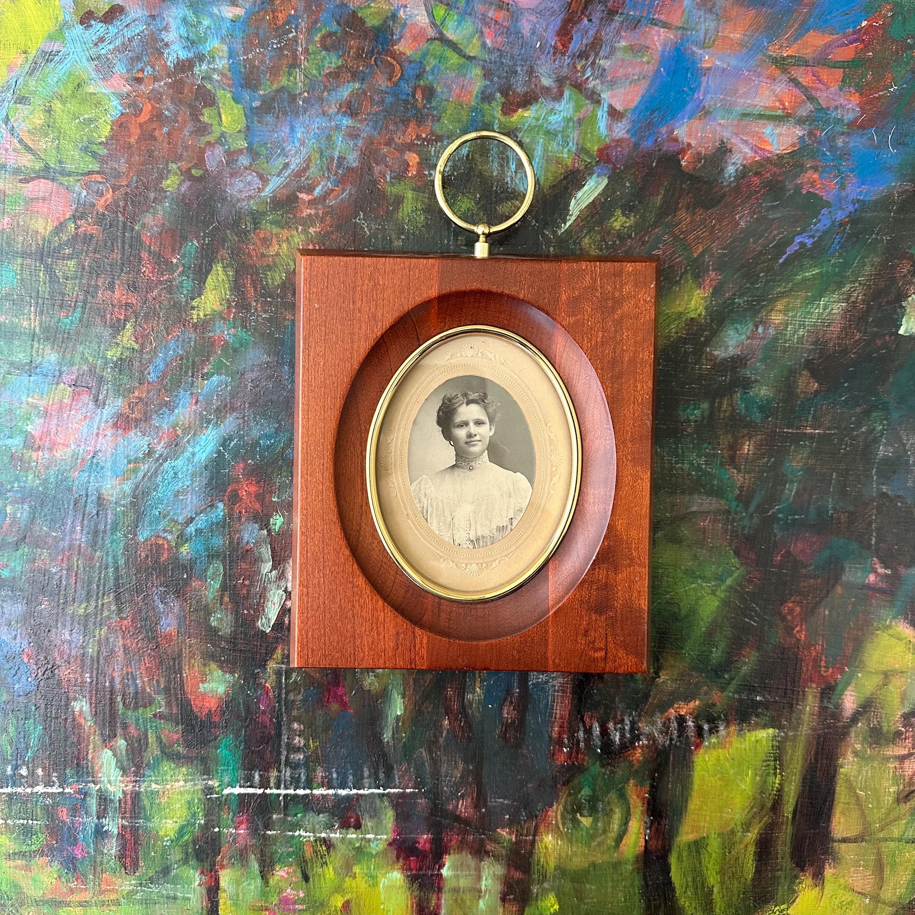 This is a walnut wood picture frame with an antique portrait. The frame is carved from a solid piece of walnut. The frame opening is oval and lined with brass. There is also a larger brass decorative hoop at the top of the frame. The frame has a glass cover and is attached to a grosgrain ribbon covered backing. The frame has a small brass hoop on the back to hang the frame as well as a kickstand to set the frame upright on a table. The frame will fit 3 x 4 inch items and currently has a black and white cabinet card photograph inside. The portrait is of a young girl in a white dress, probably from the 1900s-1910s.