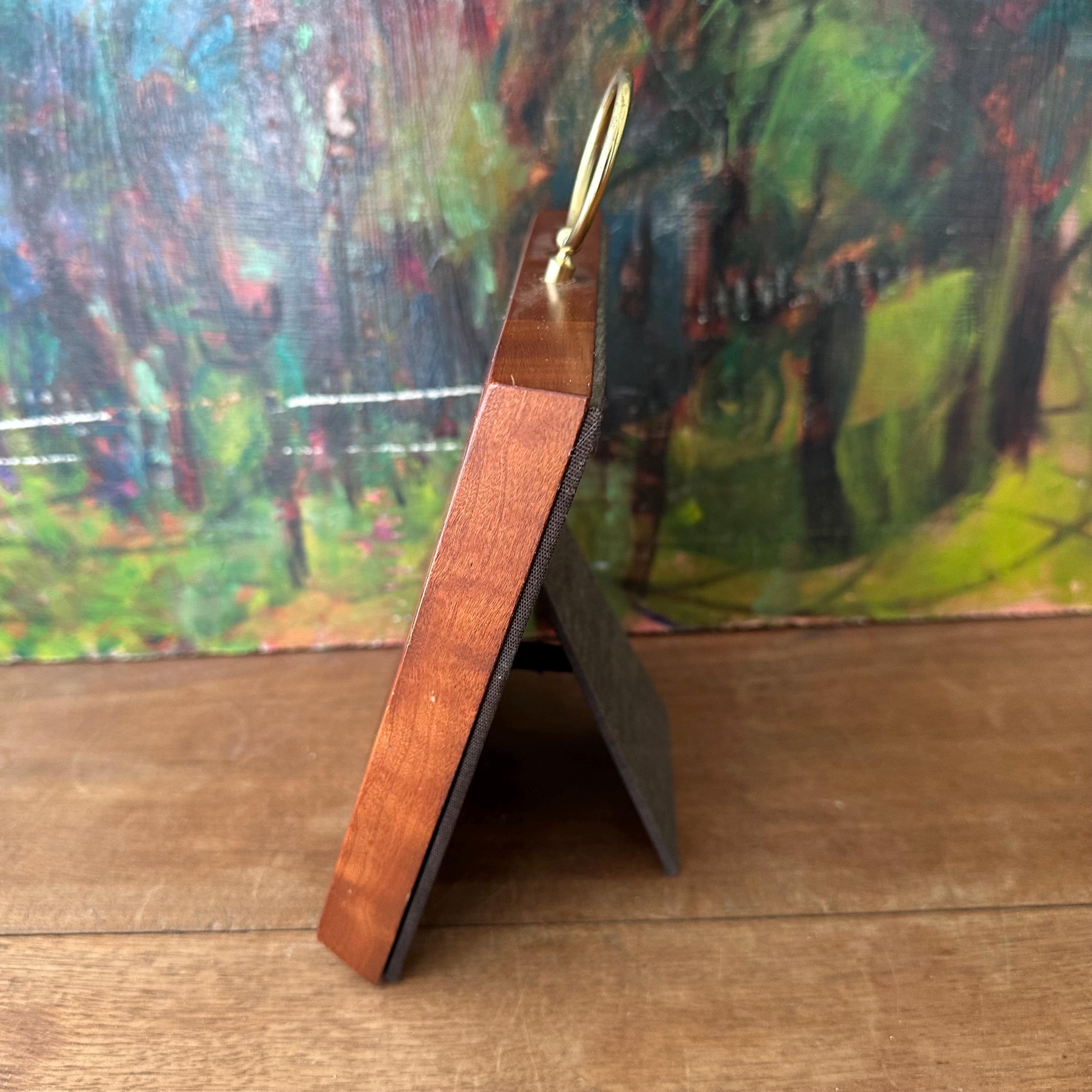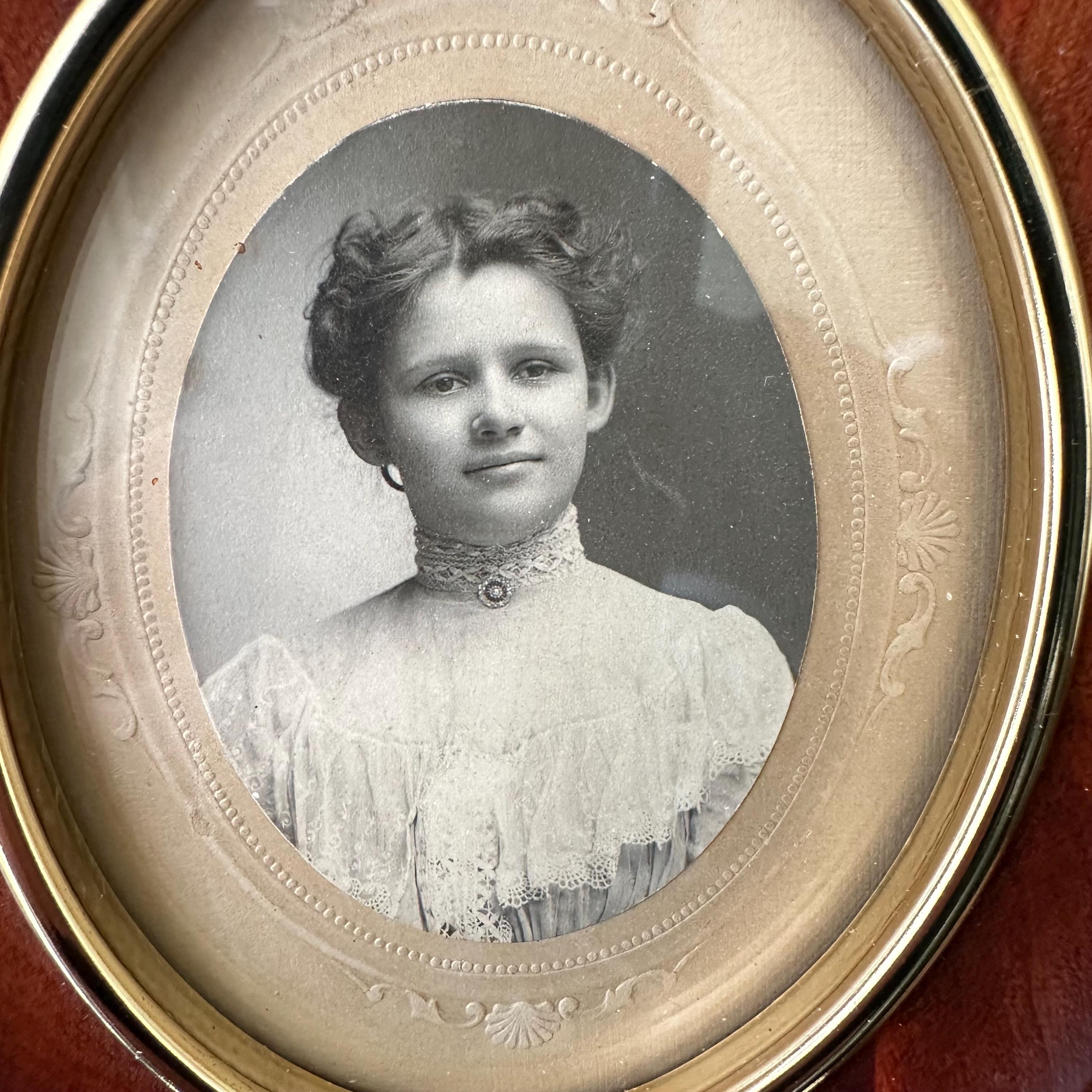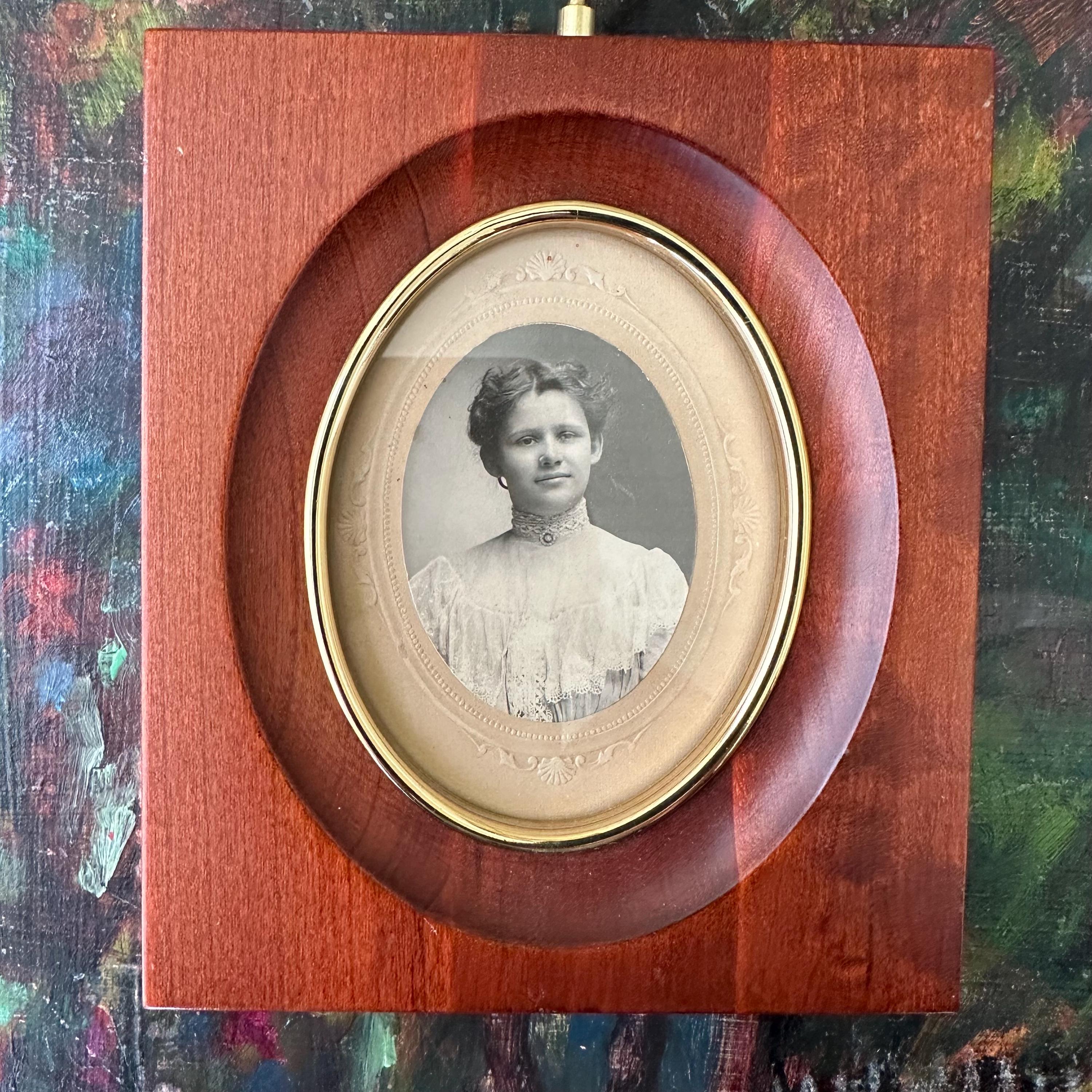 The frame is in excellent vintage condition for its age and use. The wood is intact and still glossy. There is an original dent to the wood to the right upper center. The portrait is in excellent condition. The brass loops are attached solidly. There is a brass tab at the bottom of the frame that I think is to take the photo out, but I have not figured out how to make it work. The top quarter of the backing is nailed down, and the kickstand is still attached and works well.