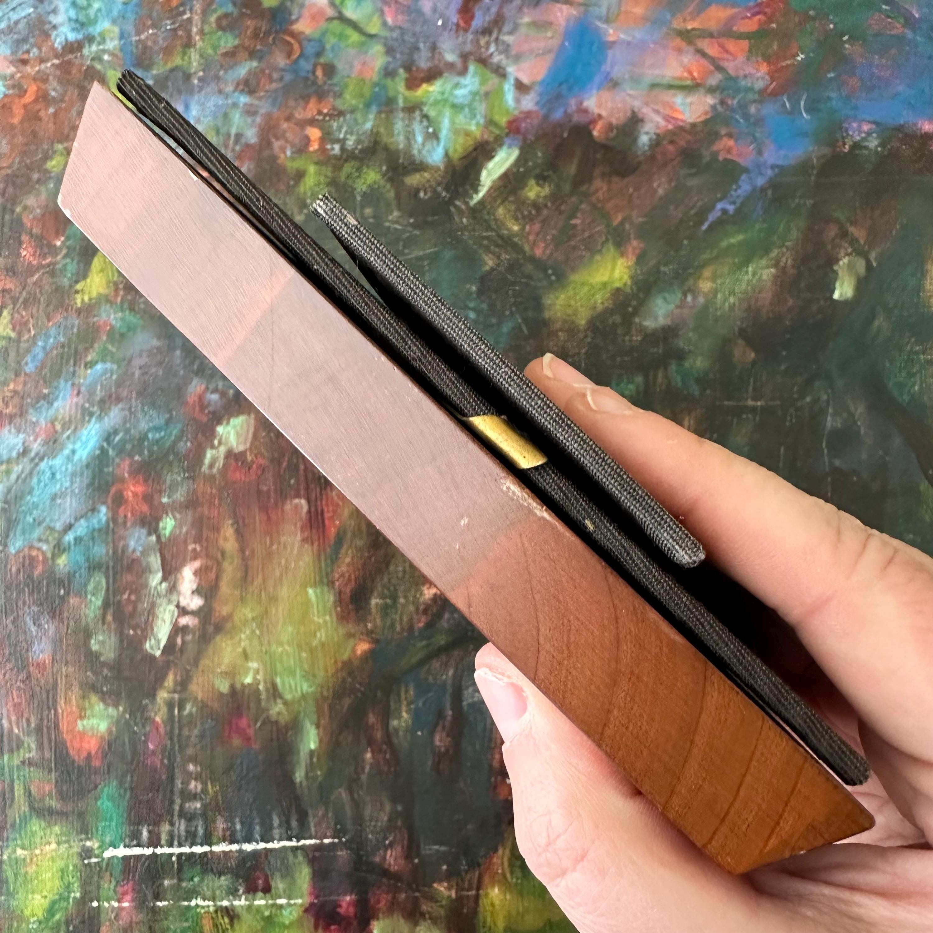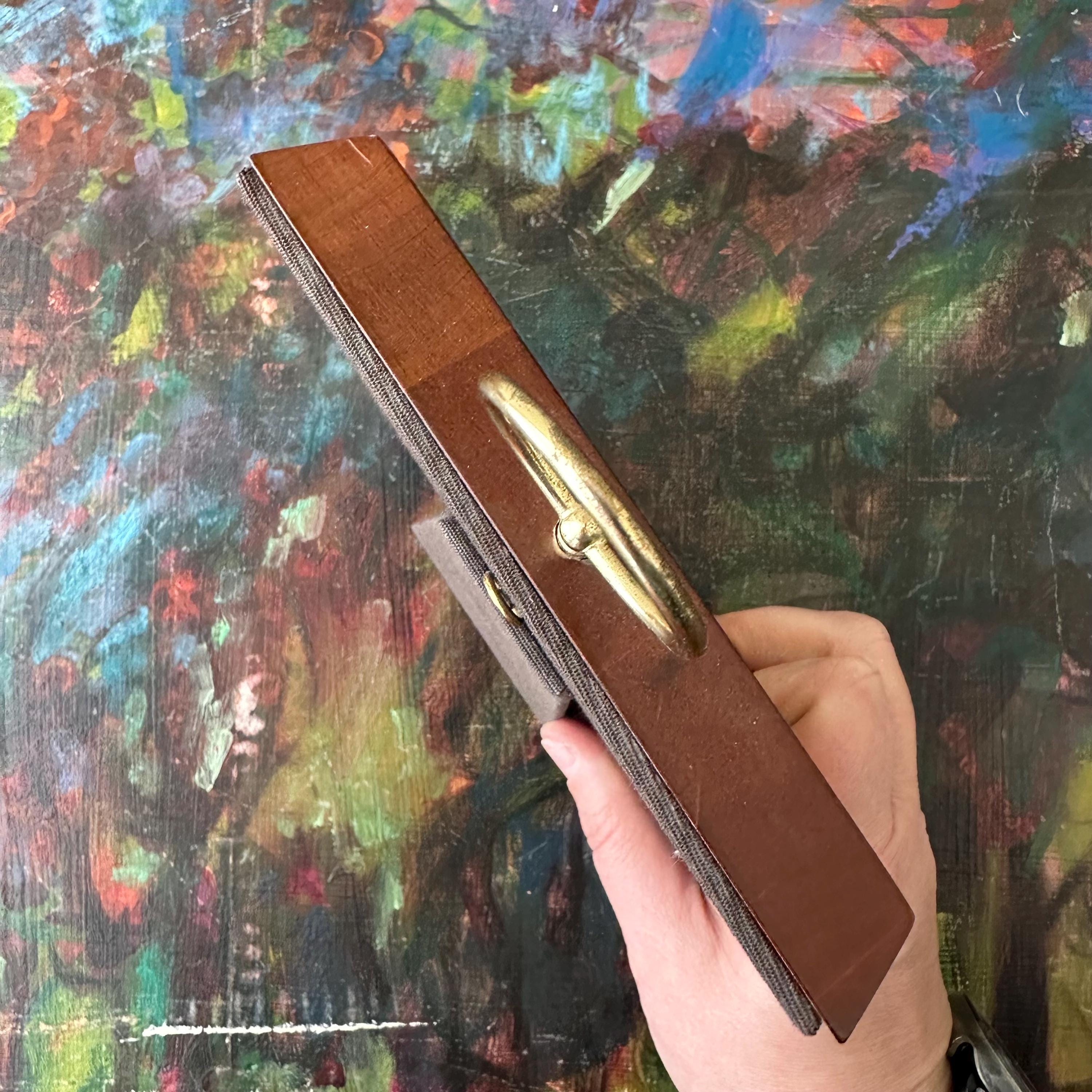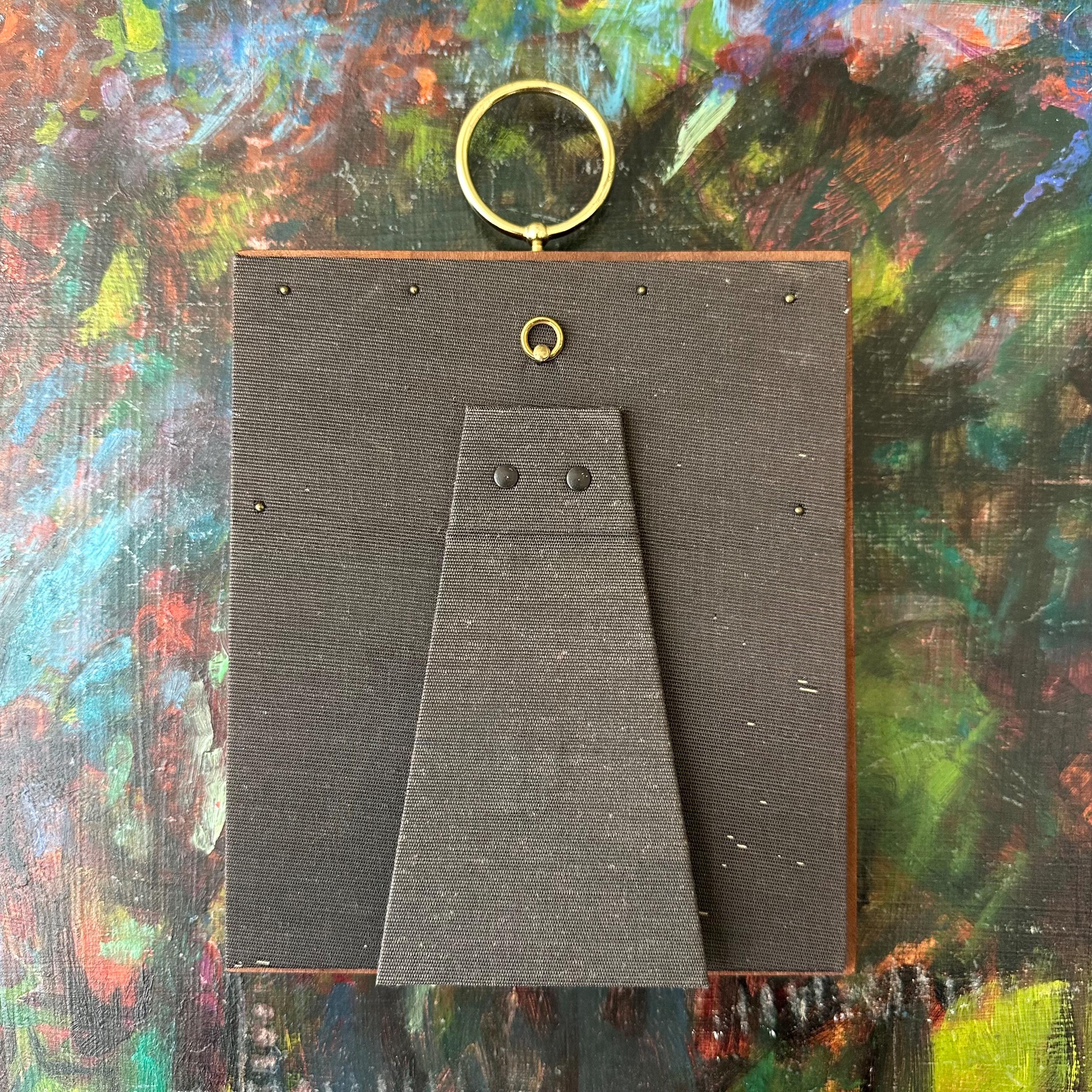 The frame is in excellent vintage condition for its age and use. The wood is intact and still glossy. There is an original dent to the wood to the right upper center. The portrait is in excellent condition. The brass loops are attached solidly. There is a brass tab at the bottom of the frame that I think is to take the photo out, but I have not figured out how to make it work. The top quarter of the backing is nailed down, and the kickstand is still attached and works well.