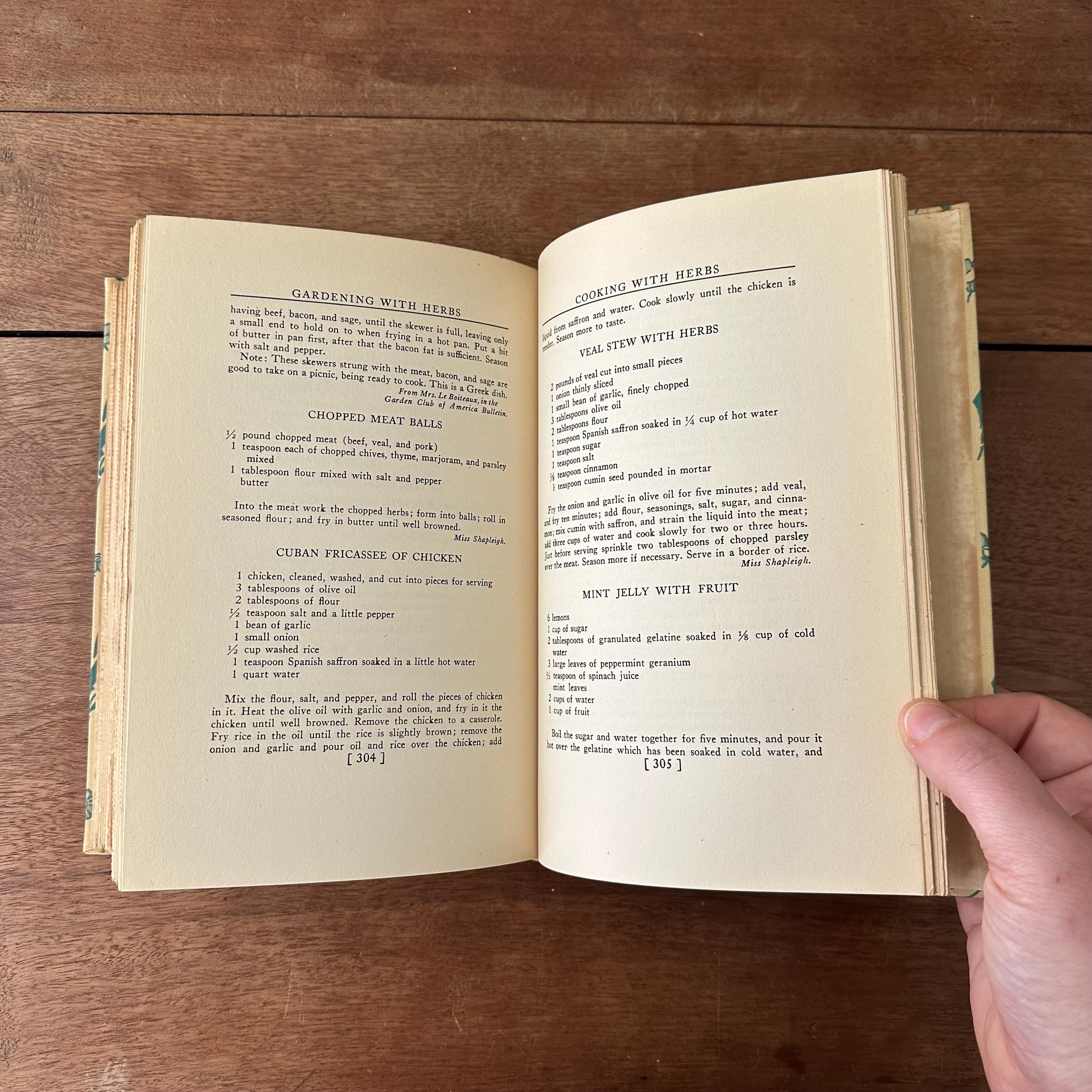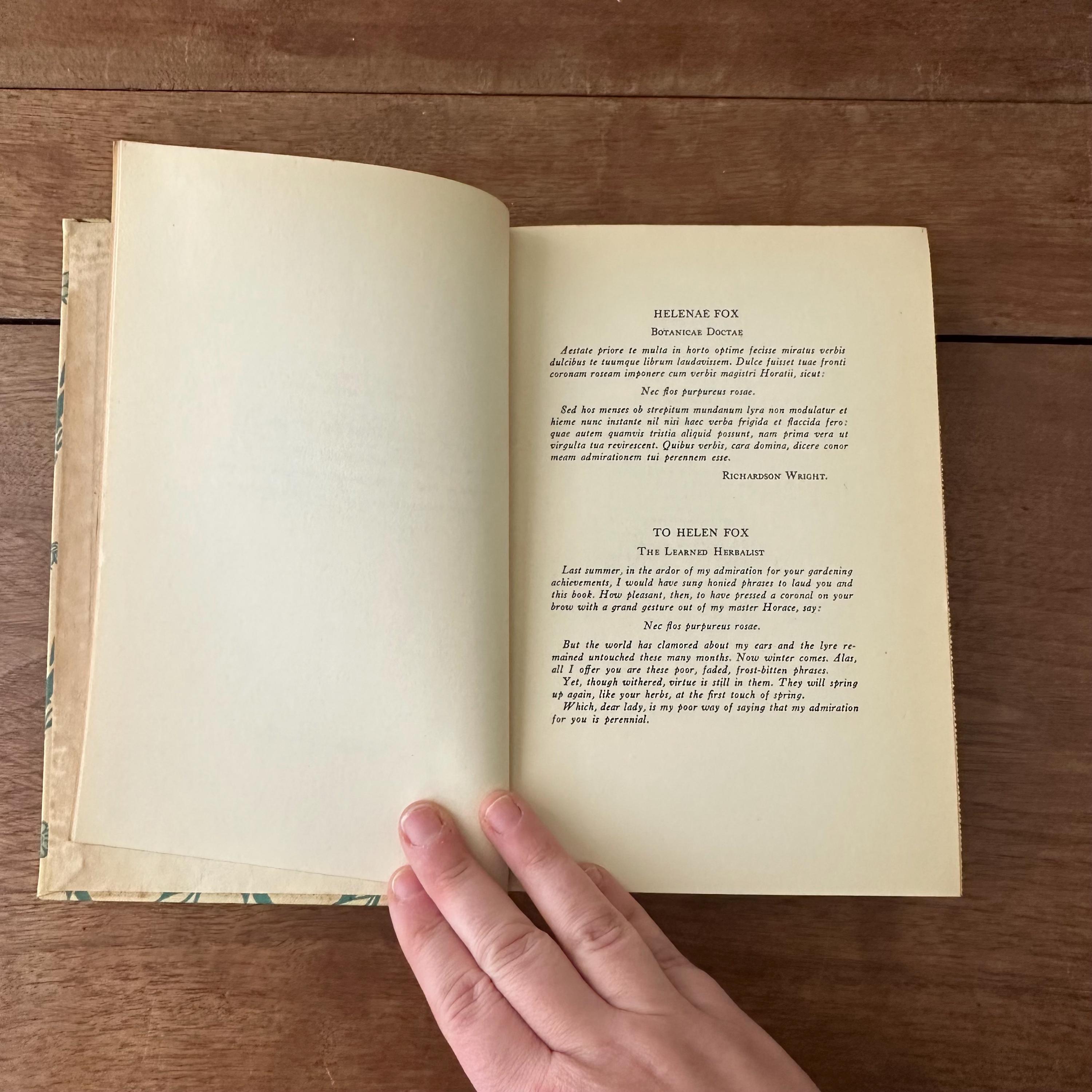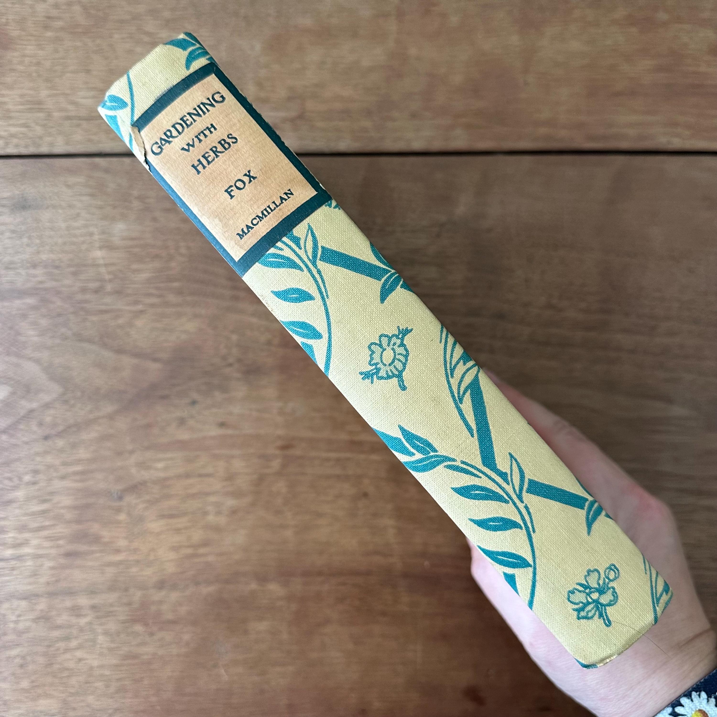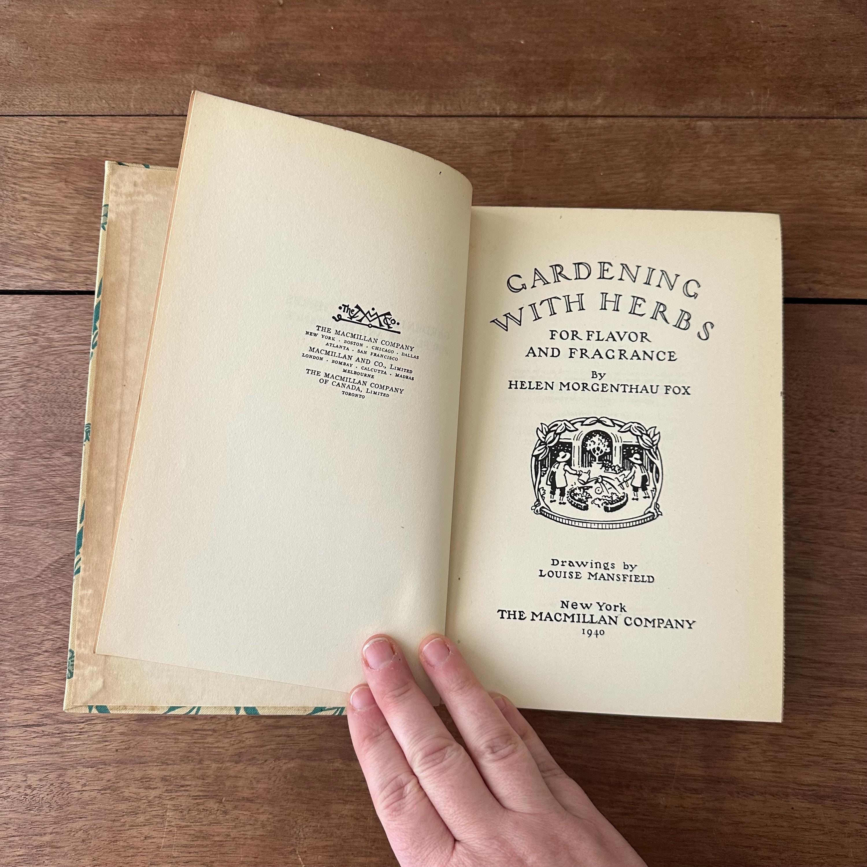 This is the 1940 edition of Gardening with Herbs for Flavor and Fragrance by Helen Morganthau Fox with drawings by Louise Mansfield, published by The MacMillan Company. It has cream colored covers with a repeating trellis and leaf pattern. In the center of the trellis diamonds are small flowers. The spine has a paper label with the title and author. The book is illustrated with black and white drawings by Mansfield. The book is divided into three sections - a gardening guide, an herbal encyclopedia, and a cookbook. There are 334 pages.