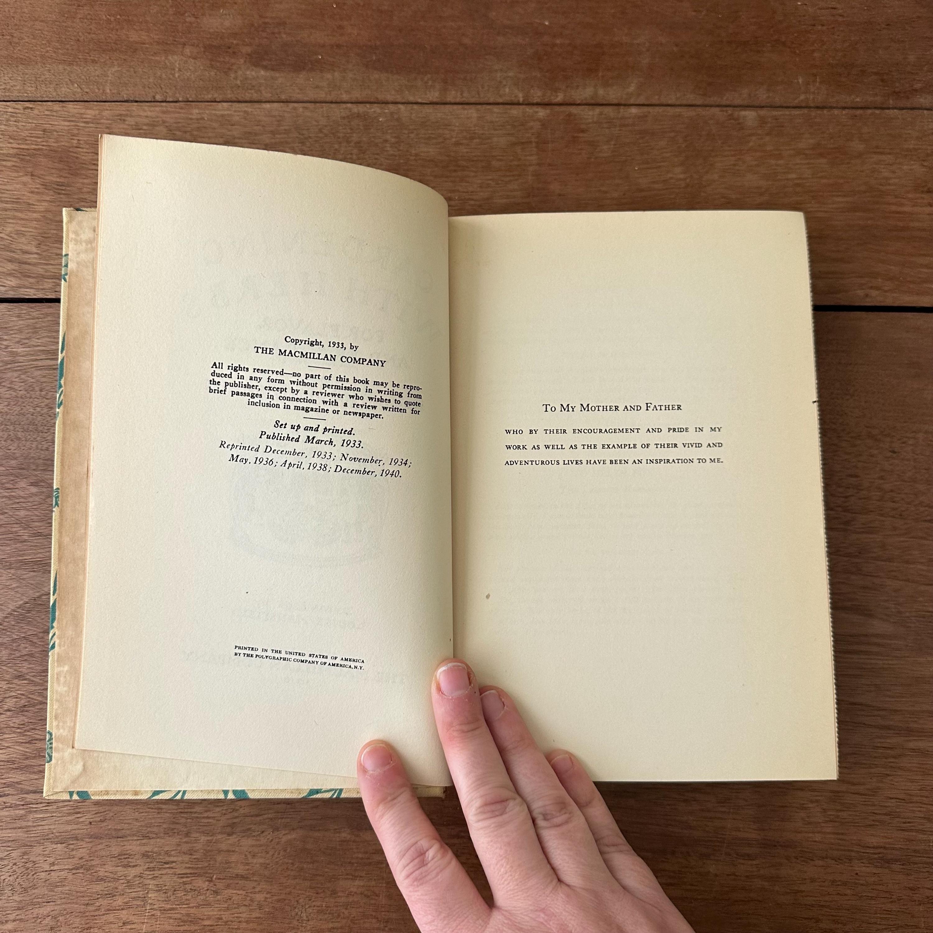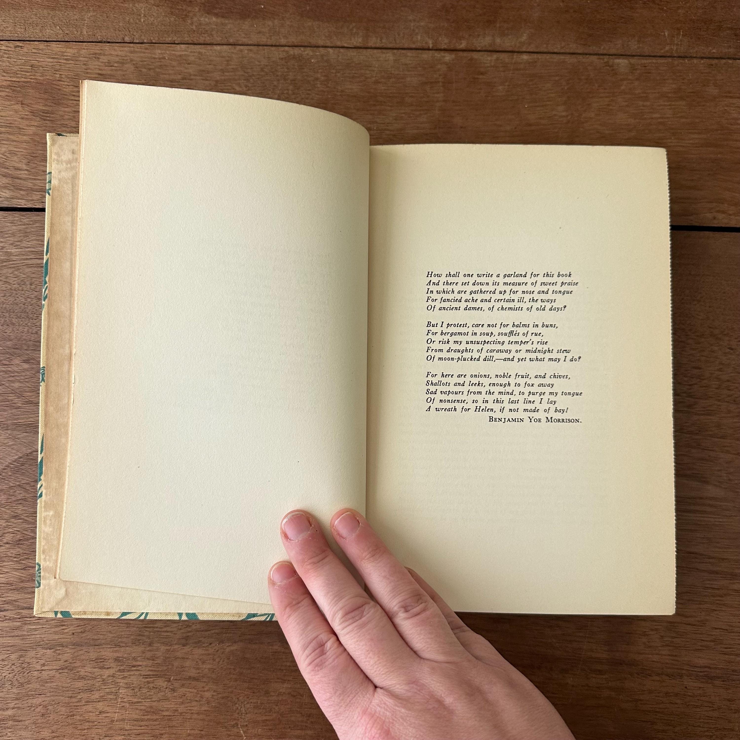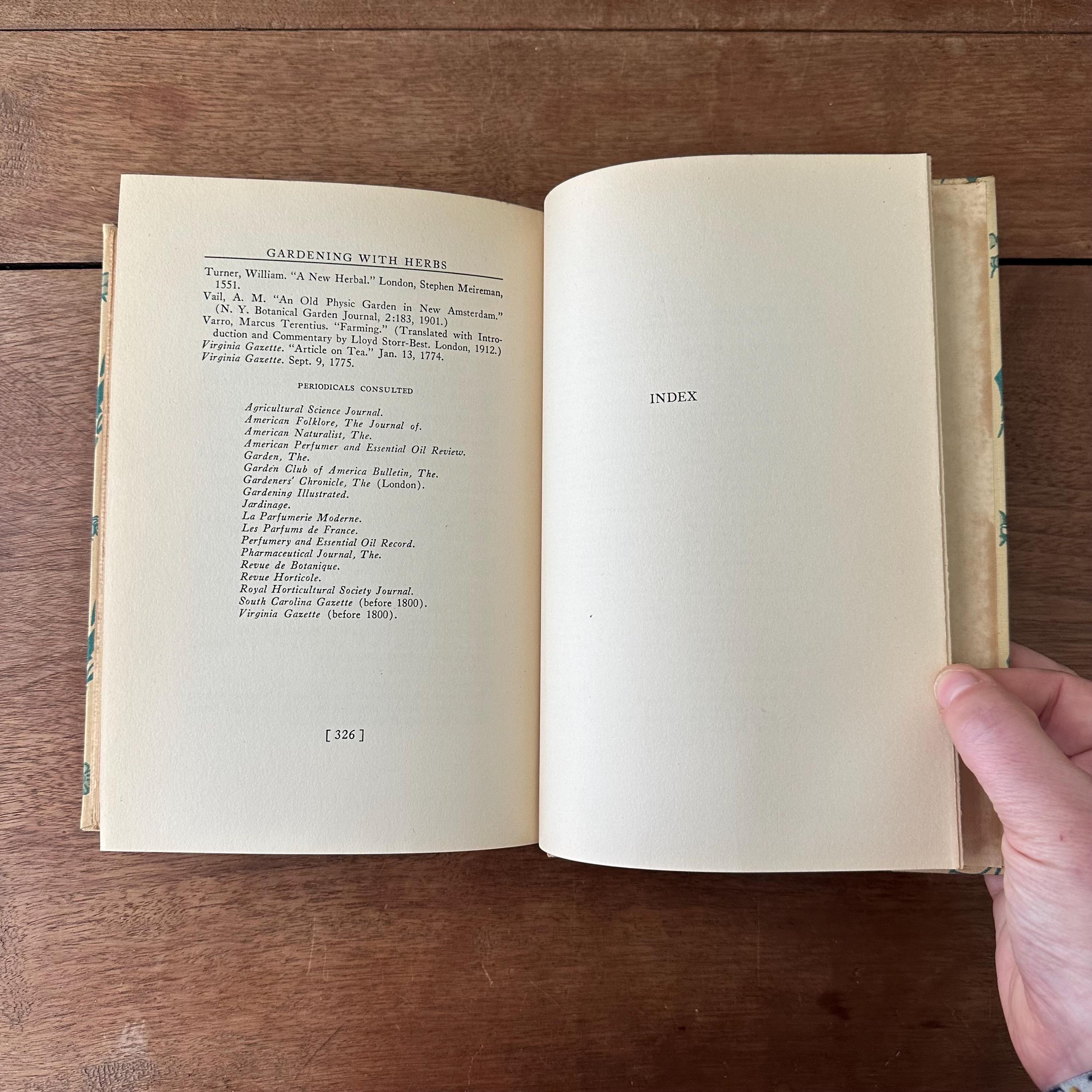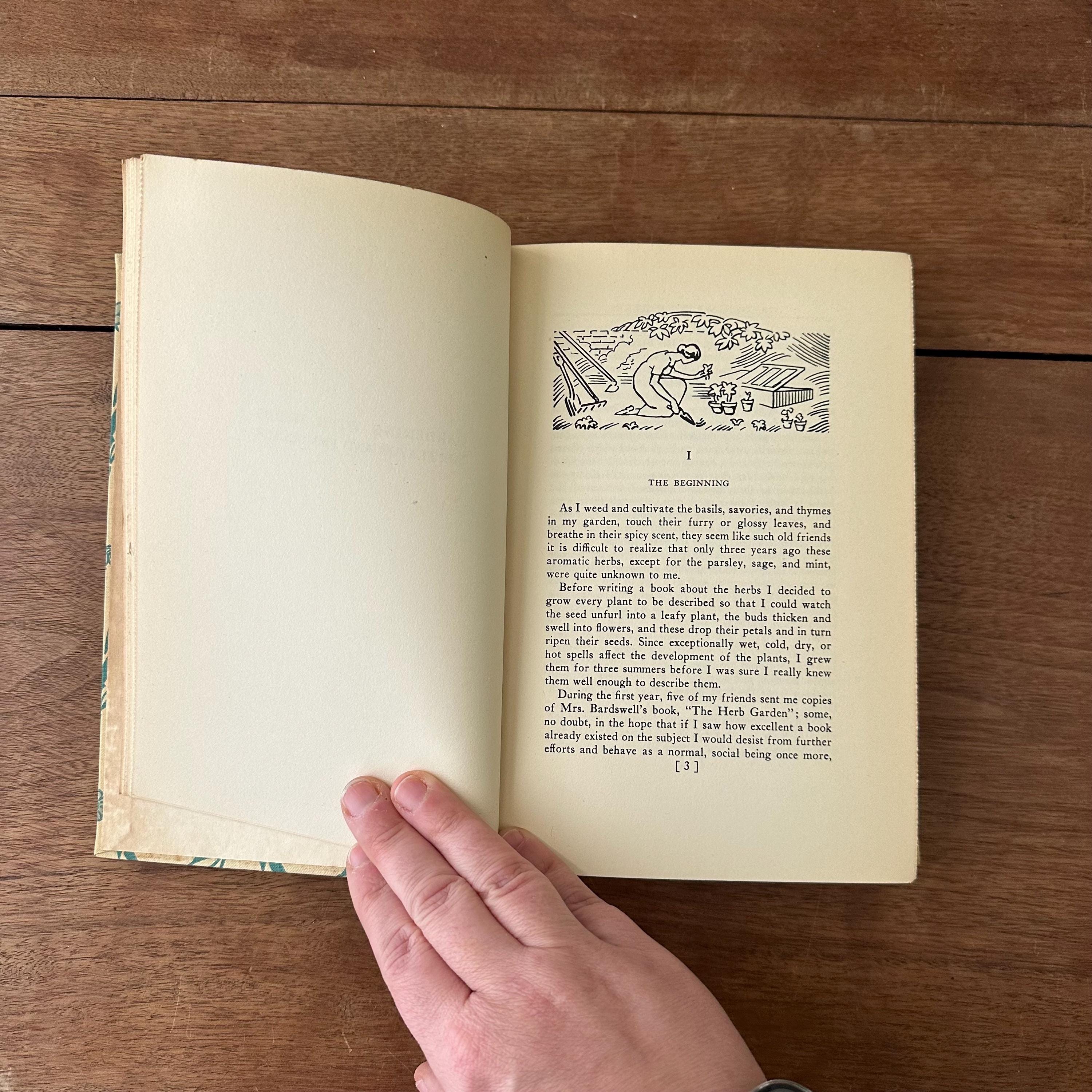This is the 1940 edition of Gardening with Herbs for Flavor and Fragrance by Helen Morganthau Fox with drawings by Louise Mansfield, published by The MacMillan Company. It has cream colored covers with a repeating trellis and leaf pattern. In the center of the trellis diamonds are small flowers. The spine has a paper label with the title and author. The book is illustrated with black and white drawings by Mansfield. The book is divided into three sections - a gardening guide, an herbal encyclopedia, and a cookbook. There are 334 pages.