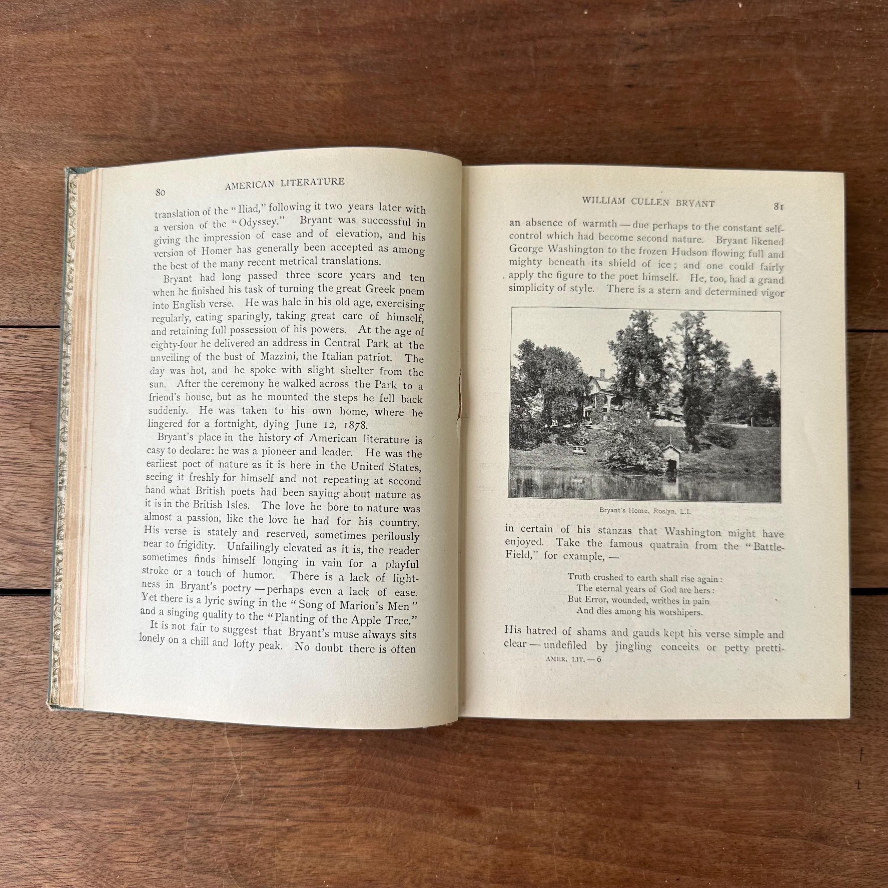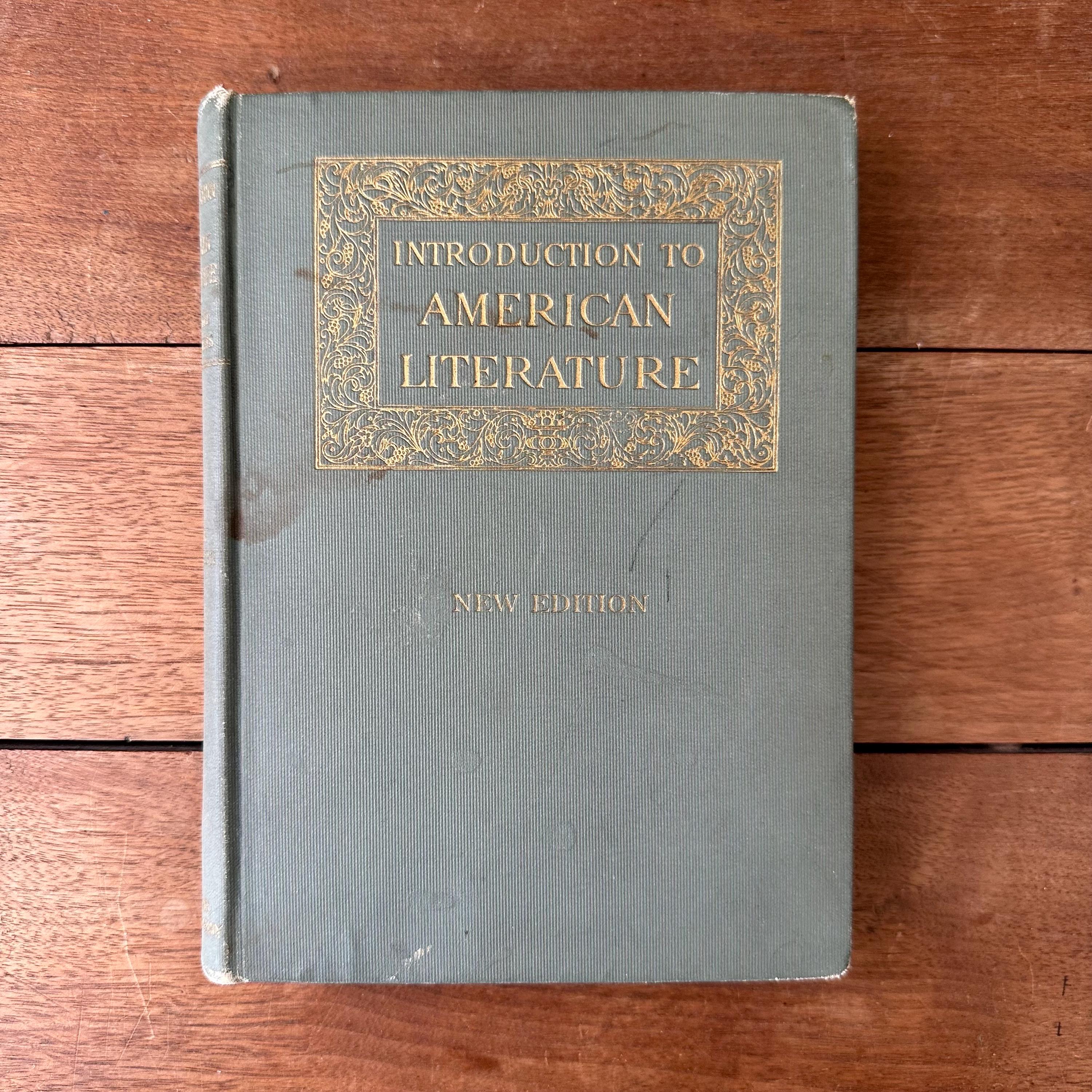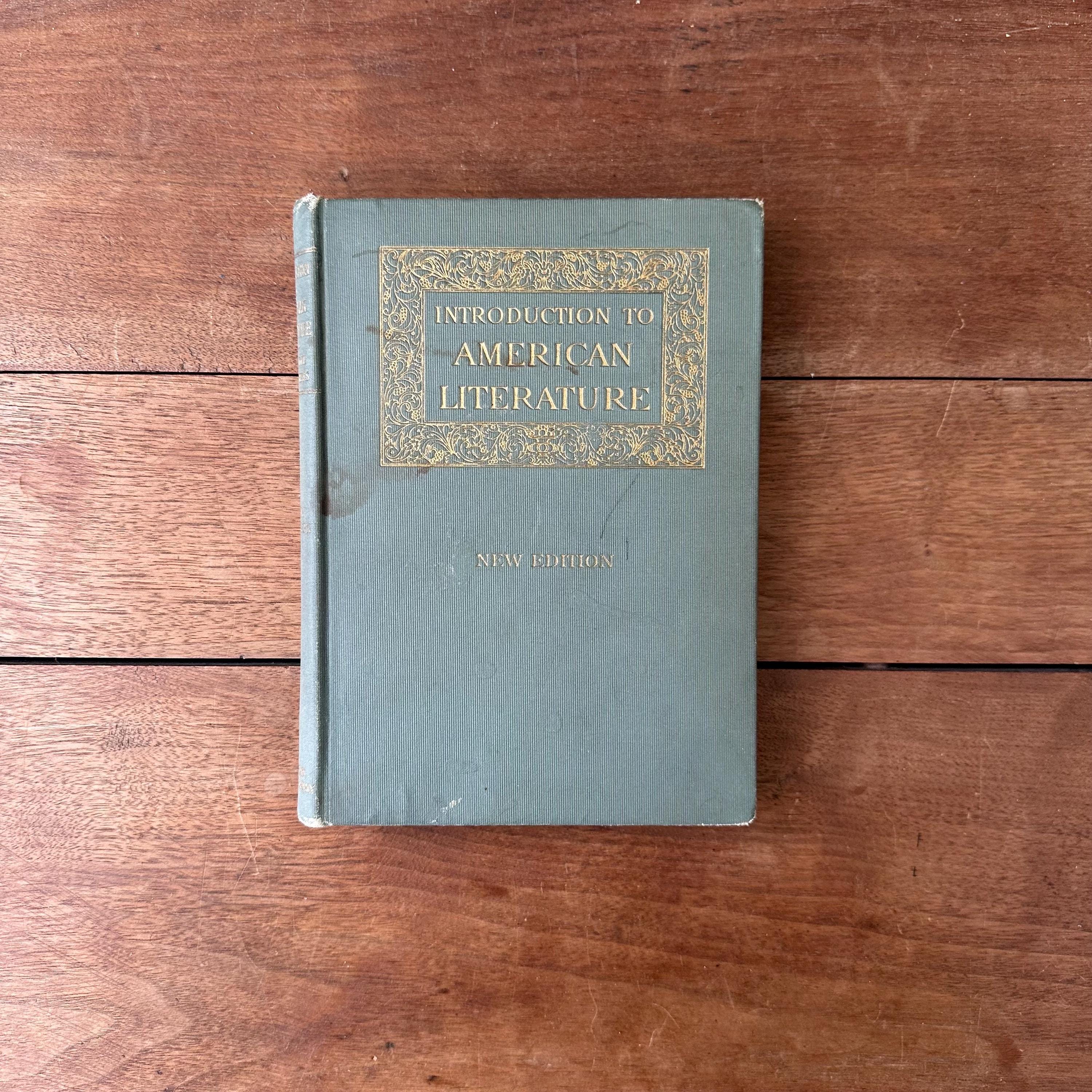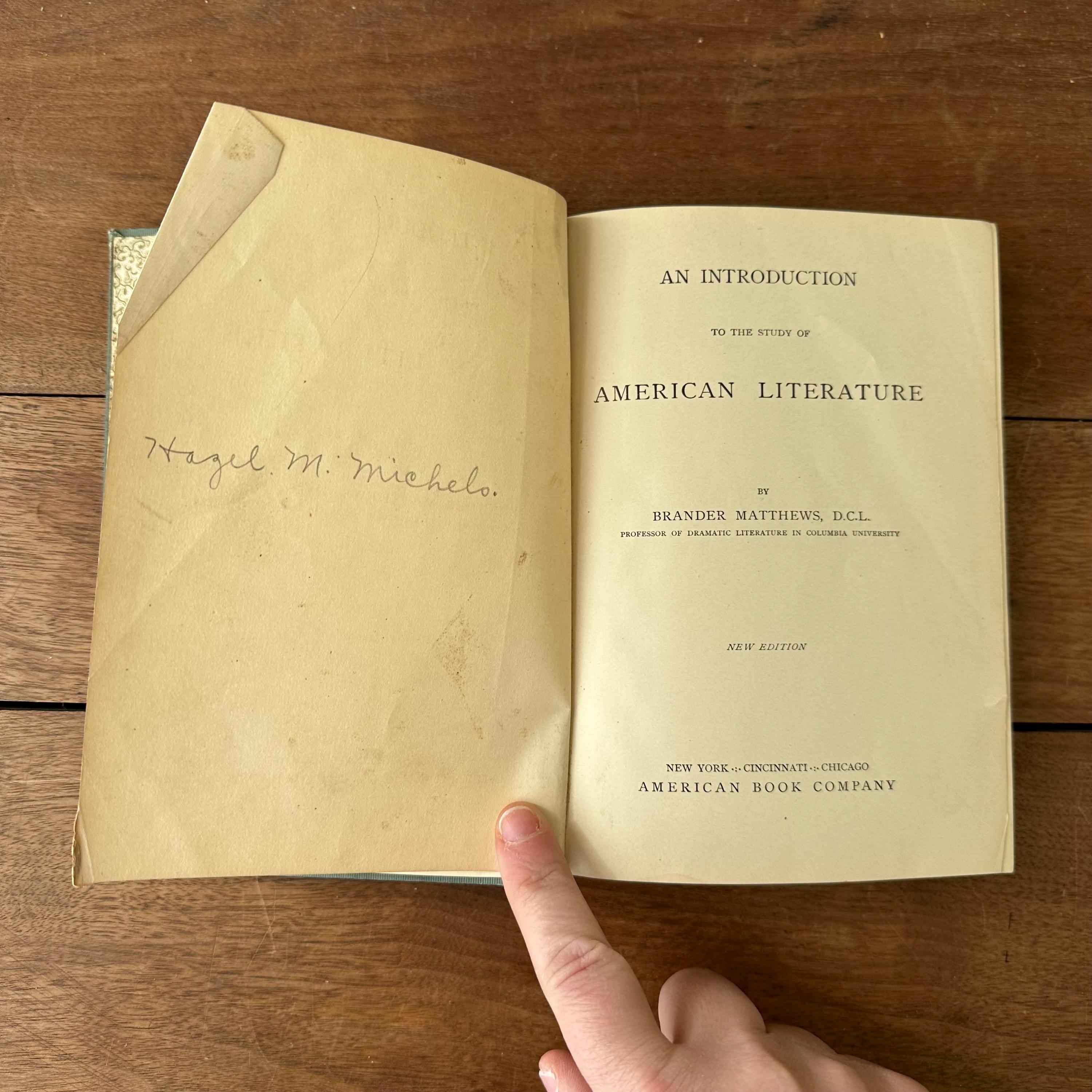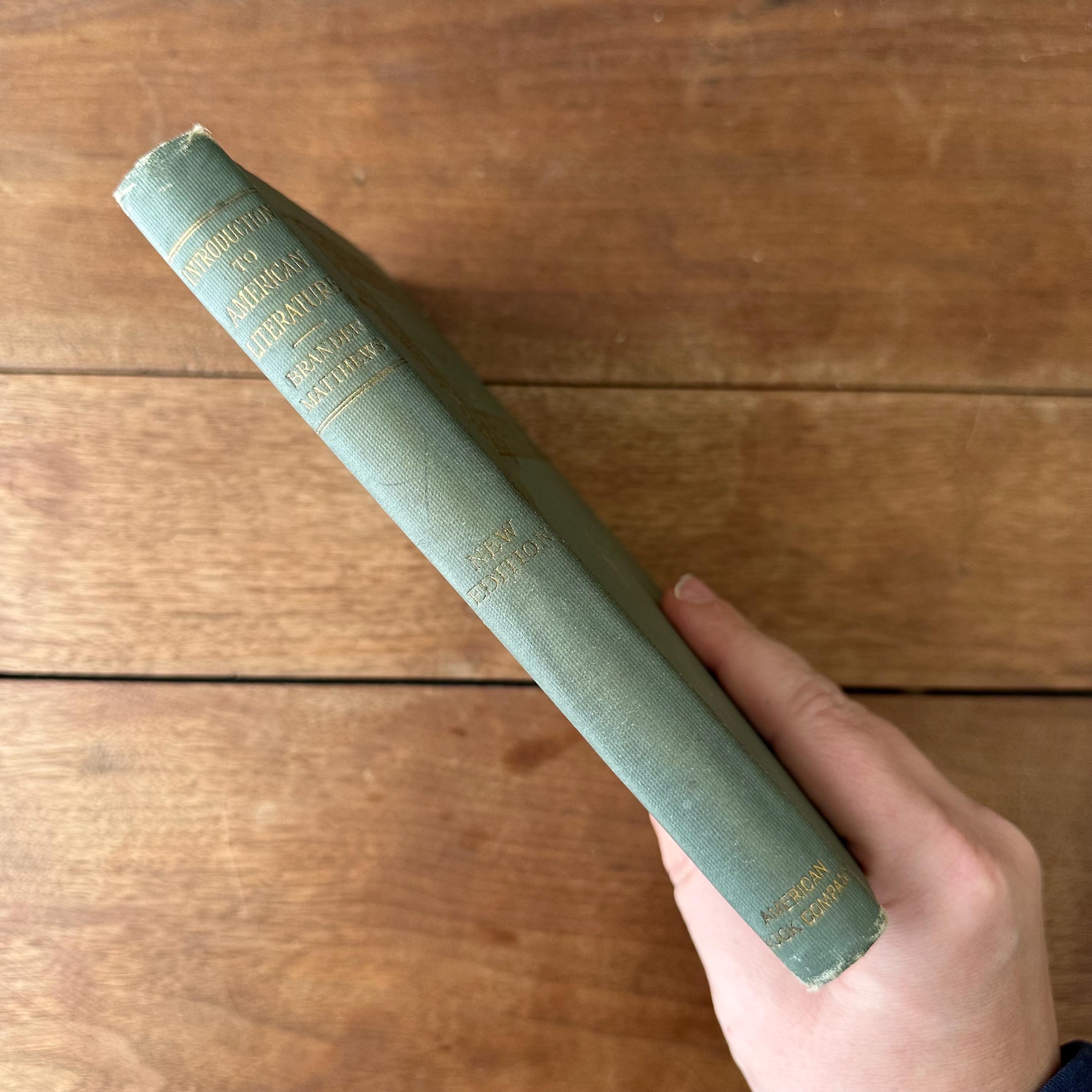 This is the antique 1911 New Edition of An Introduction to American Literature by Brander Matthews, published by The American Book Company. The book has light slate blue covers with gold lettering inside a gold floral border on the cover. The spine is also lettered in gold. The endpapers are an allover gold abstract pattern. The book is illustrated with black and white portraits and photographs, as well as reprinted original documents from classic American authors like Poe, Longfellow, and Thoreau. There are 269 pages with 3 addition pages of advertisements at the end.
