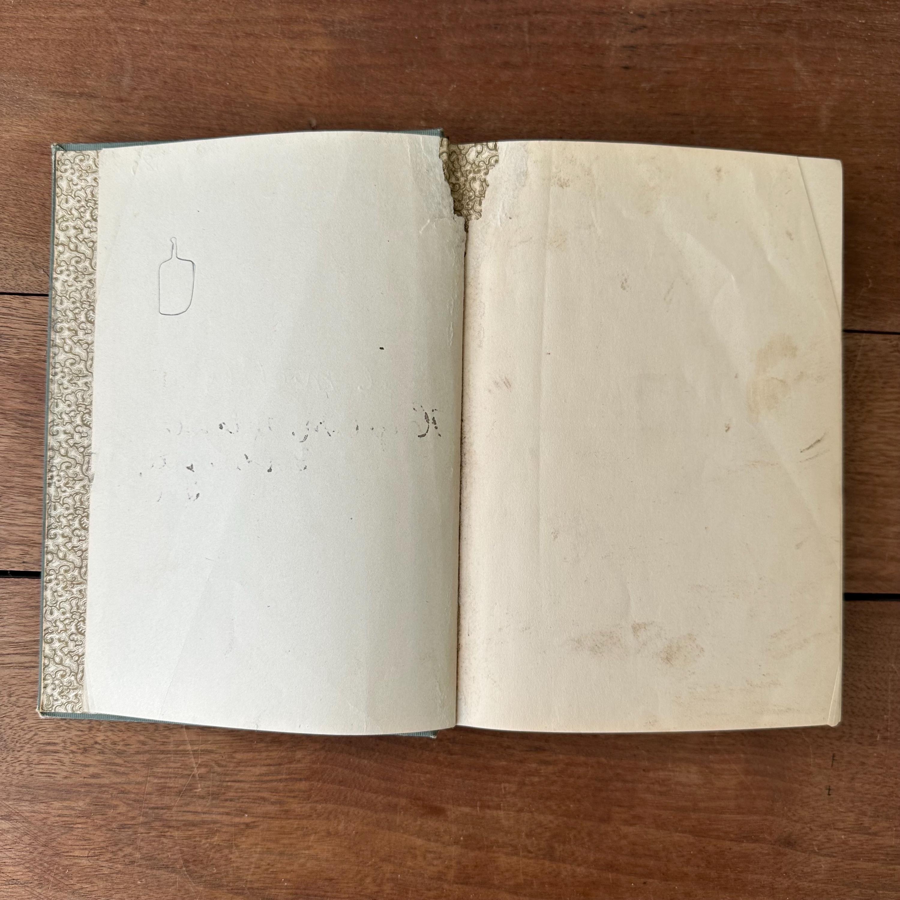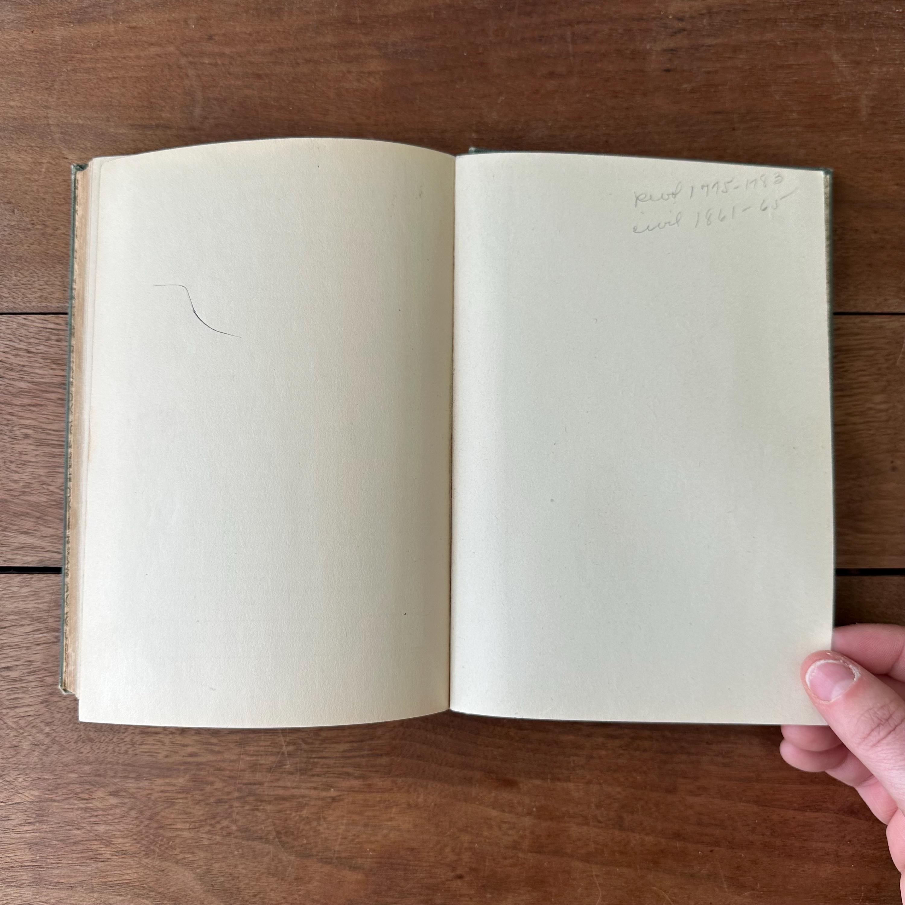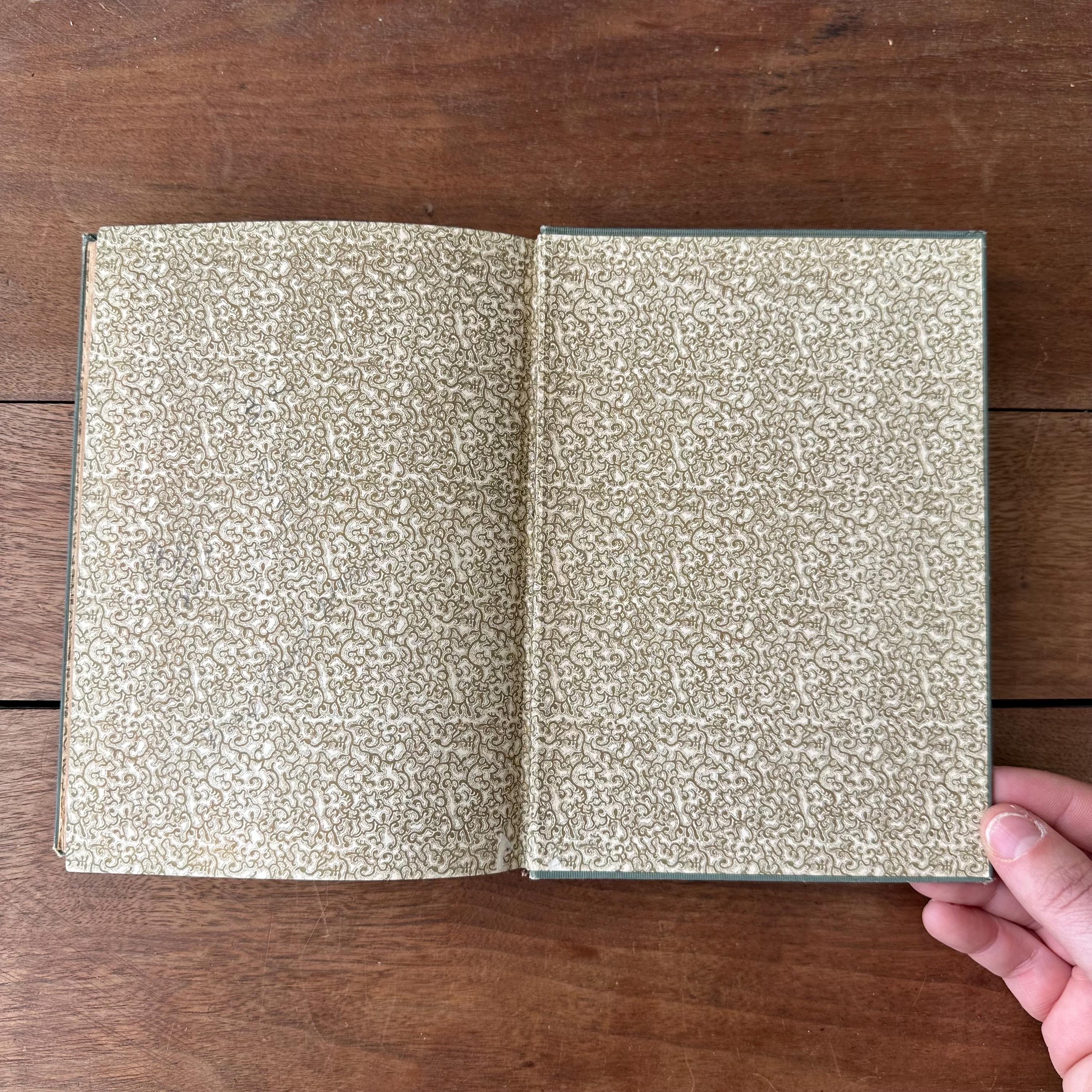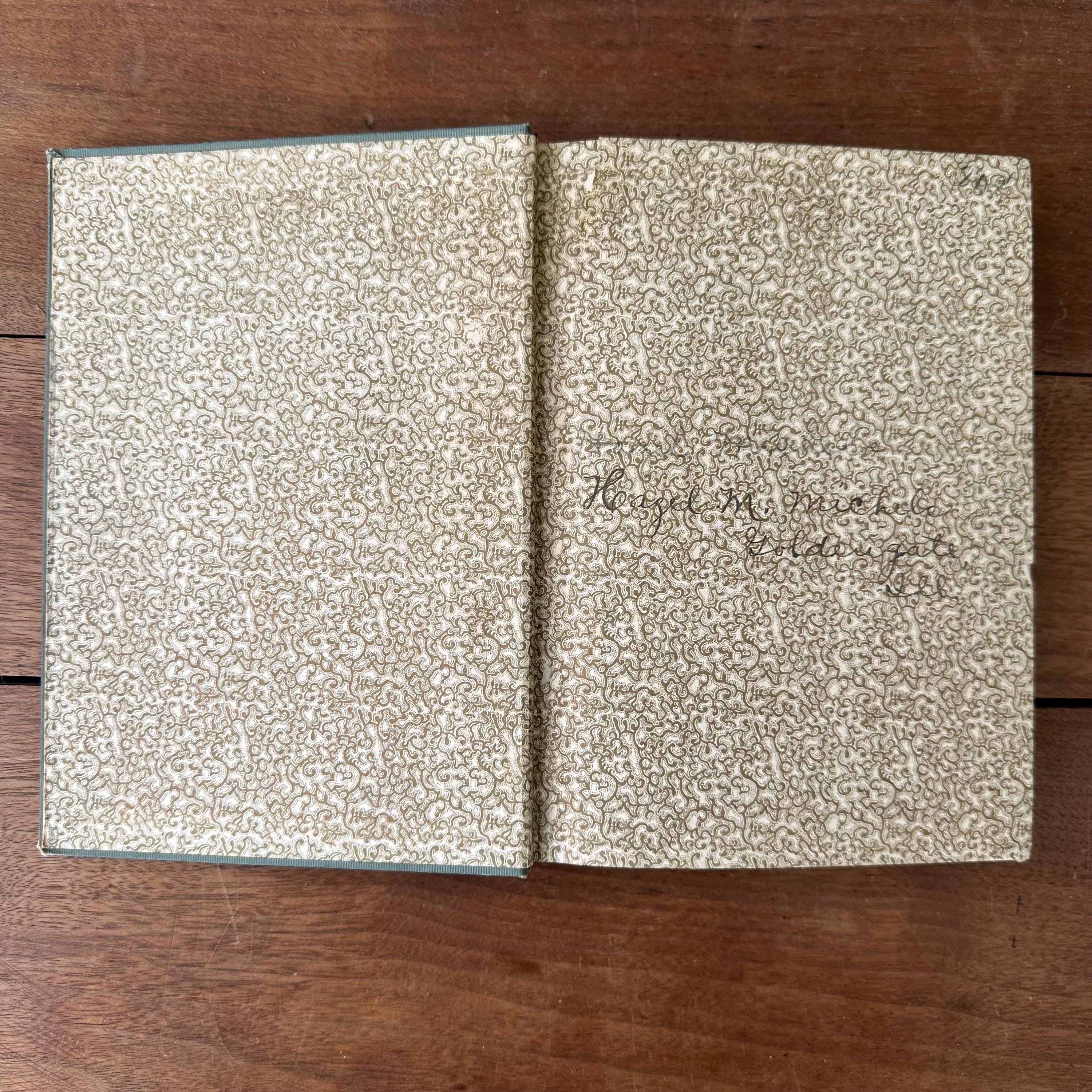 The book is in good antique condition for its age and use. The covers have some staining and discoloration with fraying to corner ends and spine. The gold lettering on both cover and spine is intact and bright. There is an ink inscription inside the front cover and the endpaper page is torn at the top. The spines are attached. The pages are yellowed with some foxing.