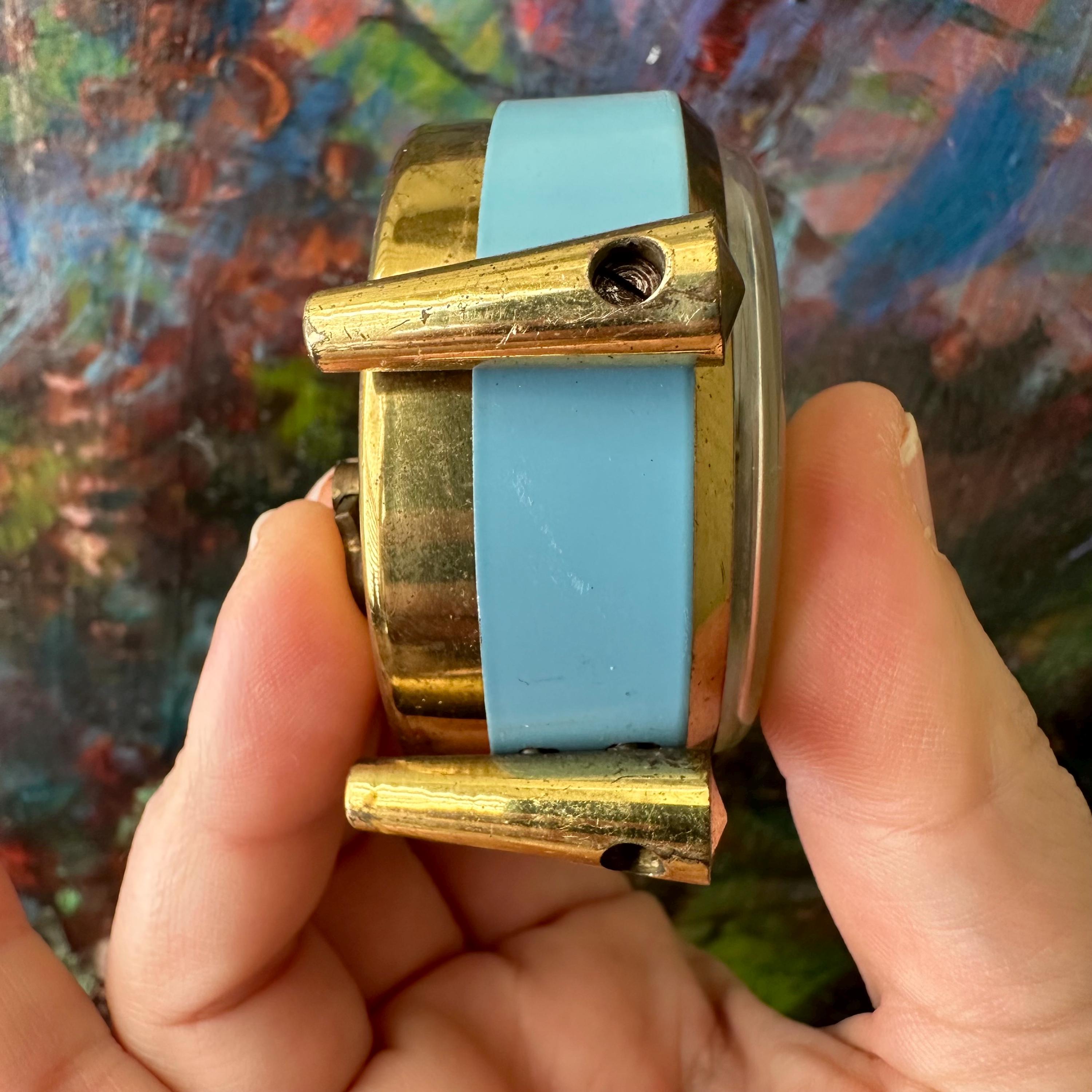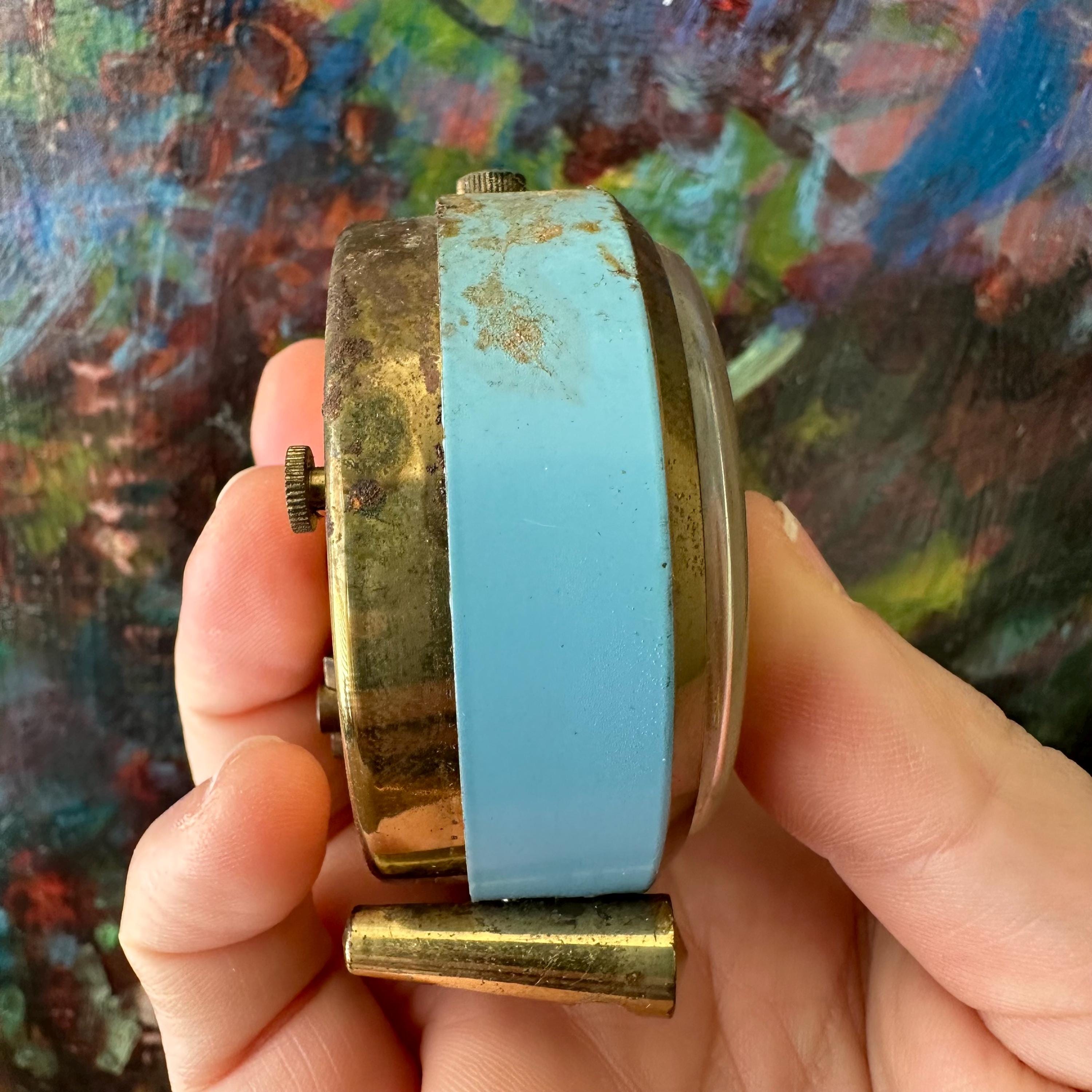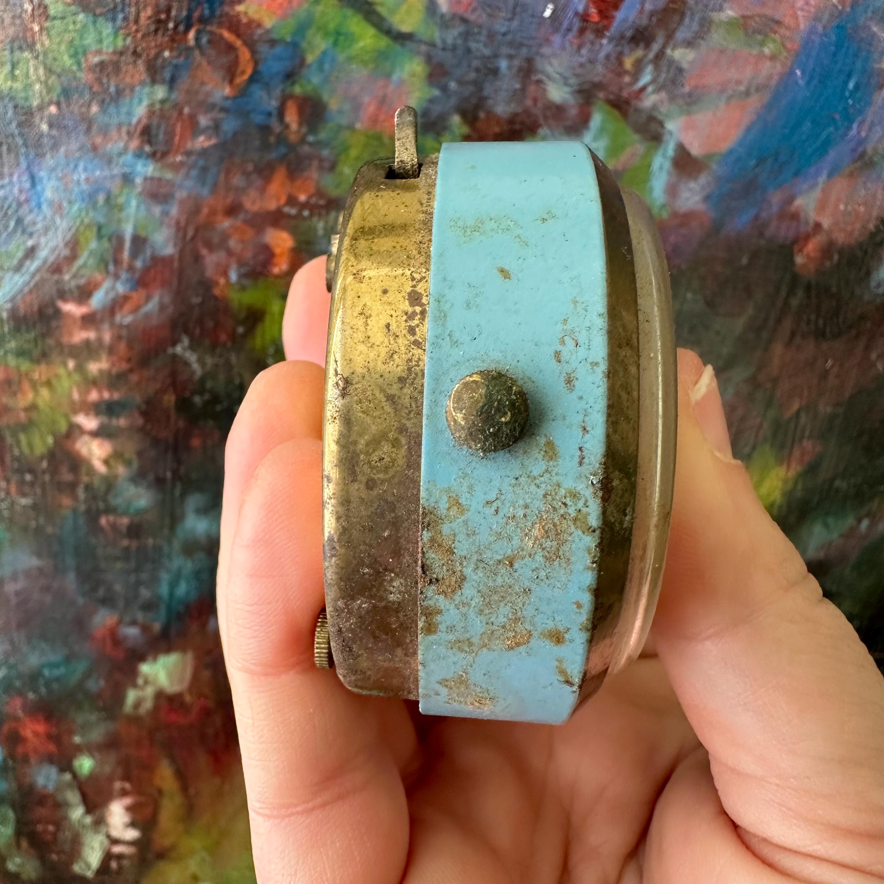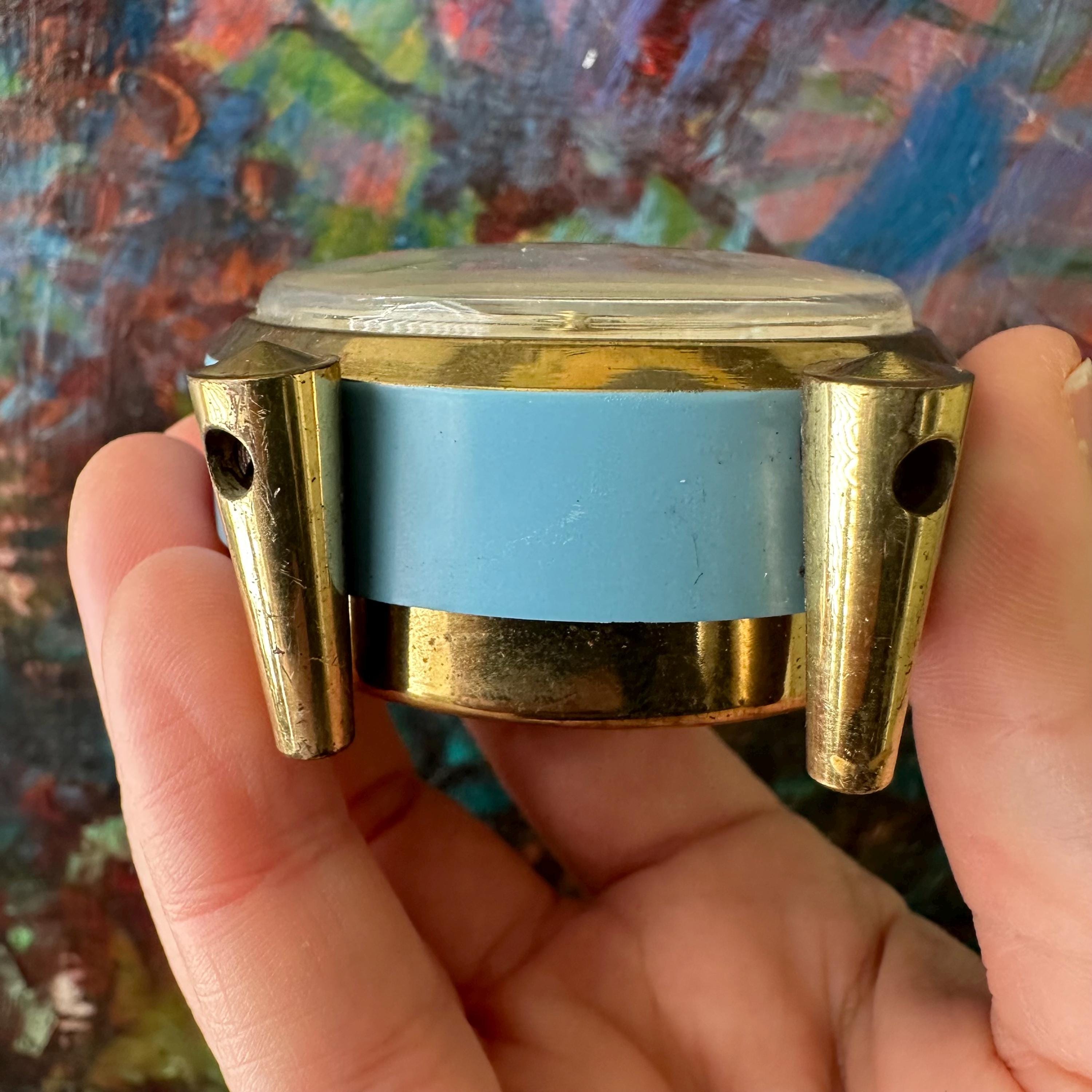 This is a vintage alarm clock made by Horodis in Germany. The clock is round with two round feet and a top brass knob. The clock face features gold numbers on a cream background with blue dots at each hour. The hands are also brass with light blue centers. The clock face is edged with a brass border. The body of the clock is blue. The back of the clock is brass also. The clock face is marked Horodis Foreign.