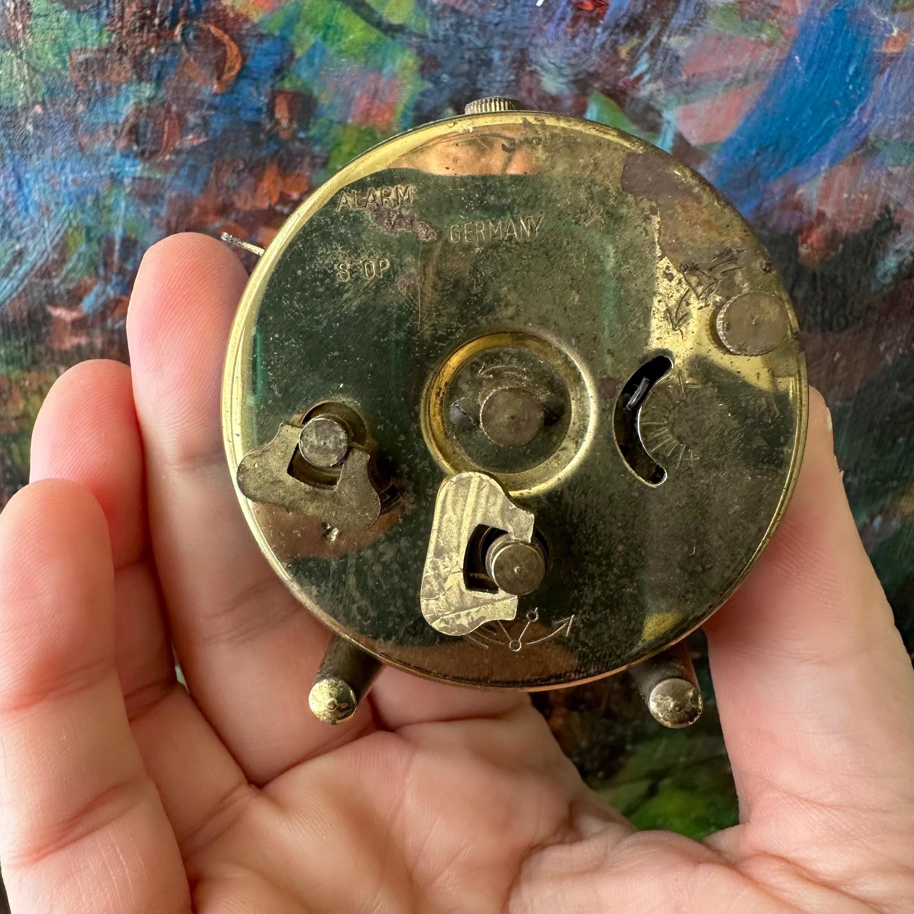 This clock is in good condition for its age and use. The dials move, but the clock doesn't tell time. The alarm will sound. The top of the clock is rusted and the front brass facing has two large tarnish spots.