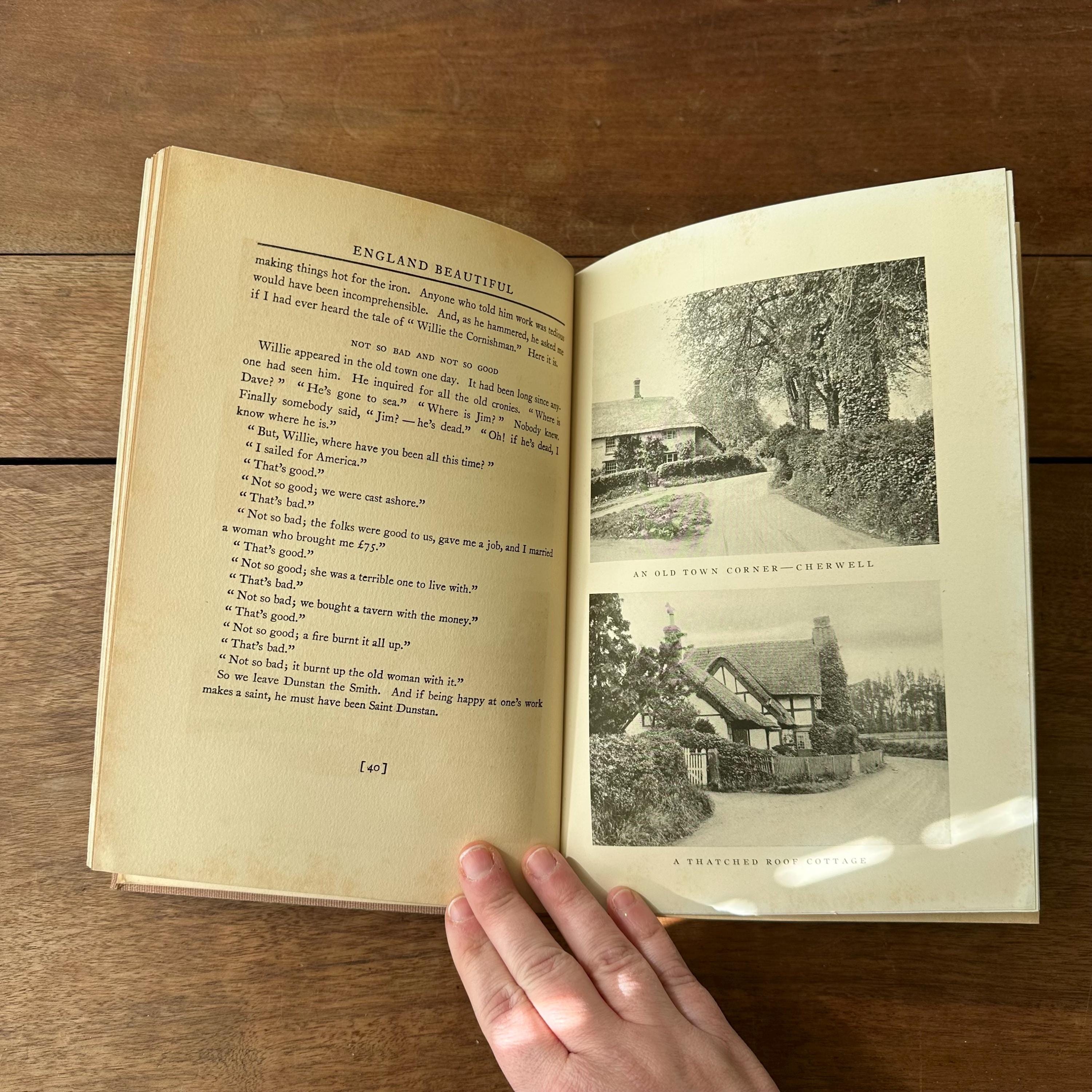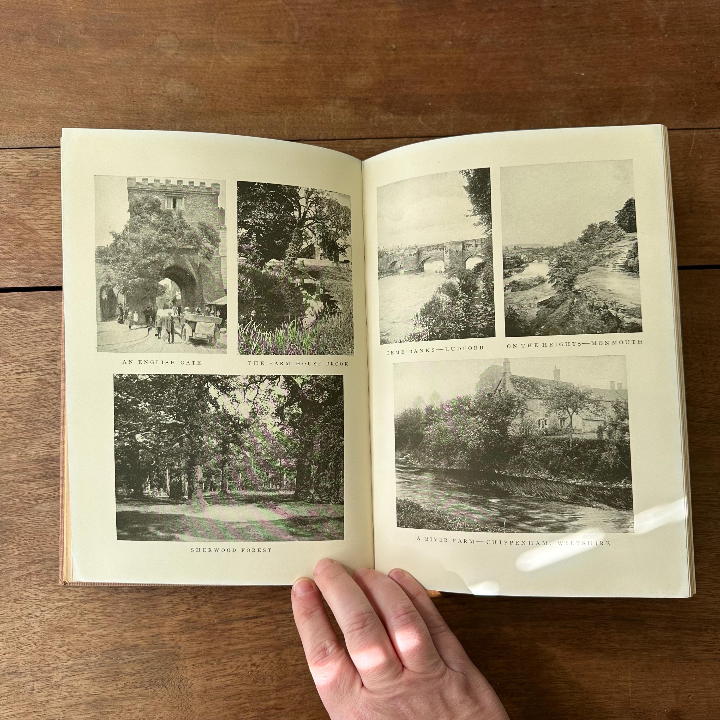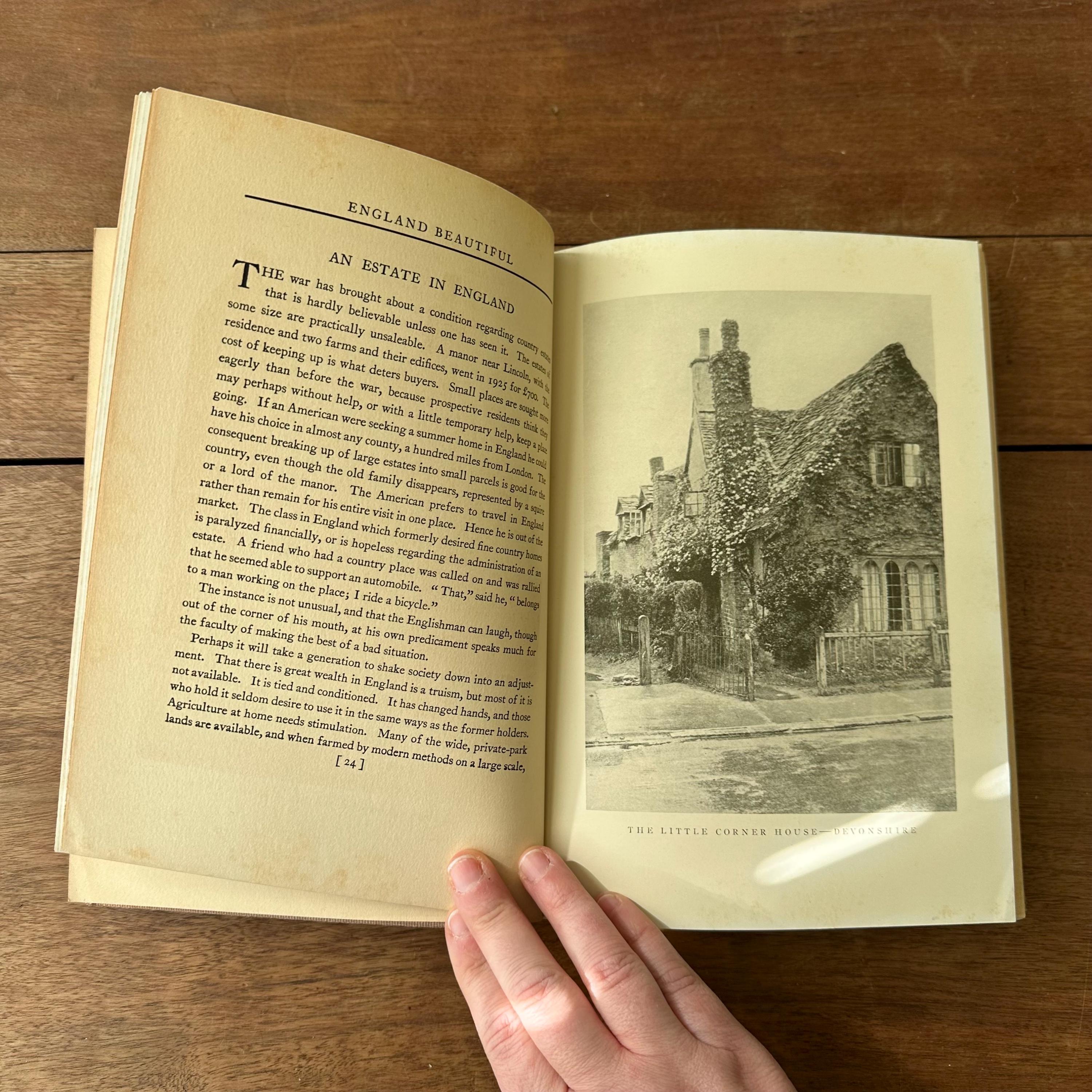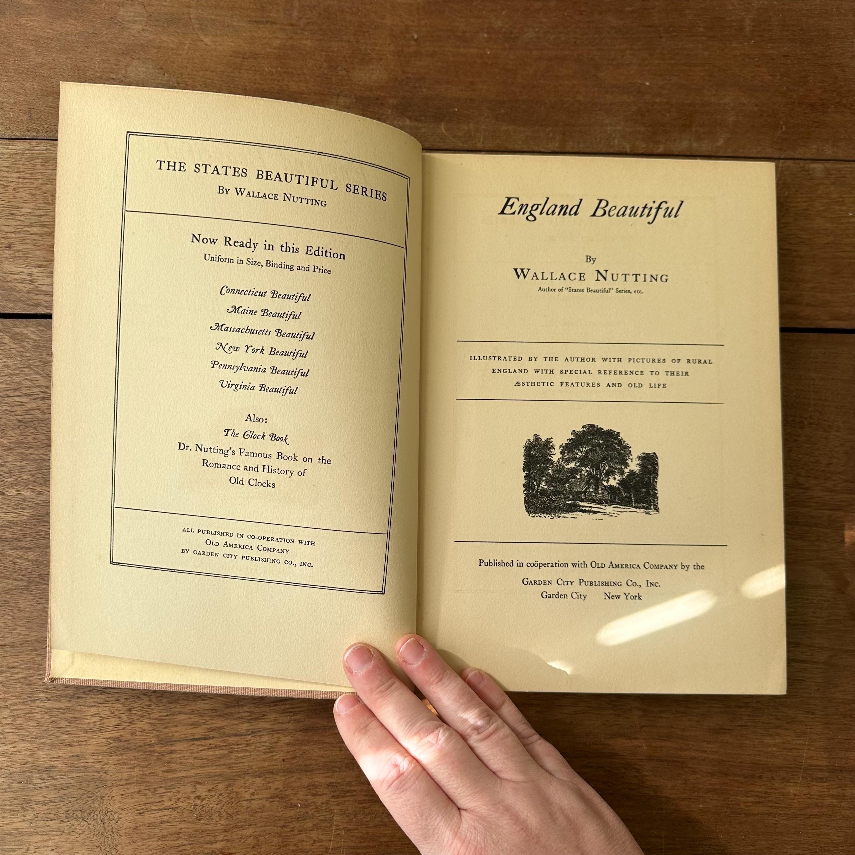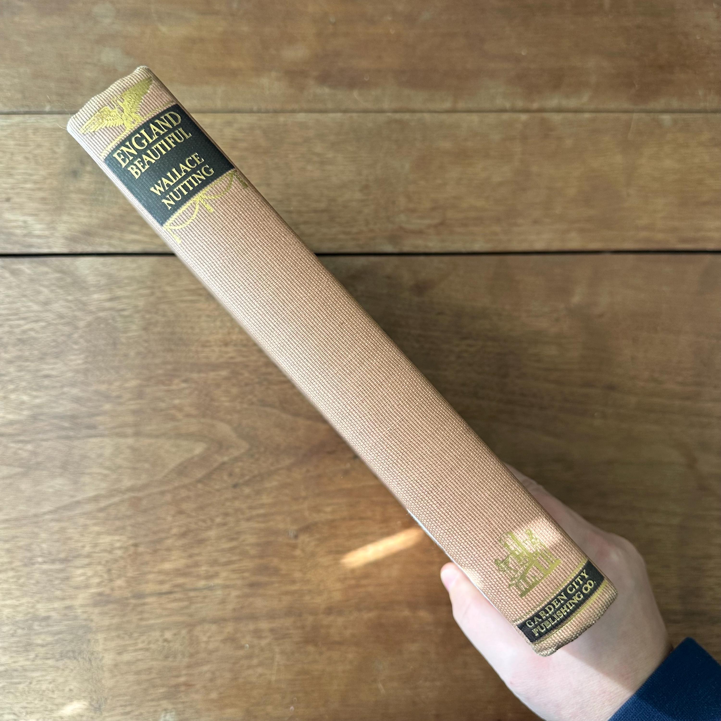This is the 1936 De Luxe Edition of England Beautiful by Wallace Nutting, published by Garden City Publishing. It has light brown covers with dark brown borders and illustrations. The spine is lettered in gold. It is illustrated by Wallace Nutting with his black and white photographs of rural England. There are 284 pages.