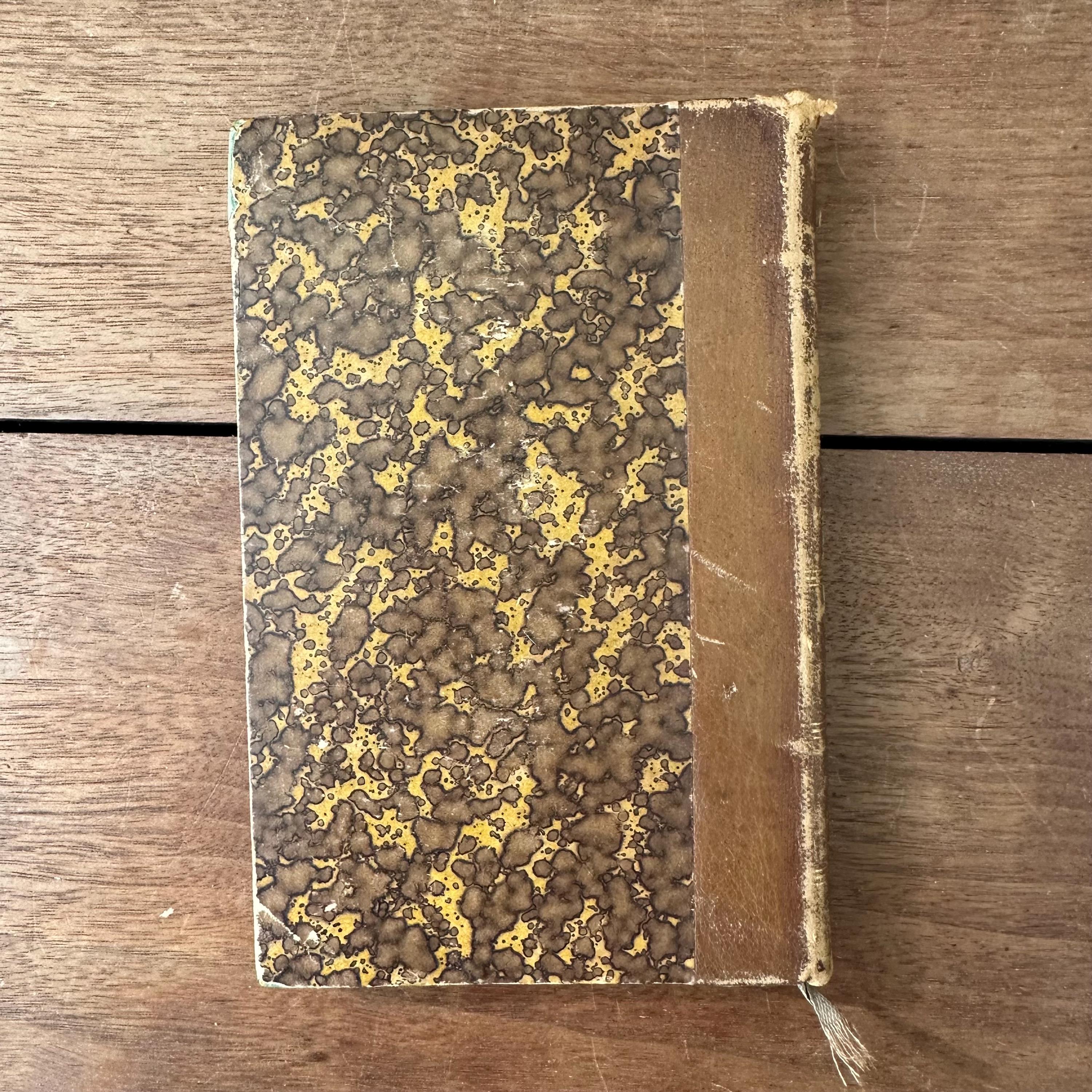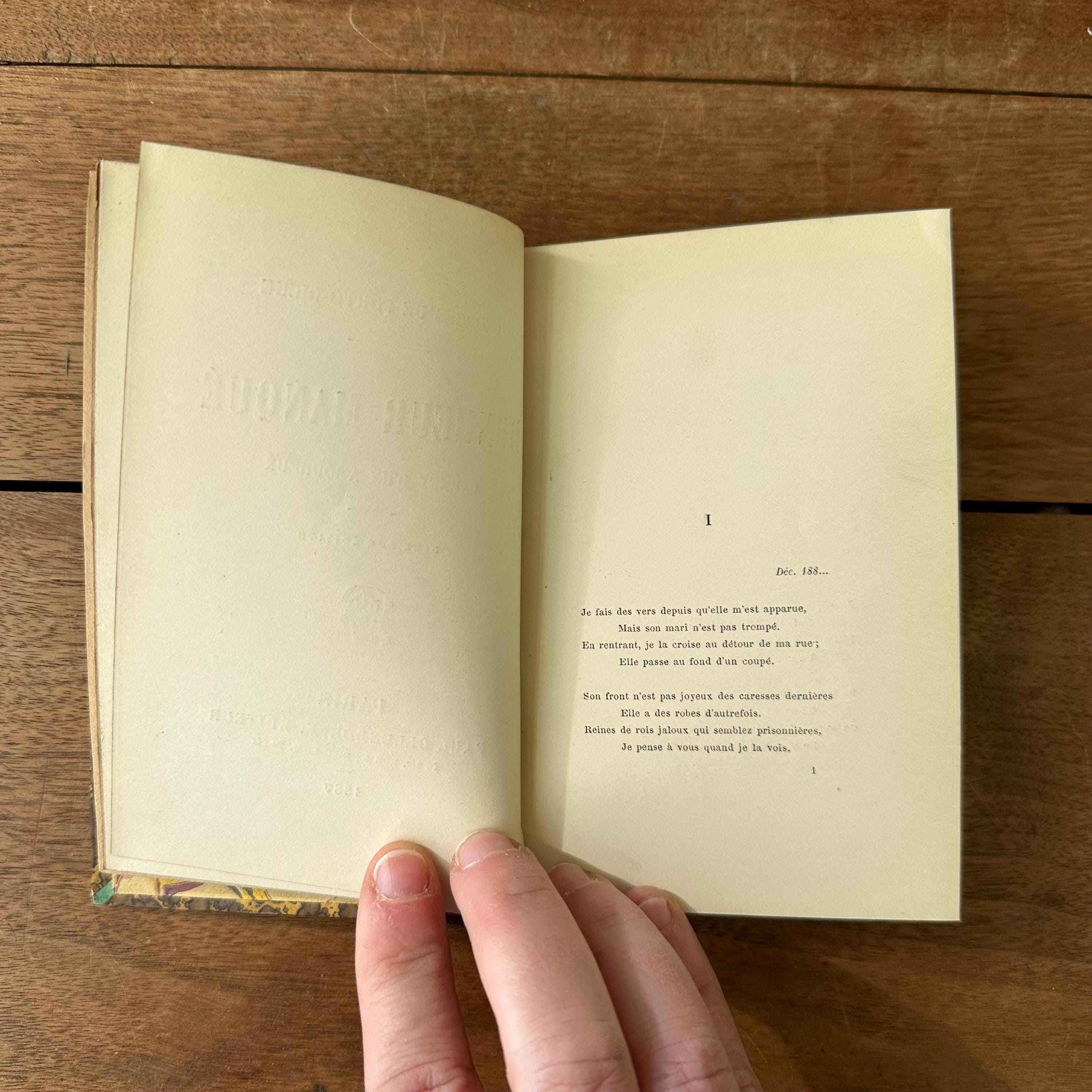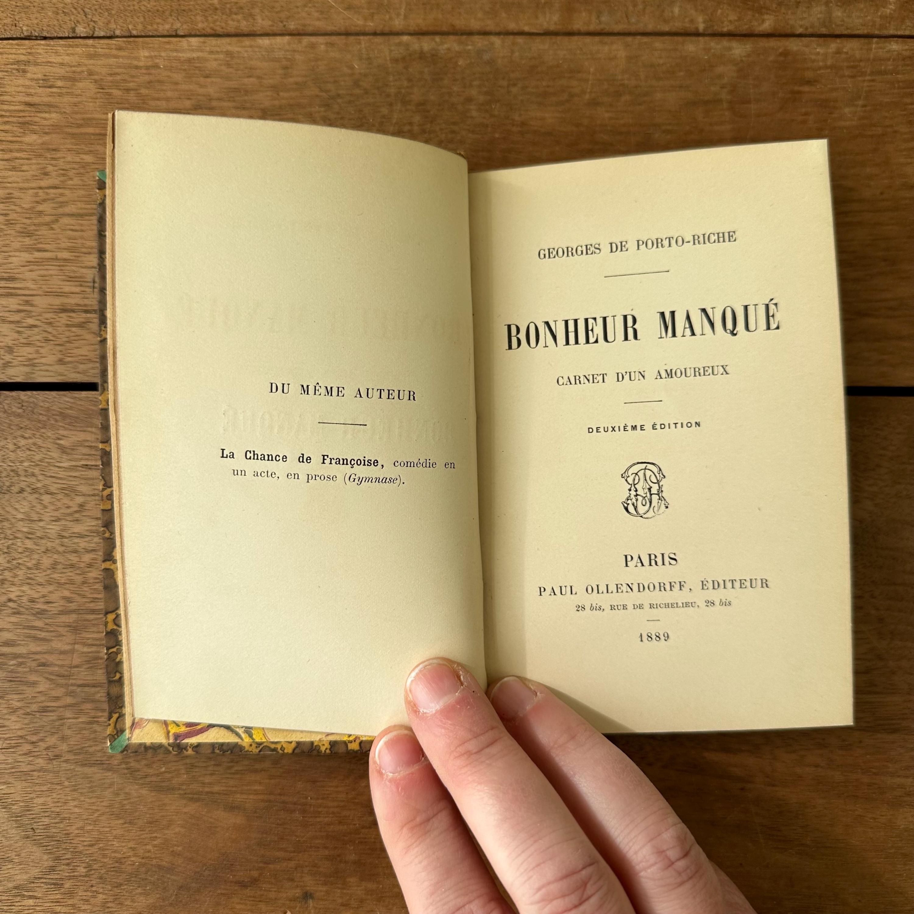 This is the antique 1889 second edition of Bonheur Manque: Carnet d'un Amoureux by Georges de Porto-Riche. The book is palm-sized, bound in brown leather with marbled covers. The spine is lettered in gold. There is a small ribbon bookmark. The book has marbled endpapers. There are 75 pages. Georges de Porto-Riche was a French dramatist and sometime poet. His books of verse were rarely reprinted making this a rare volume!