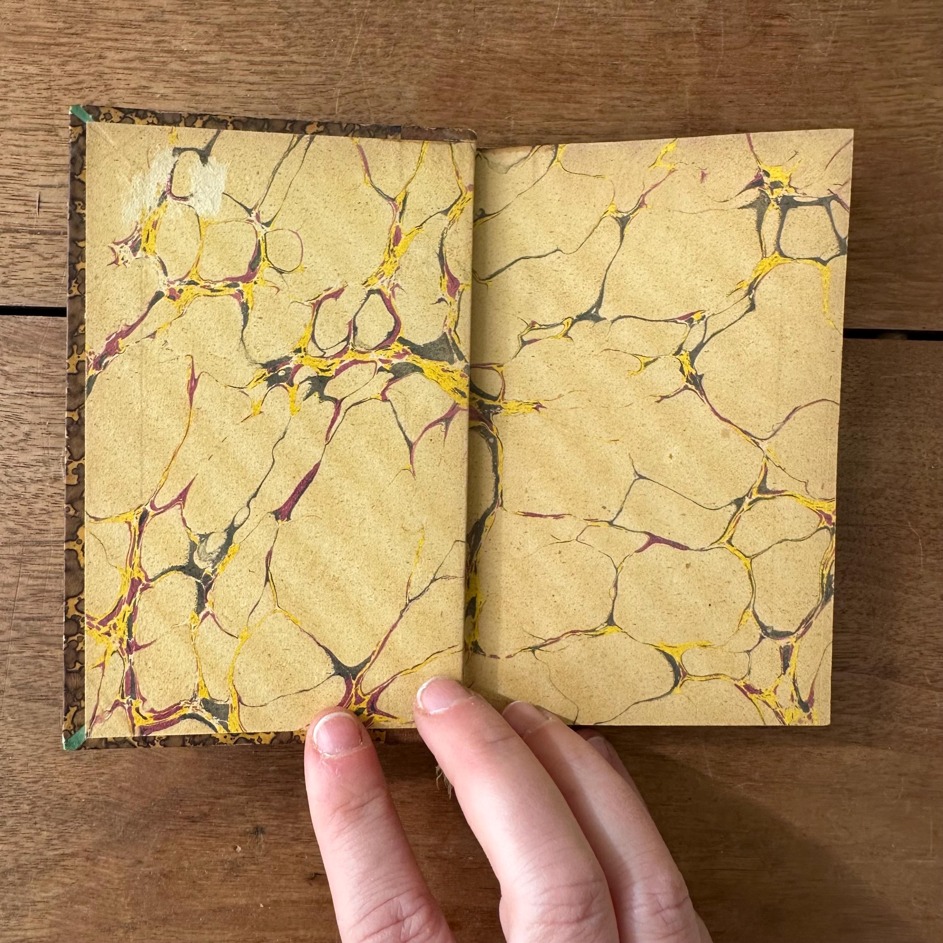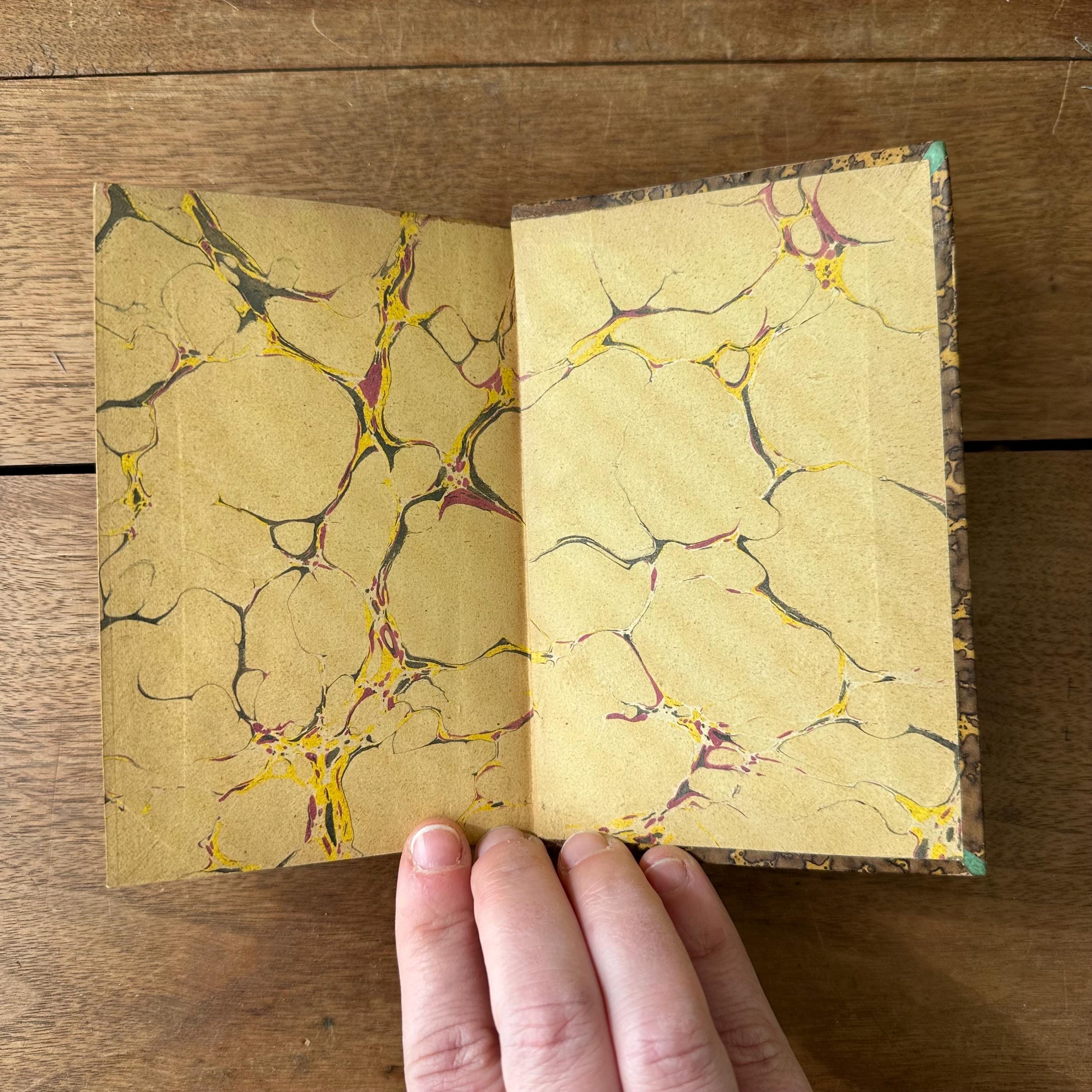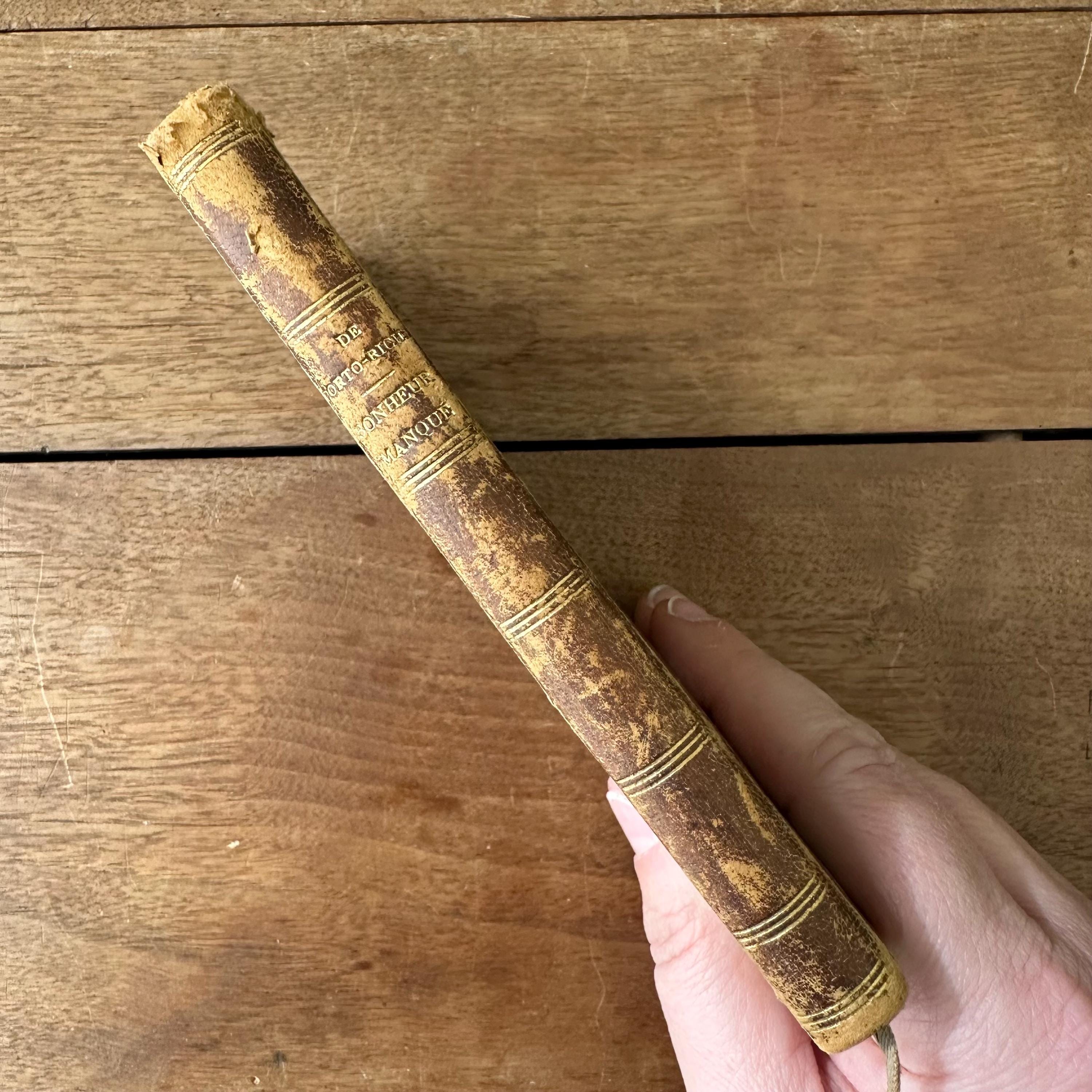 This is the antique 1889 second edition of Bonheur Manque: Carnet d'un Amoureux by Georges de Porto-Riche. The book is palm-sized, bound in brown leather with marbled covers. The spine is lettered in gold. There is a small ribbon bookmark. The book has marbled endpapers. There are 75 pages. Georges de Porto-Riche was a French dramatist and sometime poet. His books of verse were rarely reprinted making this a rare volume!