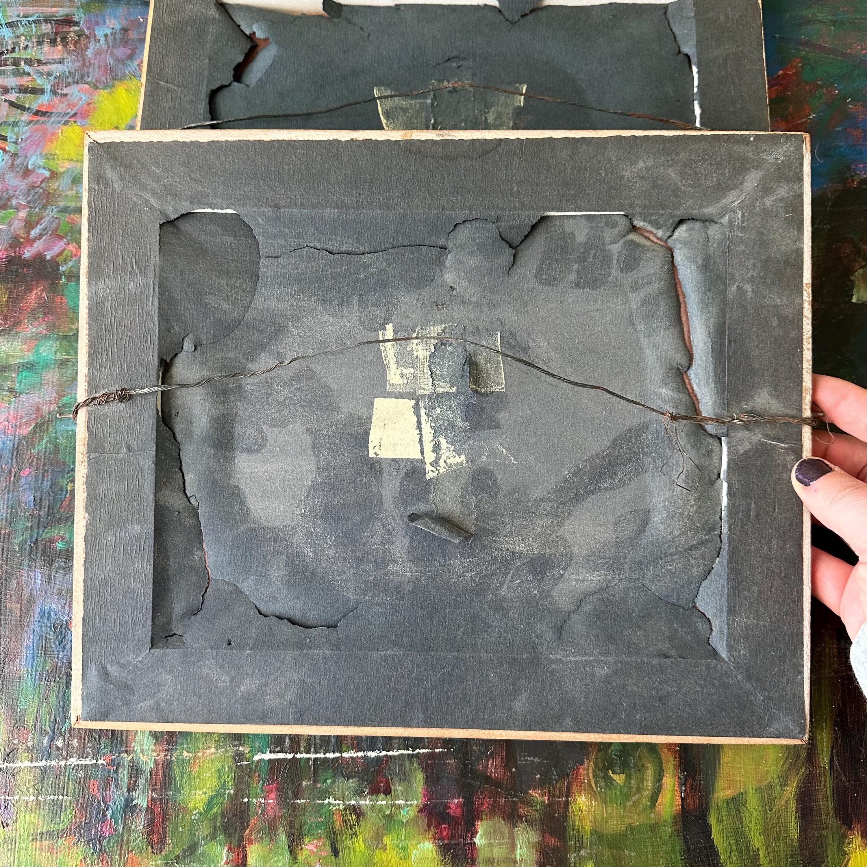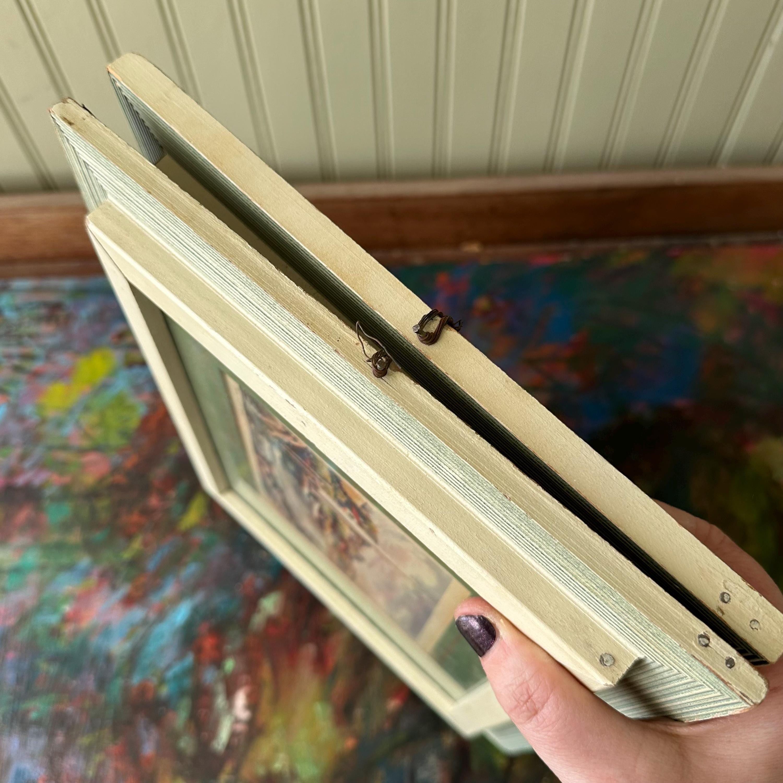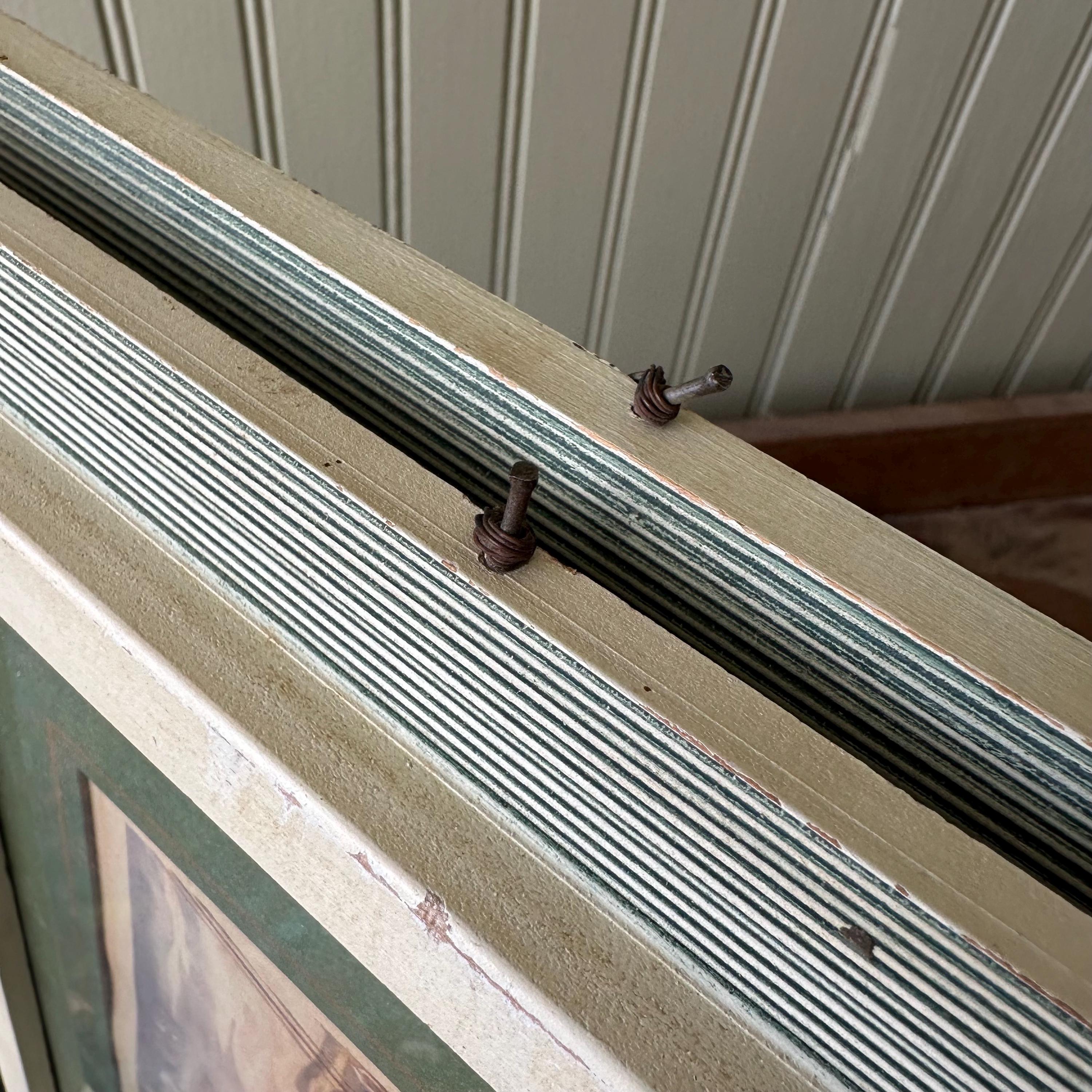 The prints are in good vintage condition for their age and use. The prints are bright and the glass is clear. The frames have general wear with some chippy paint and areas of fading and discoloration. The Summer Morning print sits offset in its frame. The picture wire is wrapped around small nails that have been nailed into the sides of the frame. The paper on the back is torn around the edges of the frames.