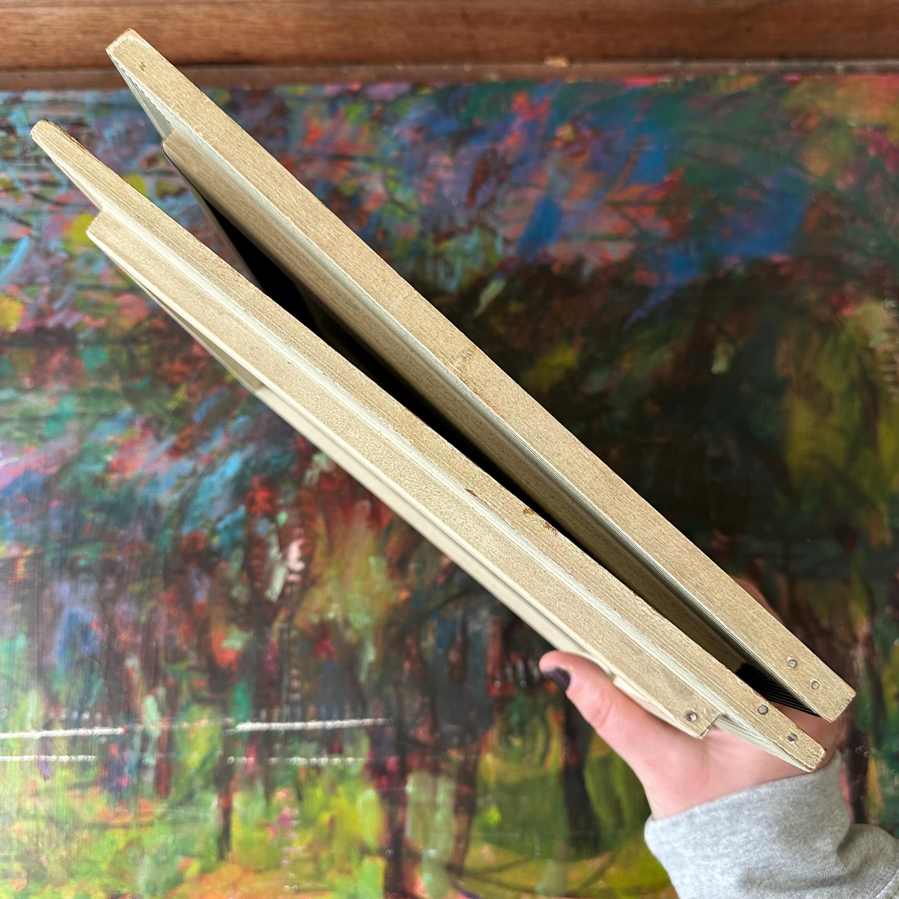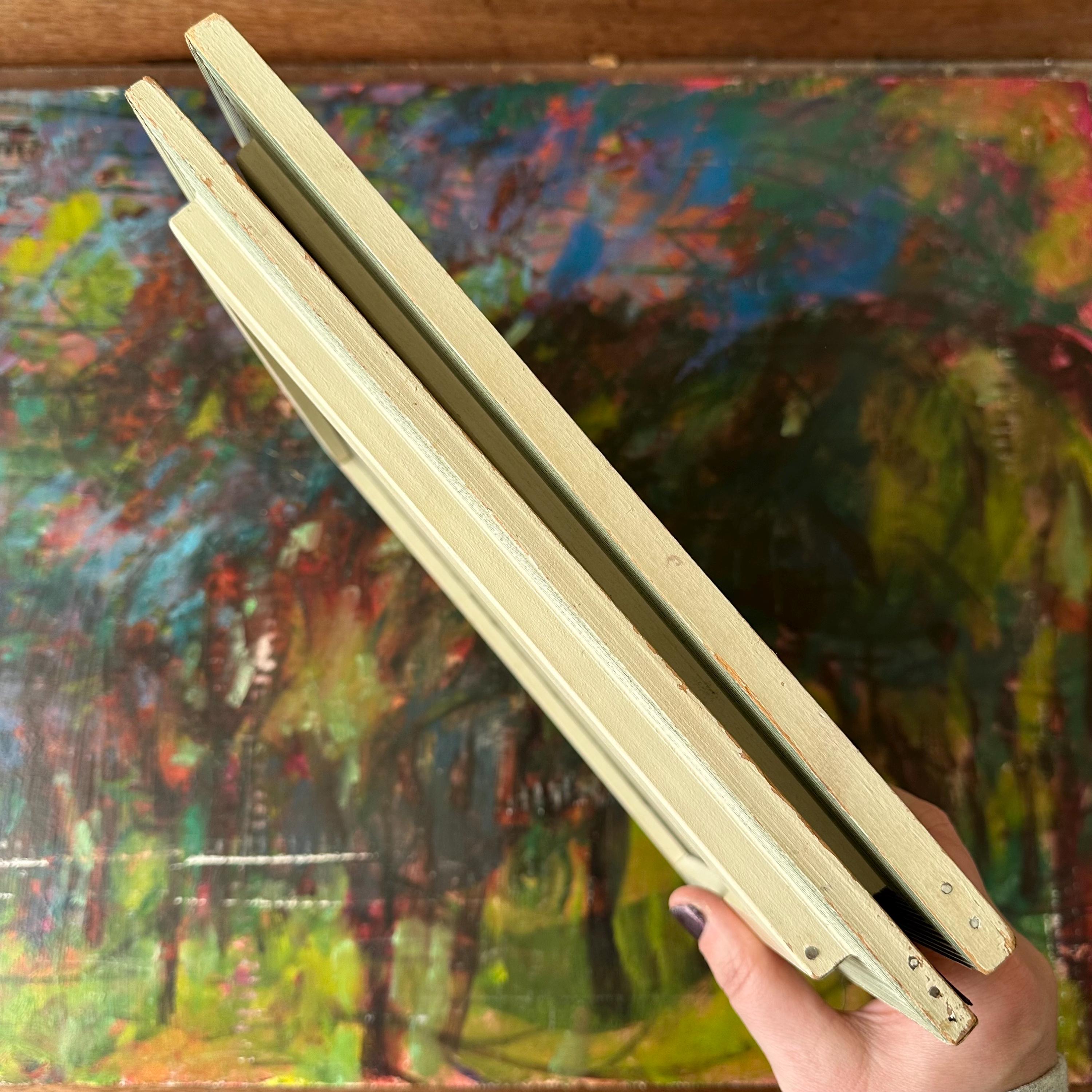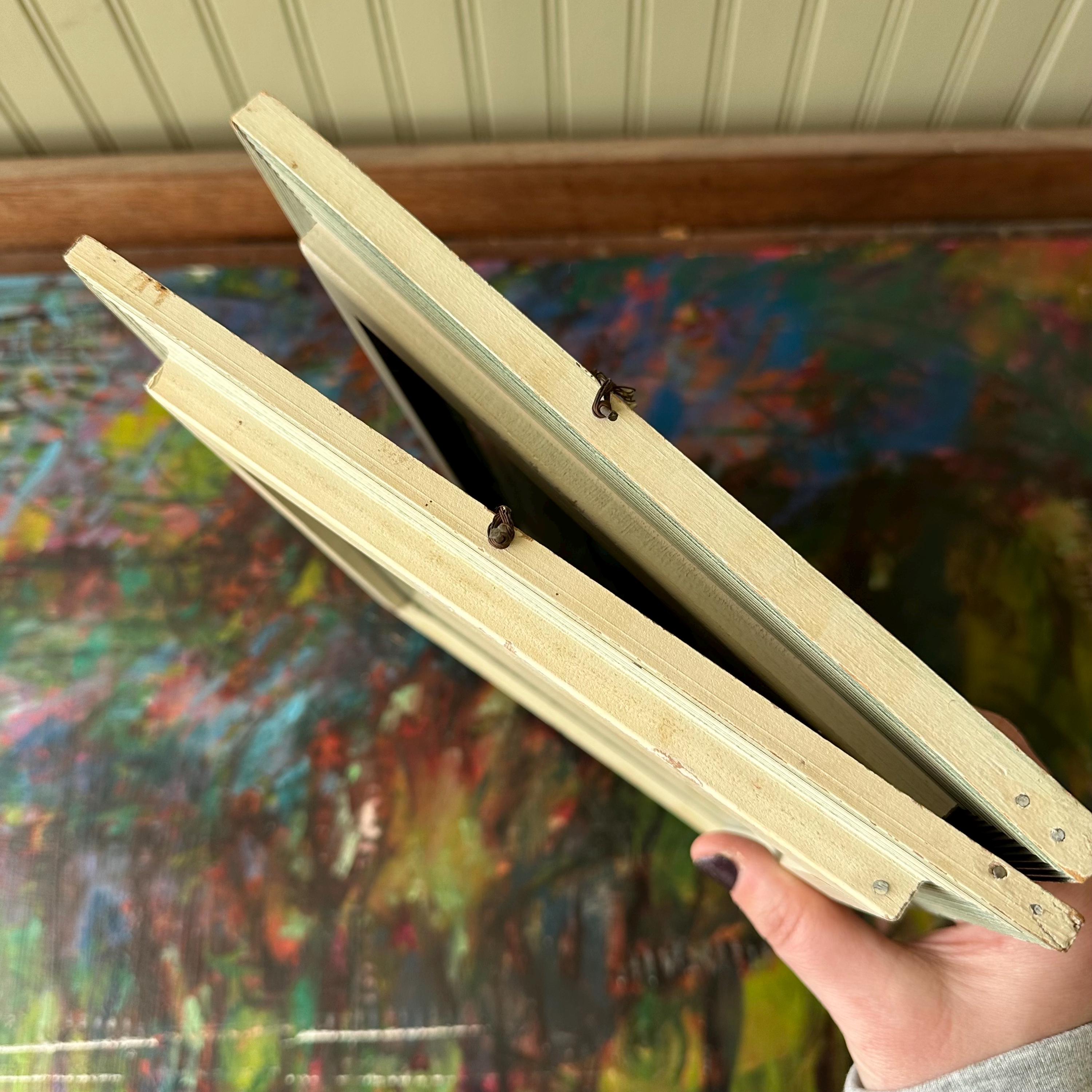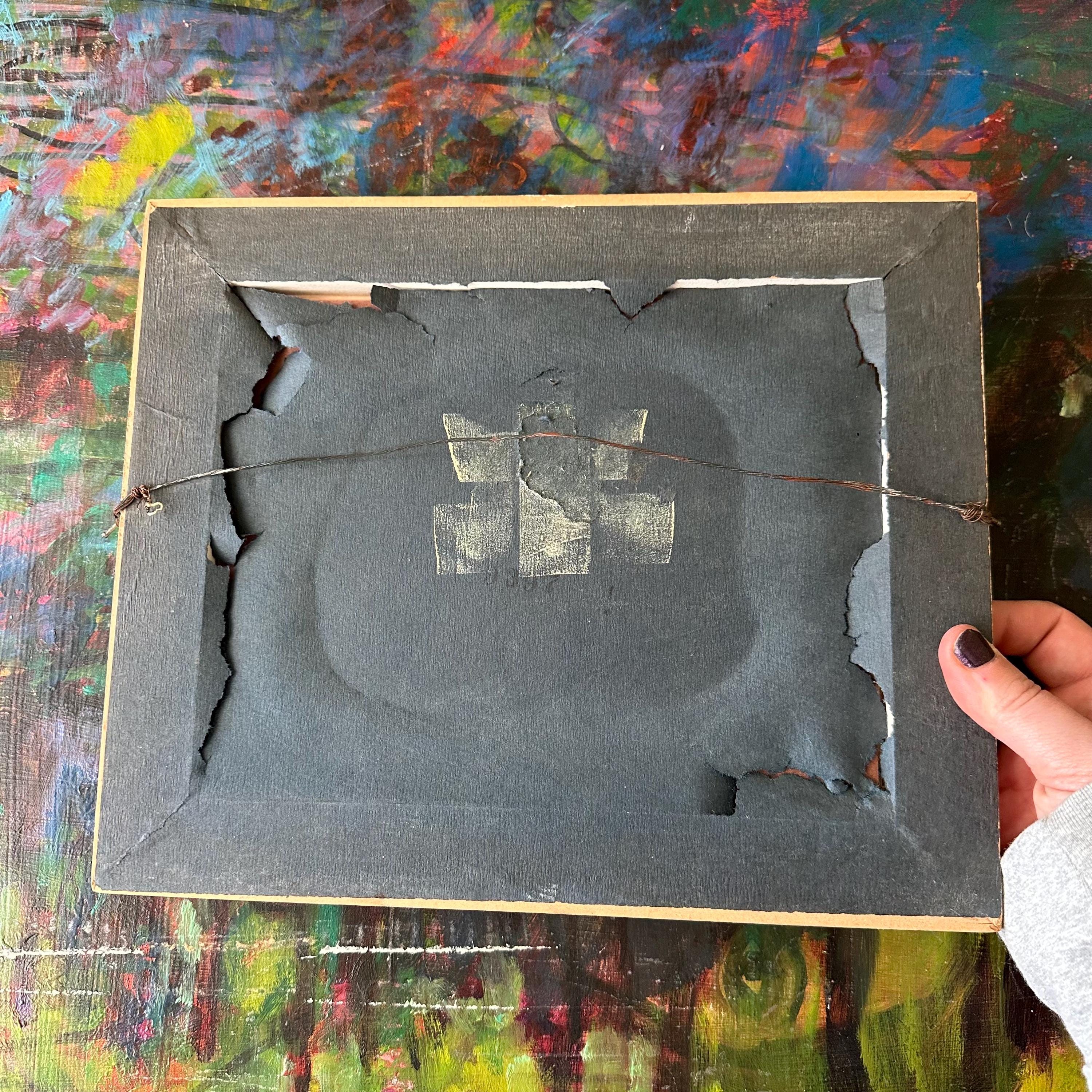The prints are in good vintage condition for their age and use. The prints are bright and the glass is clear. The frames have general wear with some chippy paint and areas of fading and discoloration. The Summer Morning print sits offset in its frame. The picture wire is wrapped around small nails that have been nailed into the sides of the frame. The paper on the back is torn around the edges of the frames.
