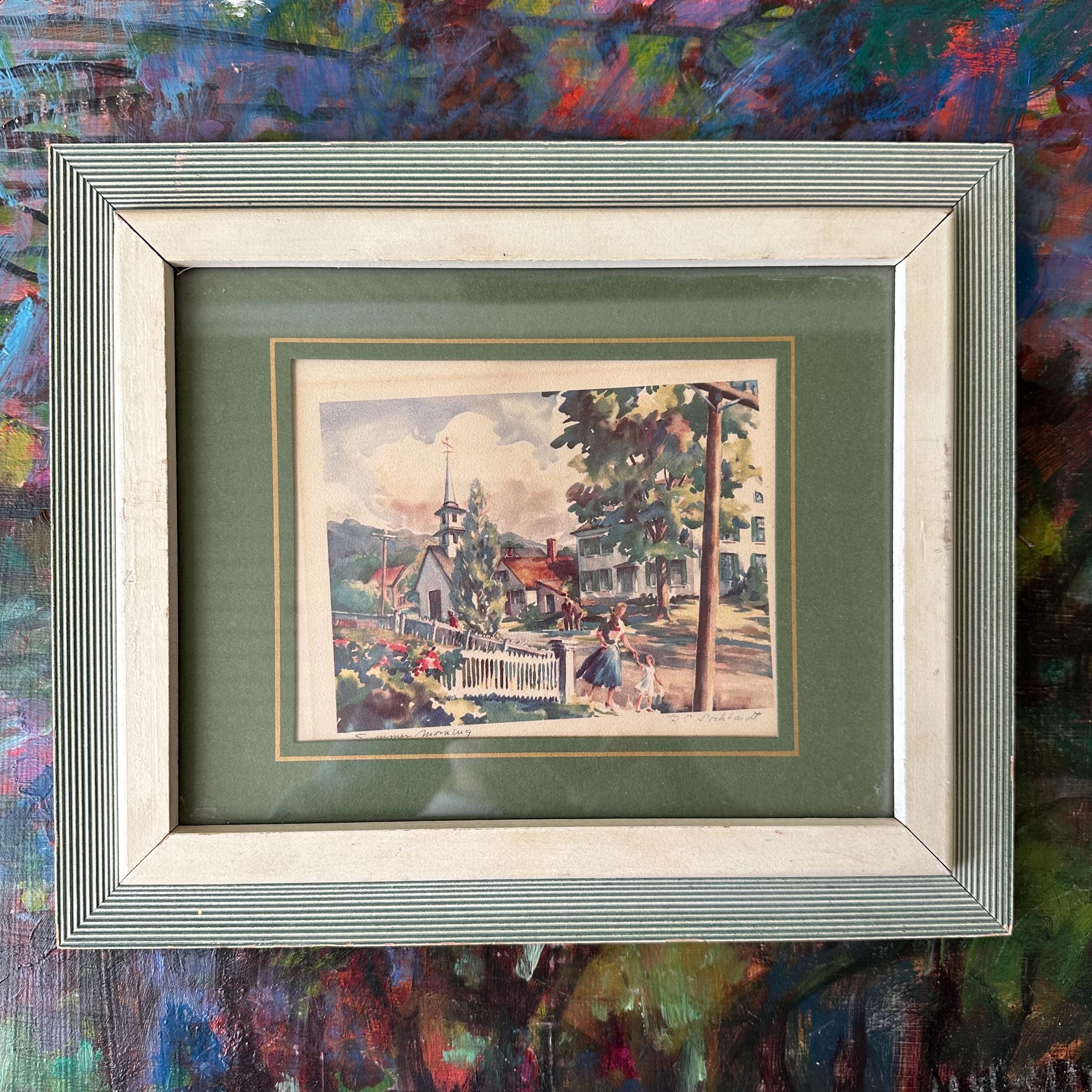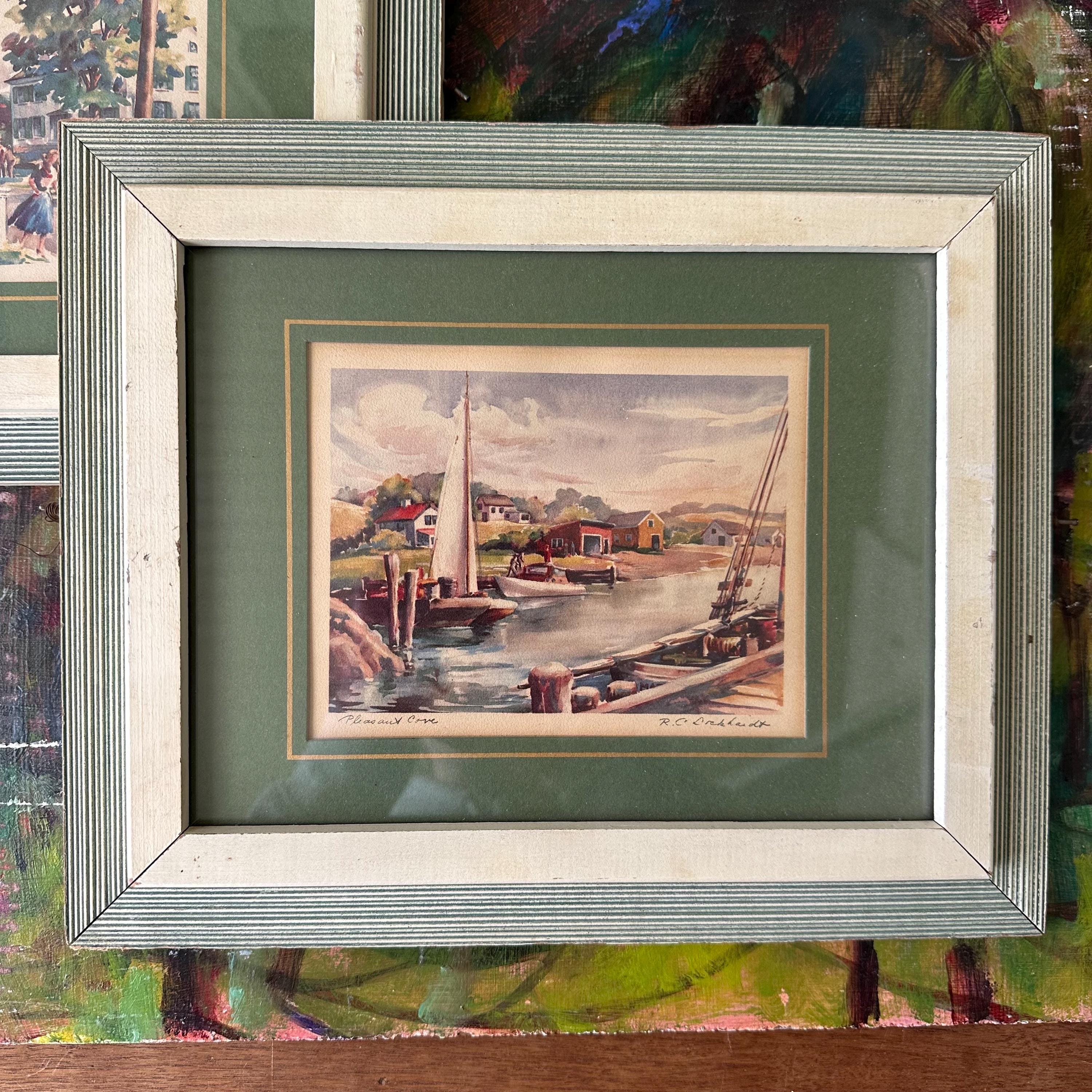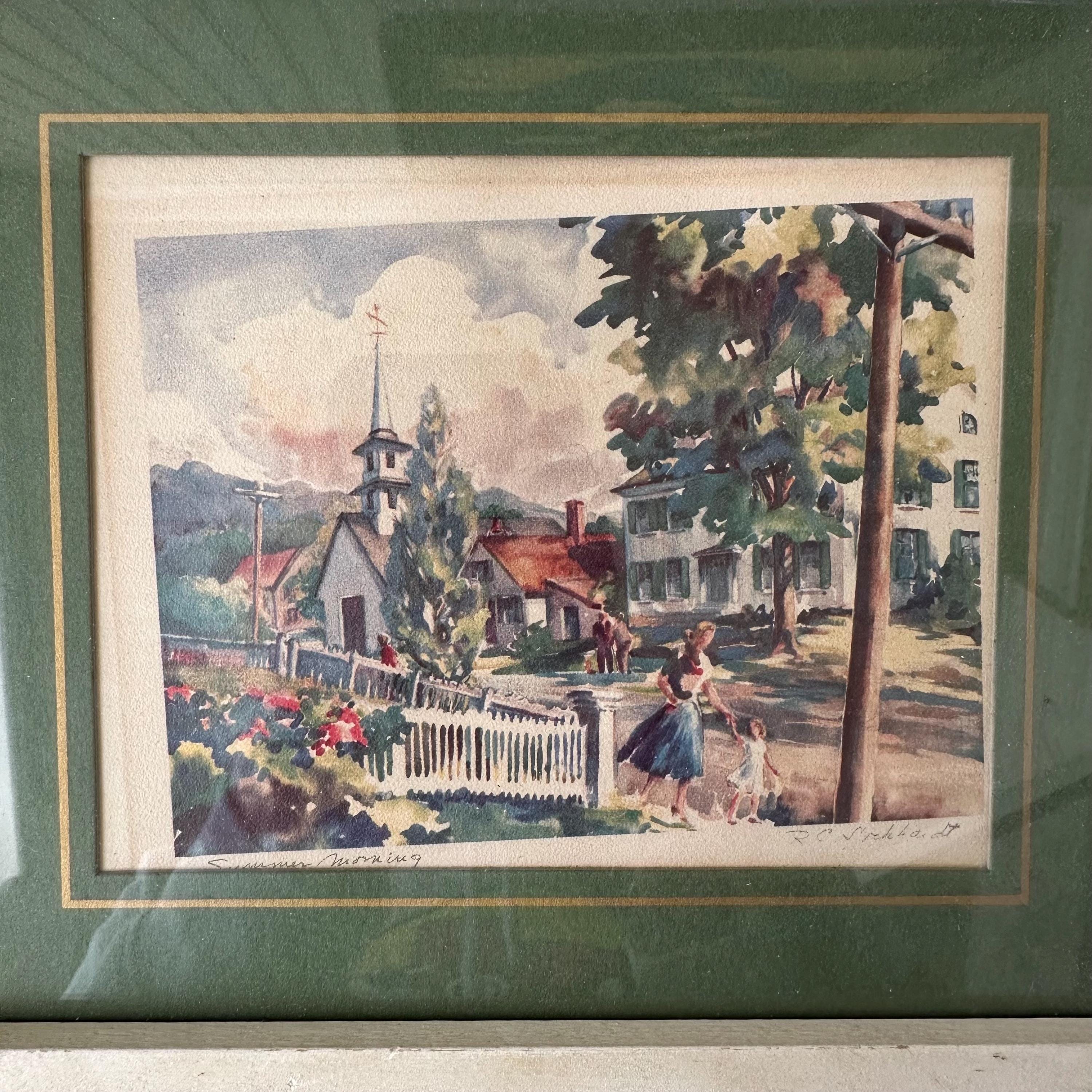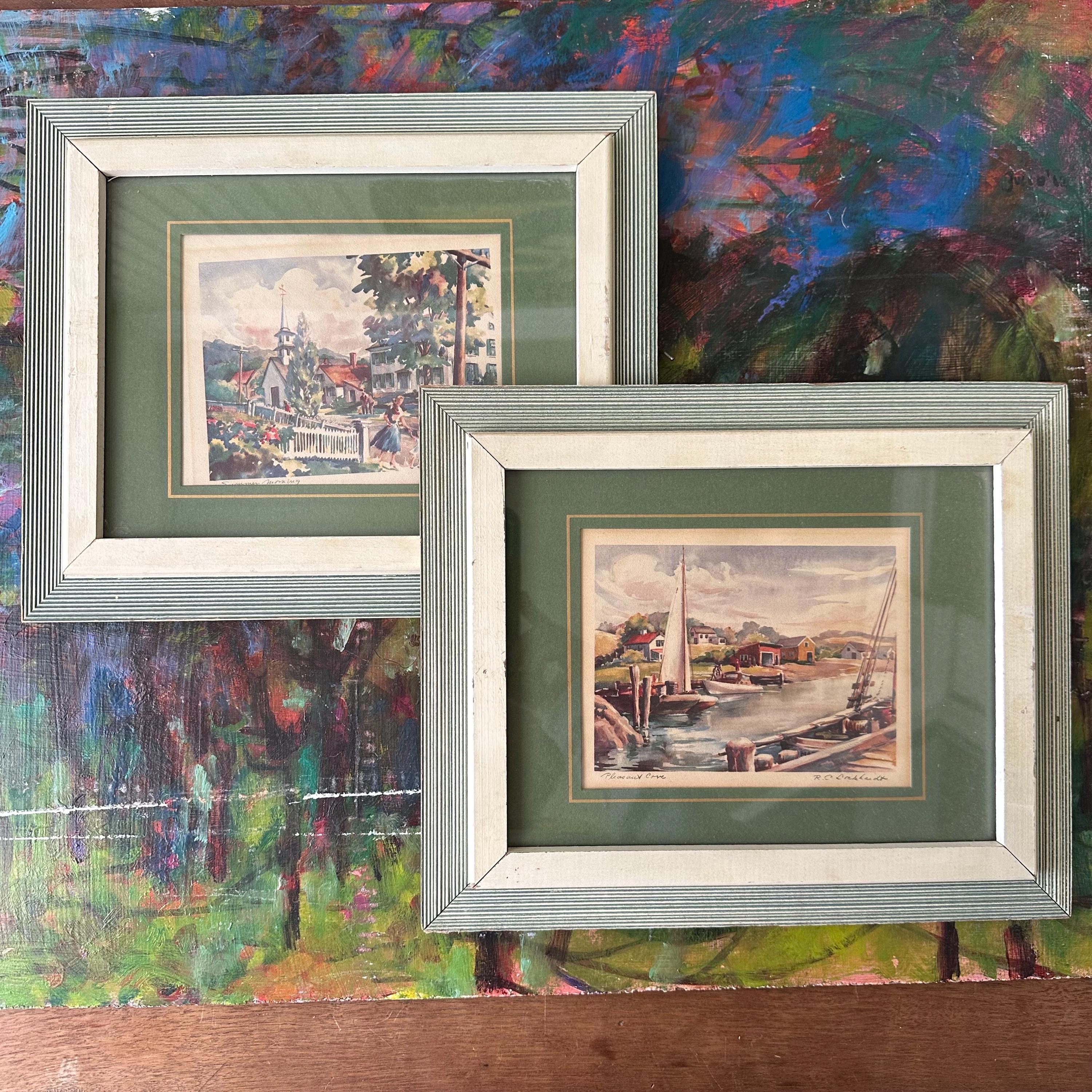 This is a set of 2 R.C. Drekhardt watercolor prints in green and white midcentury frames. The prints are labeled. One is Summer Morning and features a village scene in rainbow colors with a white picket fence in the foreground and a white steepled church in the background. The other is Pleasant Cove and features sailboat in the cove with the village in the background. Both are matted with a dark green mat with a gold border. Both are framed in white wood inner frame with a green and white striped outer frame. They are covered in paper on the back with picture wire to hang.