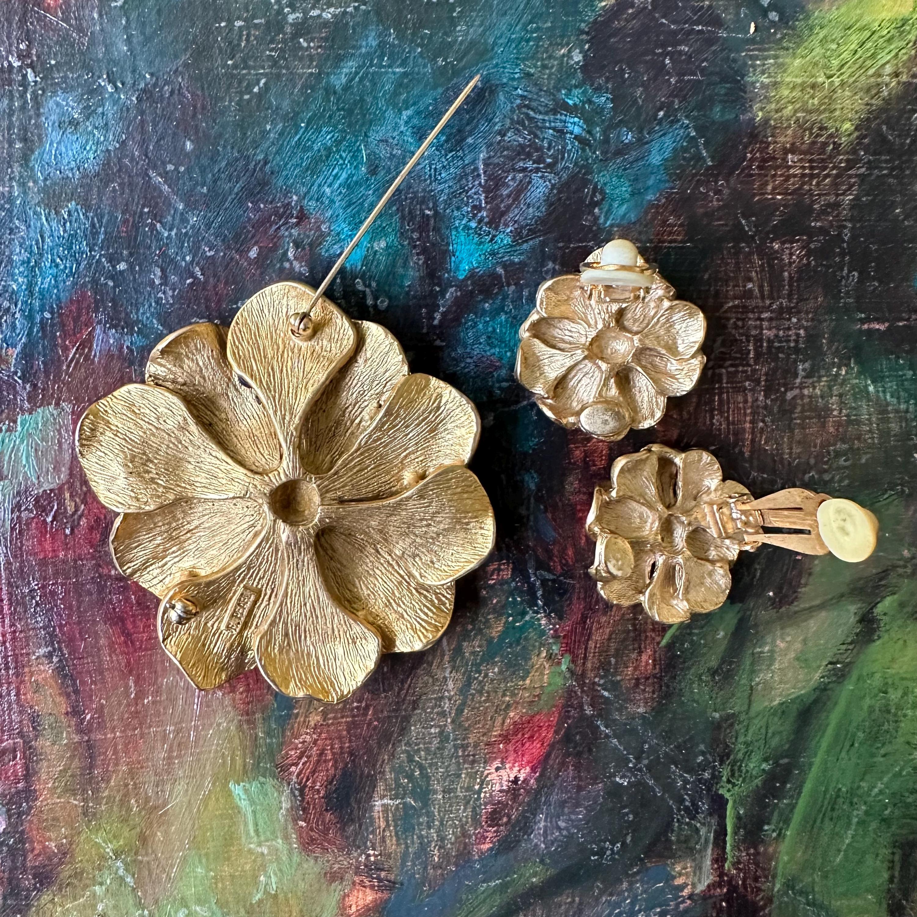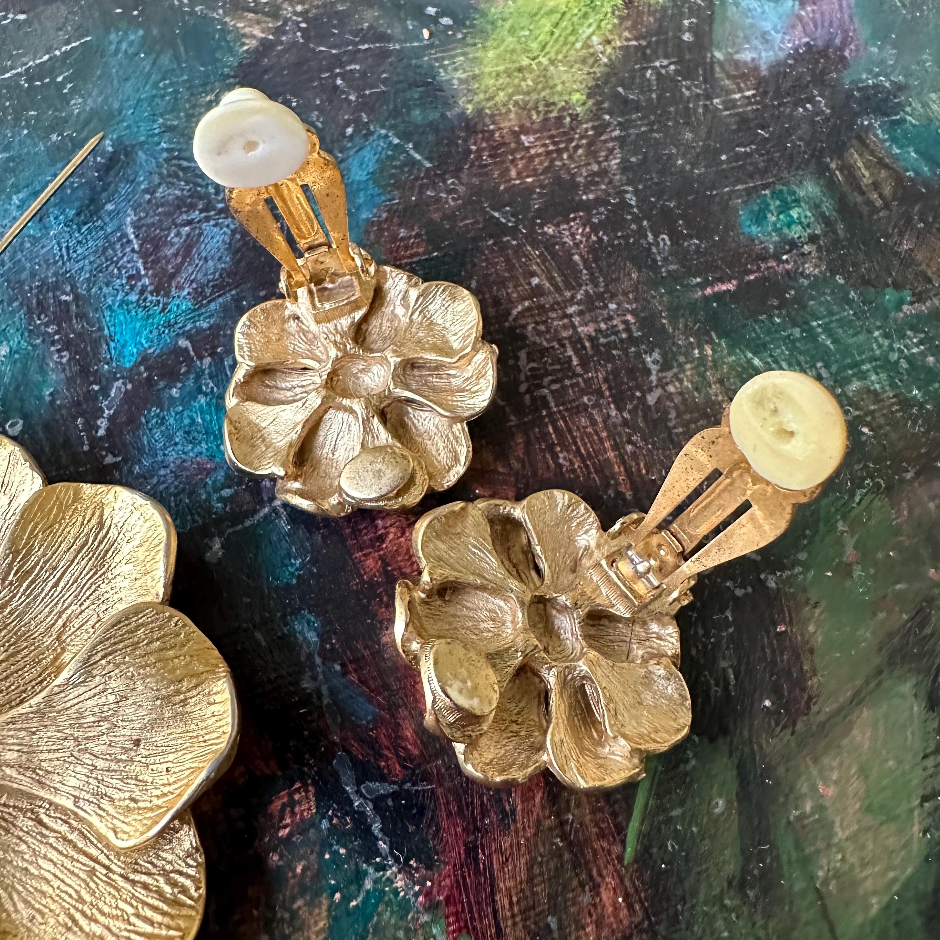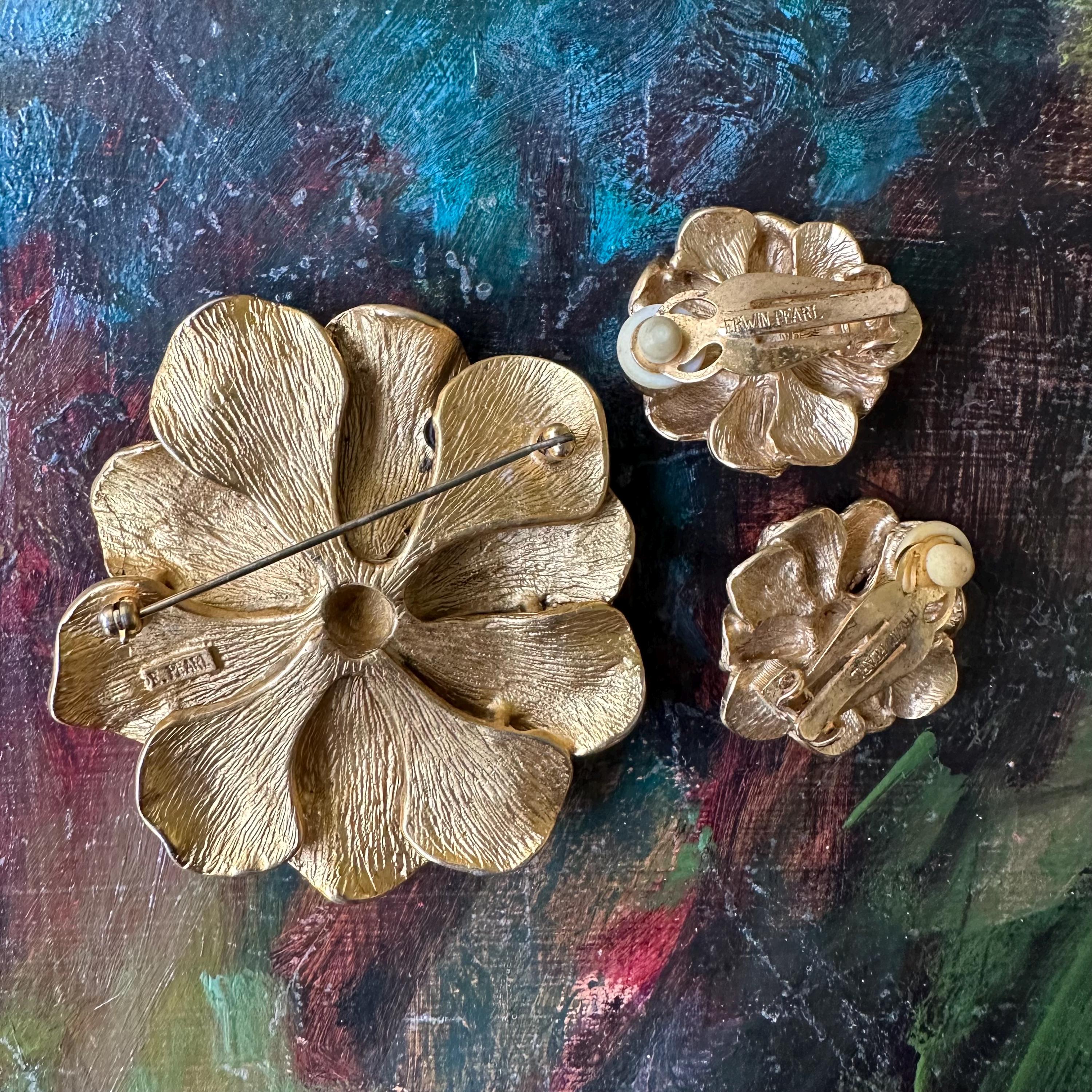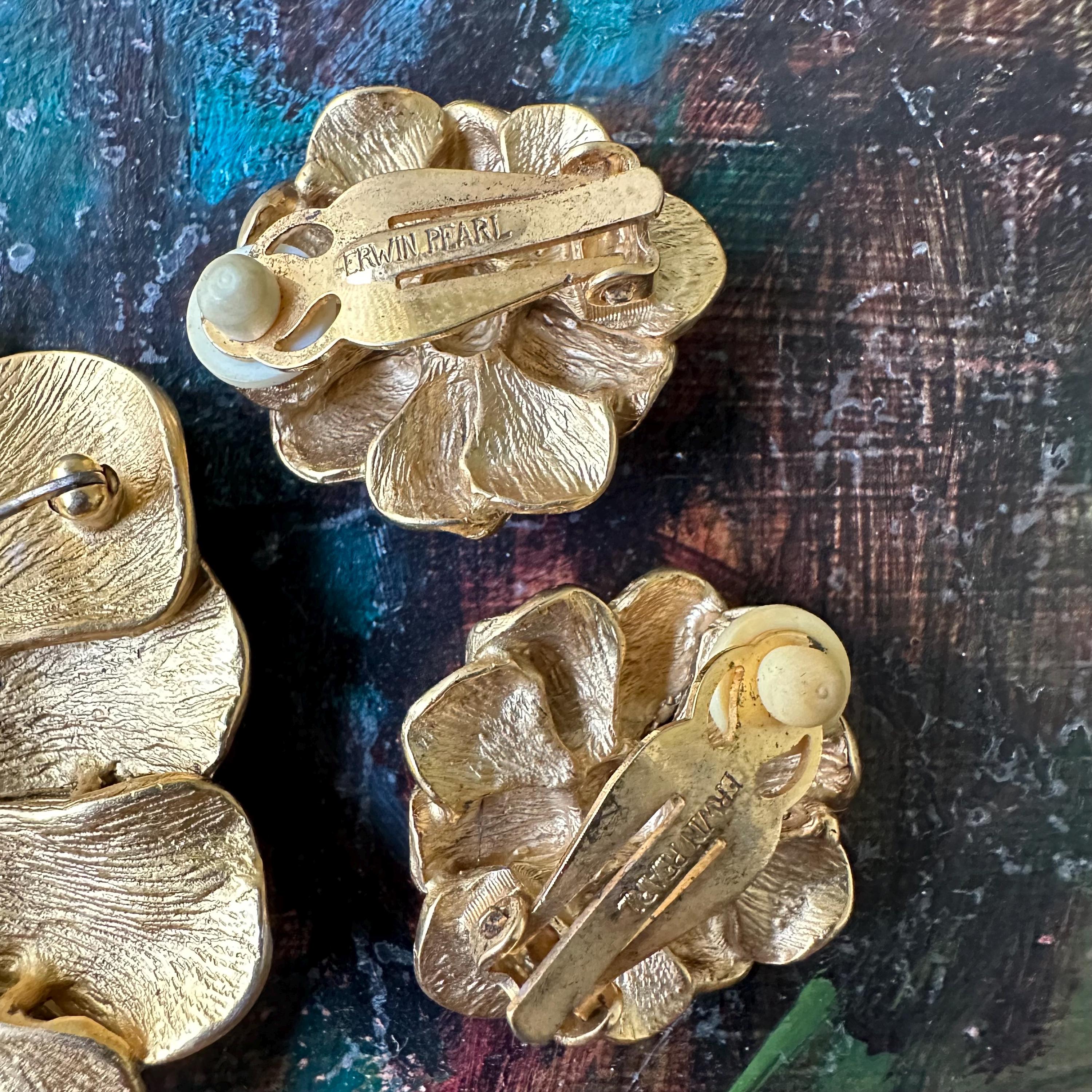 This is a set of vintage Erwin Pearl jewelry. The set includes a large gold toned textured flower brooch and a pair of matching gold toned clip on earrings. The brooch has a bar pin back and is marked E. Pearl. The earrings have clip on backs and are marked Edwin Pearl.