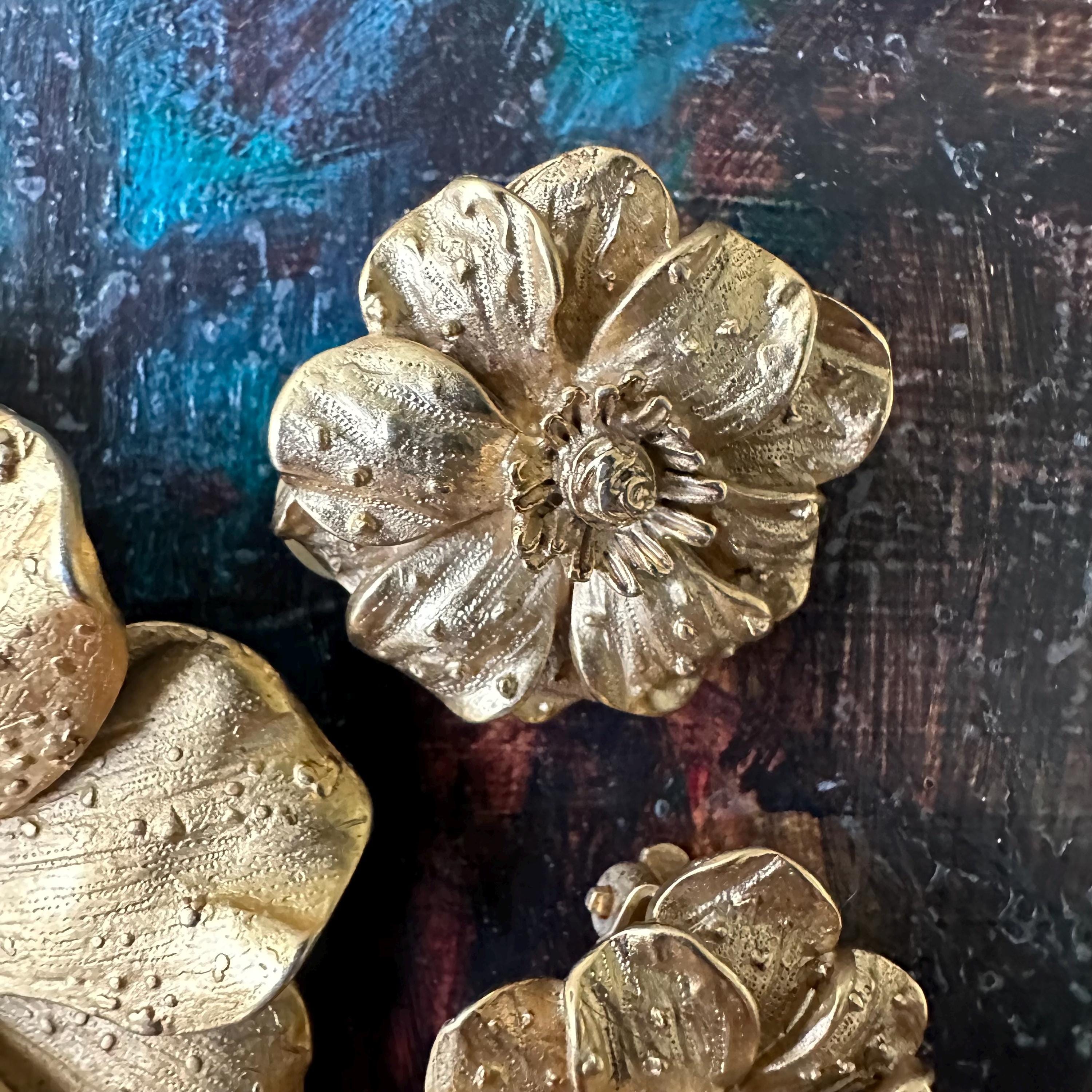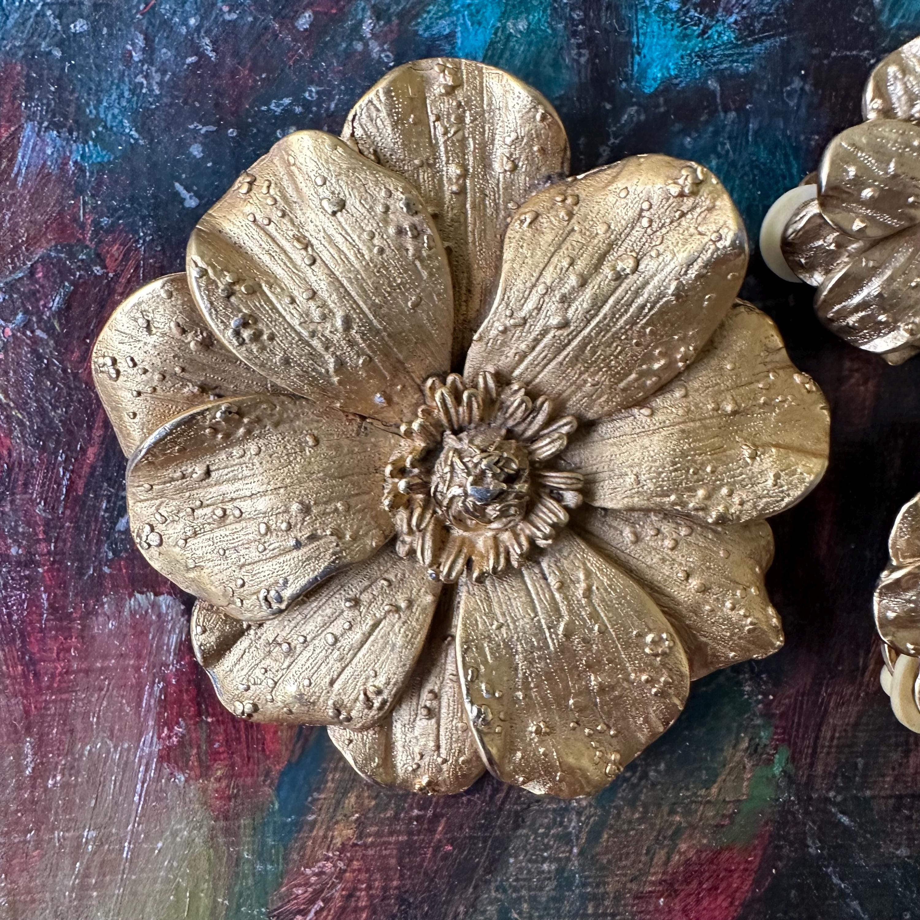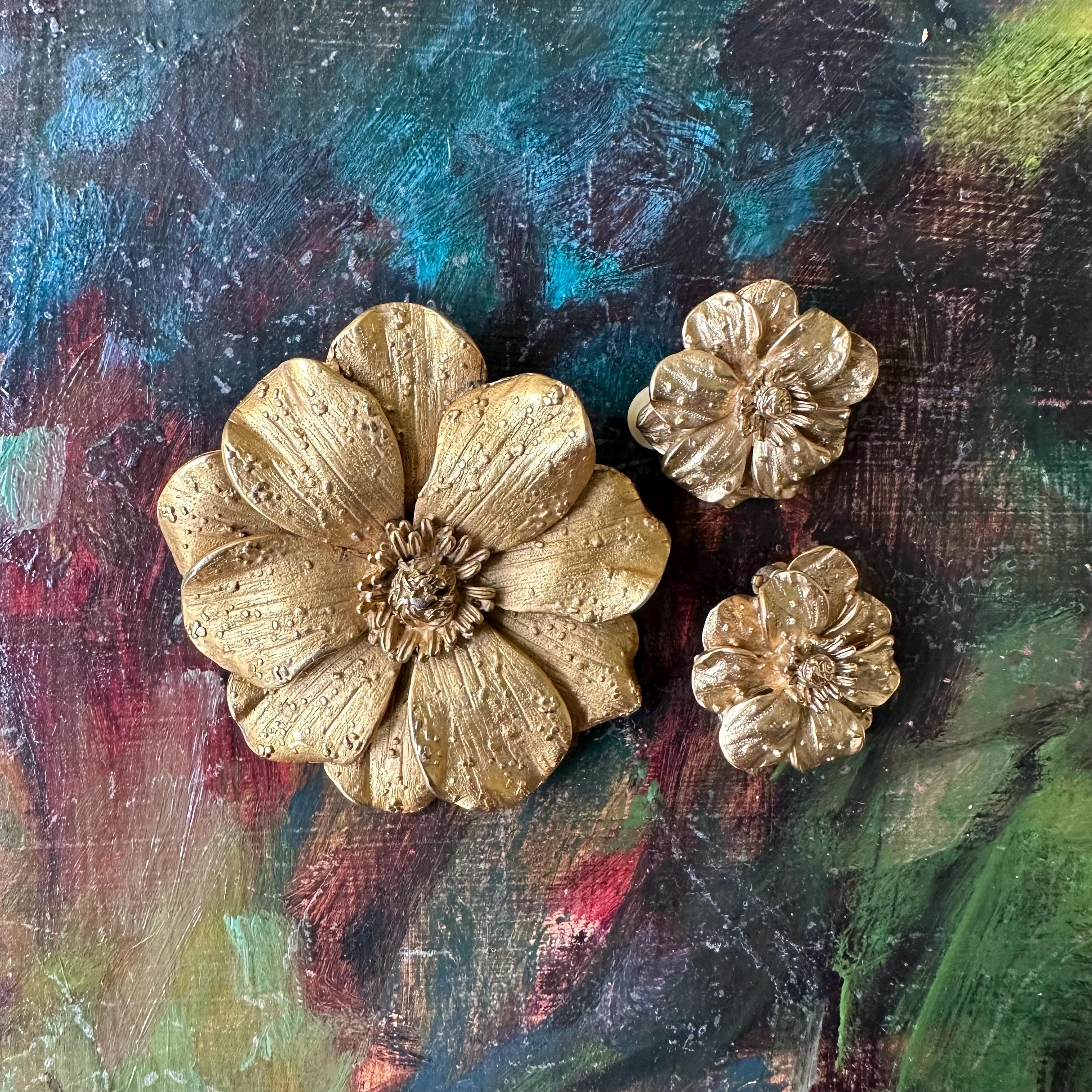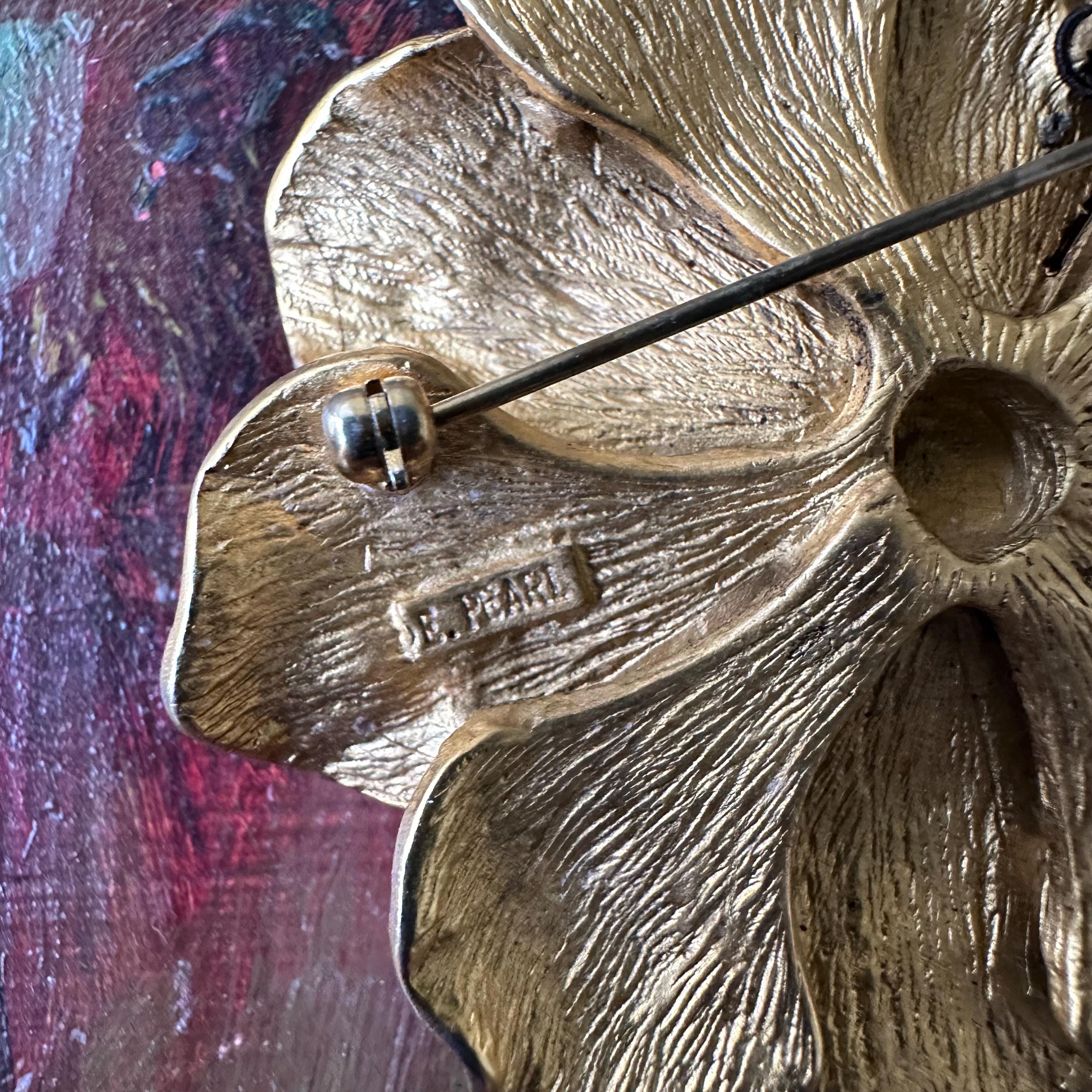 This is a set of vintage Erwin Pearl jewelry. The set includes a large gold toned textured flower brooch and a pair of matching gold toned clip on earrings. The brooch has a bar pin back and is marked E. Pearl. The earrings have clip on backs and are marked Edwin Pearl.