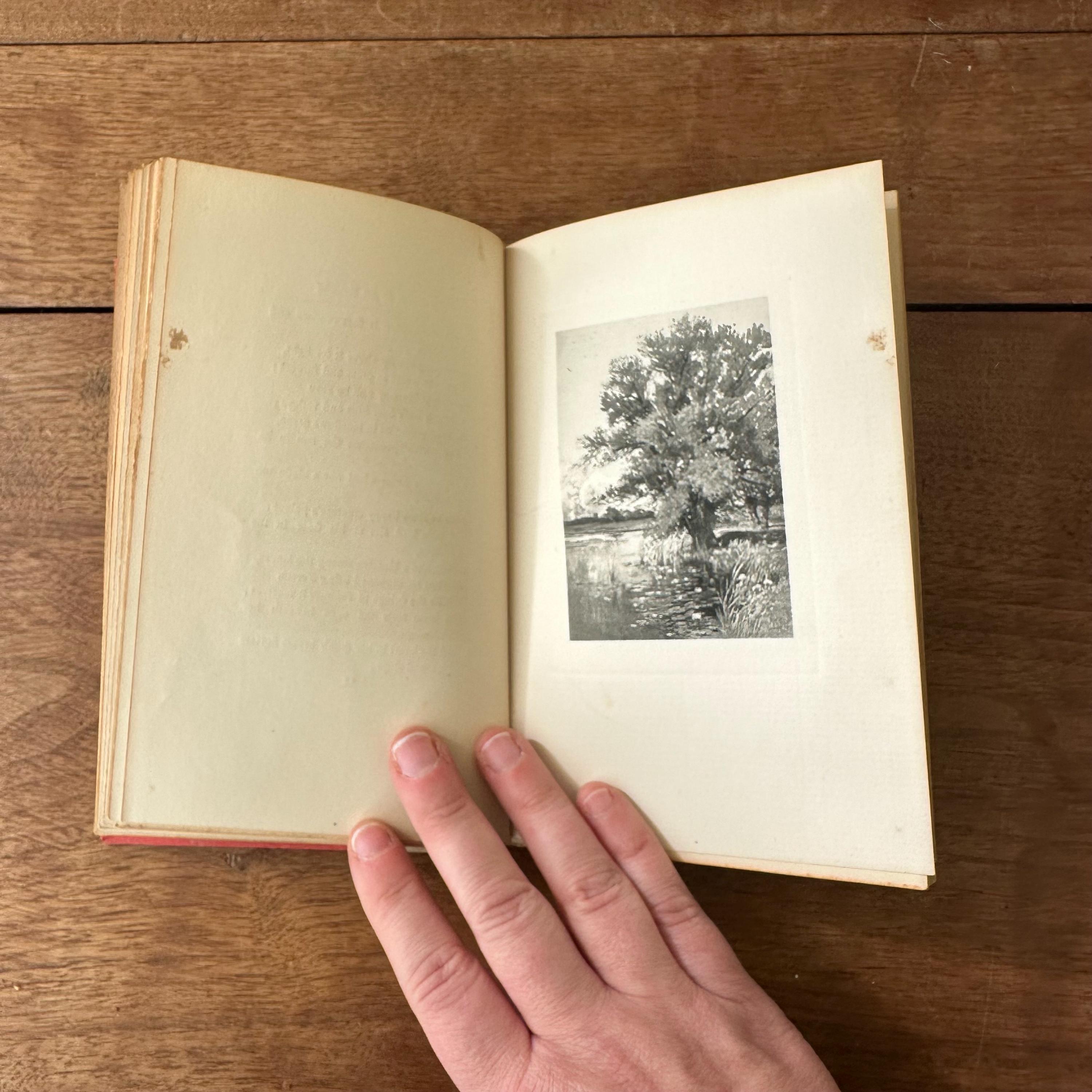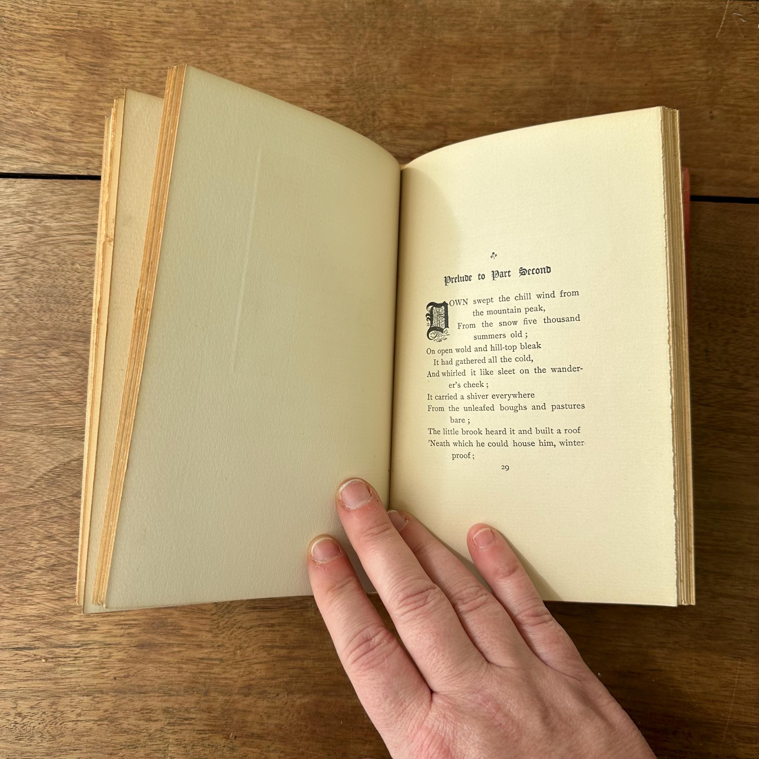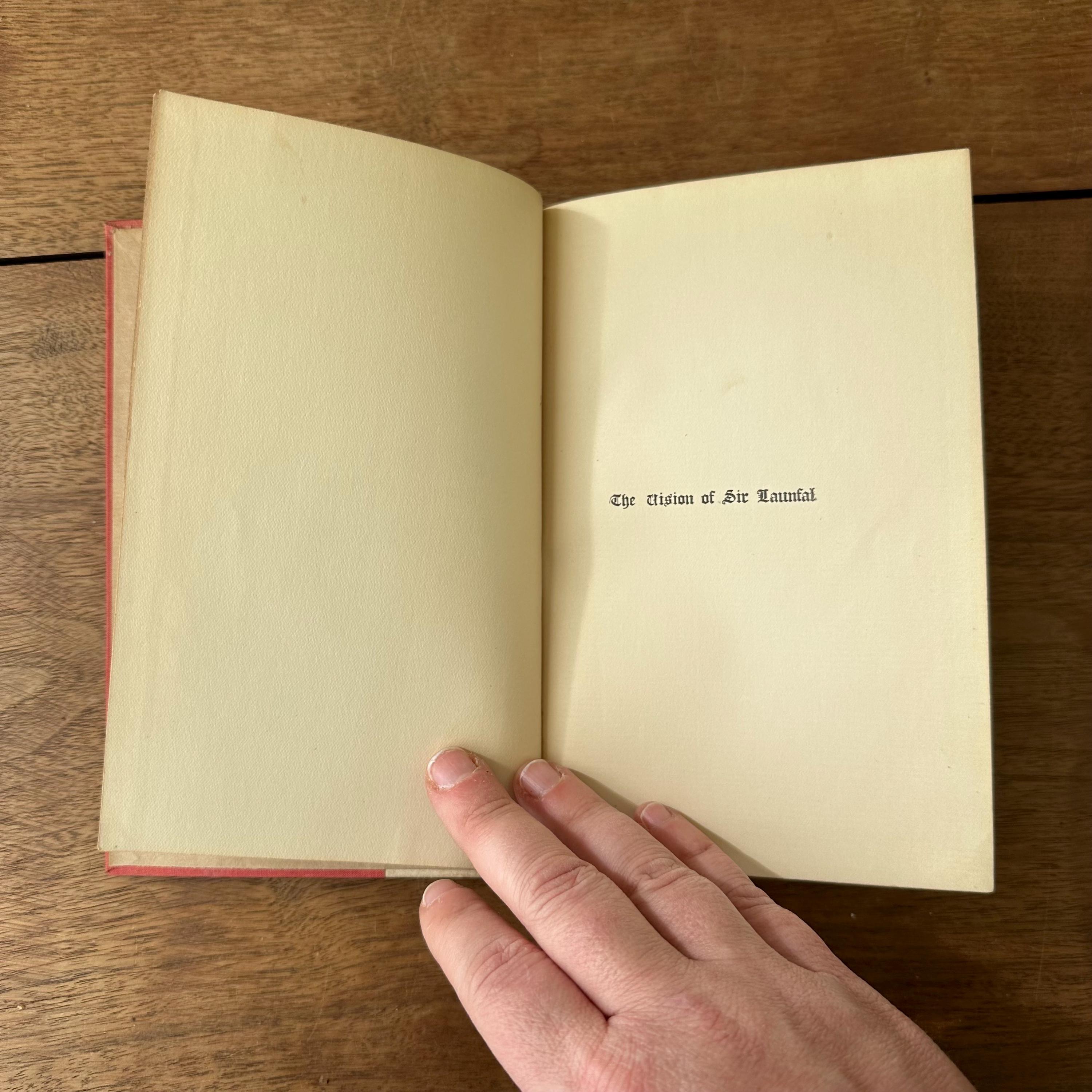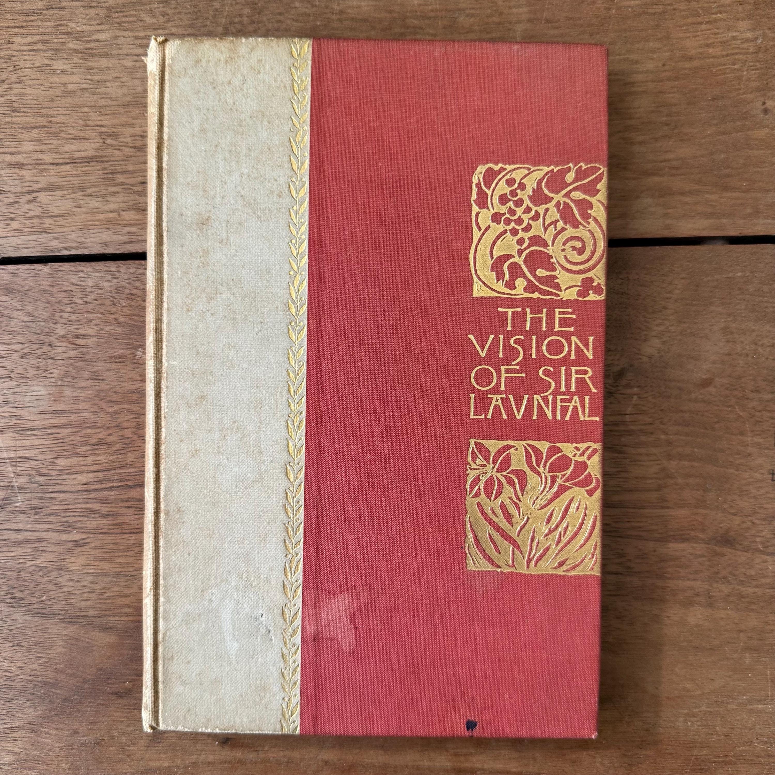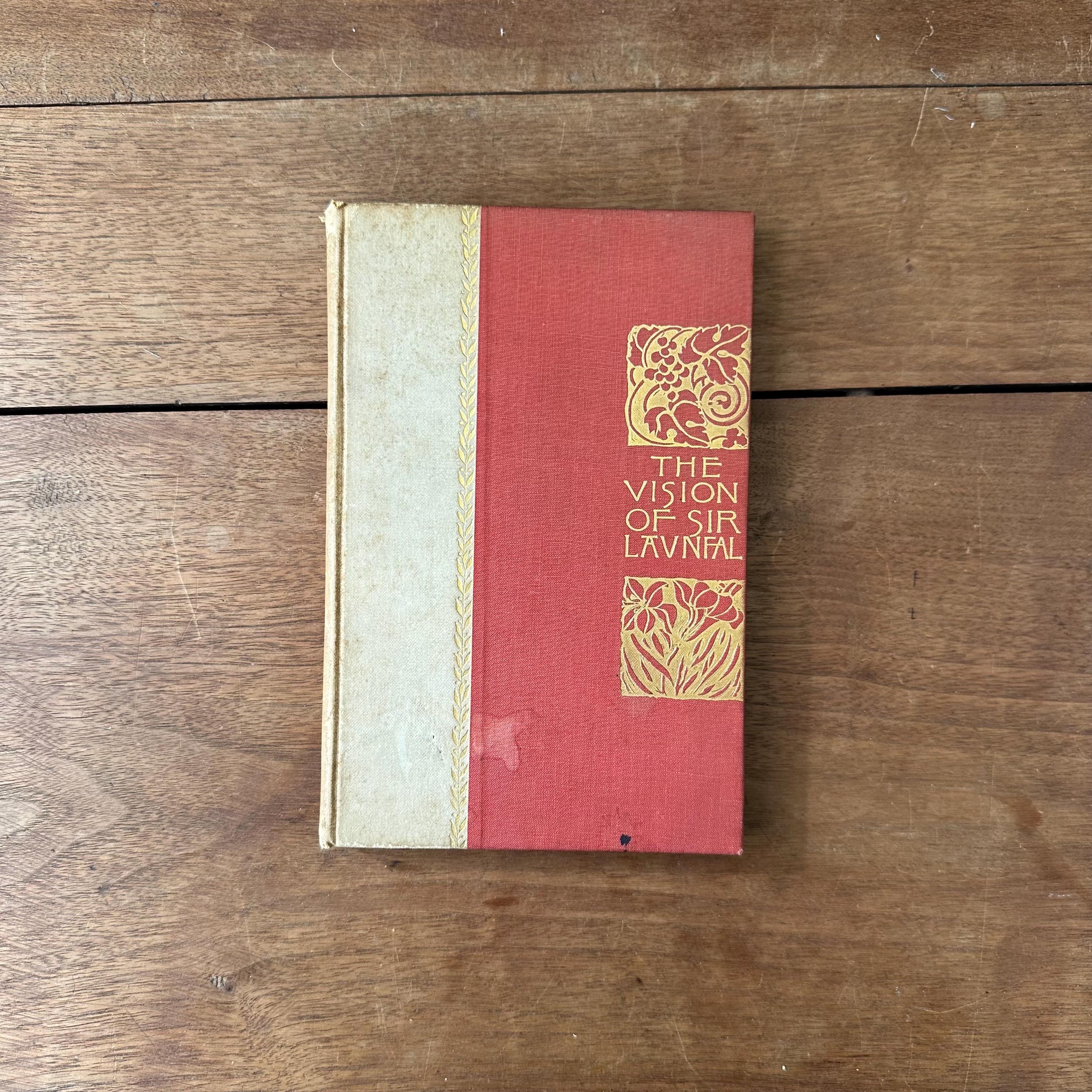 This is the 1892 antique edition of The Vision of Sir Launfal by James Russell Lowell, published by Houghton, Mifflin, and Company. It features red covers with white binding for the spine. The cover is illustrated and lettered in gold. The spine is also lettered in gold. The book is illustrated with lovely etchings by E.H. Garrett. The book tells a story of King Arthur and the Holy Grail in poetry. There are 48 pages.