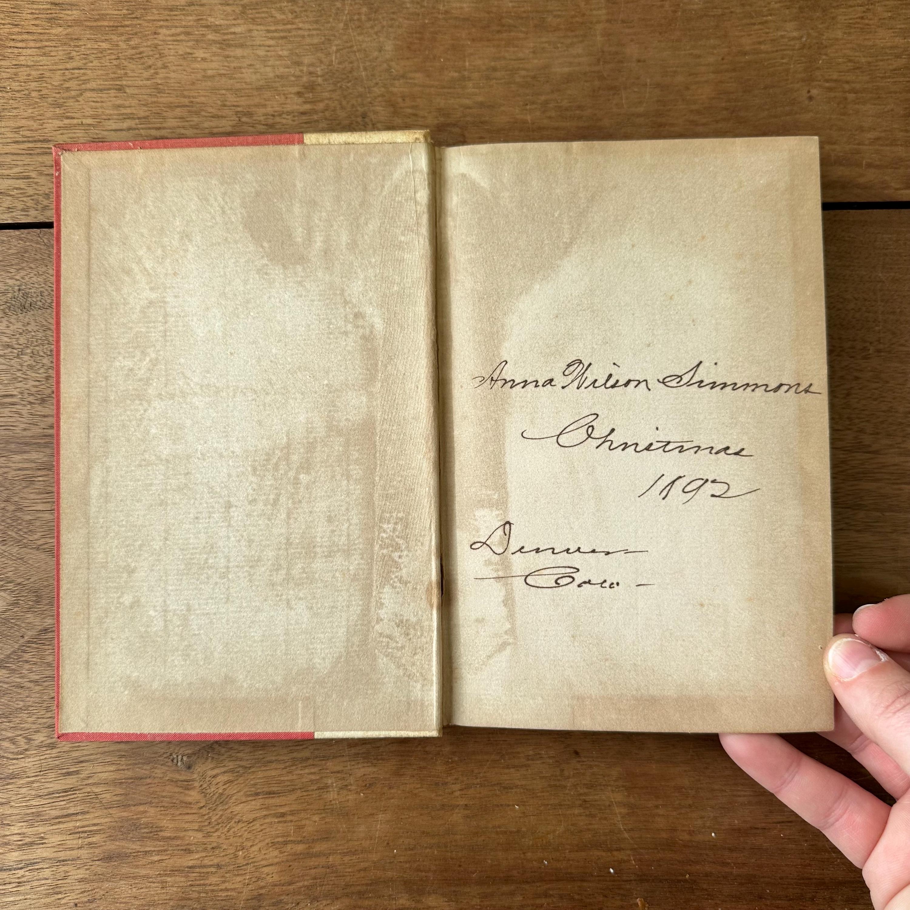 The book is in good antique condition for its age and use. The covers have general wear with staining and darkening of the white binding. There are several small stains to the red portion of the cover as well. The gold detailing is intact and bright. There is an ink inscription inside the front cover - Anna Wilson Simmons Christmas 1892 Denver Colo. The pages are beginning to brown but the illustrations are still bright.