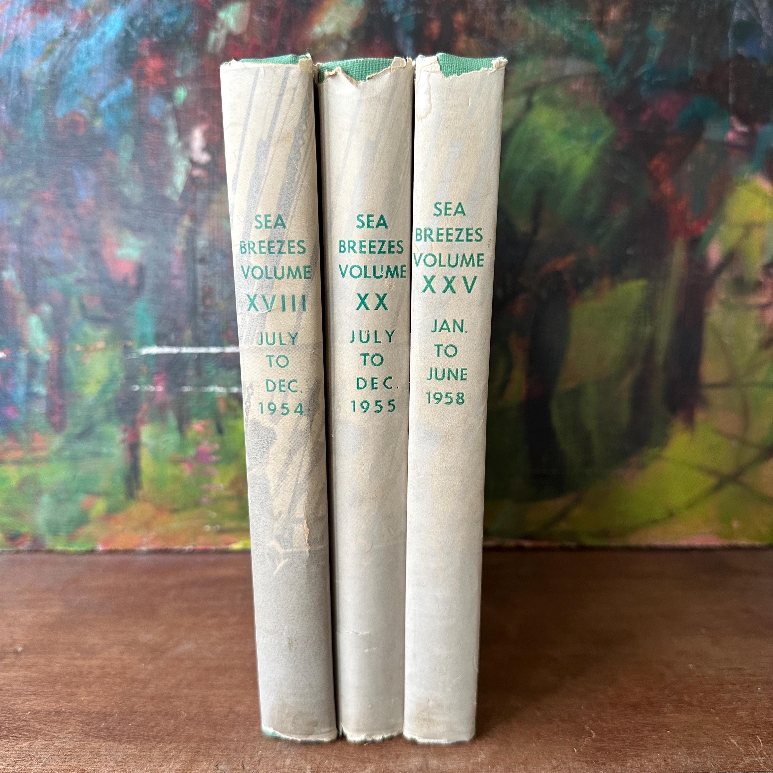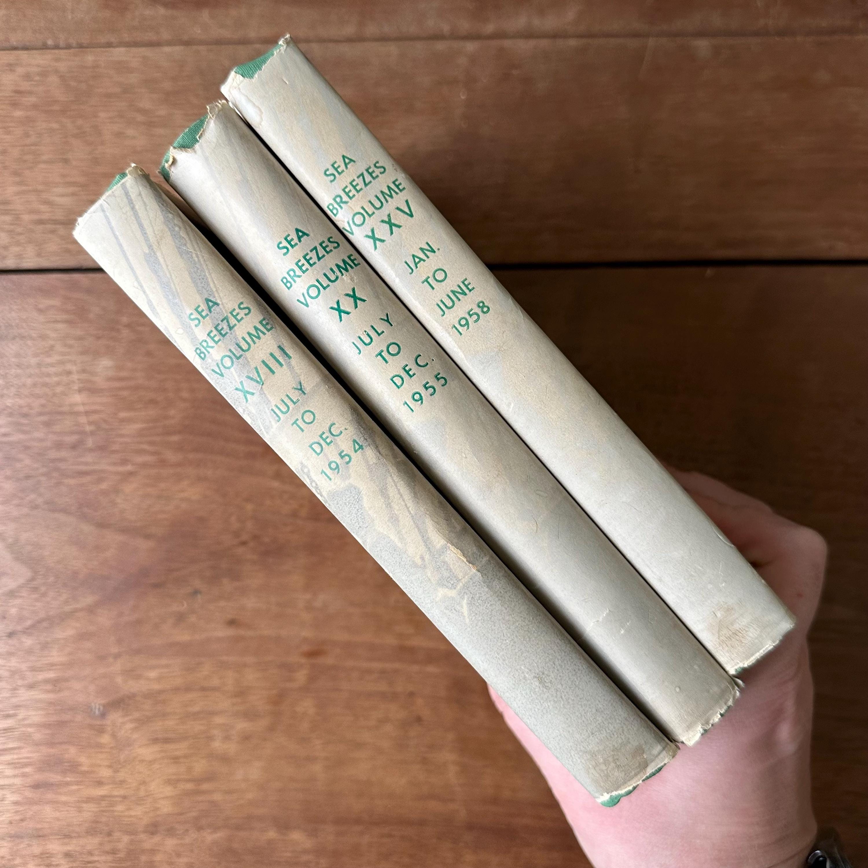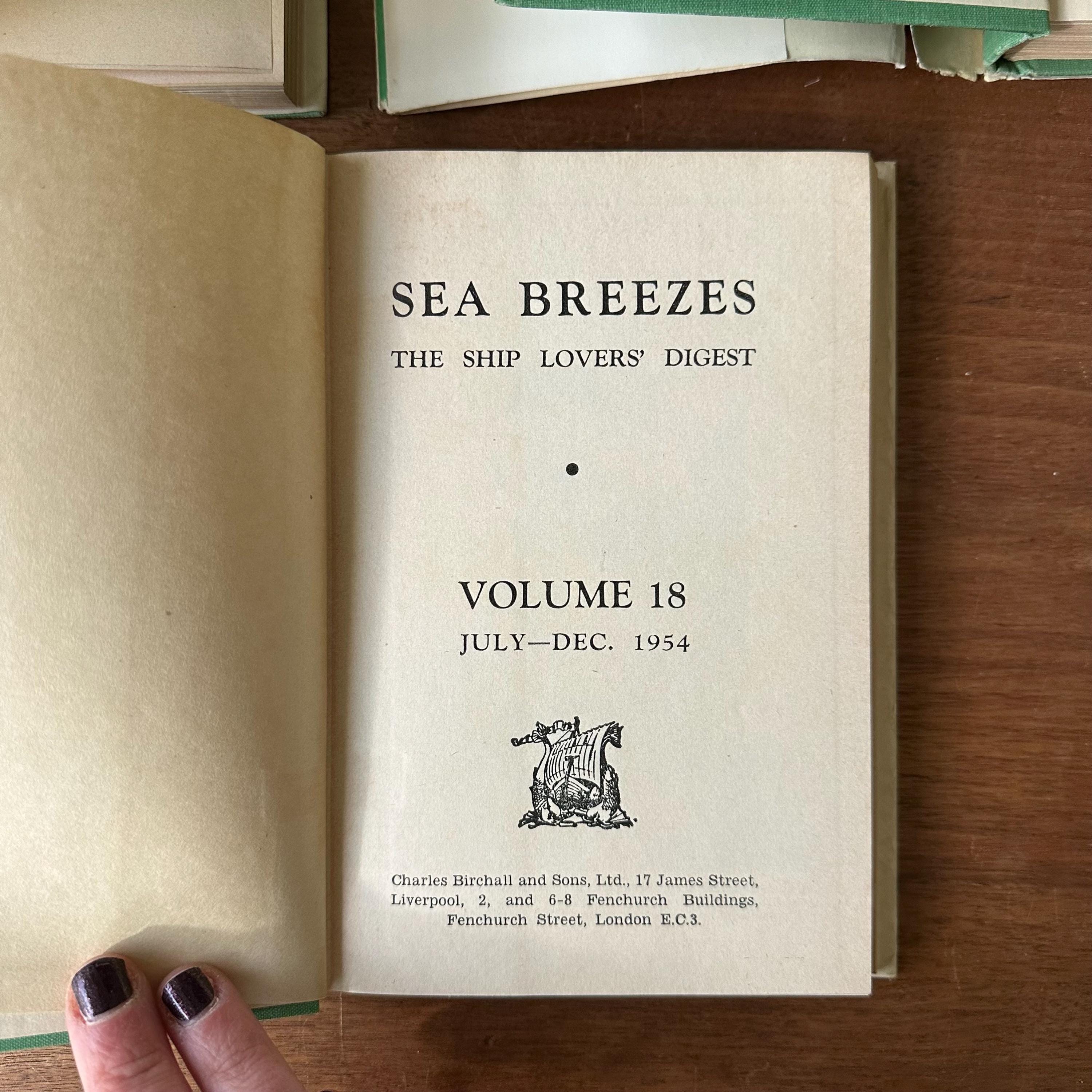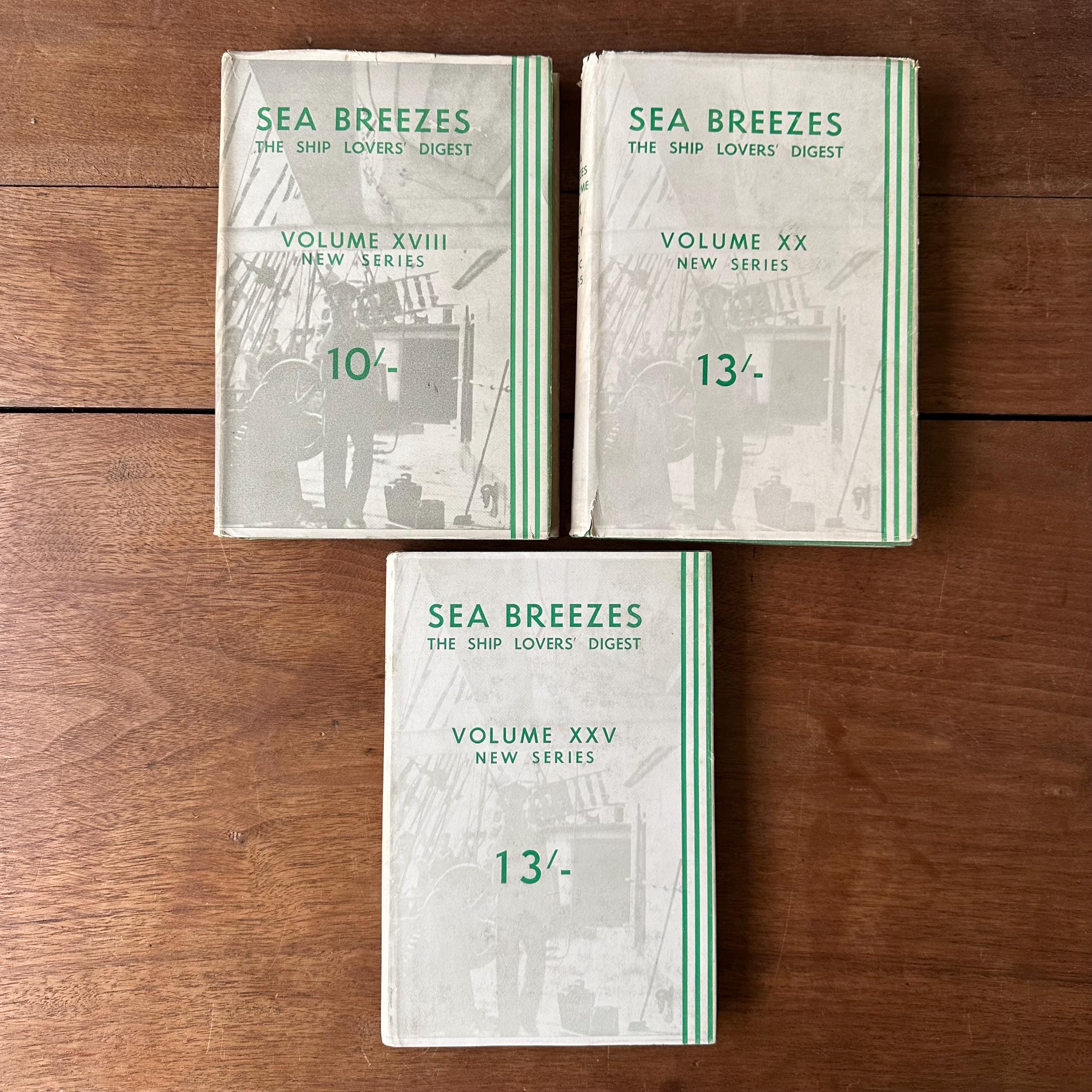 This is a set of three 1950s era Sea Breezes: The Ship Lovers' Digest bound magazines set. The set includes volumes XVIII July to Dec. 1954, XX July to Dec. 1955, and XXV Jan to June 1958. The books still have their original white and green dust jackets. Underneath the covers are green with gold lettering on the spine. The magazines are illustrated with black and white photographs and illustrations. Each volume has 472 pages.