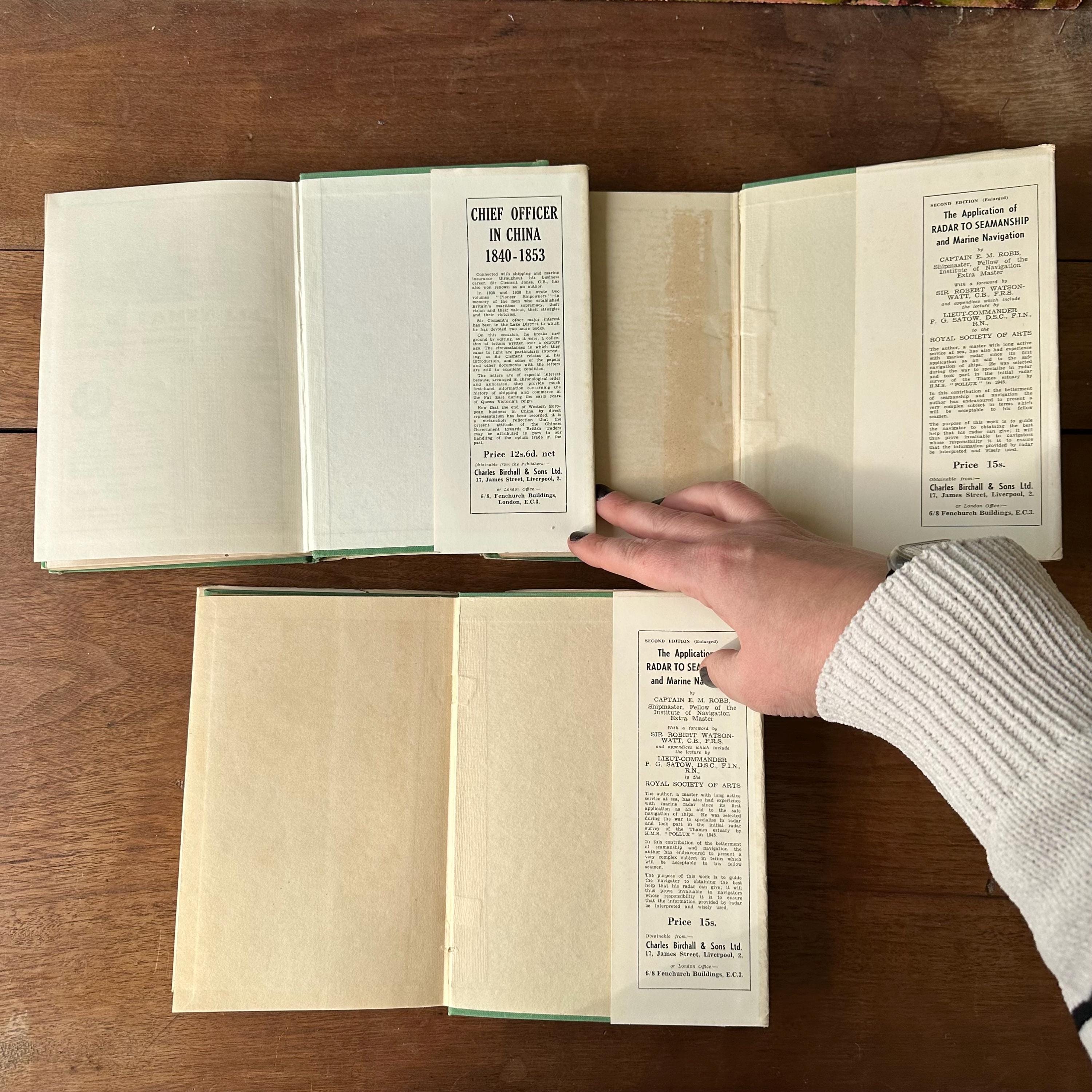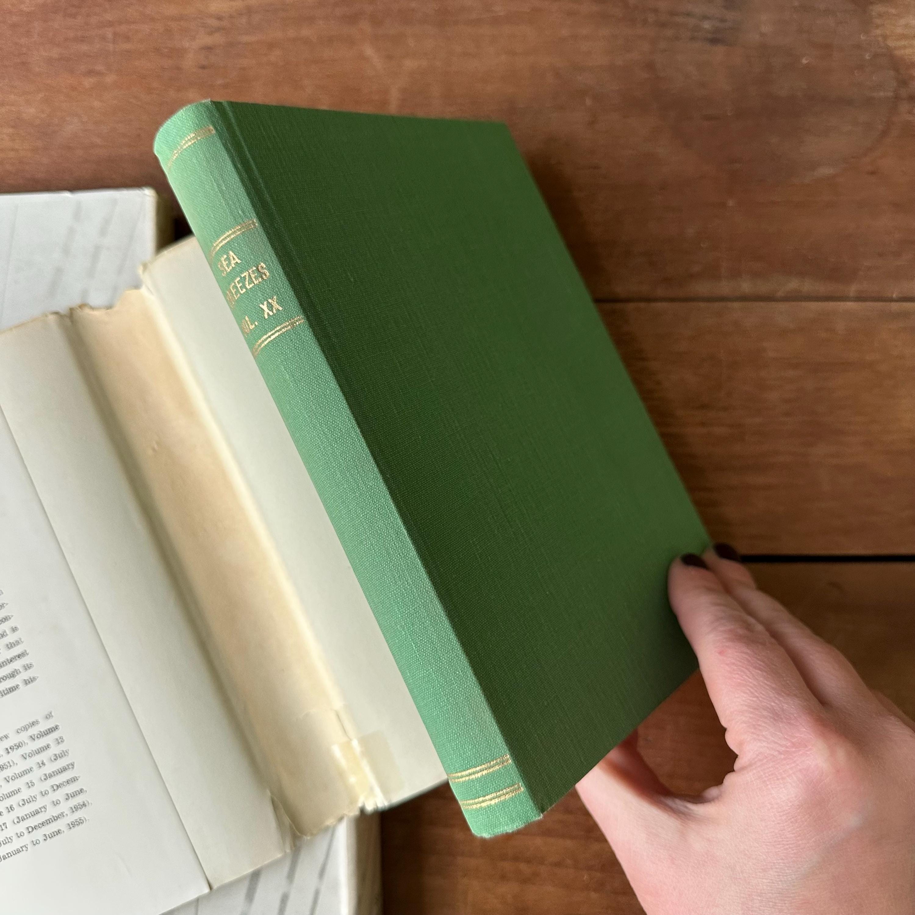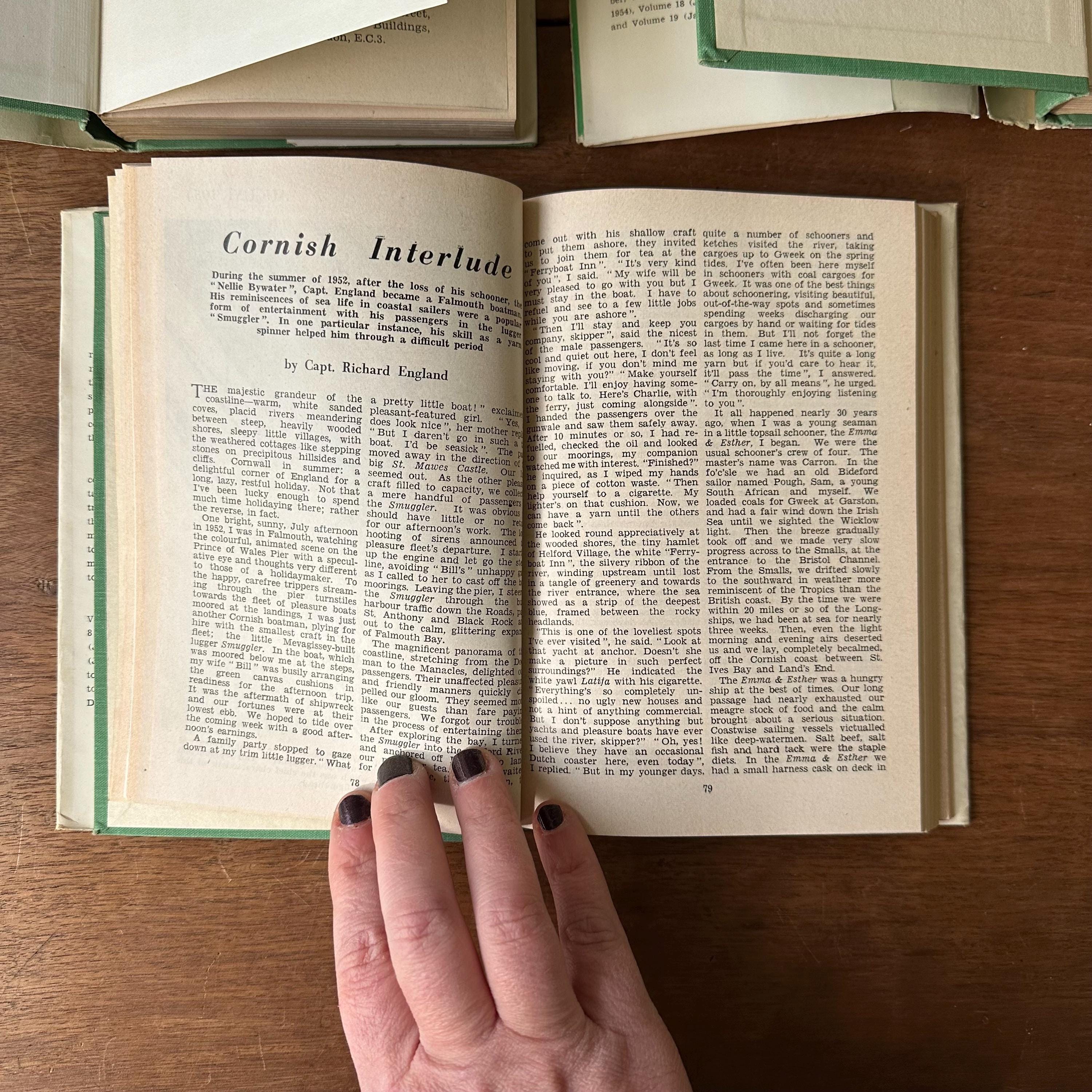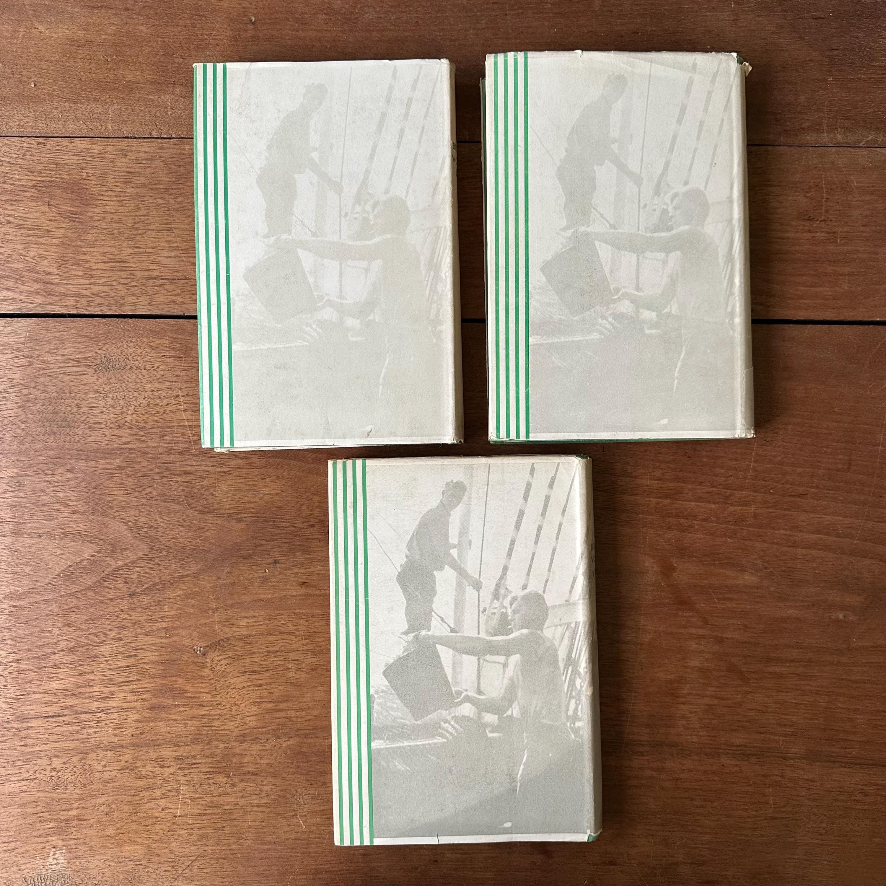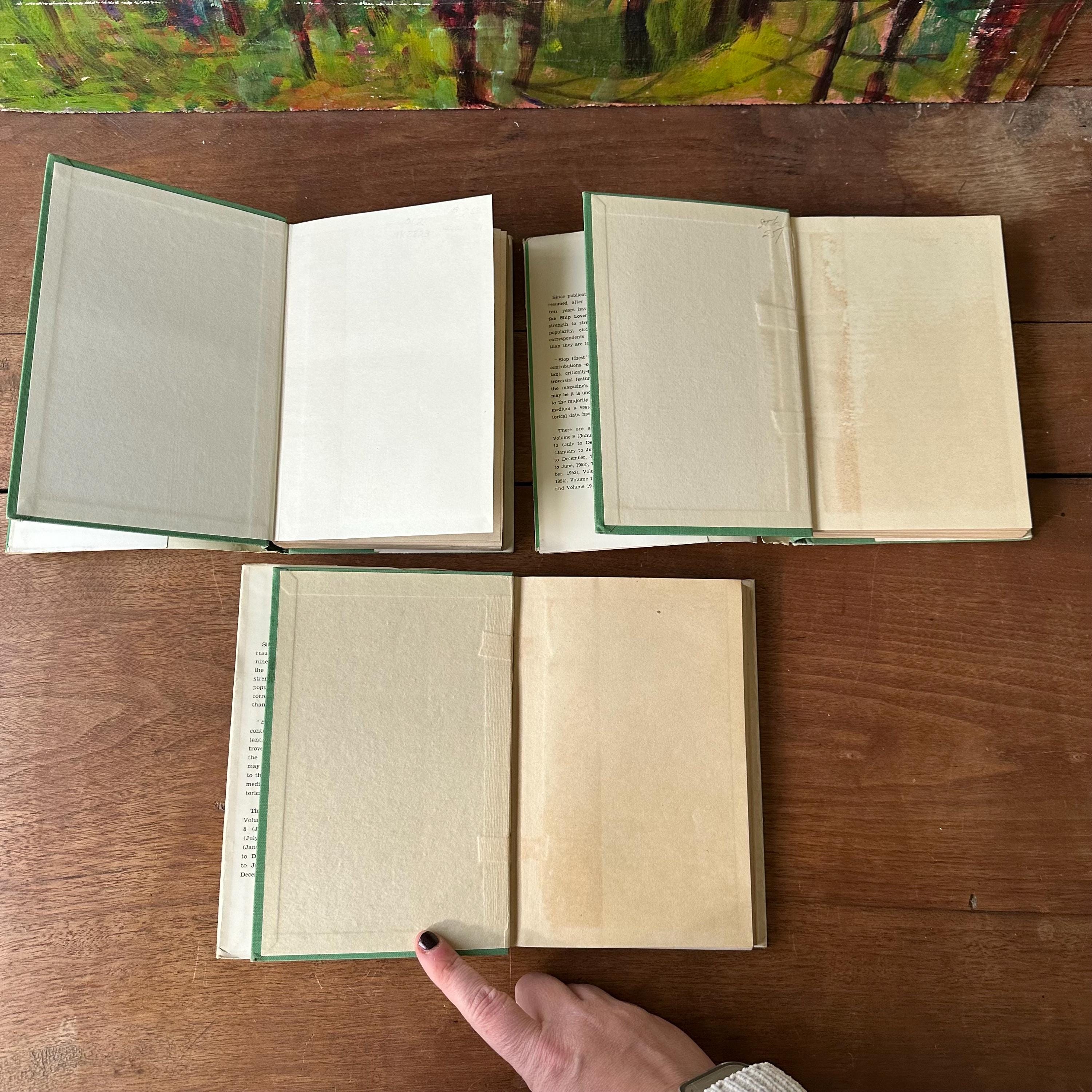 This is a set of three 1950s era Sea Breezes: The Ship Lovers' Digest bound magazines set. The set includes volumes XVIII July to Dec. 1954, XX July to Dec. 1955, and XXV Jan to June 1958. The books still have their original white and green dust jackets. Underneath the covers are green with gold lettering on the spine. The magazines are illustrated with black and white photographs and illustrations. Each volume has 472 pages.