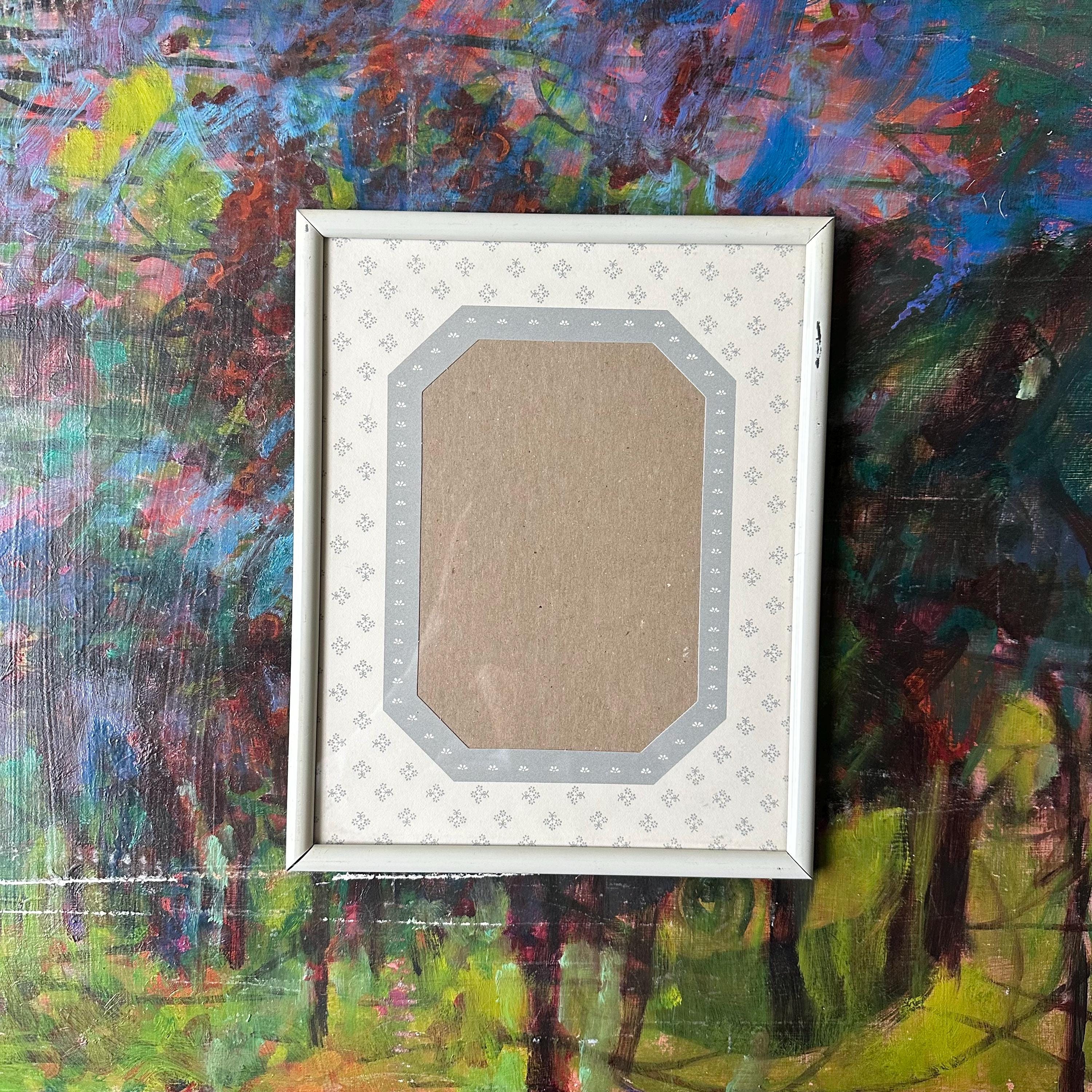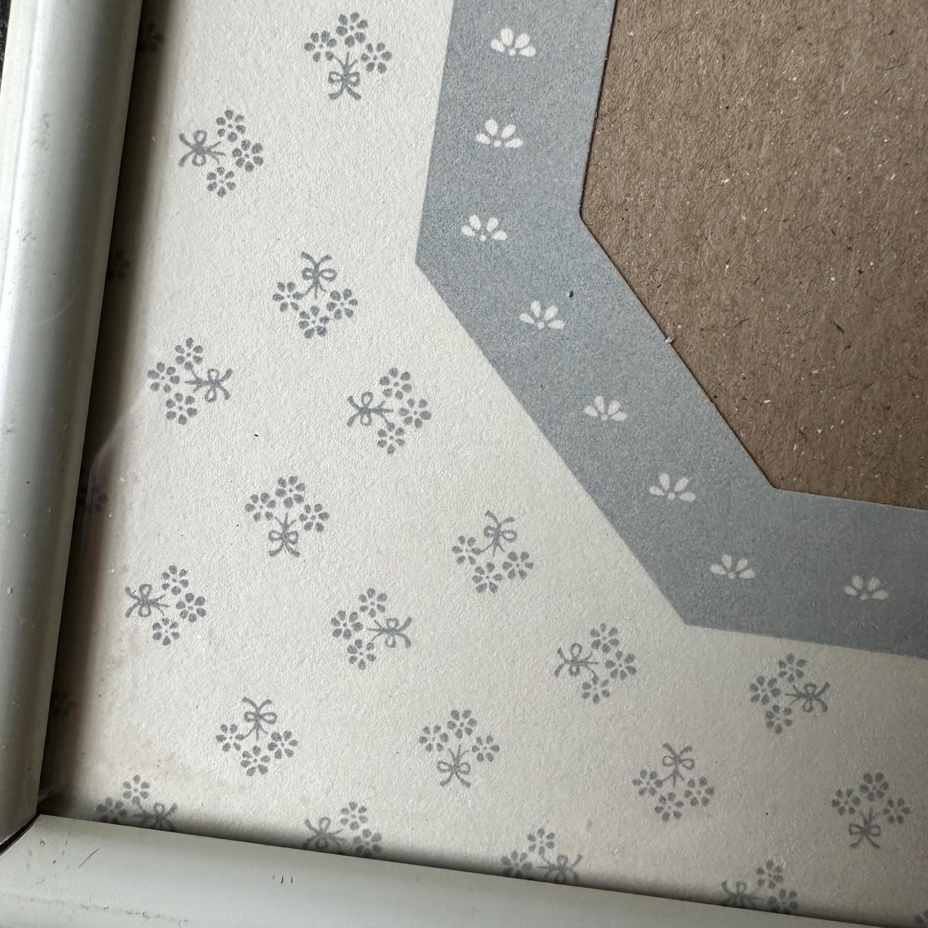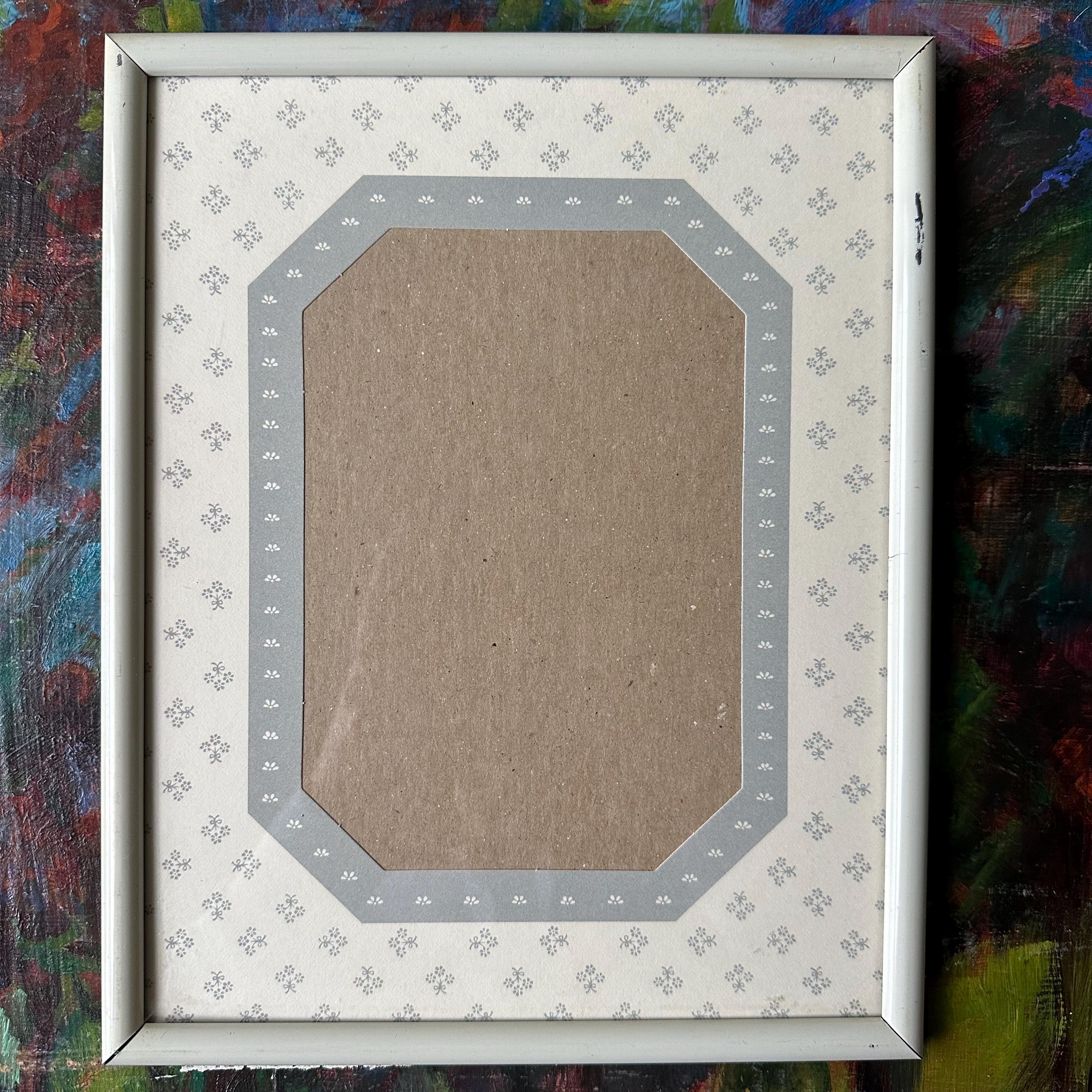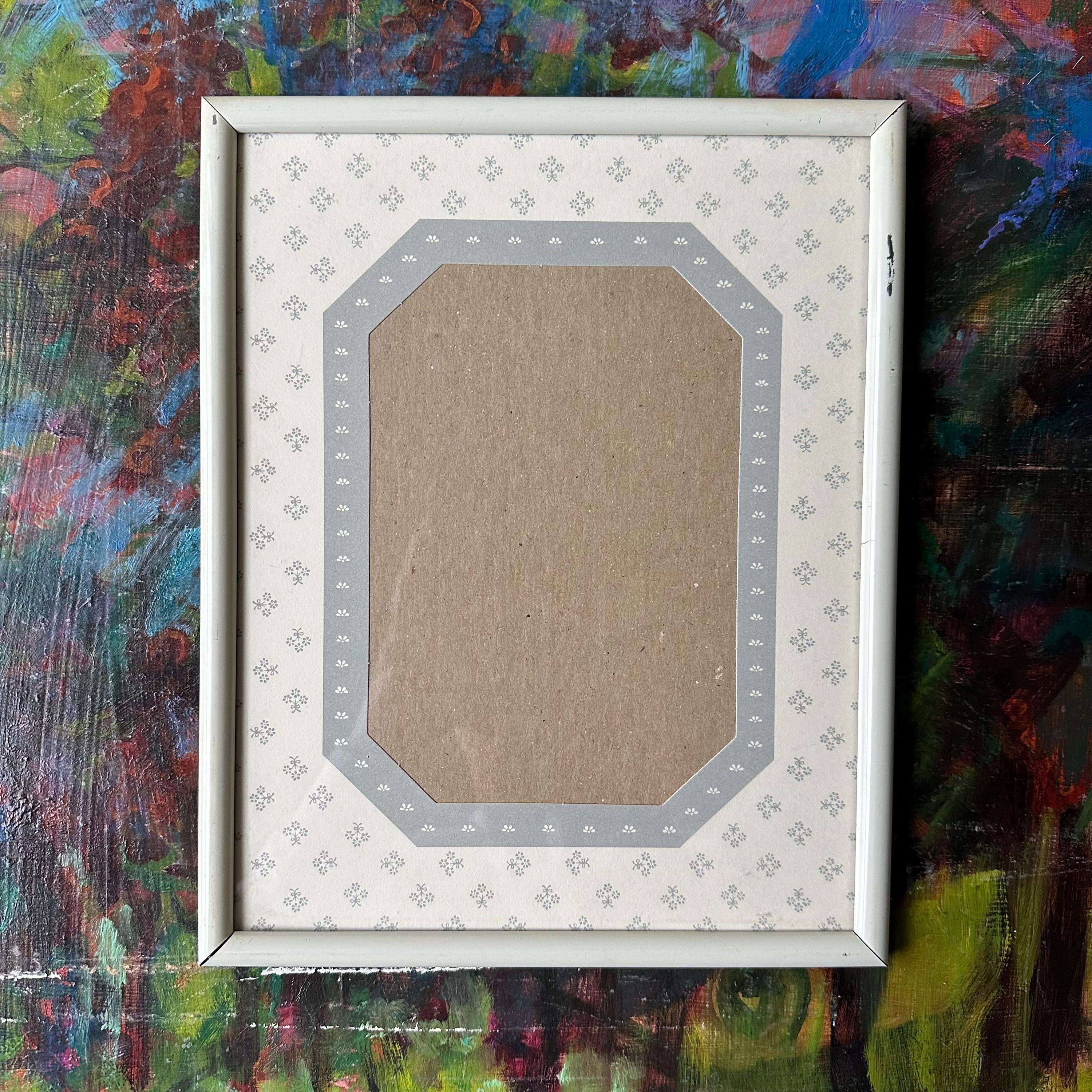 This is a vintage white metal photo frame with a gray and white floral mat, probably from the 90s. It has a solid white metal rounded frame with a glass cover. The mat under the cover is mostly white with little gray flower bouquets. It has an elongated octagon photo opening that fits a 5 x 7 picture. The octagon has a gray border with little white flowers. The black is black cardboard with a frame stand. There are also little triangle cutouts on the metal edge on three sides that could be used to hang it on the wall.