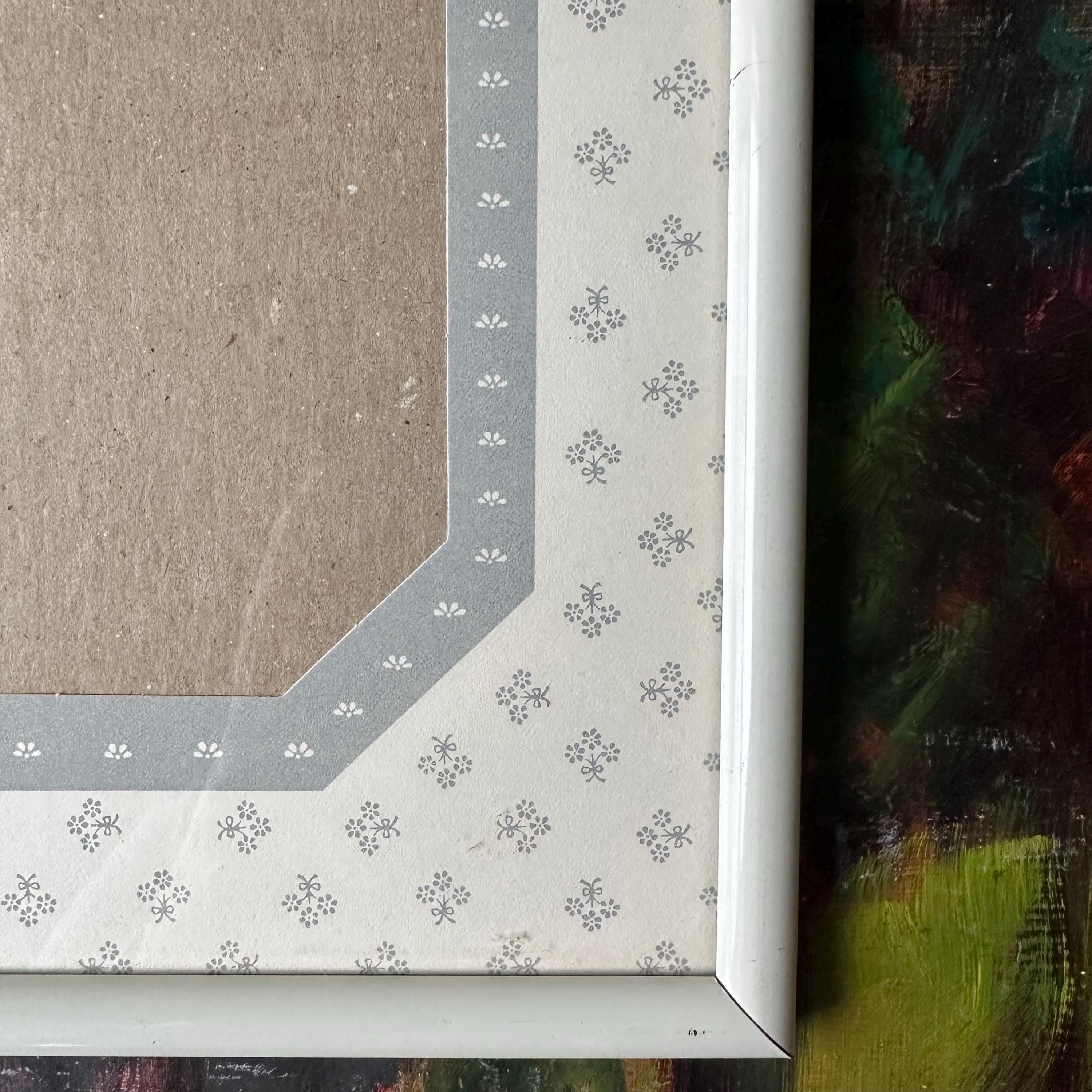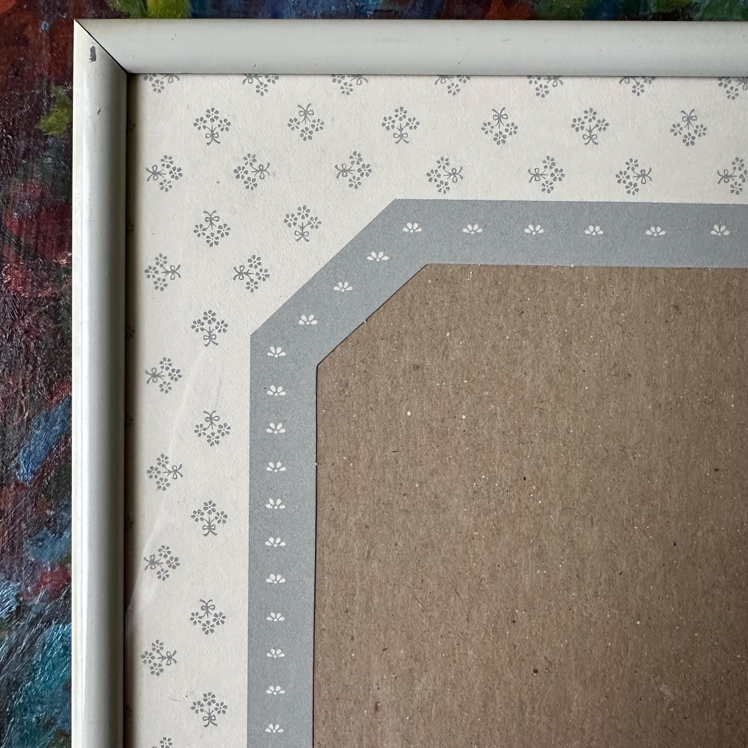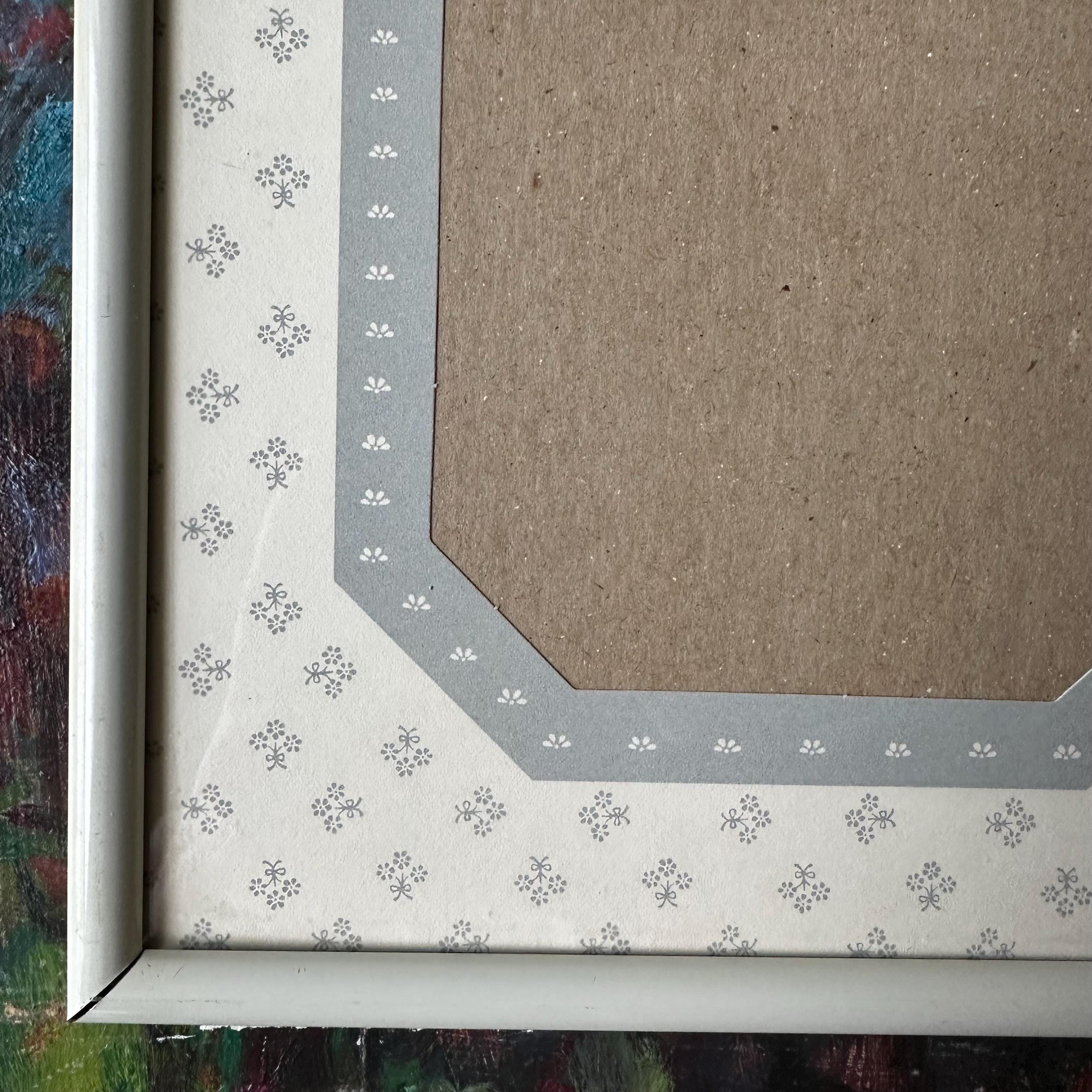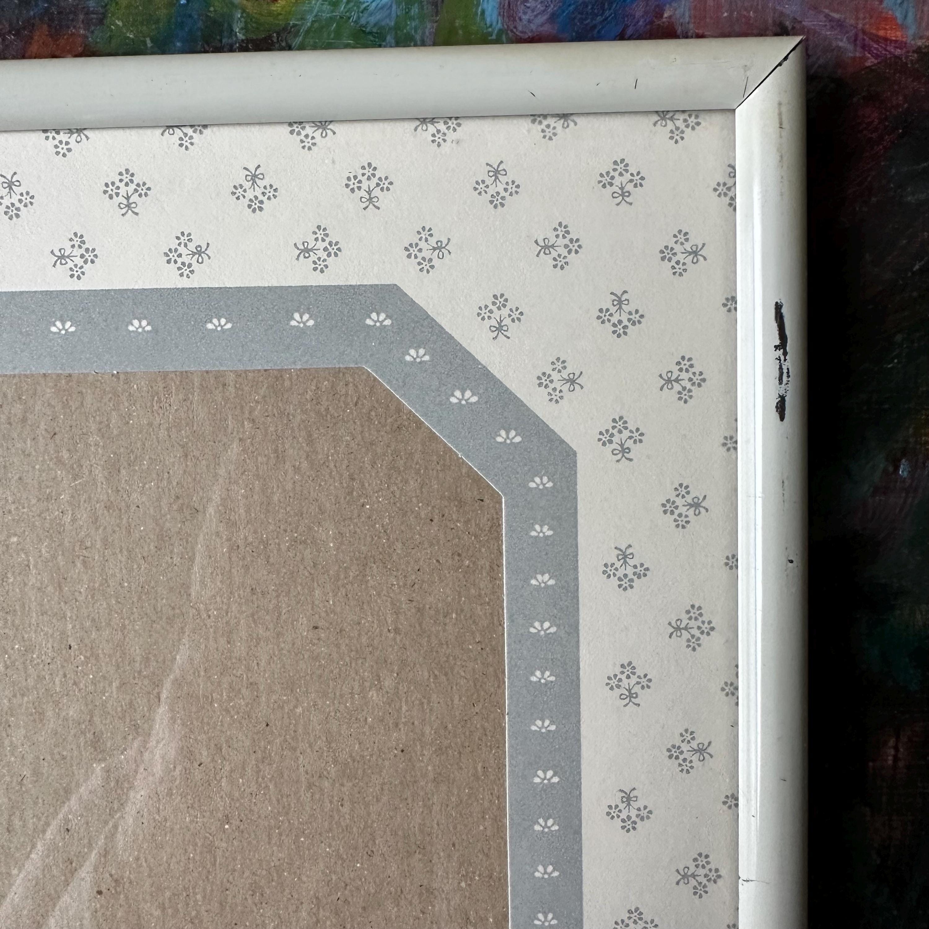 This is a vintage white metal photo frame with a gray and white floral mat, probably from the 90s. It has a solid white metal rounded frame with a glass cover. The mat under the cover is mostly white with little gray flower bouquets. It has an elongated octagon photo opening that fits a 5 x 7 picture. The octagon has a gray border with little white flowers. The black is black cardboard with a frame stand. There are also little triangle cutouts on the metal edge on three sides that could be used to hang it on the wall.