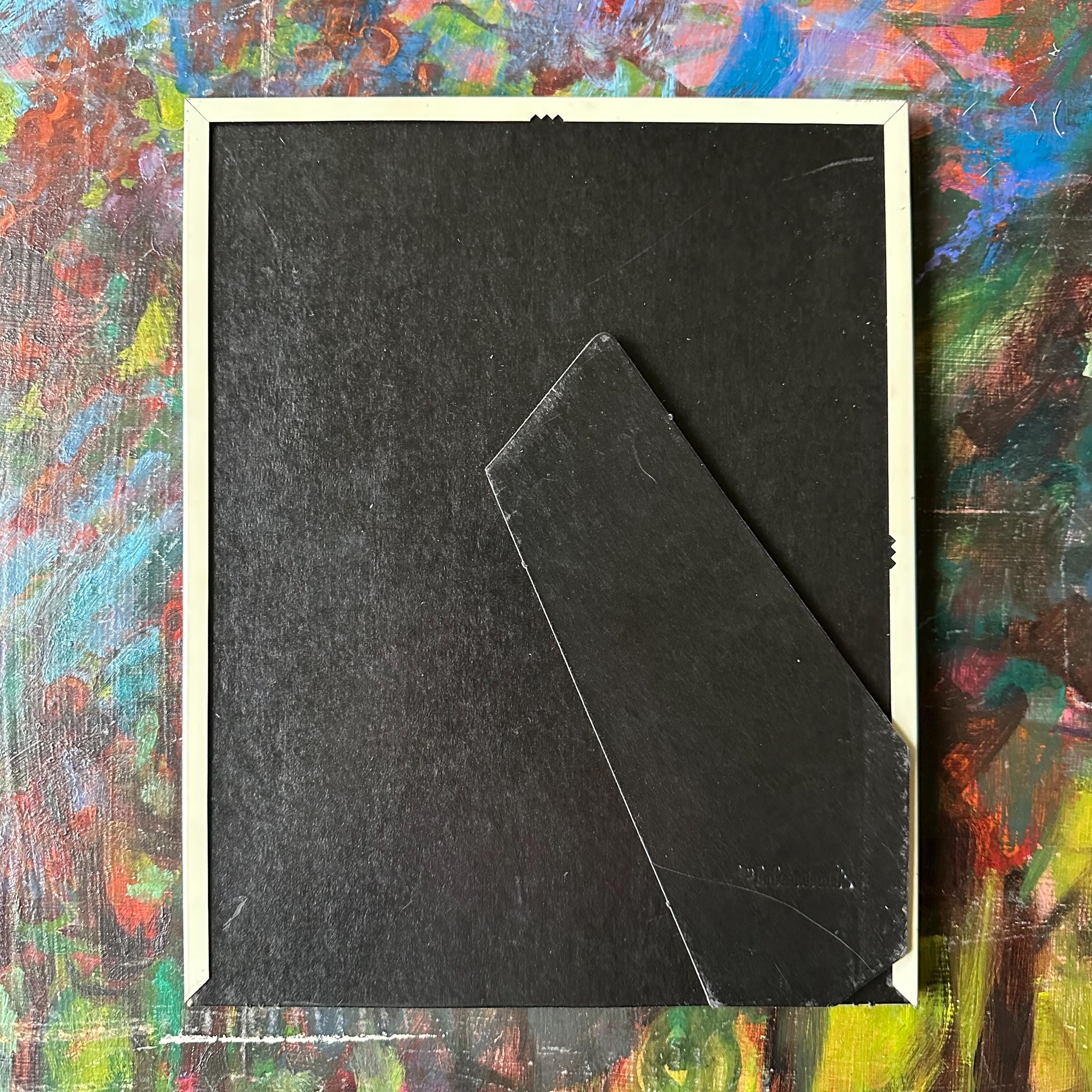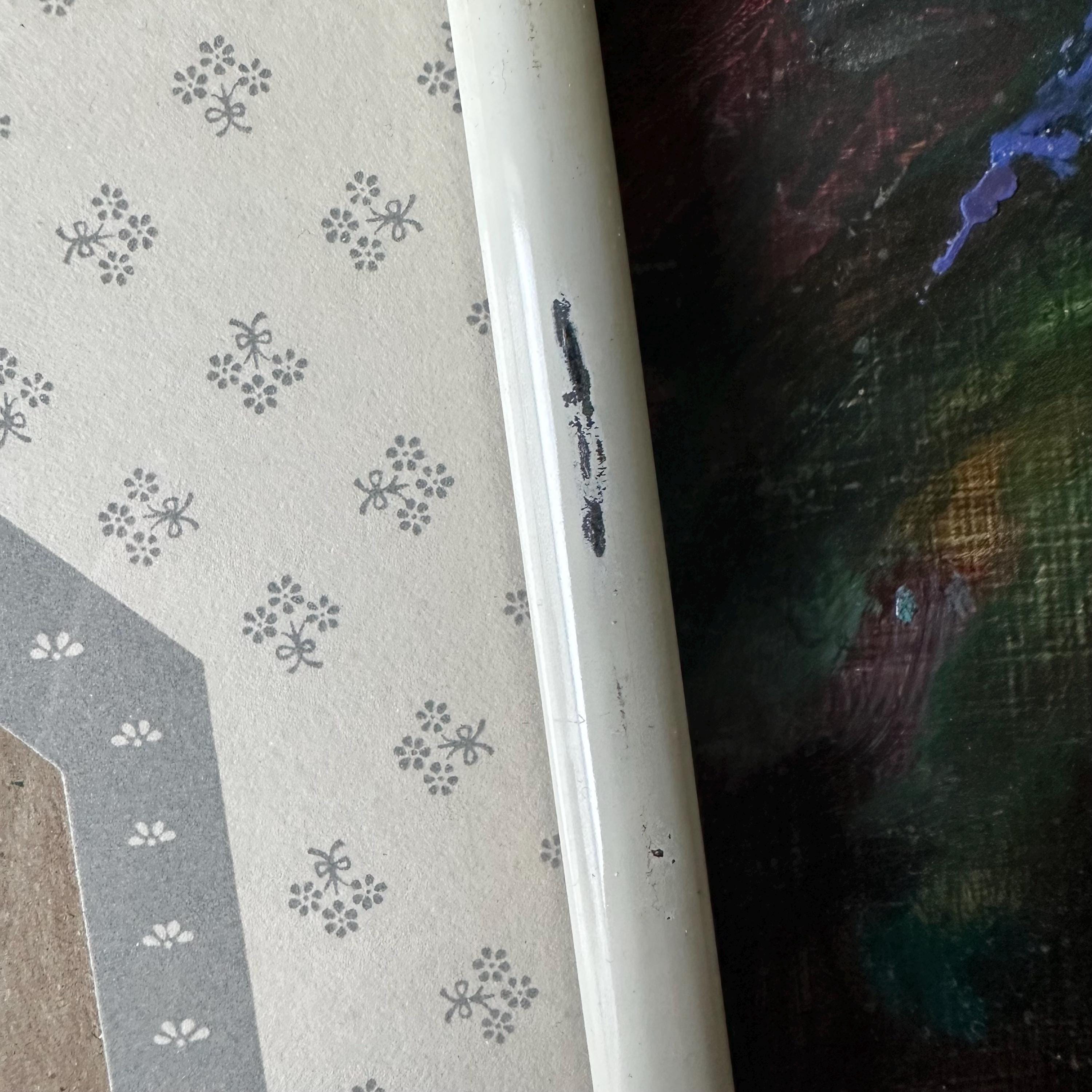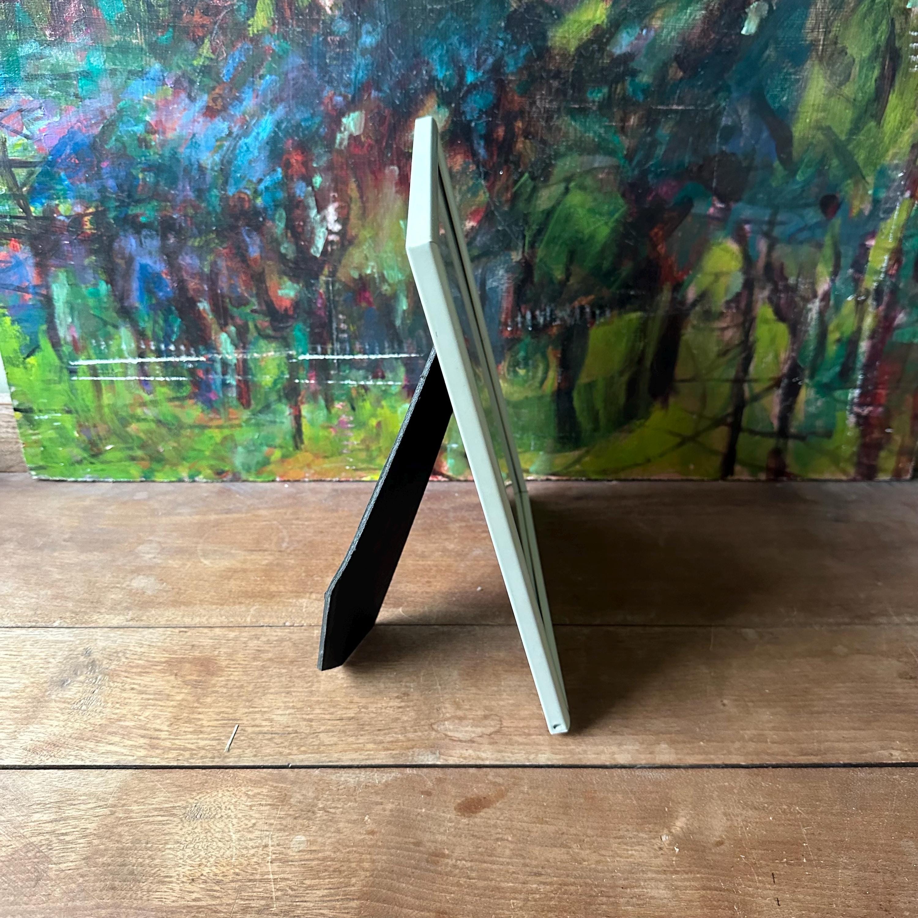 The frame is in good vintage condition for its age and use. The frame has general wear with a large scratch to the upper right side. Please see photos. The glass is clear and the mat is in great condition with no tears or stains. The frame sits upright on its own.