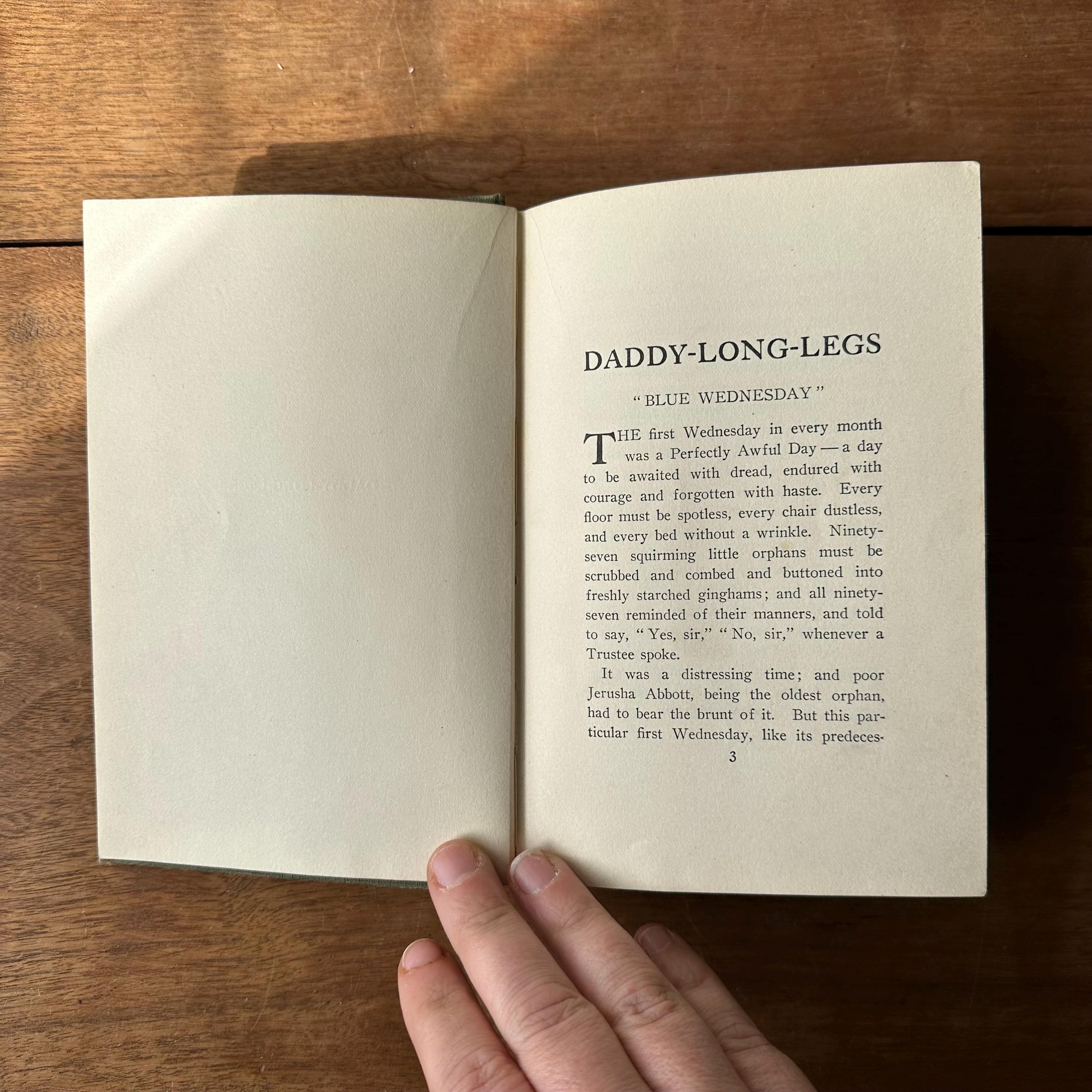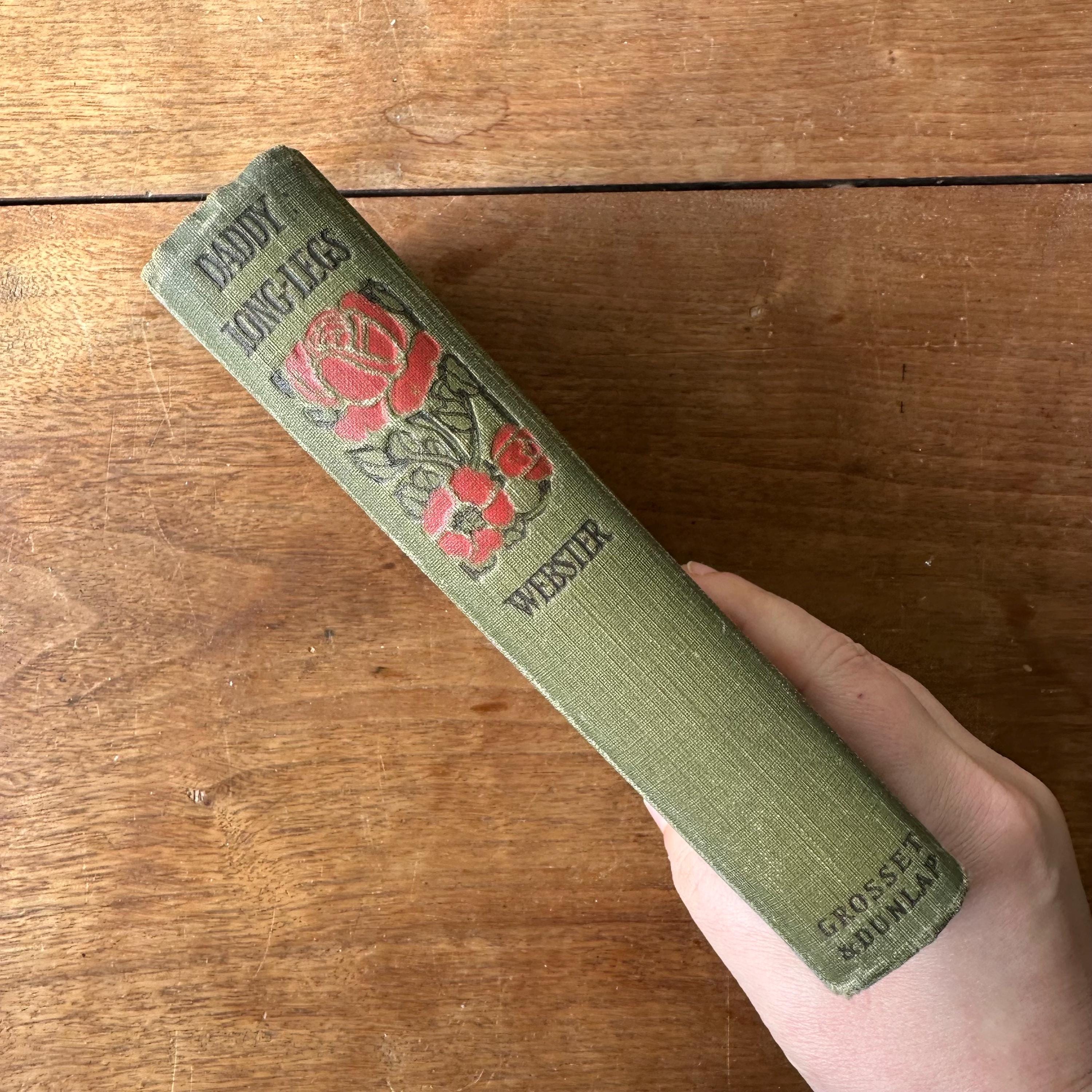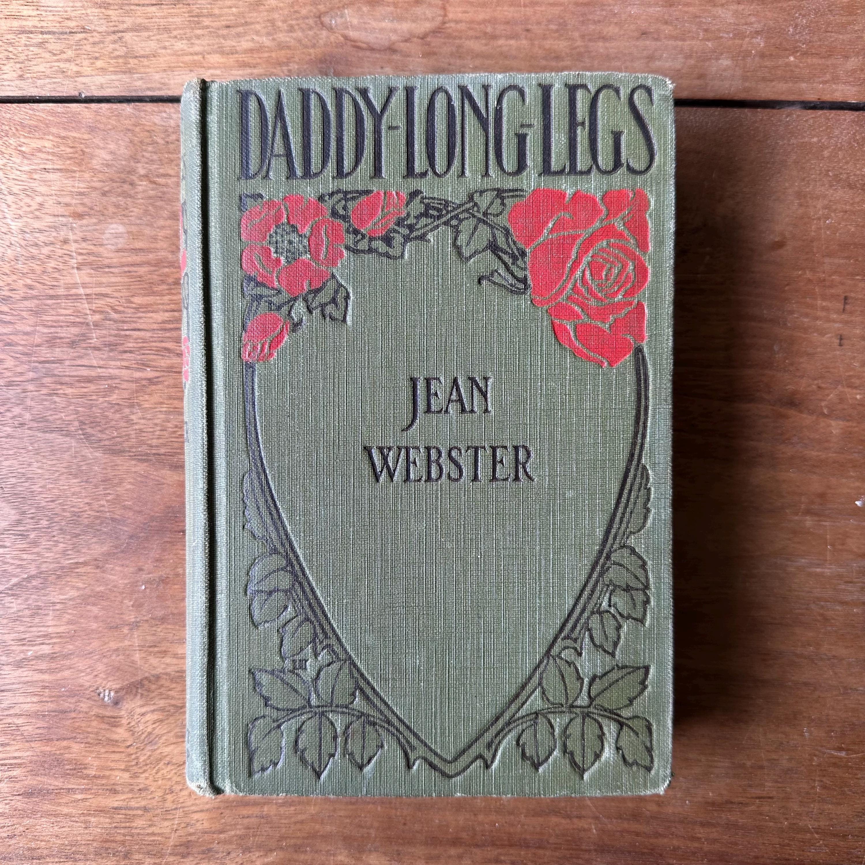 This is the antique 1912 edition of Daddy-Long-Legs by Jean Webster. The book has green covers with black lettering. The front cover is decorated with an Art Nouveau motif of a heart with red roses. The spine is also decorated with red flowers. The book is written as a series of illustrated letters with illustrations by Webster. There are also black and white photograph plates from the play. There are 304 pages with several advertisements following.