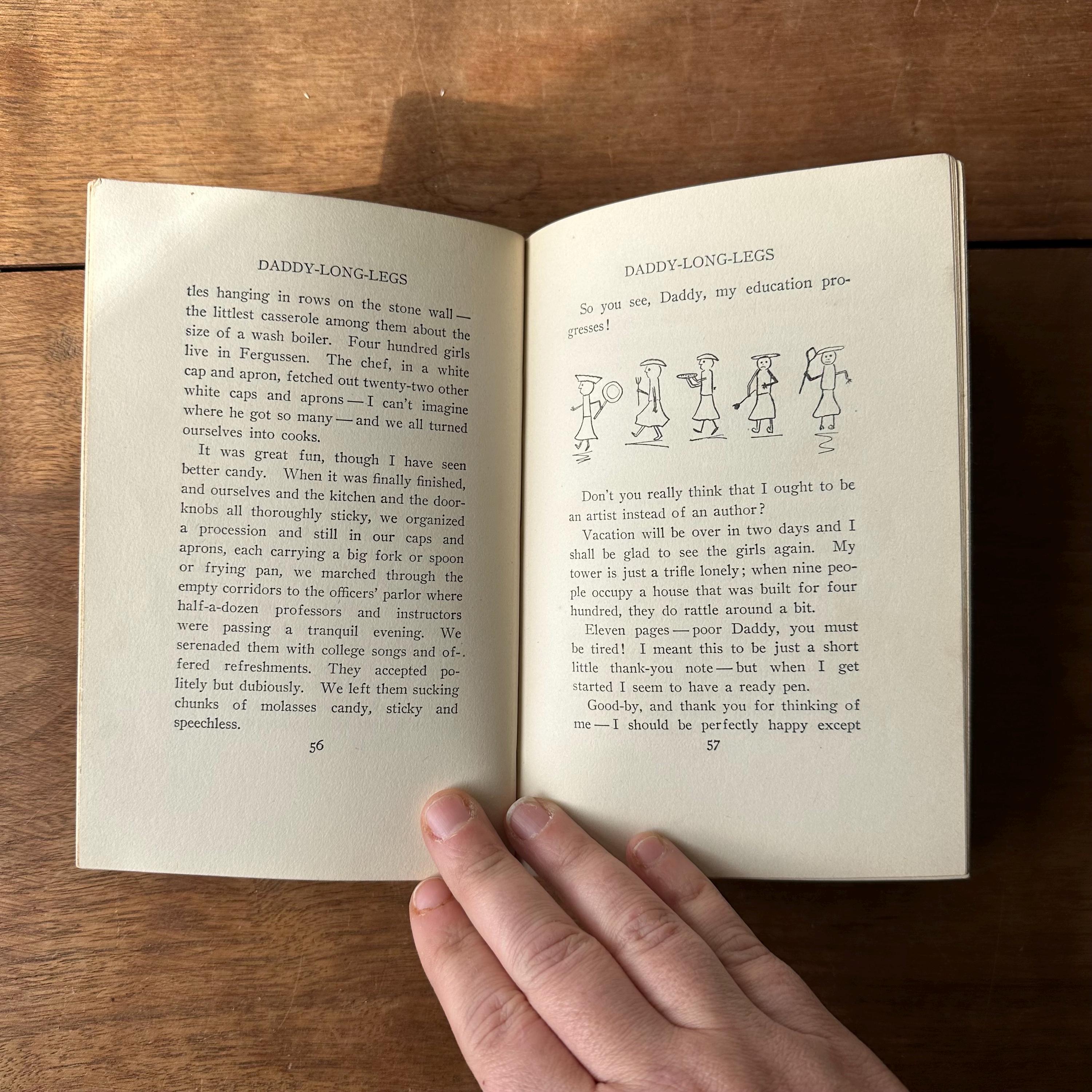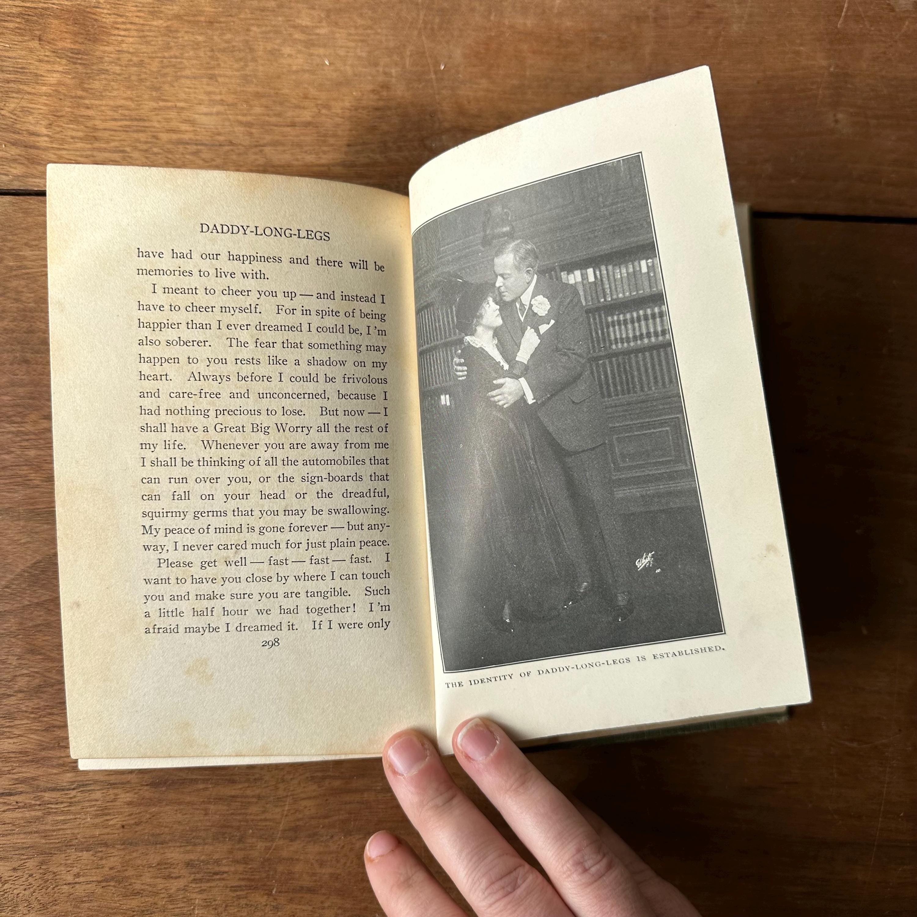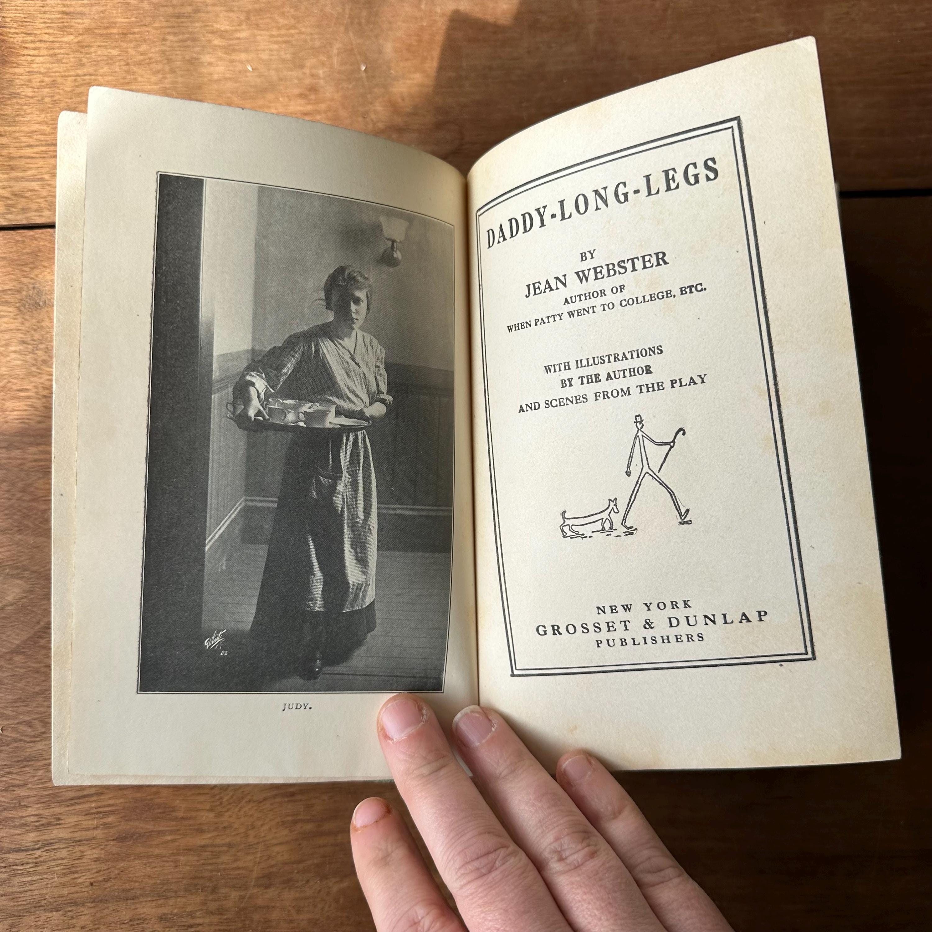This is the antique 1912 edition of Daddy-Long-Legs by Jean Webster. The book has green covers with black lettering. The front cover is decorated with an Art Nouveau motif of a heart with red roses. The spine is also decorated with red flowers. The book is written as a series of illustrated letters with illustrations by Webster. There are also black and white photograph plates from the play. There are 304 pages with several advertisements following.