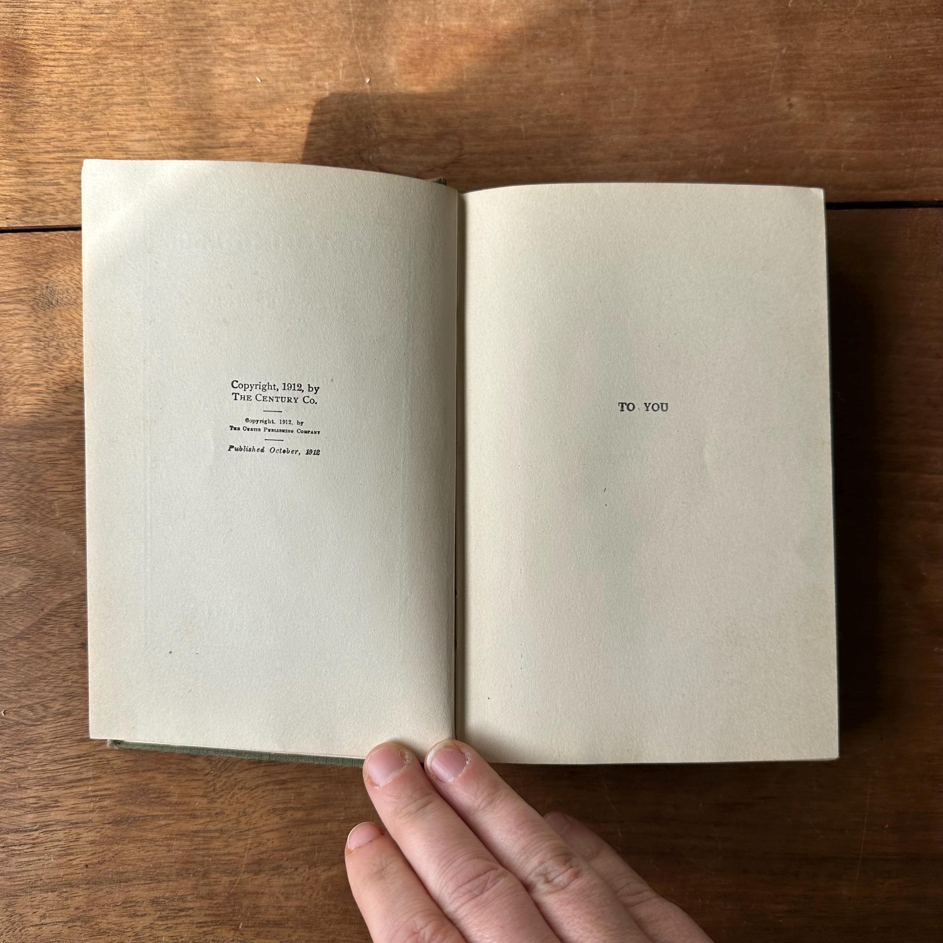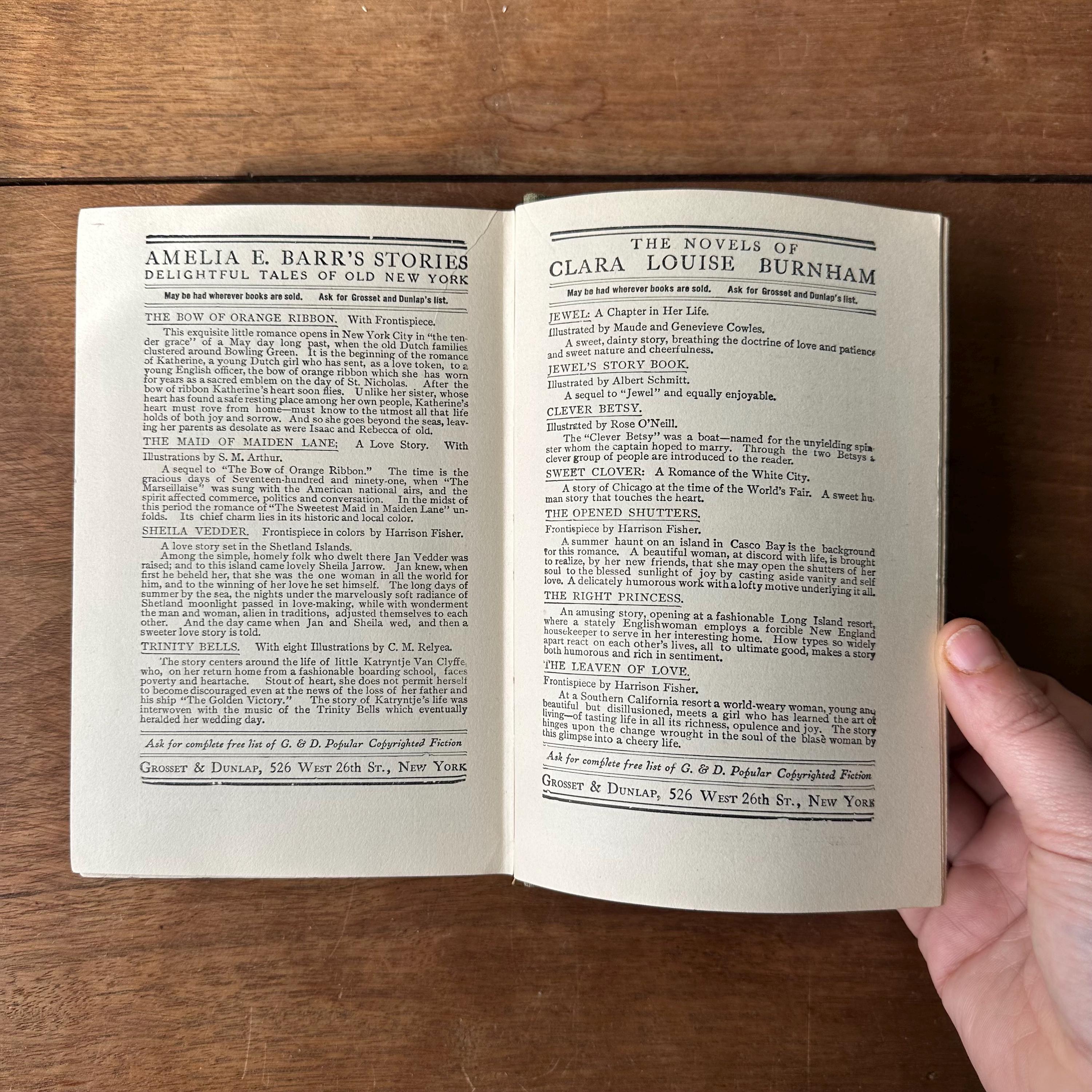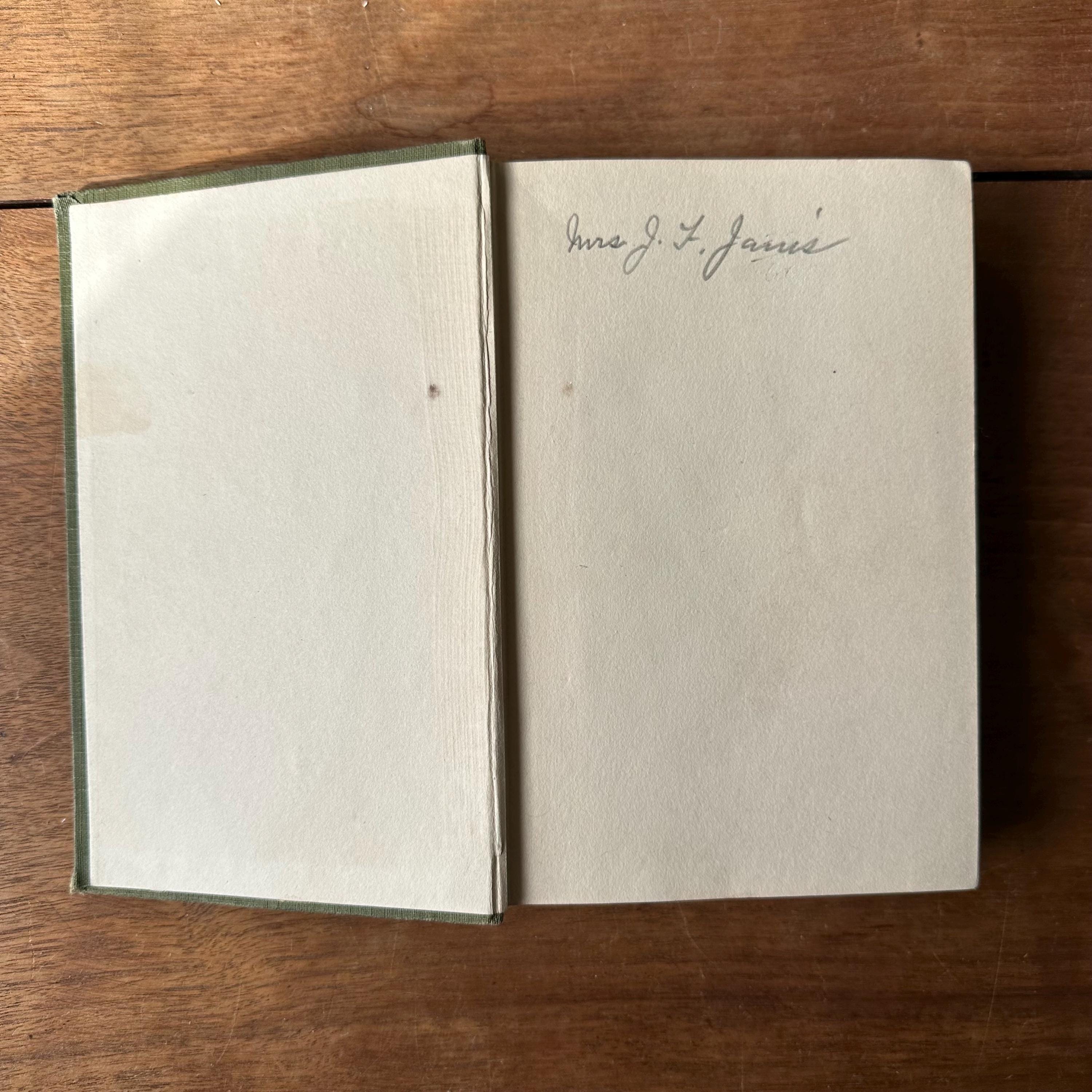 The book is in great antique condition for its age and use. The covers have general wear to the corners and edges. The cover illustrations are intact with minimal fading. Mrs. J. F. James wrote their name inside the front cover in pencil. The covers are still attached at the spine. The pages are yellowed.