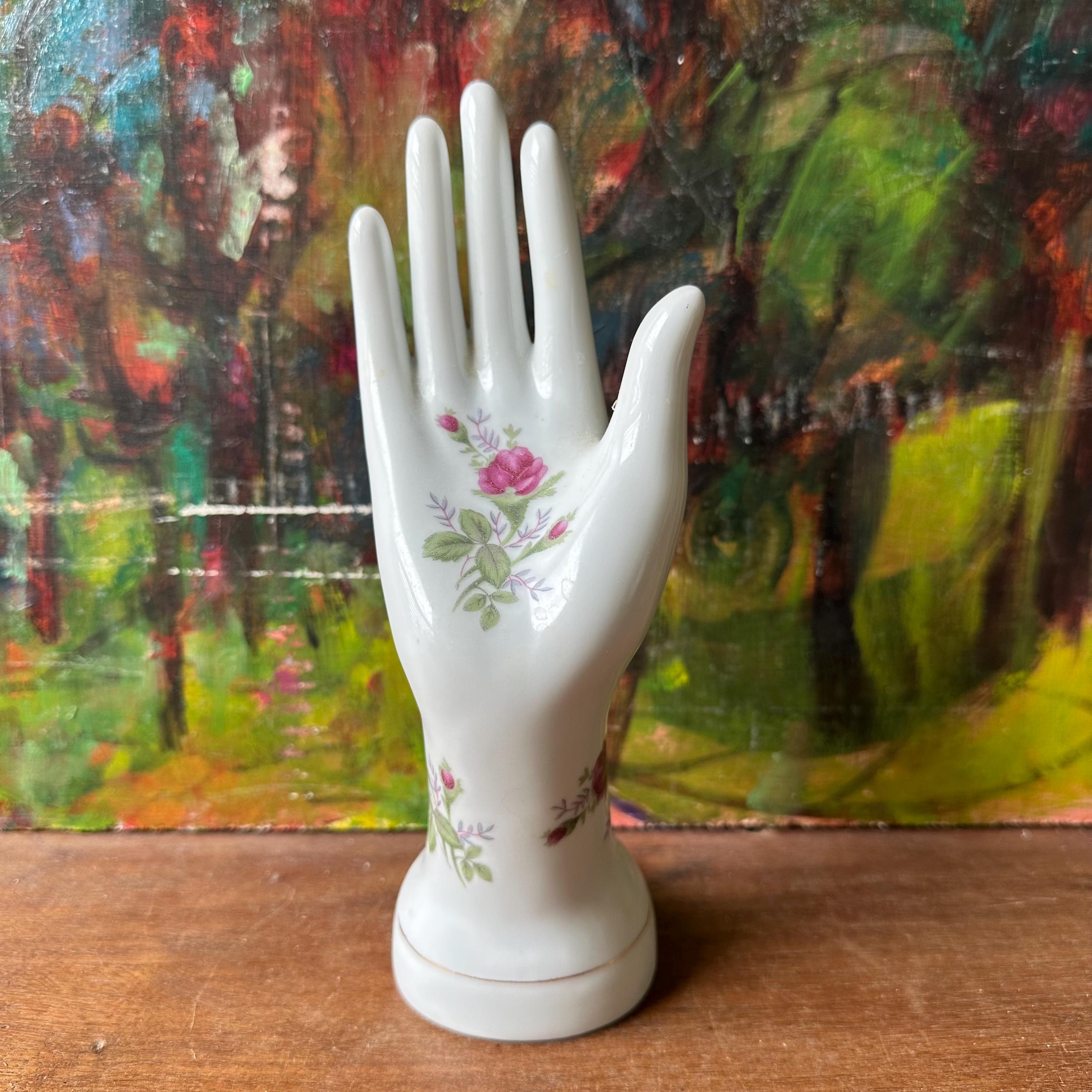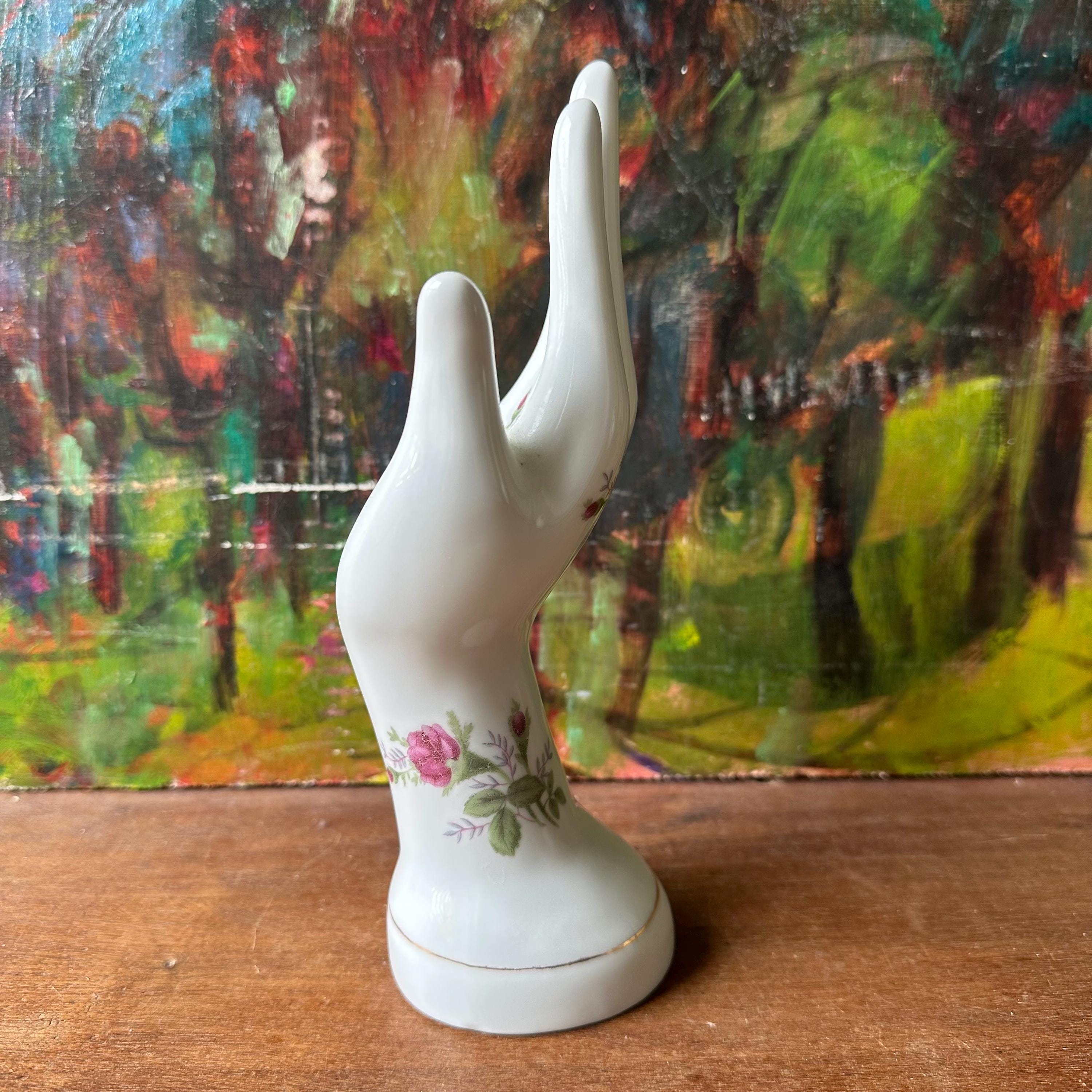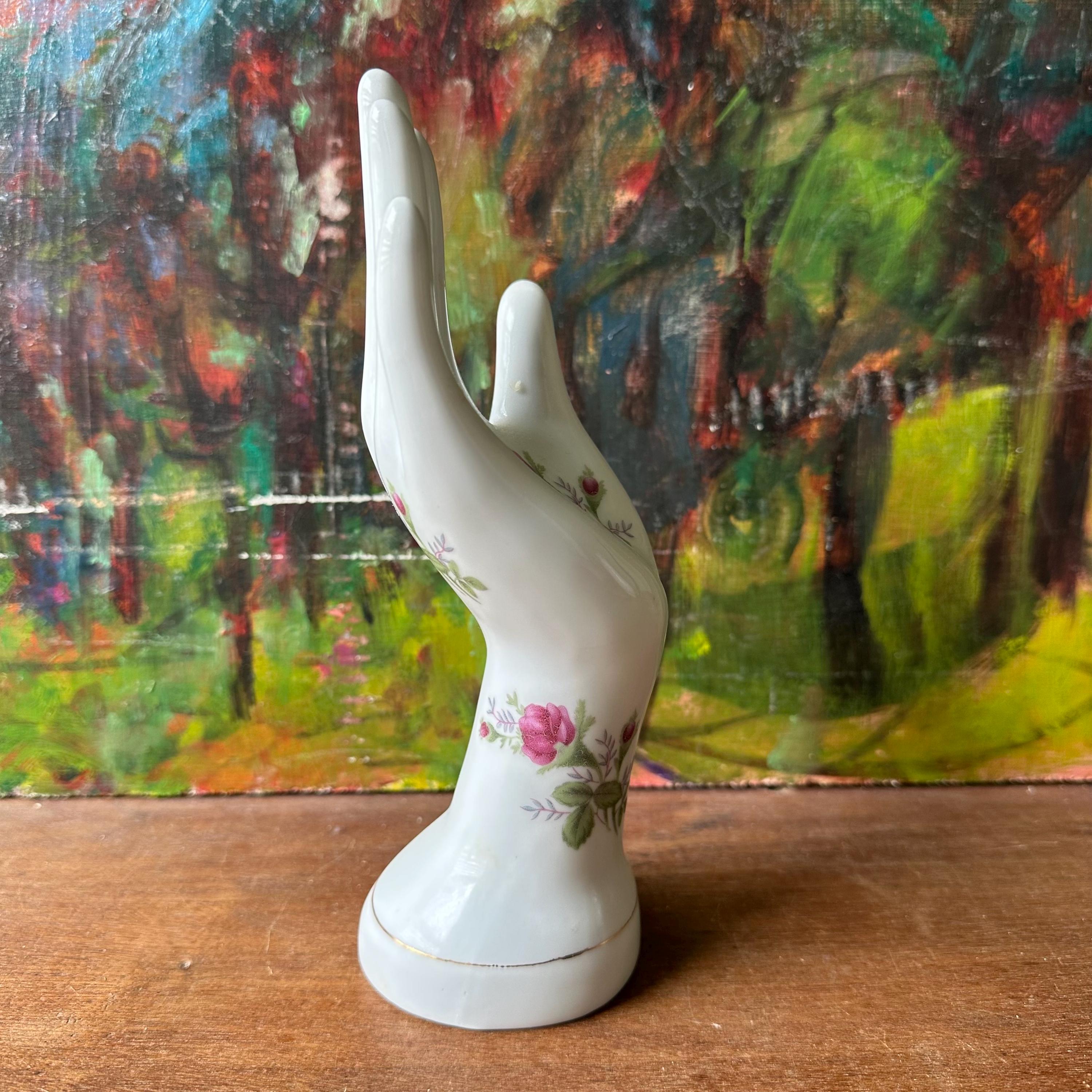This is a vintage ceramic hand designed to hold bracelets, rings, and other jewelry. It is white with a pink rose pattern on both front, back, and sides. The base is oval with a thin gold line all the way around. There is no makers mark.