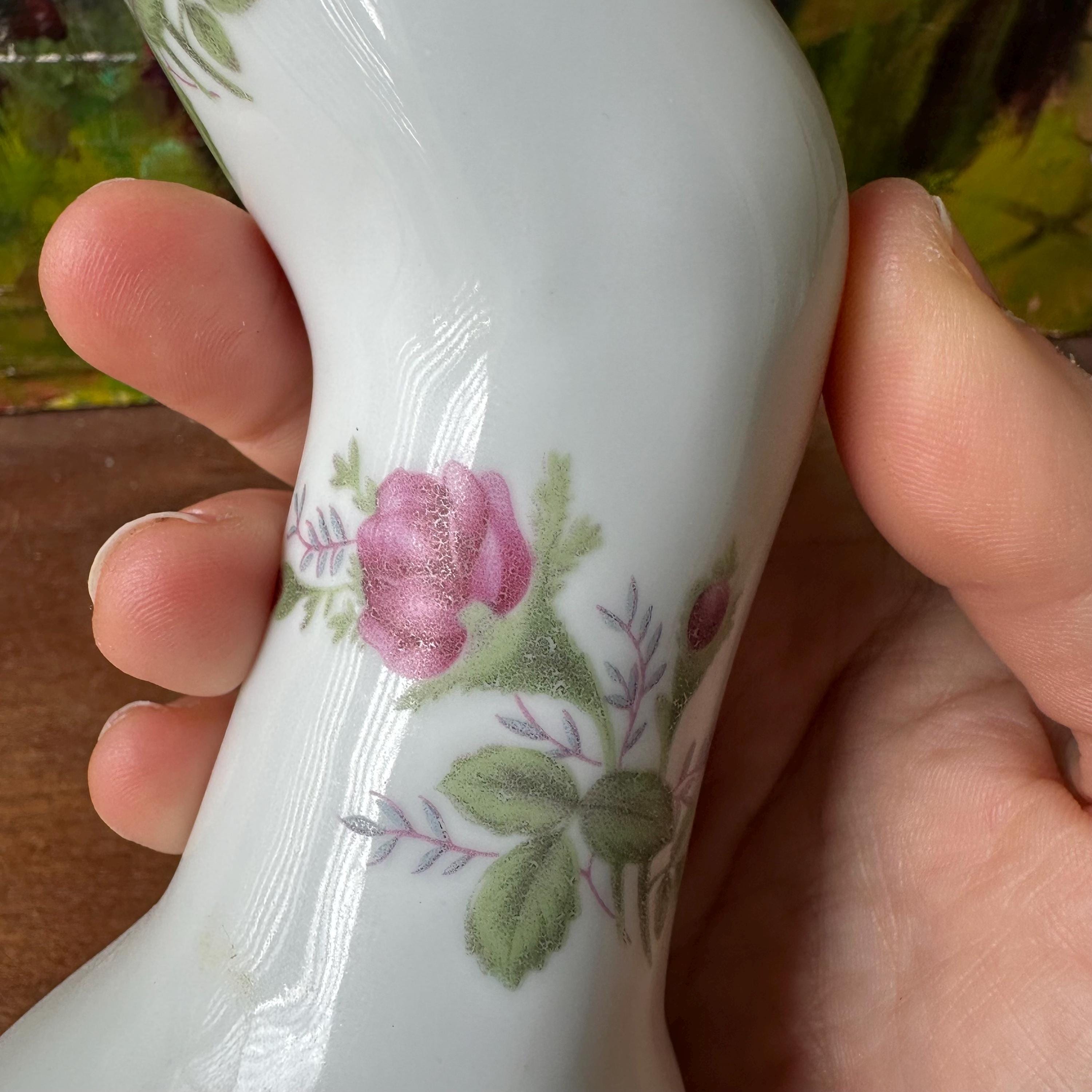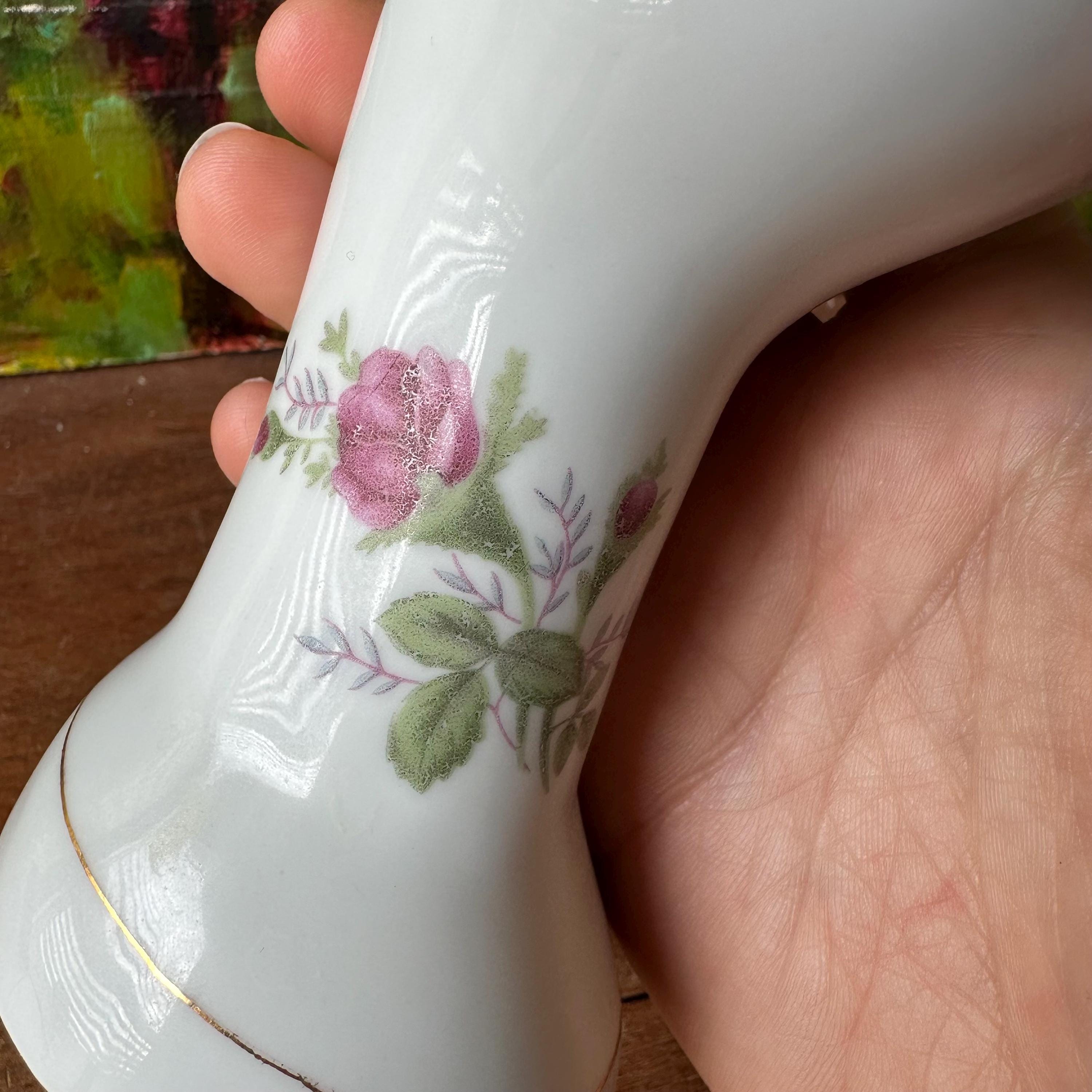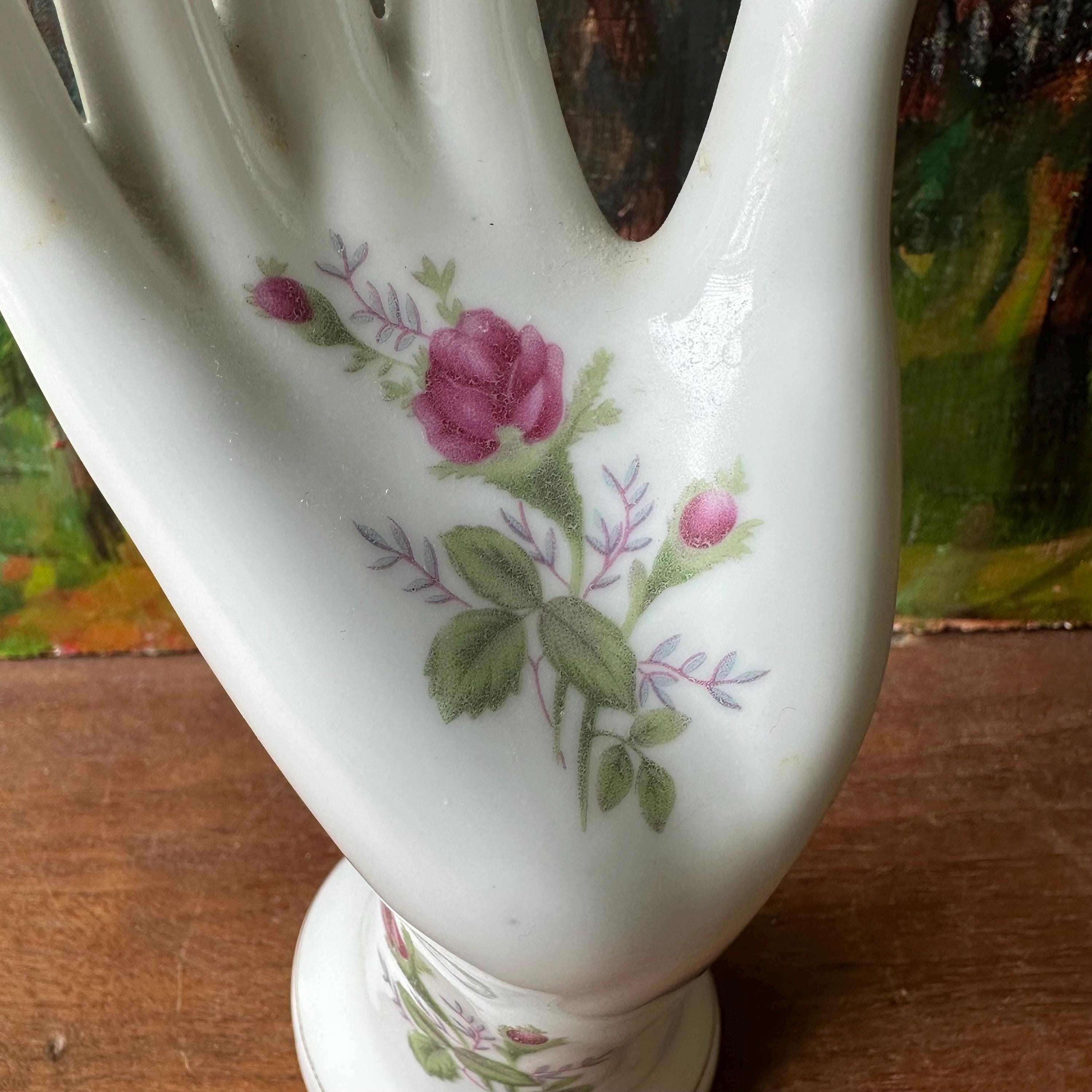 This is a vintage ceramic hand designed to hold bracelets, rings, and other jewelry. It is white with a pink rose pattern on both front, back, and sides. The base is oval with a thin gold line all the way around. There is no makers mark.