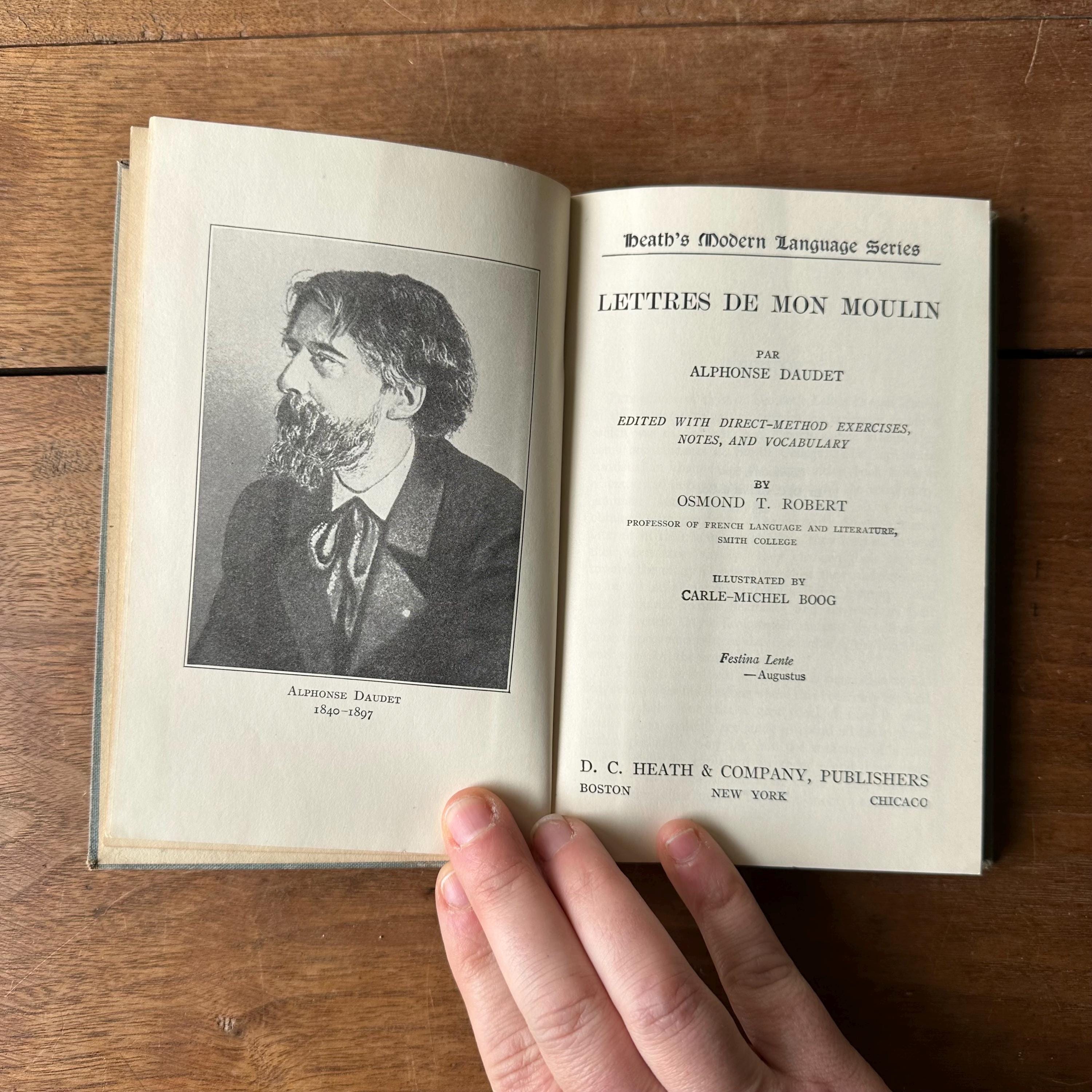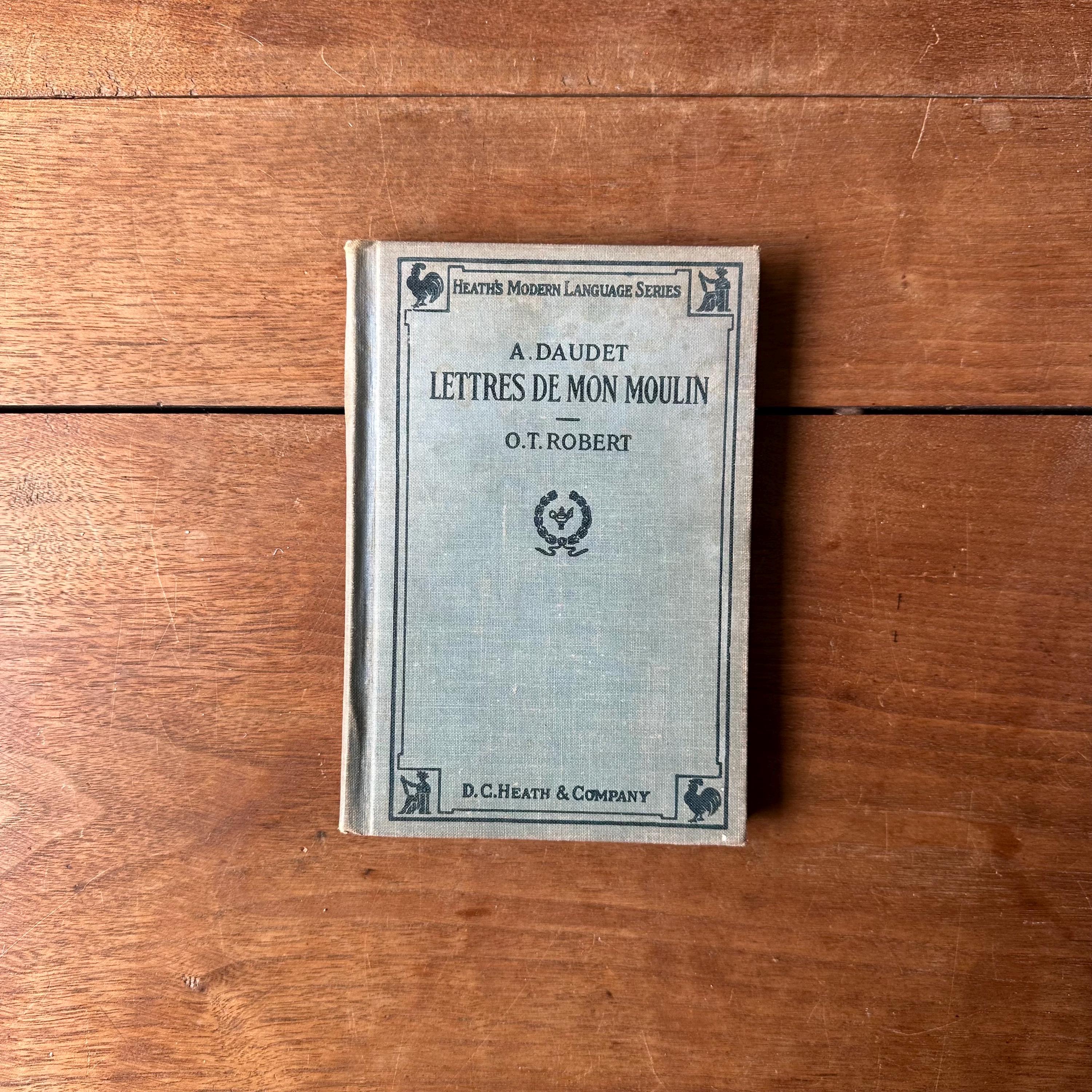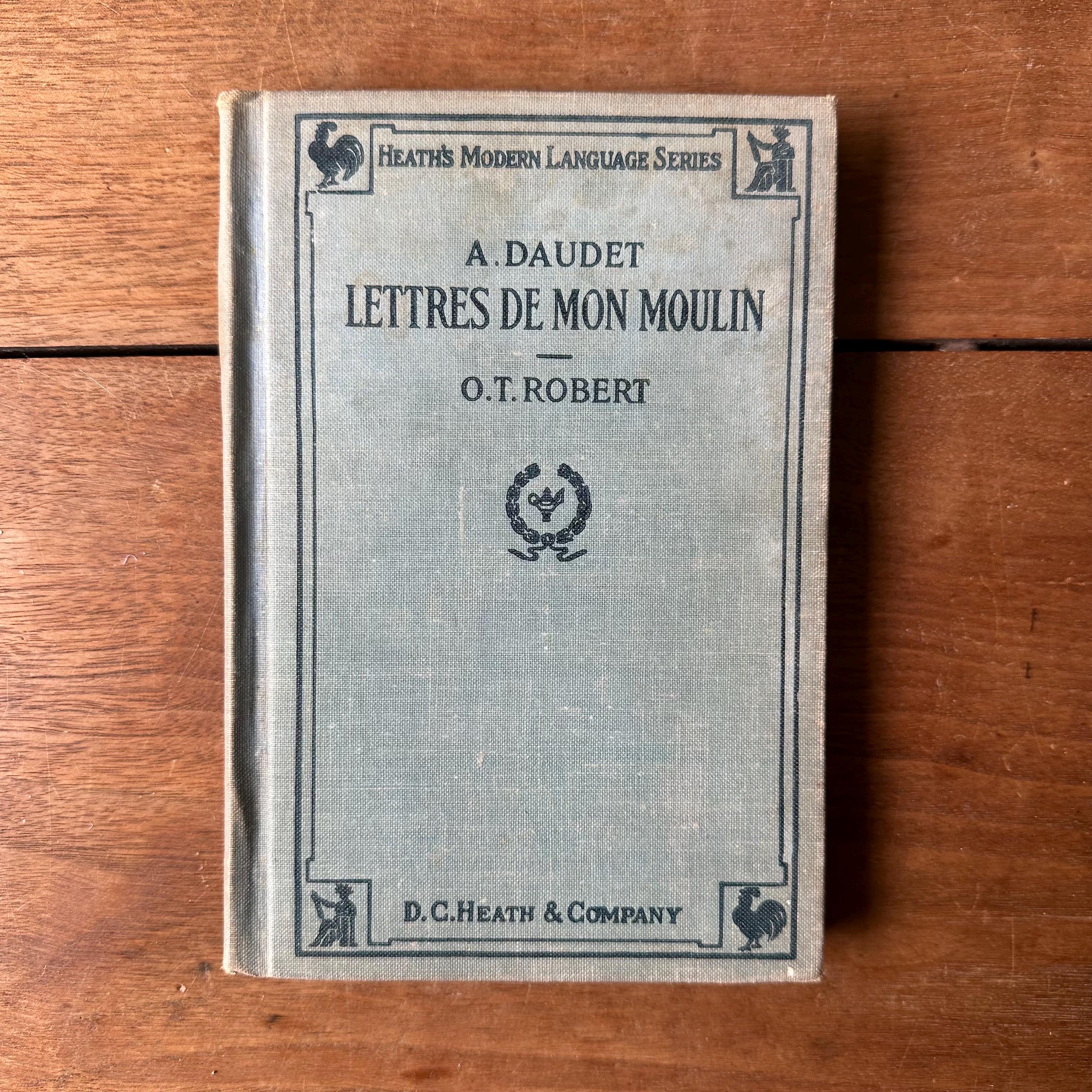 This is the 1922 French language Heath's Modern Language Series edition of Lettres de Mon Moulin by Alphonse Daudet. It has light blue covers with dark blue lettering and illustrations. This is a language learning edition so the chapters are accompanied by questions and vocabulary. The book is illustrated with black and white illustration plates. There are 184 pages.