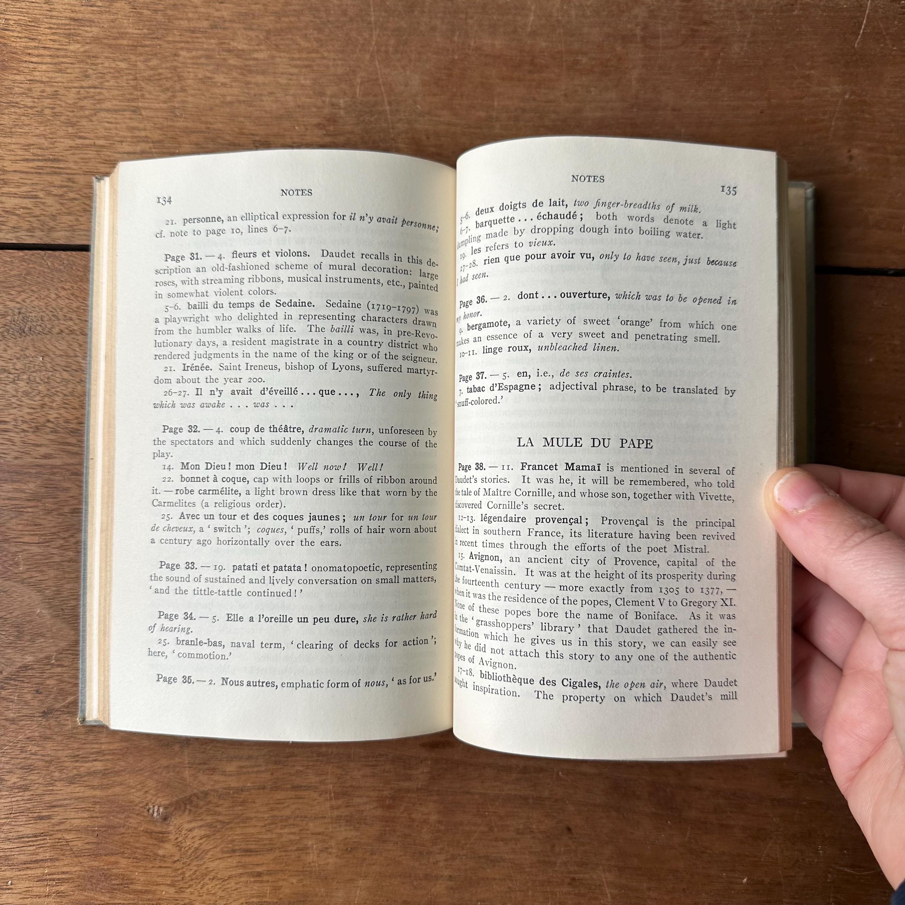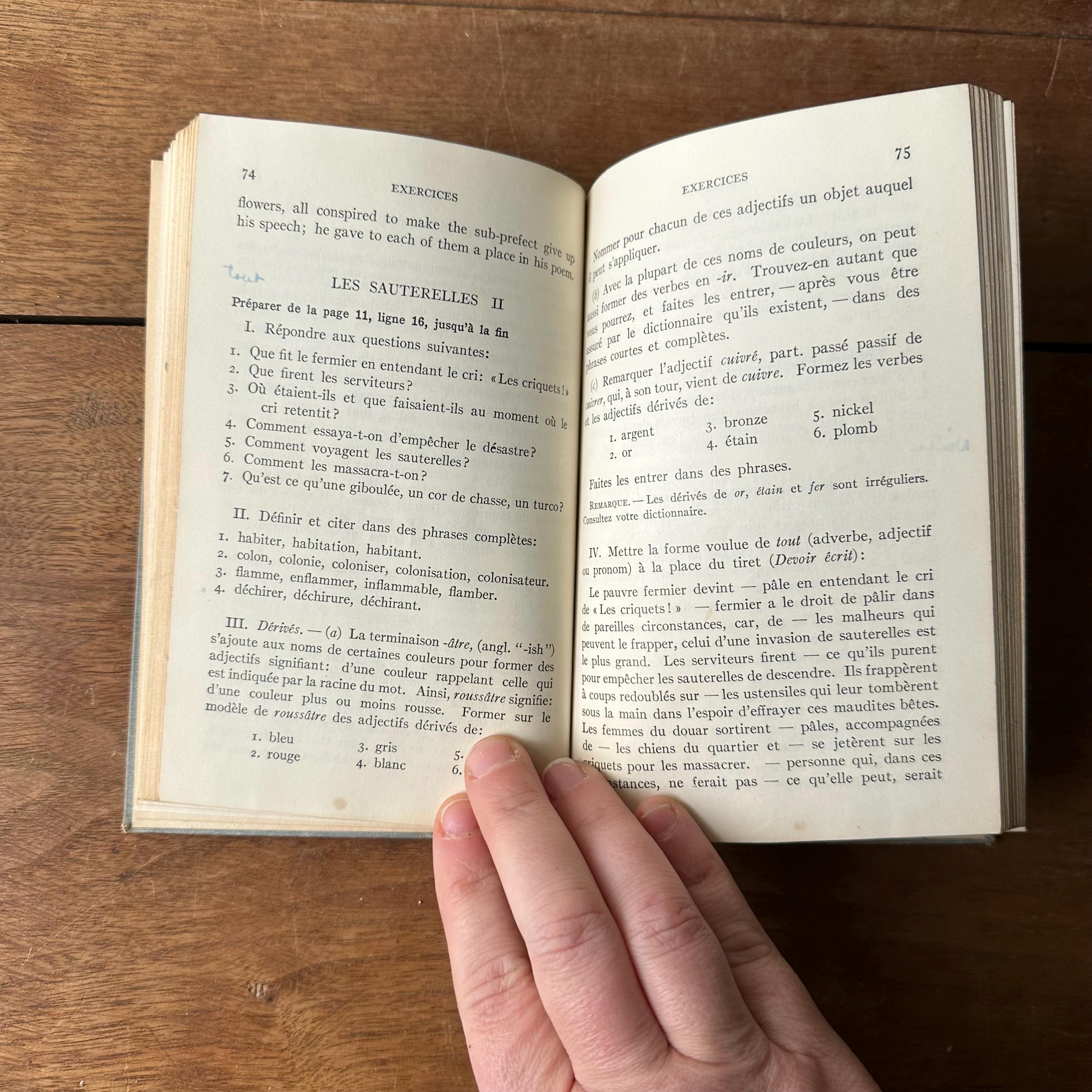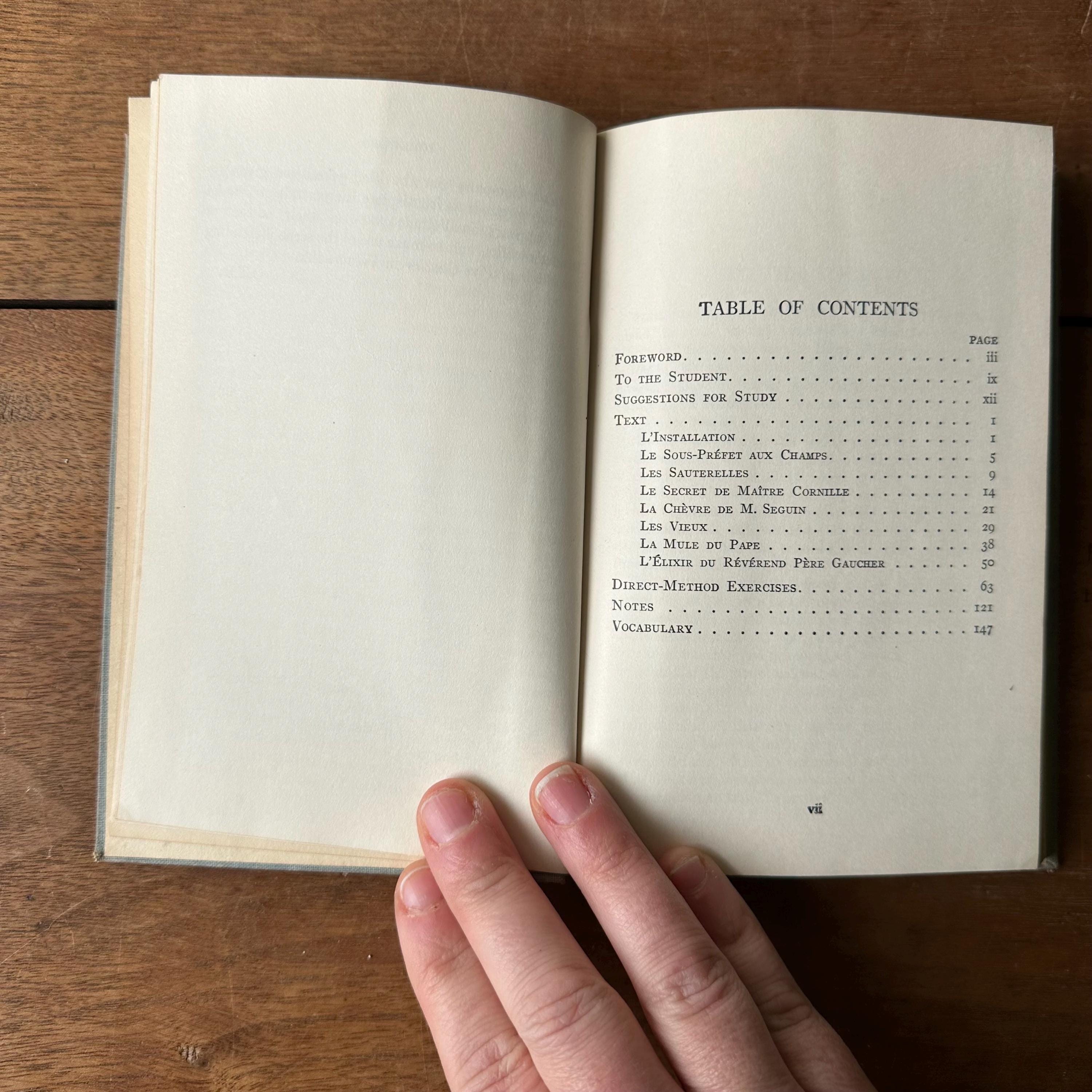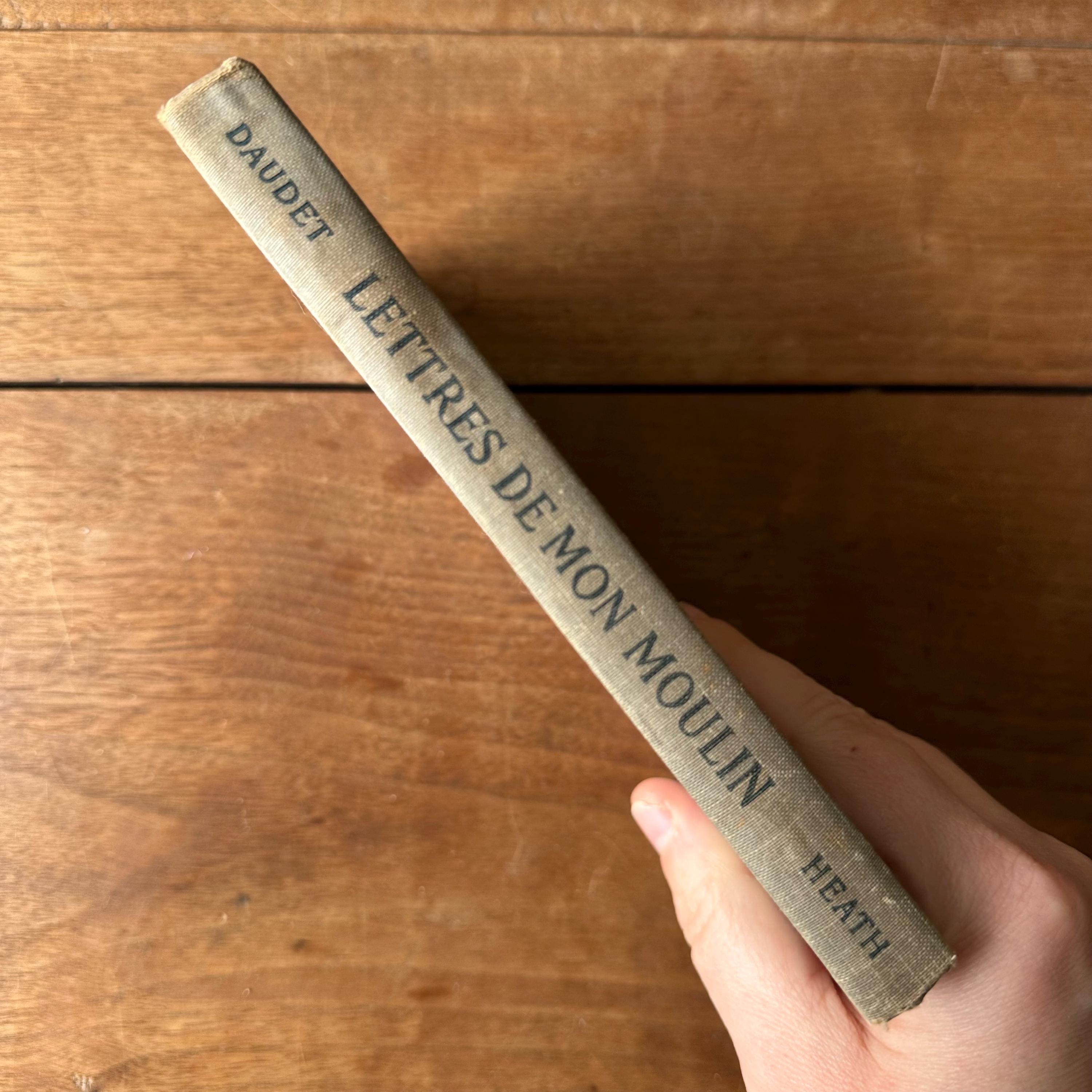 This is the 1922 French language Heath's Modern Language Series edition of Lettres de Mon Moulin by Alphonse Daudet. It has light blue covers with dark blue lettering and illustrations. This is a language learning edition so the chapters are accompanied by questions and vocabulary. The book is illustrated with black and white illustration plates. There are 184 pages.