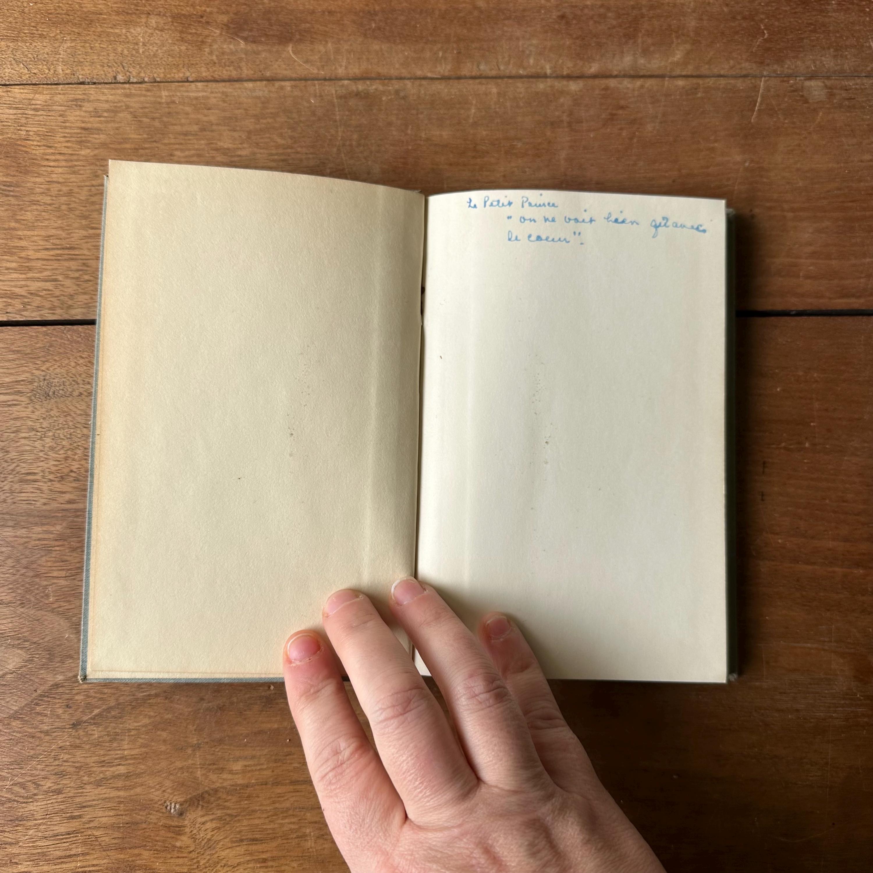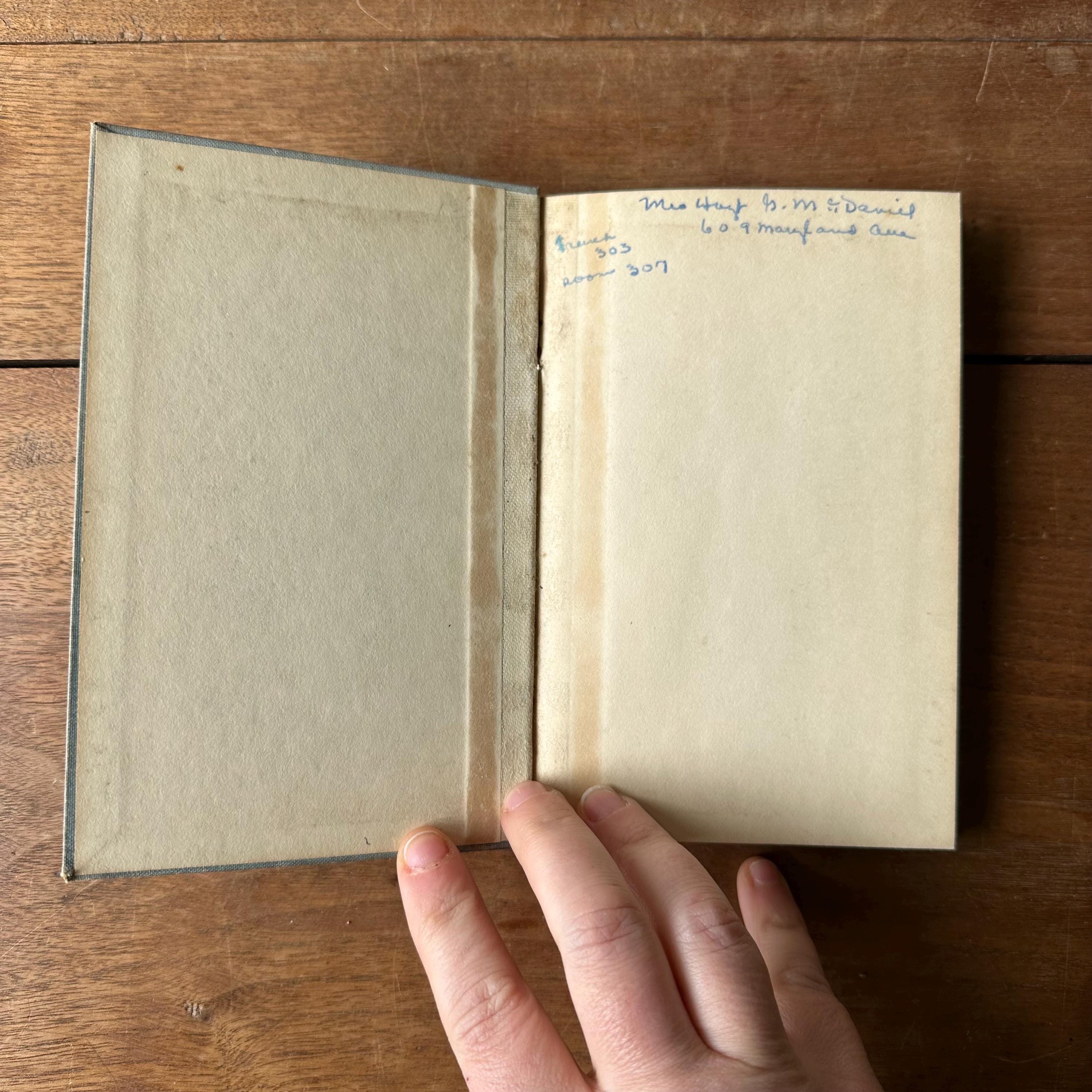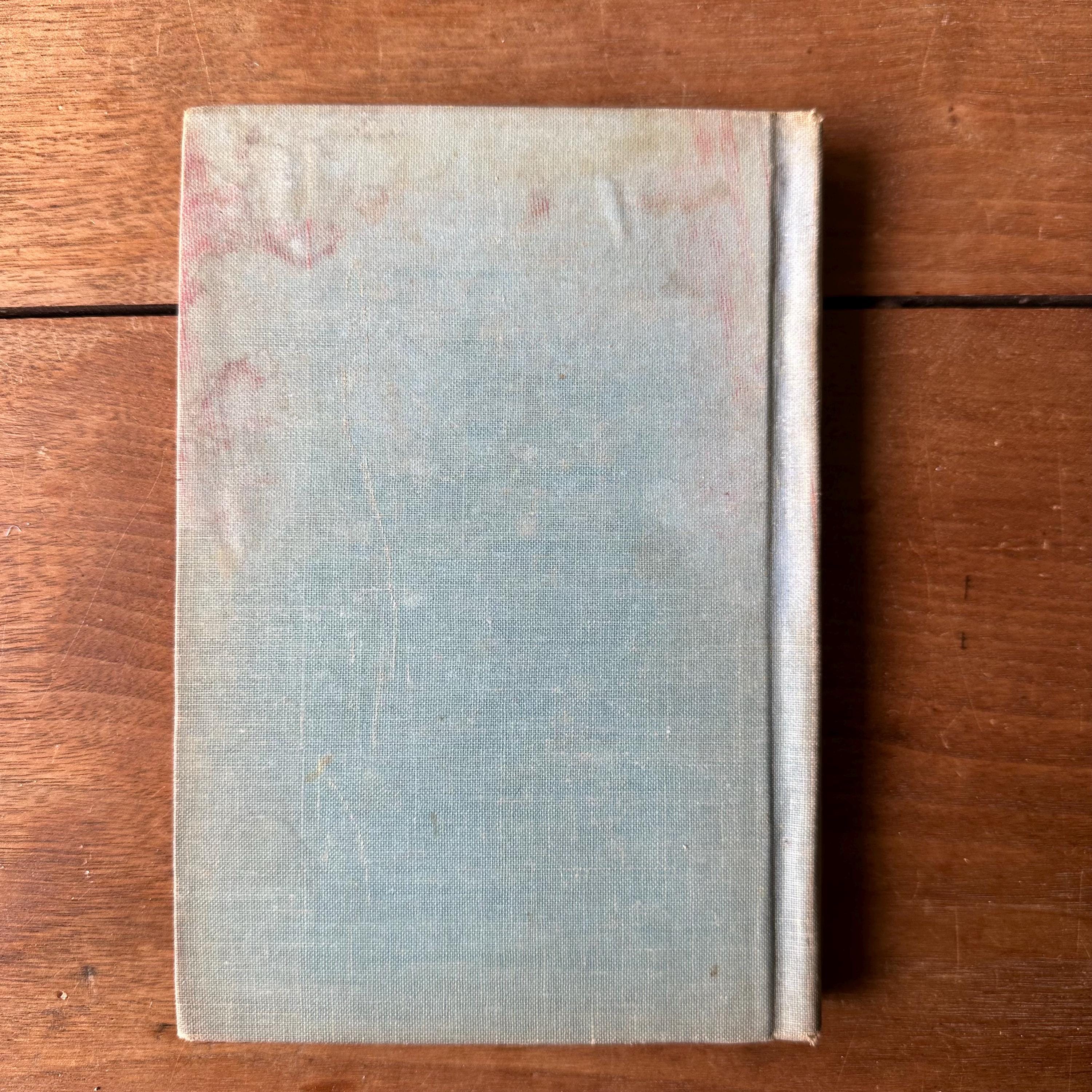 The book is in fair antique condition for its age and use. The spine is faded, and the covers have general wear. The back cover has water staining to the top, and the book does have the old book, musty smell. There are ink inscriptions inside the front cover and first blank page. The pages are yellowed.