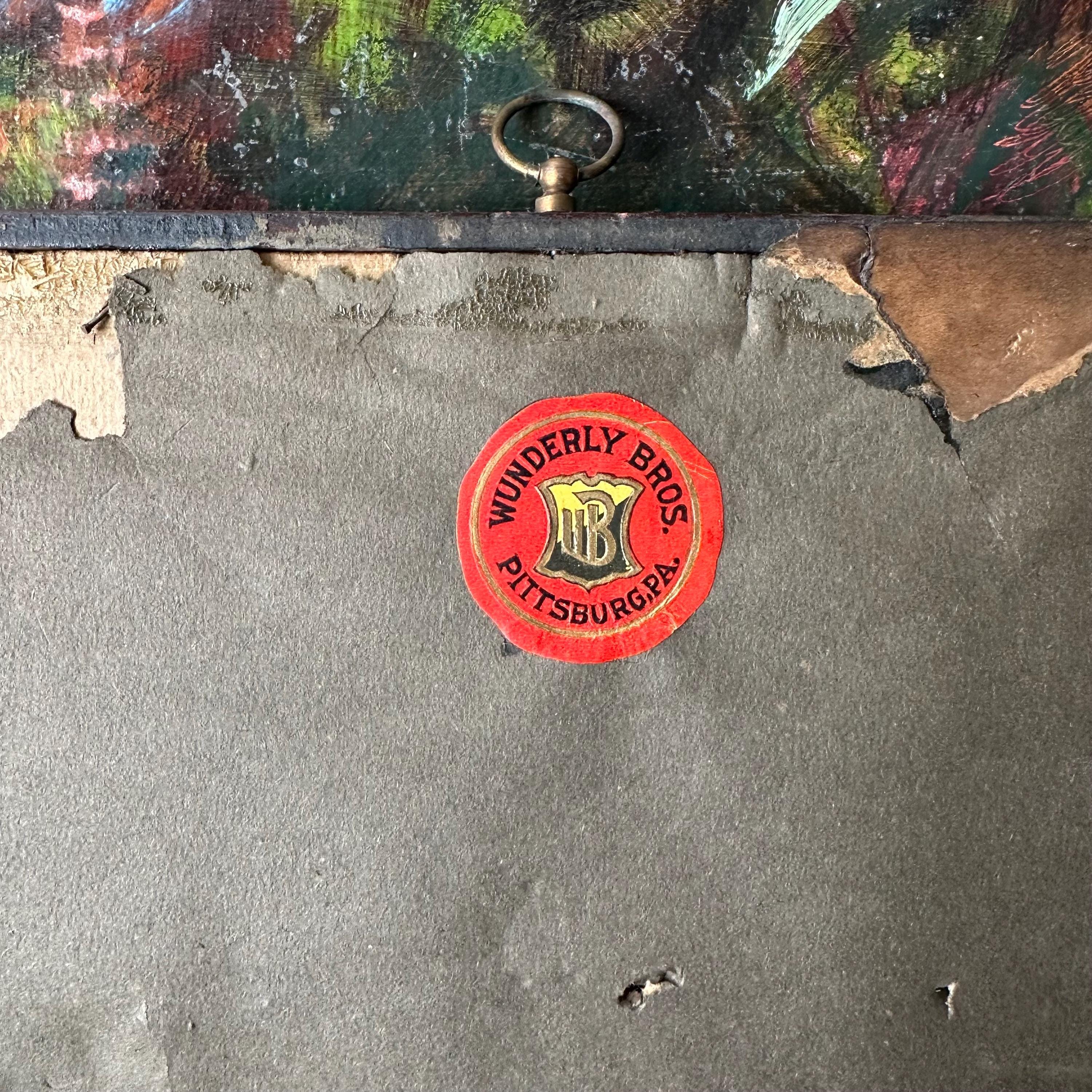 The photograph and frame are both in great antique condition for their age and use. The frame has general wear with some very slight scratches and or discoloration. It is still nailed together tightly. The glass is clear. The brass loop is tarnished. The photograph has some shiny areas where the chemicals are starting to discolor. There is discoloration to the mat. The back is missing a lot of its backing paper around the edges.