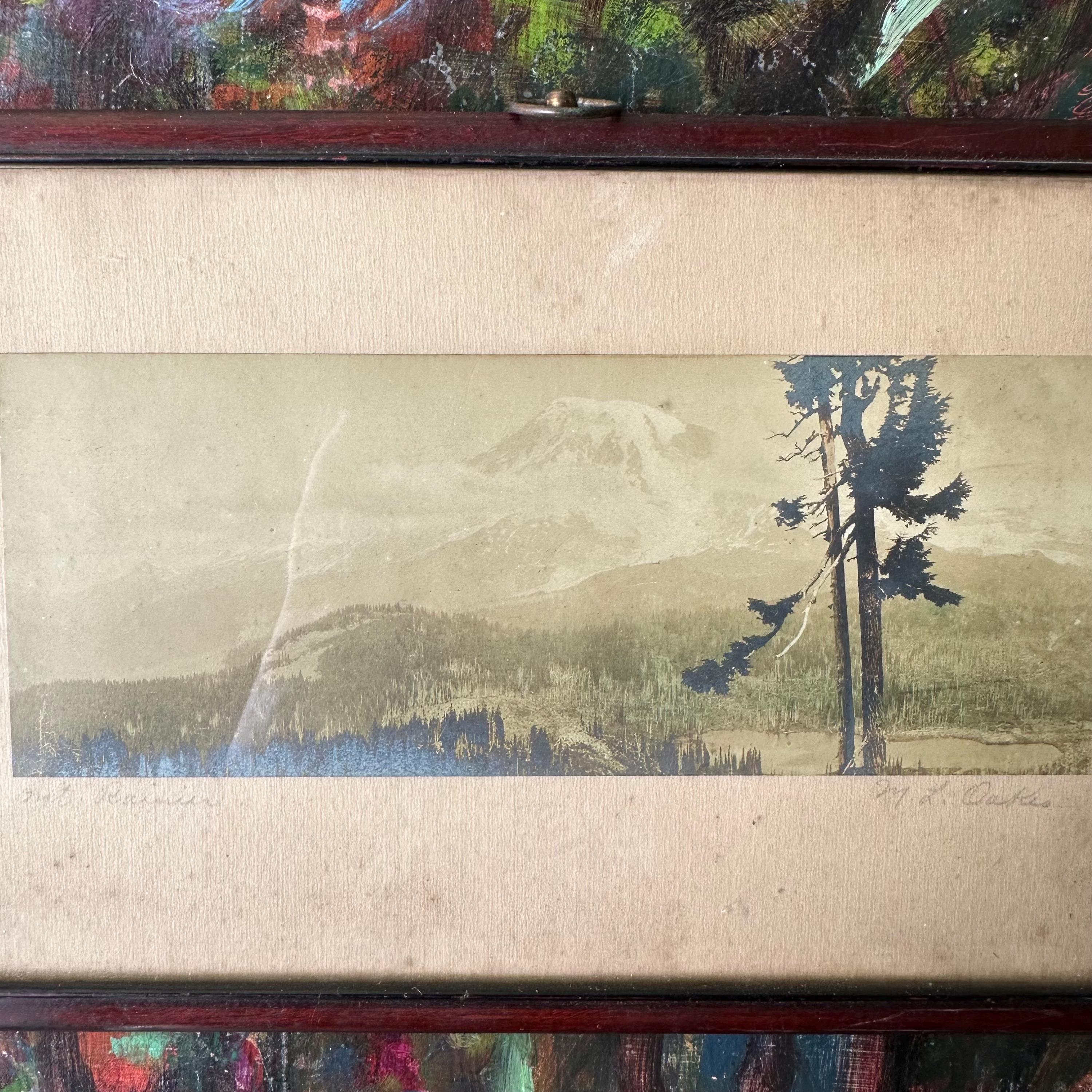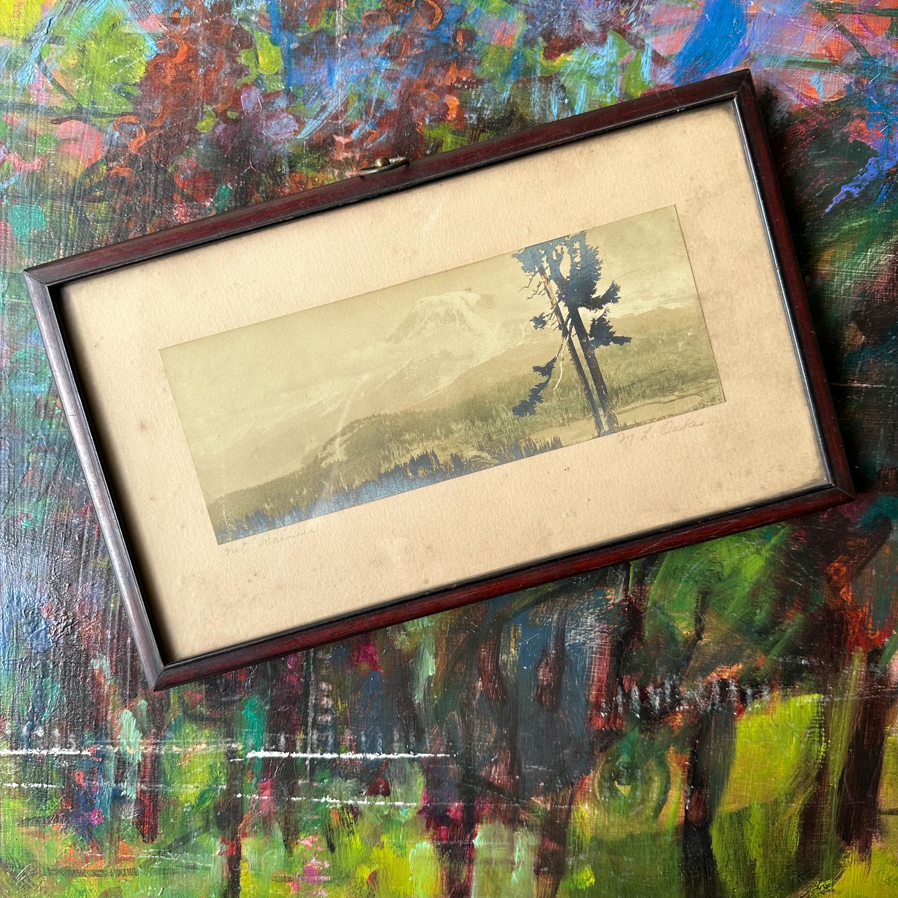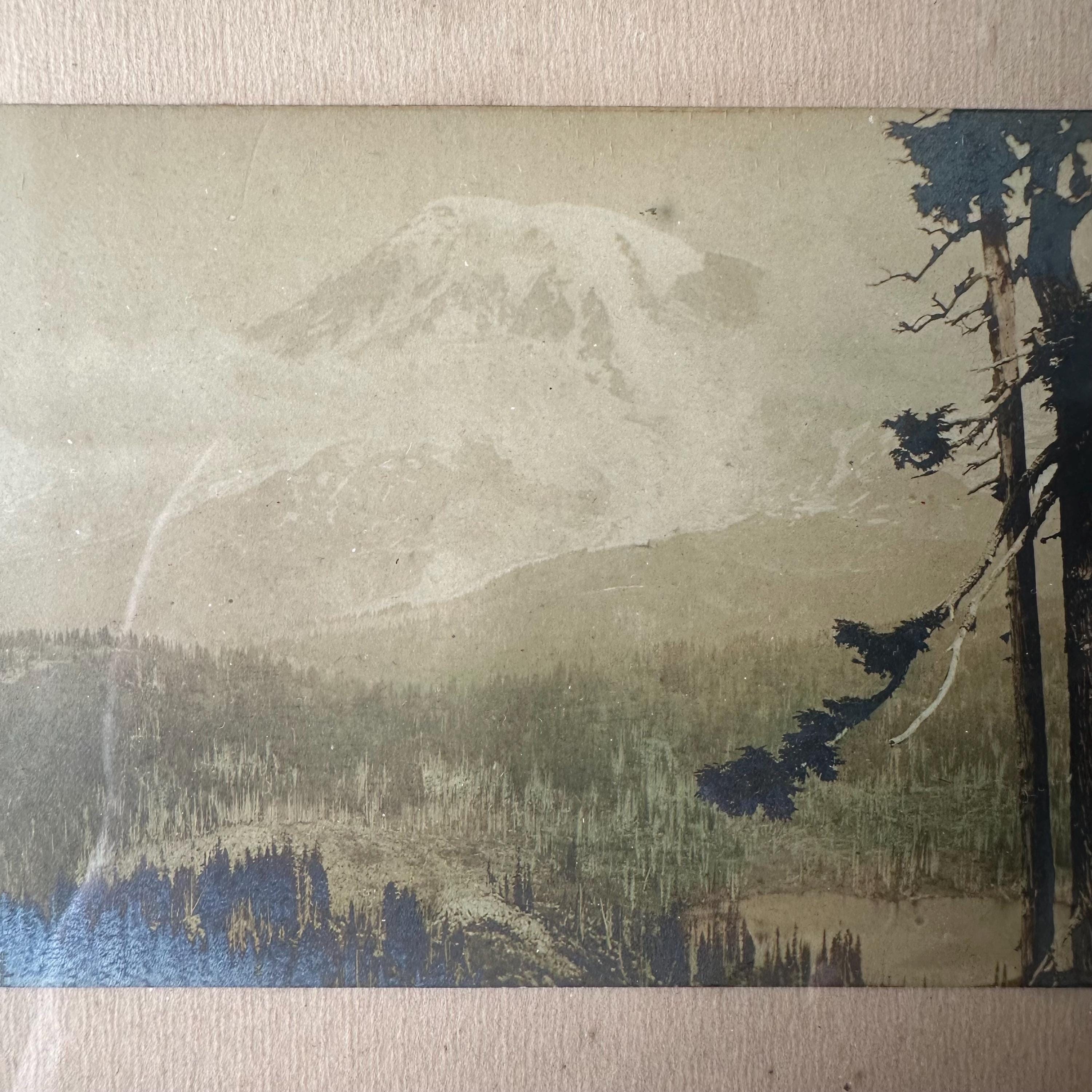 This is an antique original signed photograph of Mt. Rainier by M.L. Oakes. The photograph shows Mt. Rainier in the distance with a striking pine tree in the foreground. It is matted on cream paper and labeled Mt. Rainier. It is also signed M.L. Oakes, both in pencil. The photograph is framed in a simple wood frame with a brass loop at the top. The back is covered in paper with a Wunderly Bros. Pittsburg PA sticker. The frame is nailed together. M.L. Oakes is Mortimer L. Oakes, a postcard photographer active in the Washington area from 1907-1910. Wunderly Bros. spelled Pittsburgh without the H on the label until 1911. These dates make this a true antique photograph!