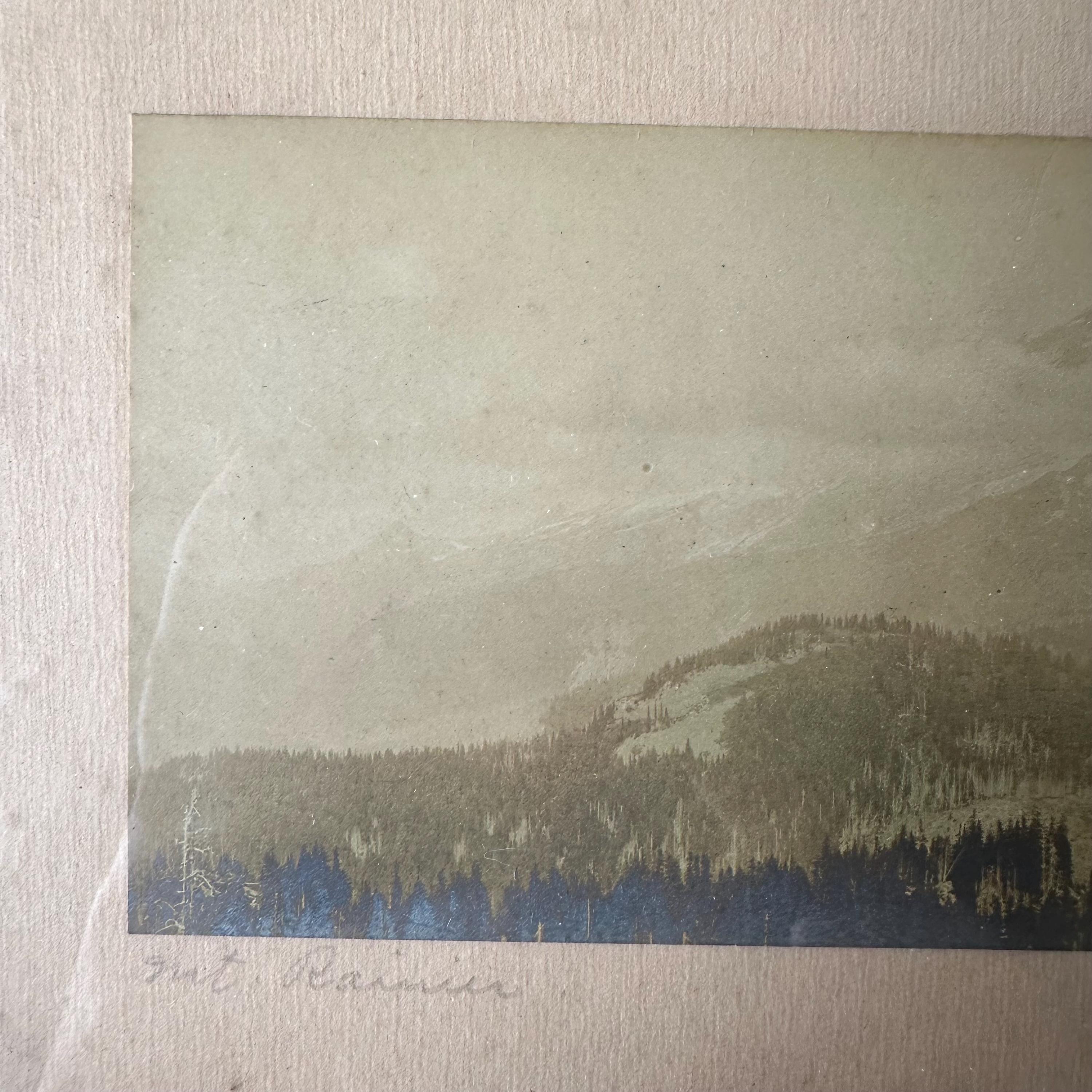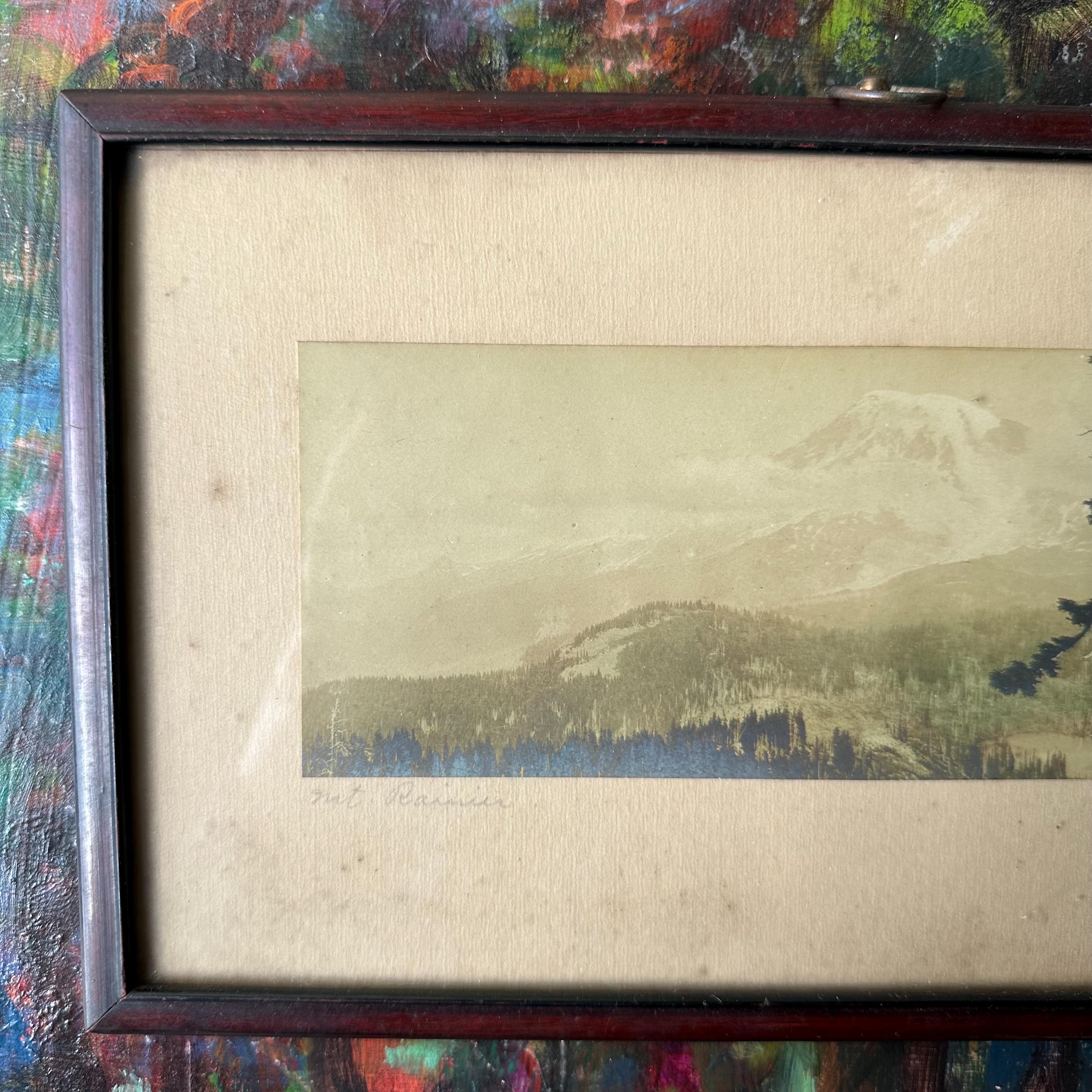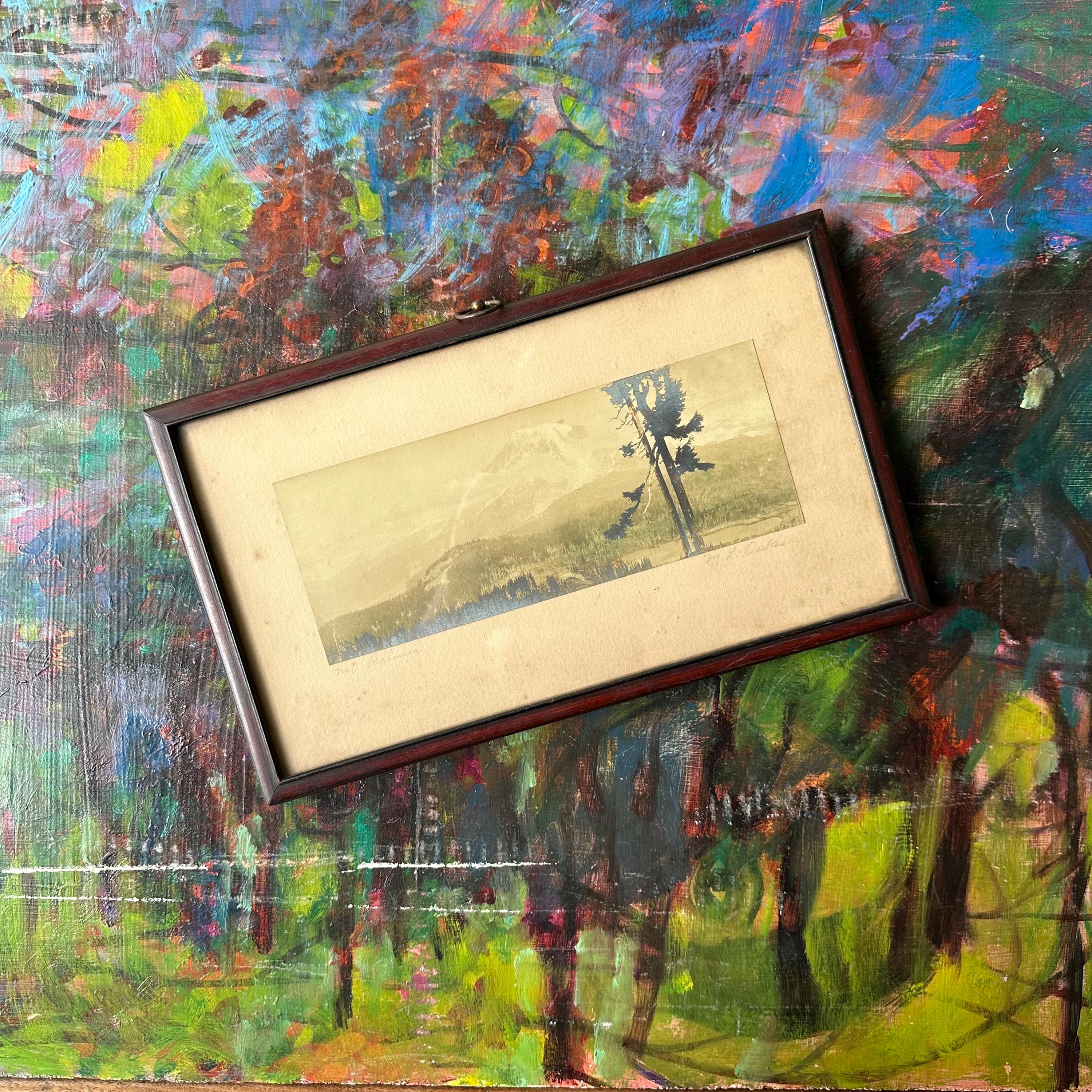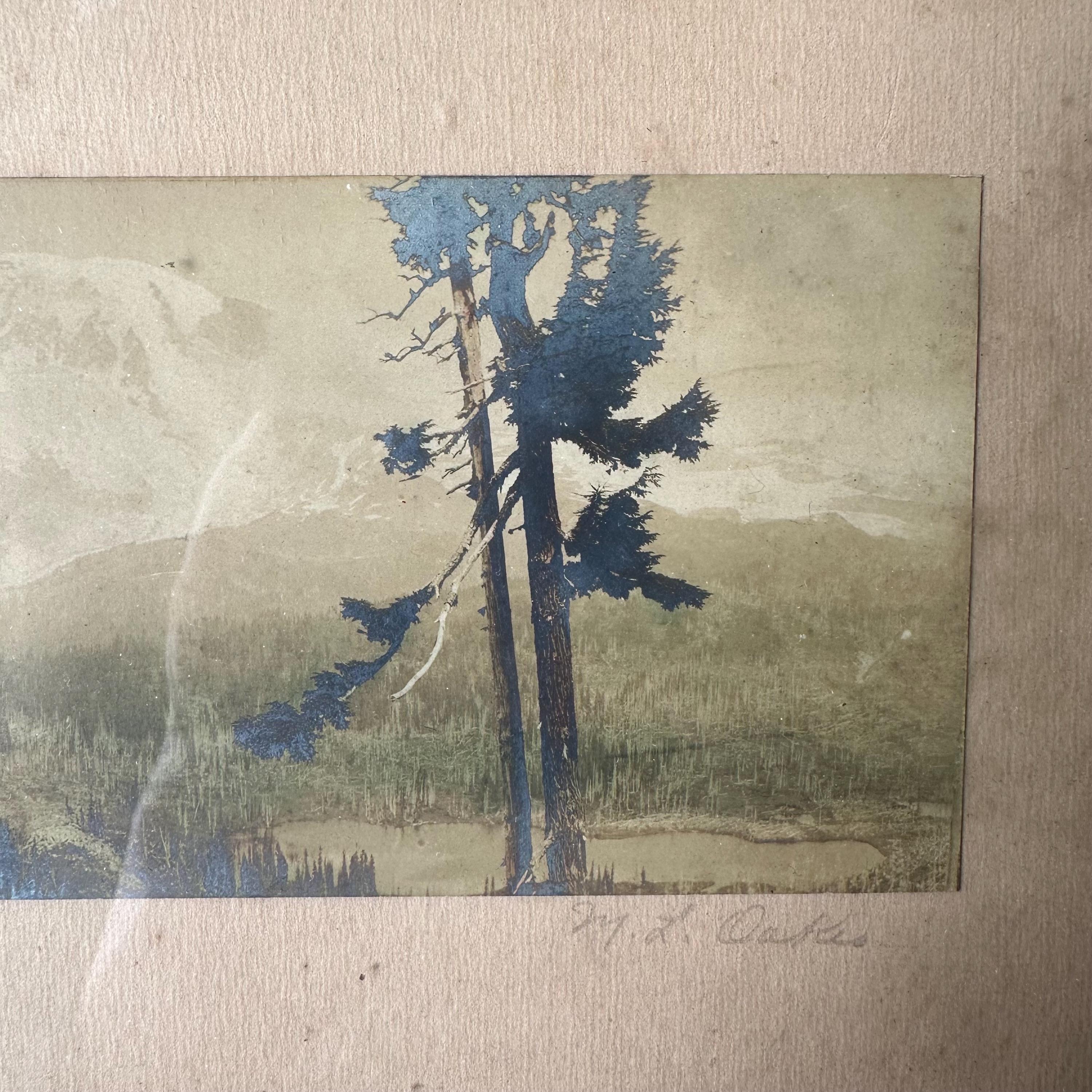 This is an antique original signed photograph of Mt. Rainier by M.L. Oakes. The photograph shows Mt. Rainier in the distance with a striking pine tree in the foreground. It is matted on cream paper and labeled Mt. Rainier. It is also signed M.L. Oakes, both in pencil. The photograph is framed in a simple wood frame with a brass loop at the top. The back is covered in paper with a Wunderly Bros. Pittsburg PA sticker. The frame is nailed together. M.L. Oakes is Mortimer L. Oakes, a postcard photographer active in the Washington area from 1907-1910. Wunderly Bros. spelled Pittsburgh without the H on the label until 1911. These dates make this a true antique photograph!