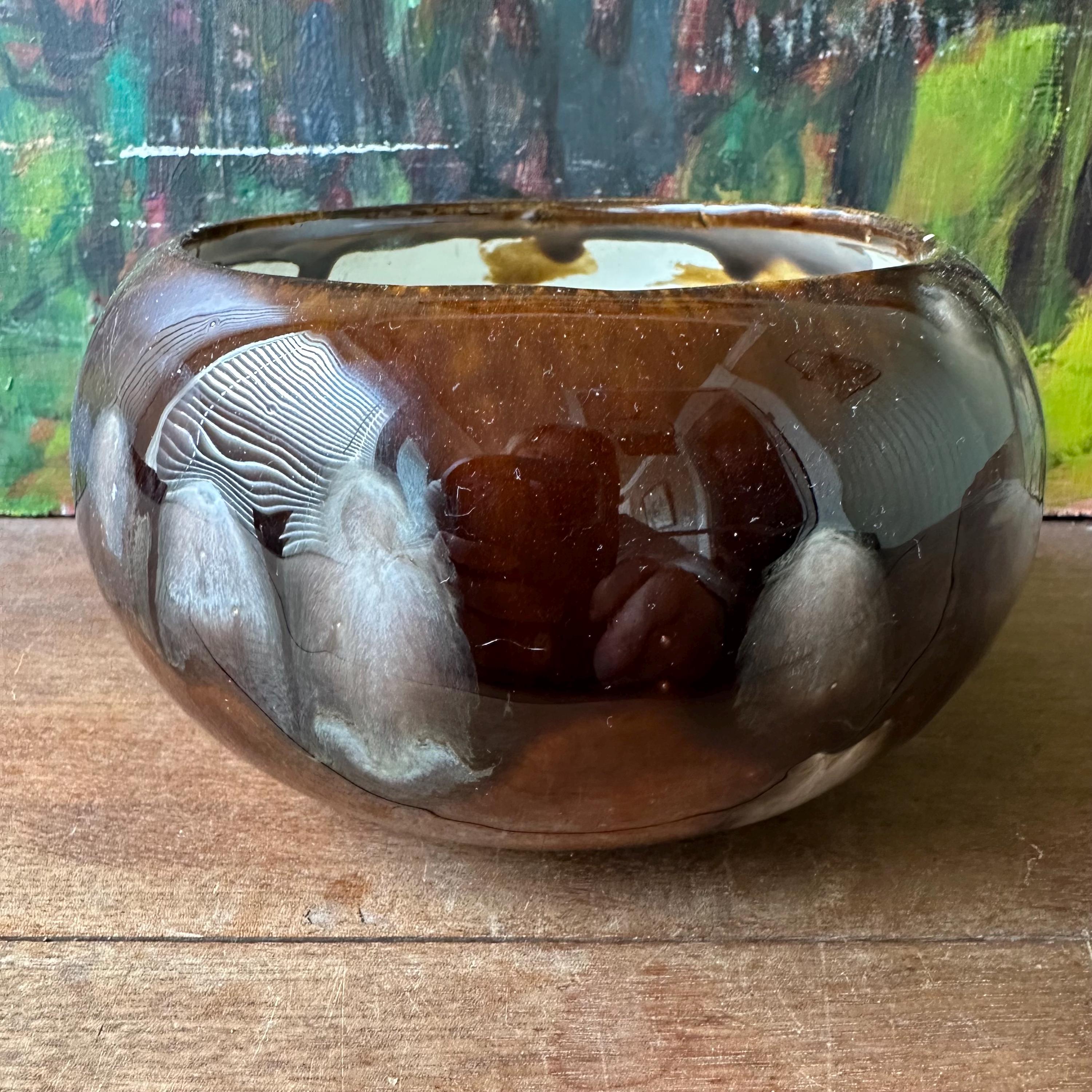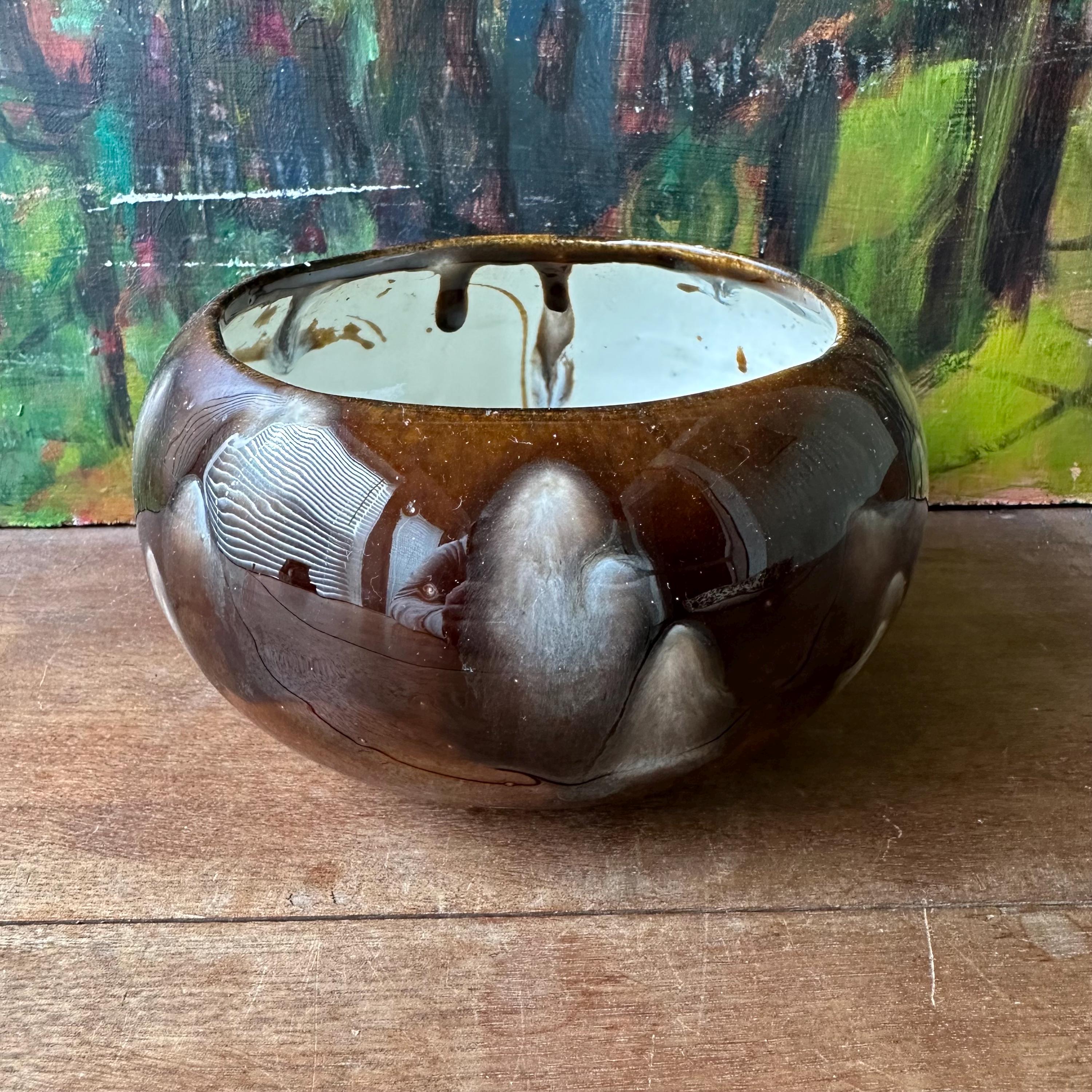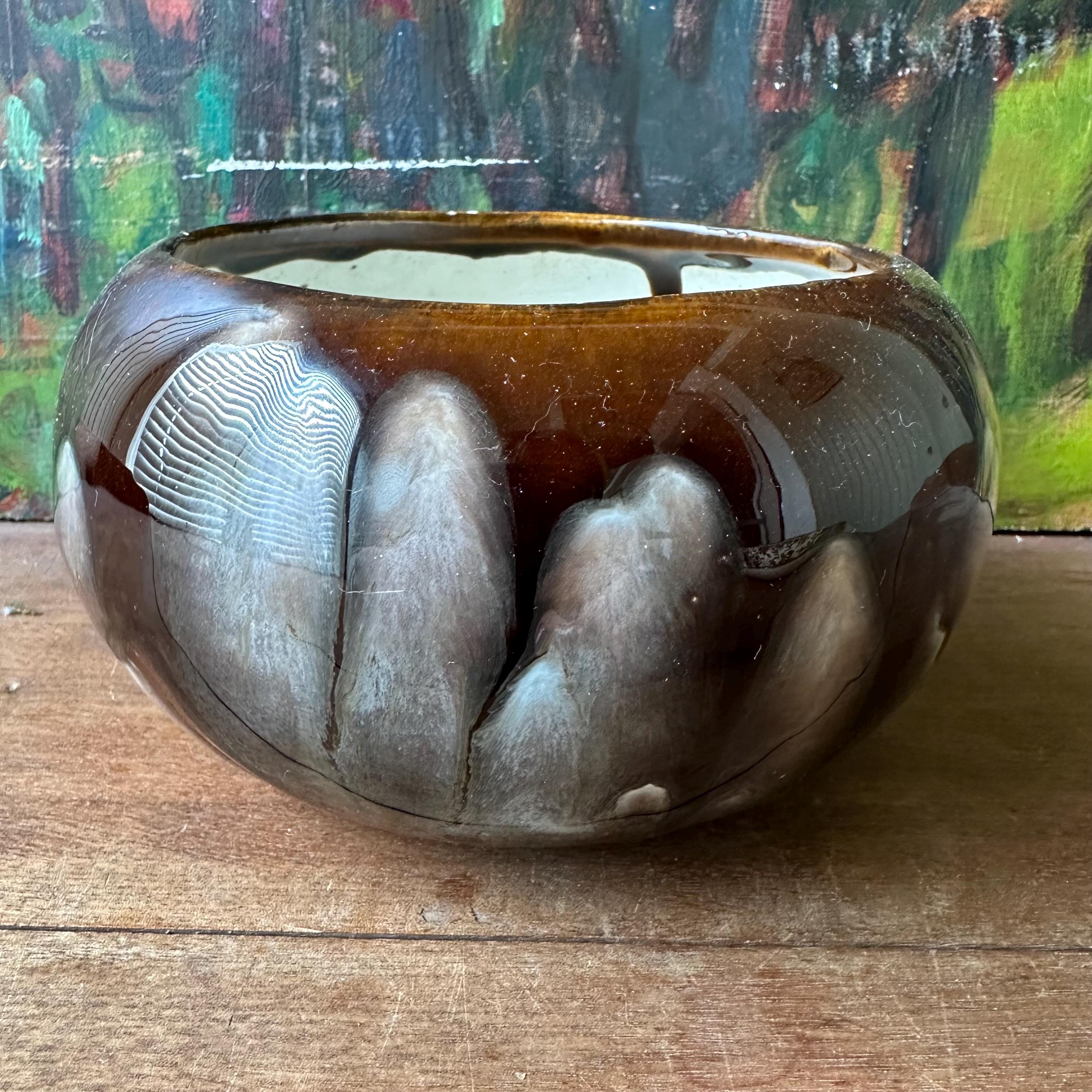 This is a ceramic planter from Atlantic Mold. It has a lovely drip glaze style finish in shades of brown and white. The planter is a bowl shape with Atlantic Mold on the bottom.