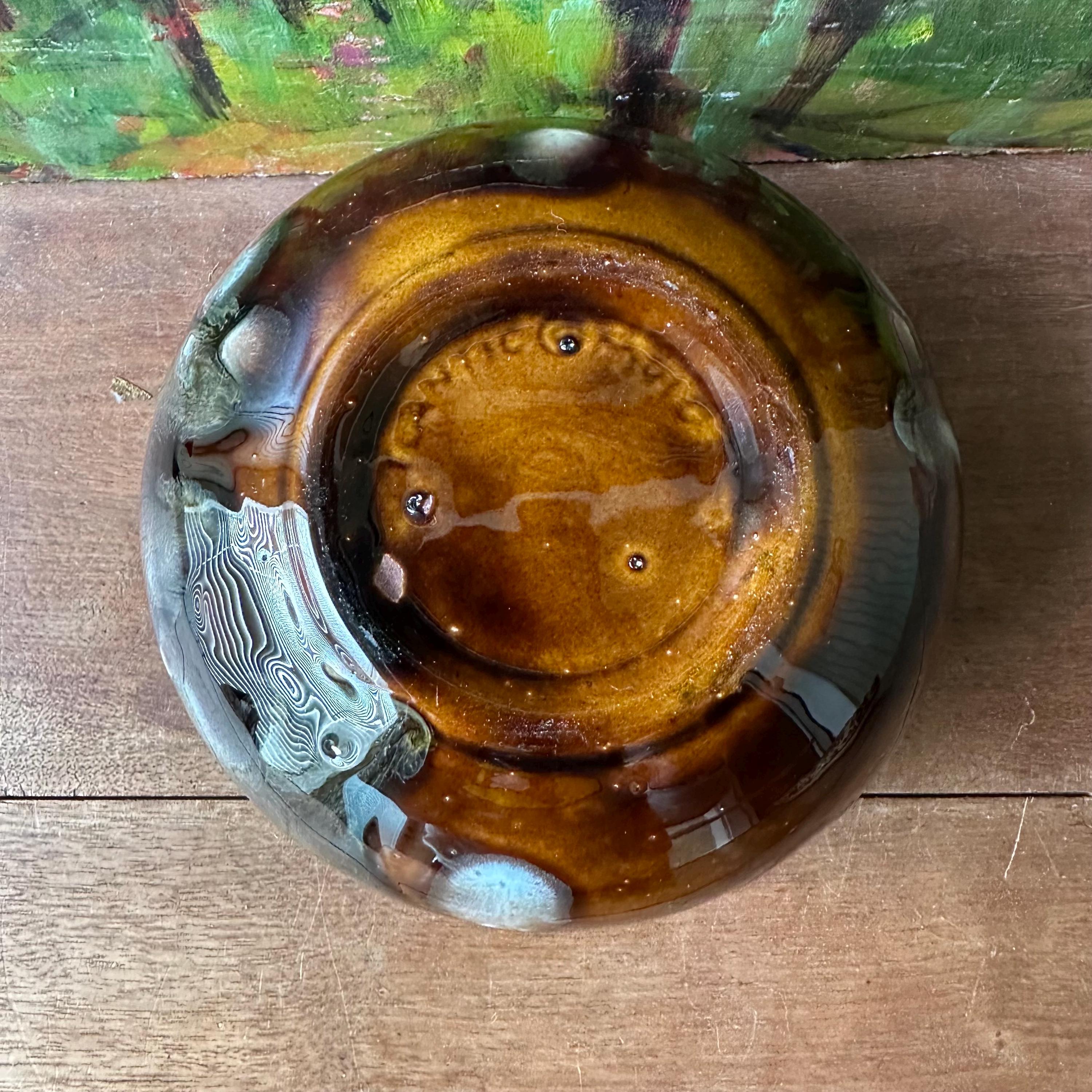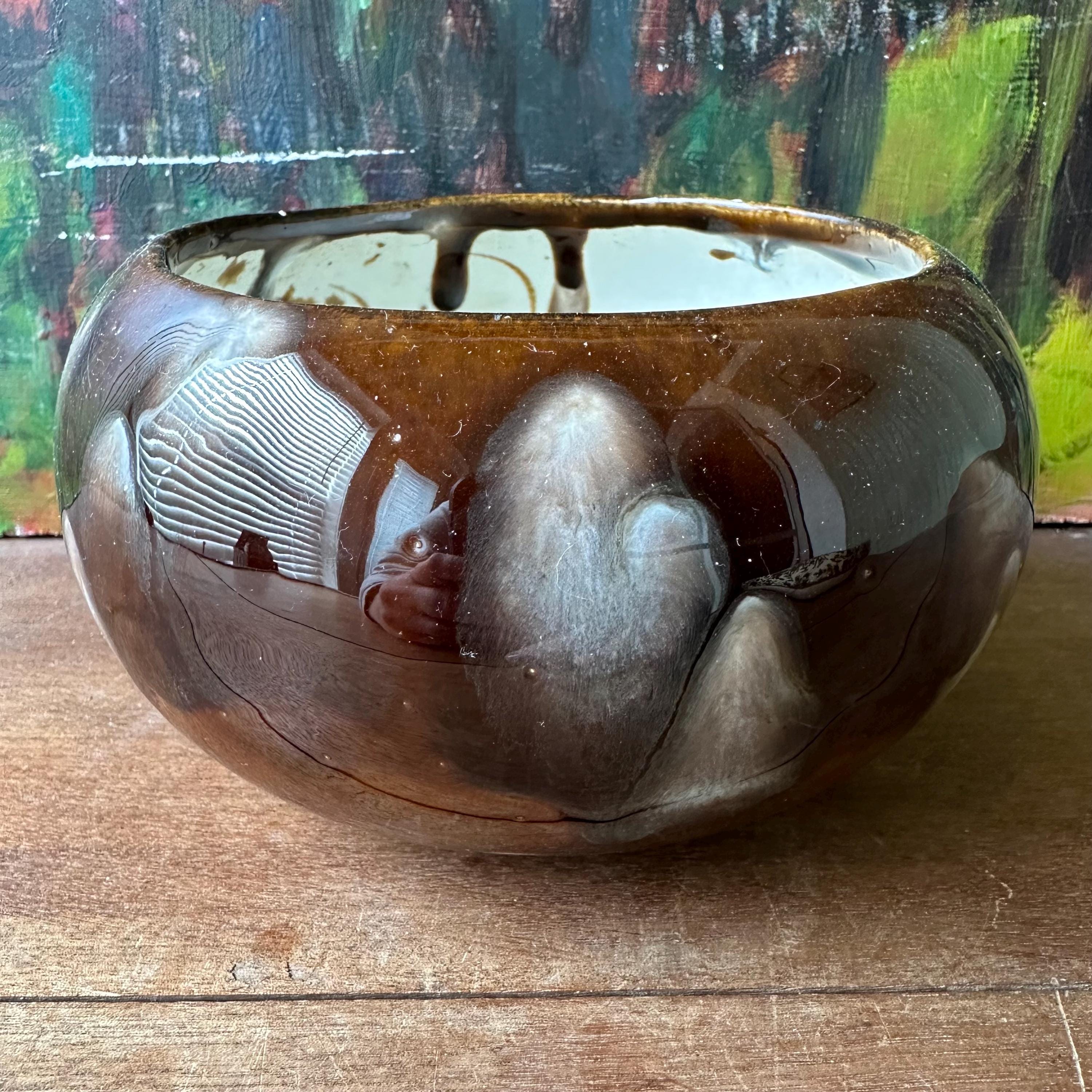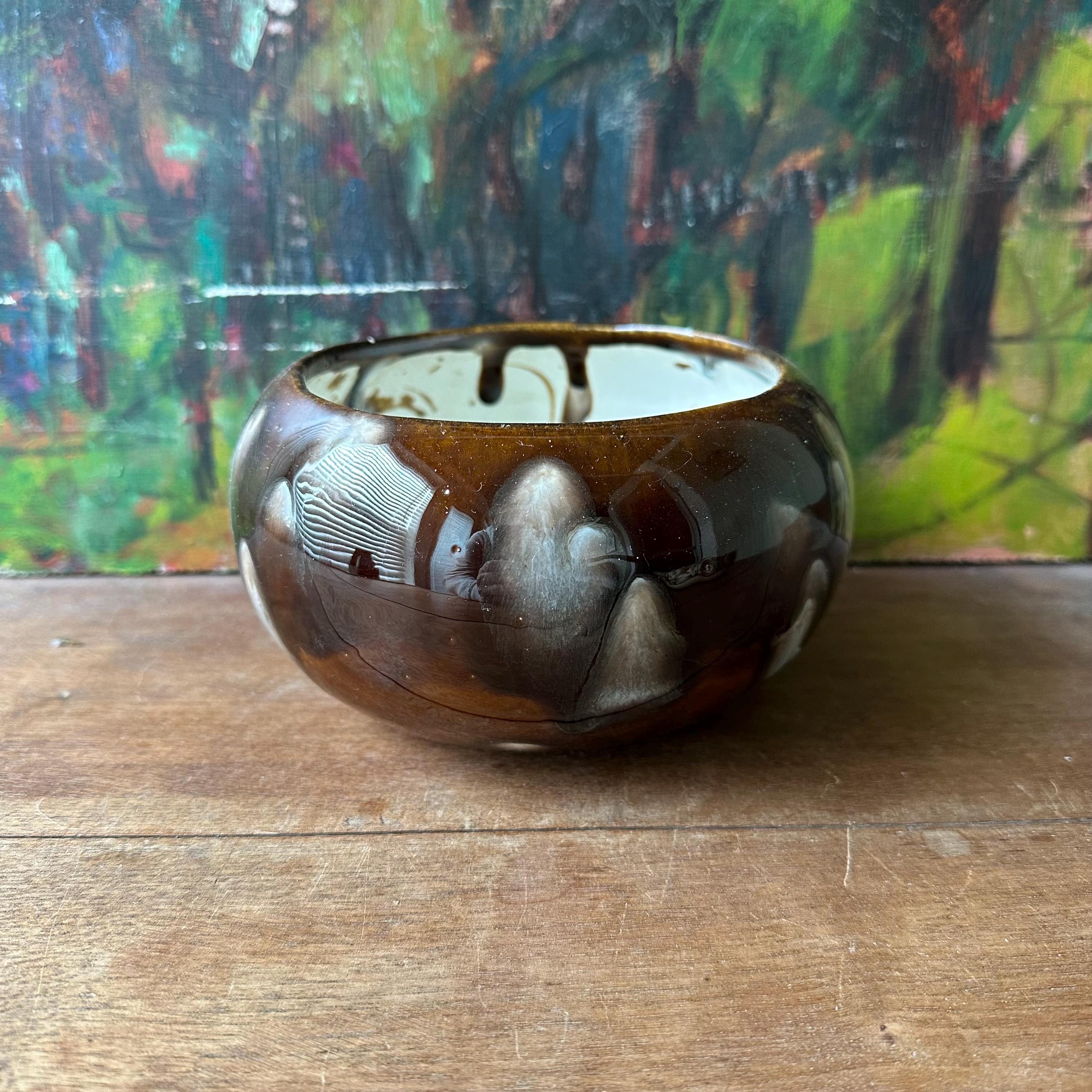 This is a ceramic planter from Atlantic Mold. It has a lovely drip glaze style finish in shades of brown and white. The planter is a bowl shape with Atlantic Mold on the bottom.