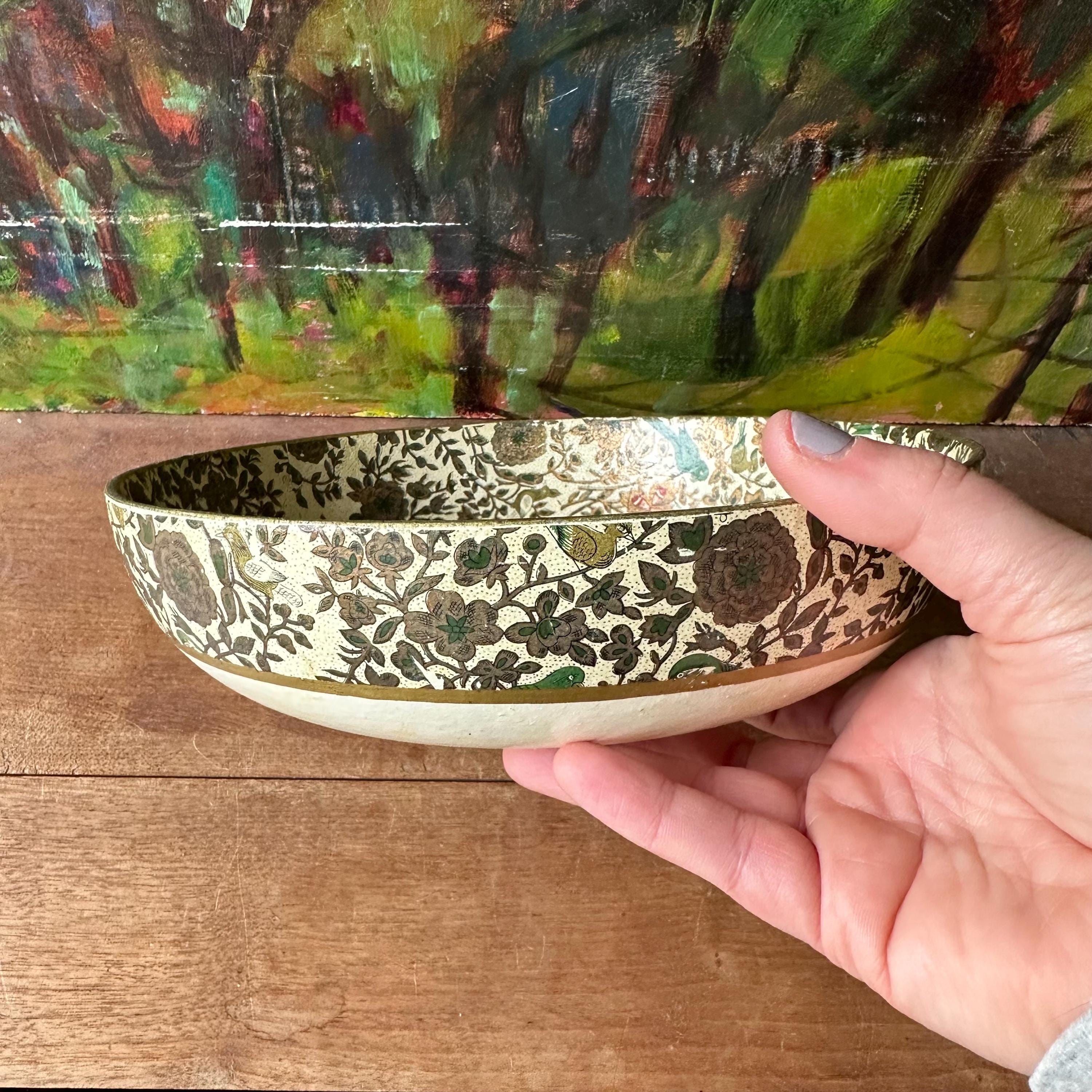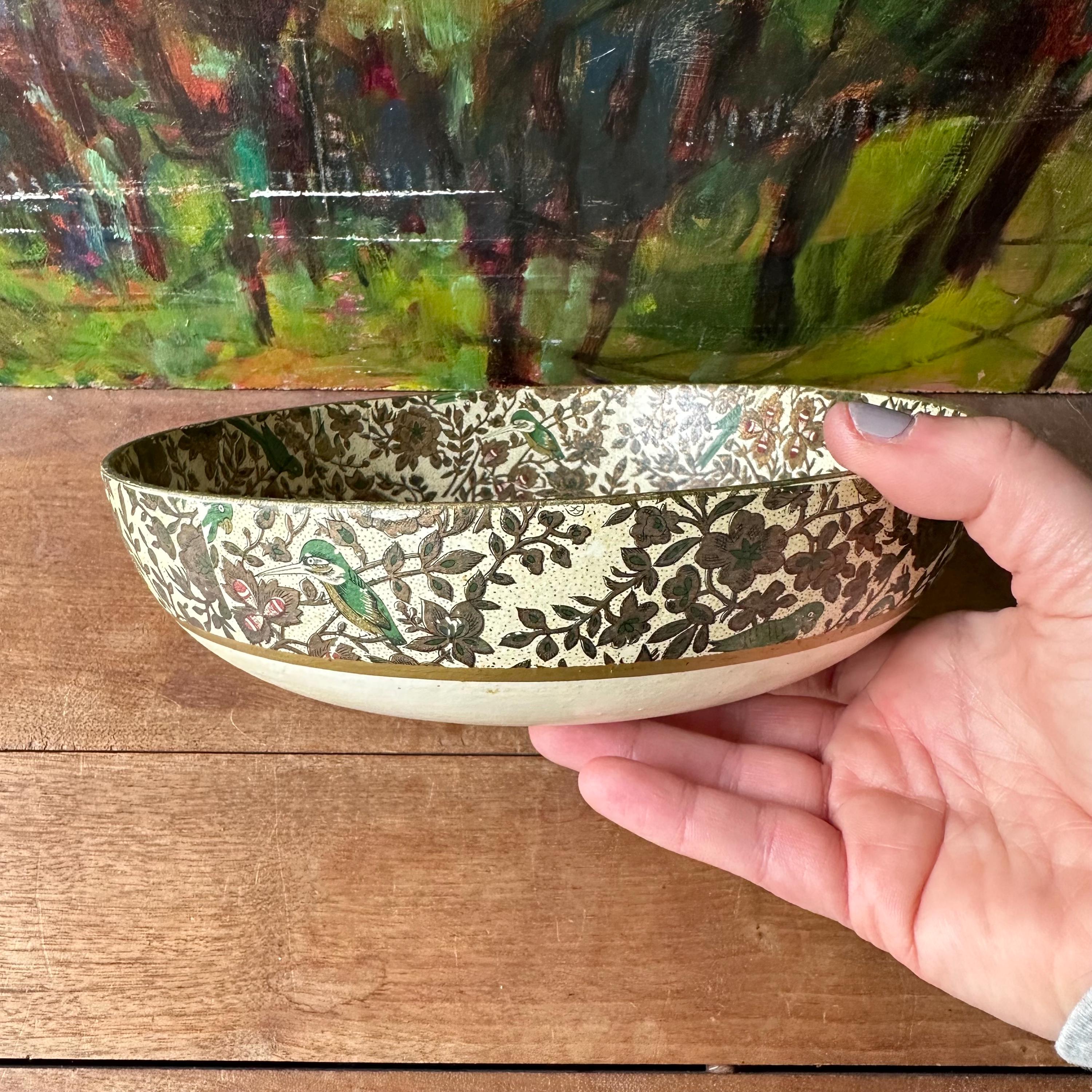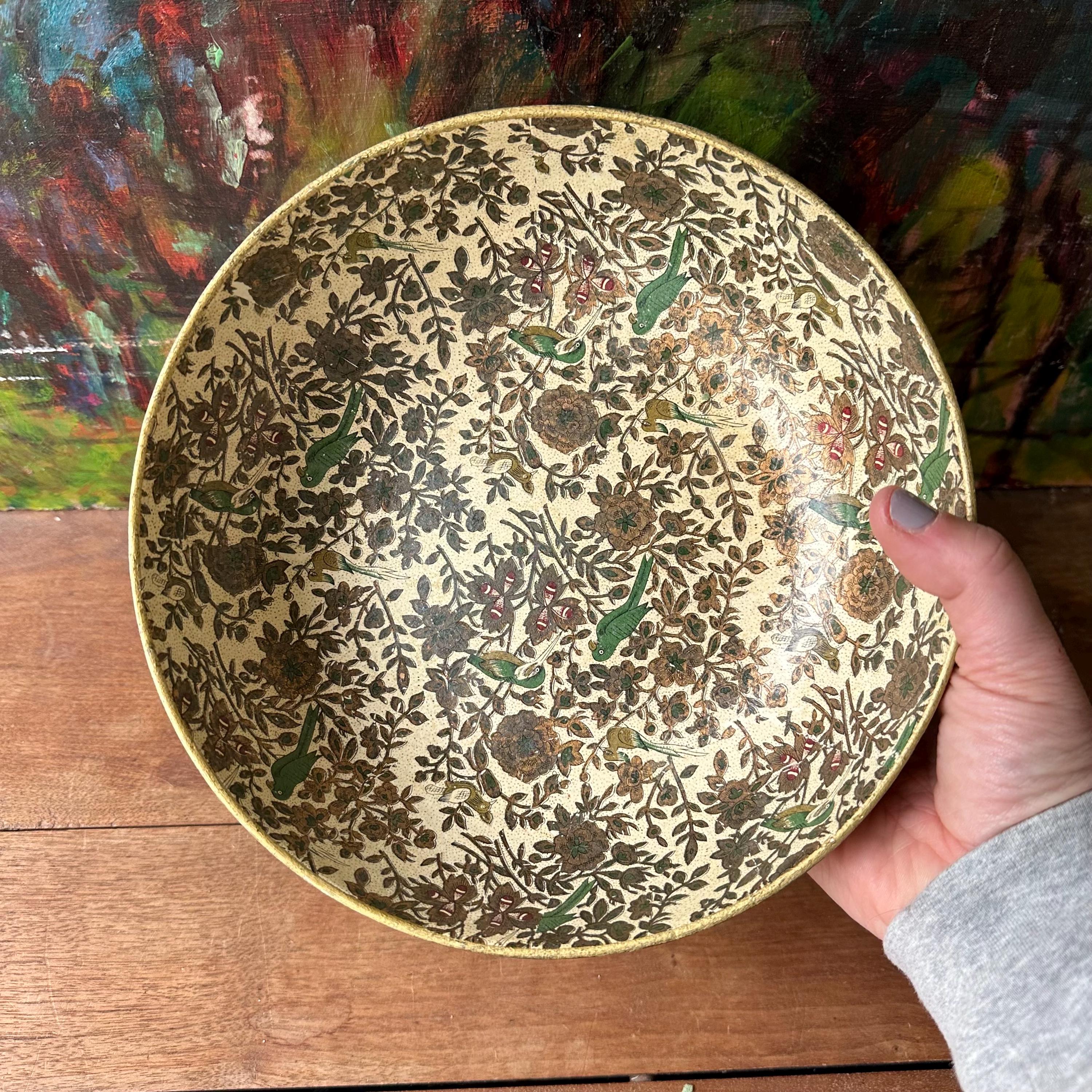 The bowl is in good vintage condition for its age and use. It has general wear all over with yellowing to the cream portion of the bowl. The flower print is intact and the gold is still shiny with some areas of small scratches or darkening. There are no chips or cracks to the paper mache.