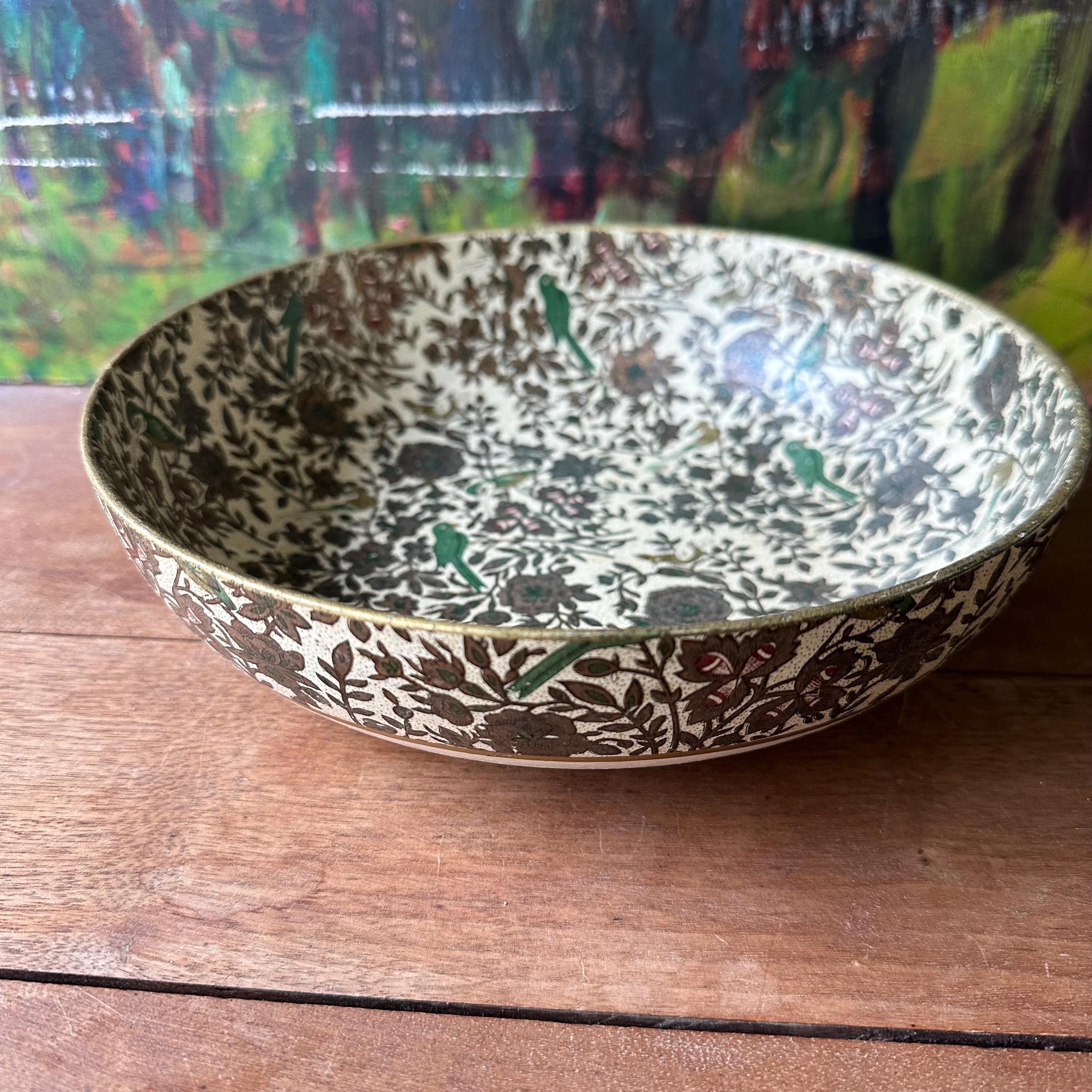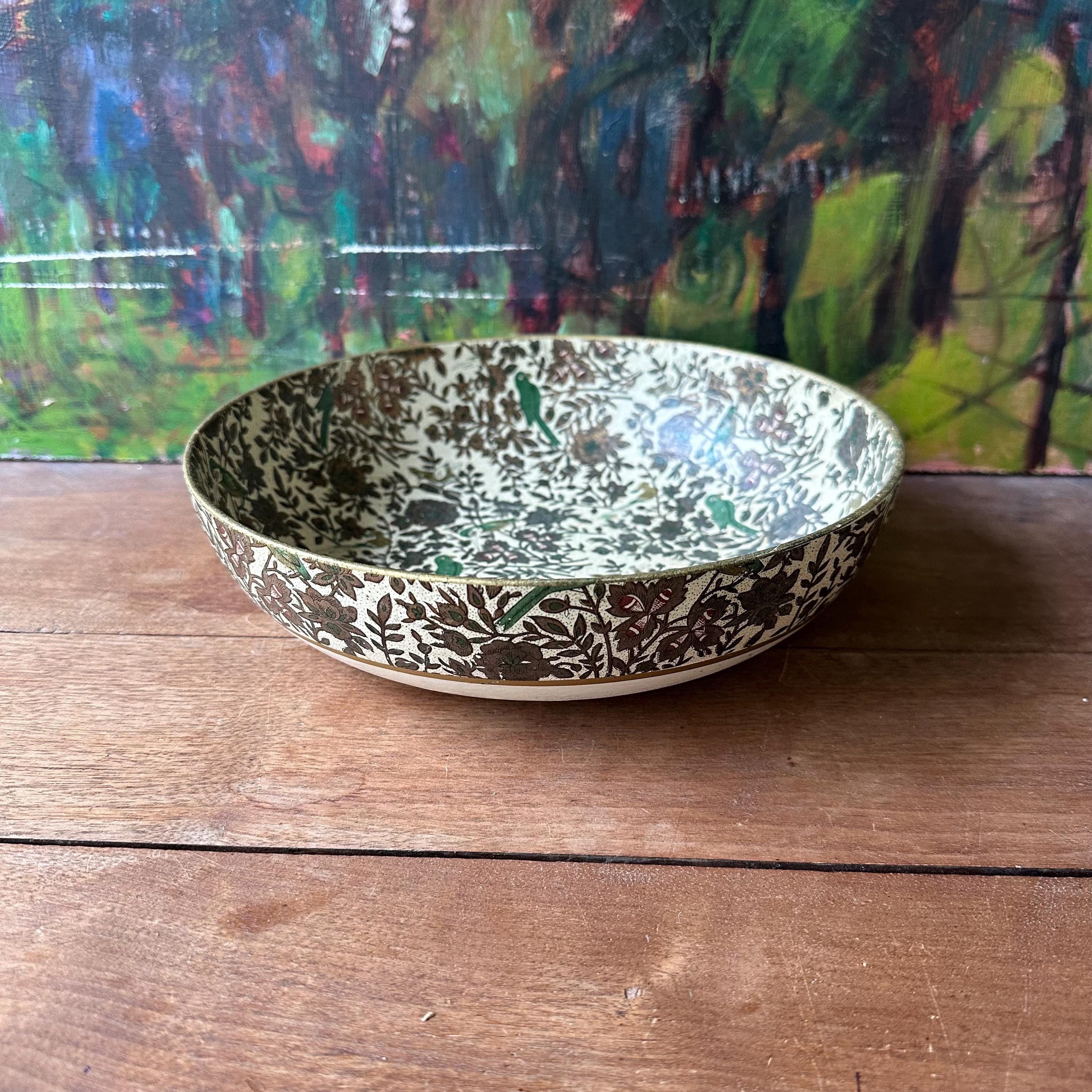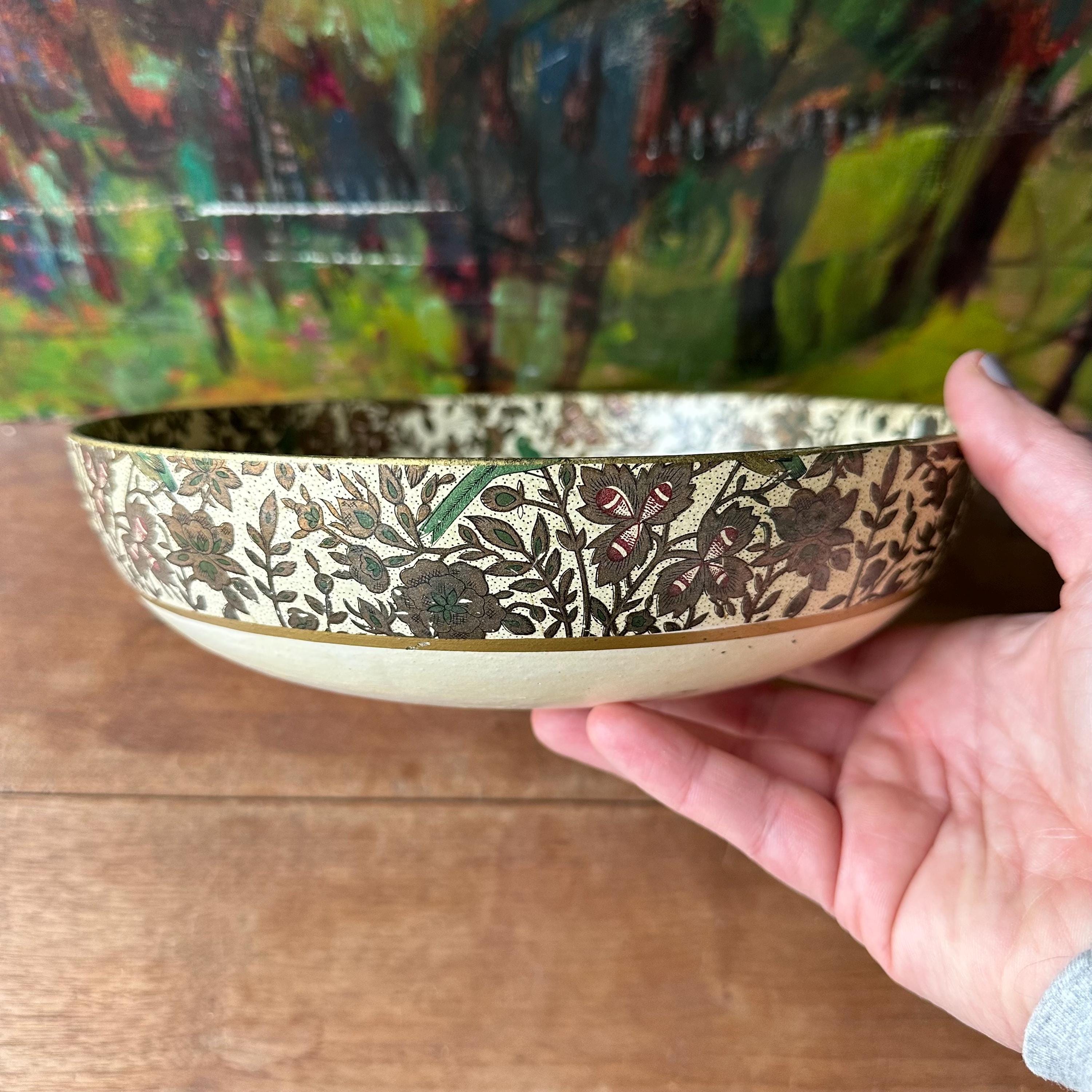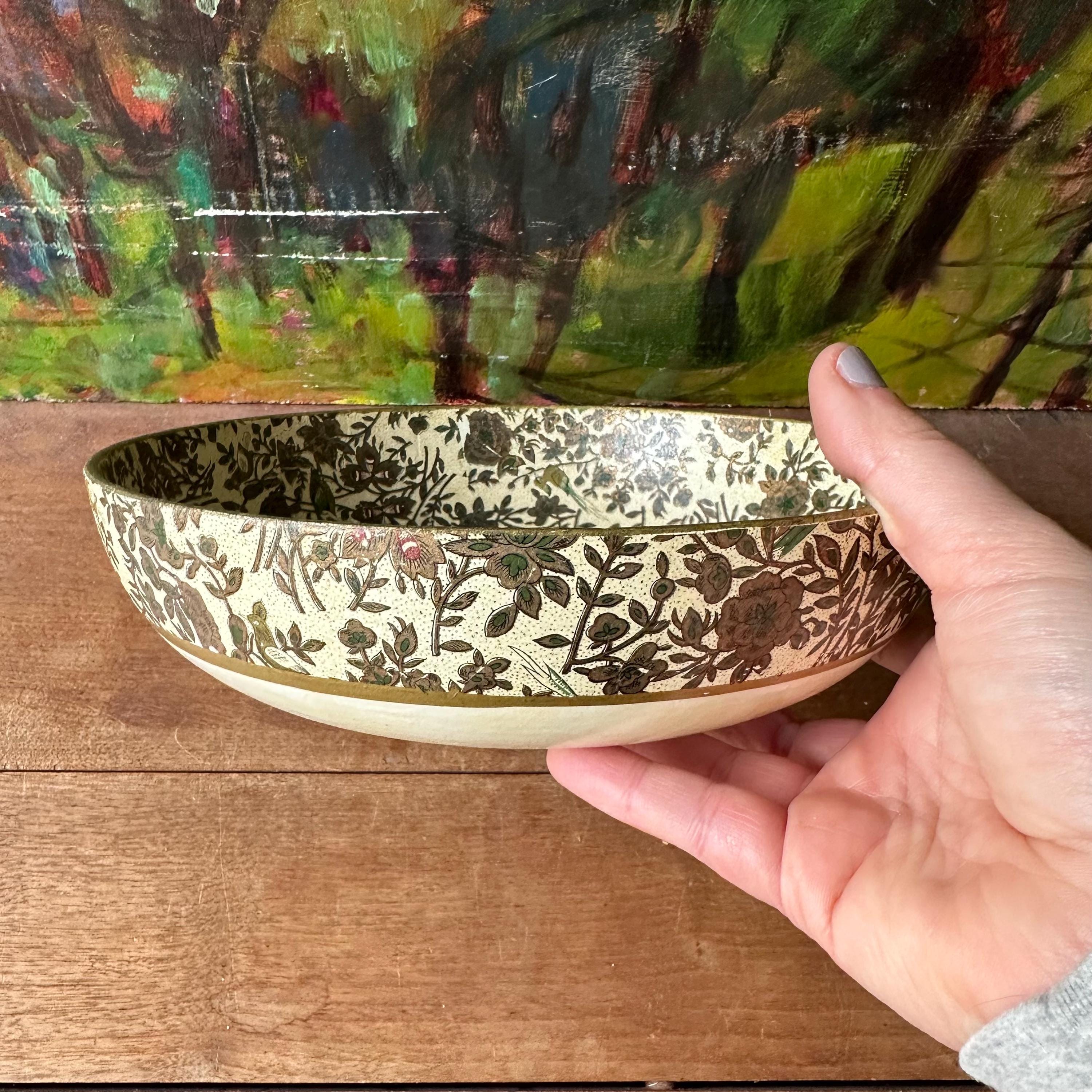 The bowl is in good vintage condition for its age and use. It has general wear all over with yellowing to the cream portion of the bowl. The flower print is intact and the gold is still shiny with some areas of small scratches or darkening. There are no chips or cracks to the paper mache.