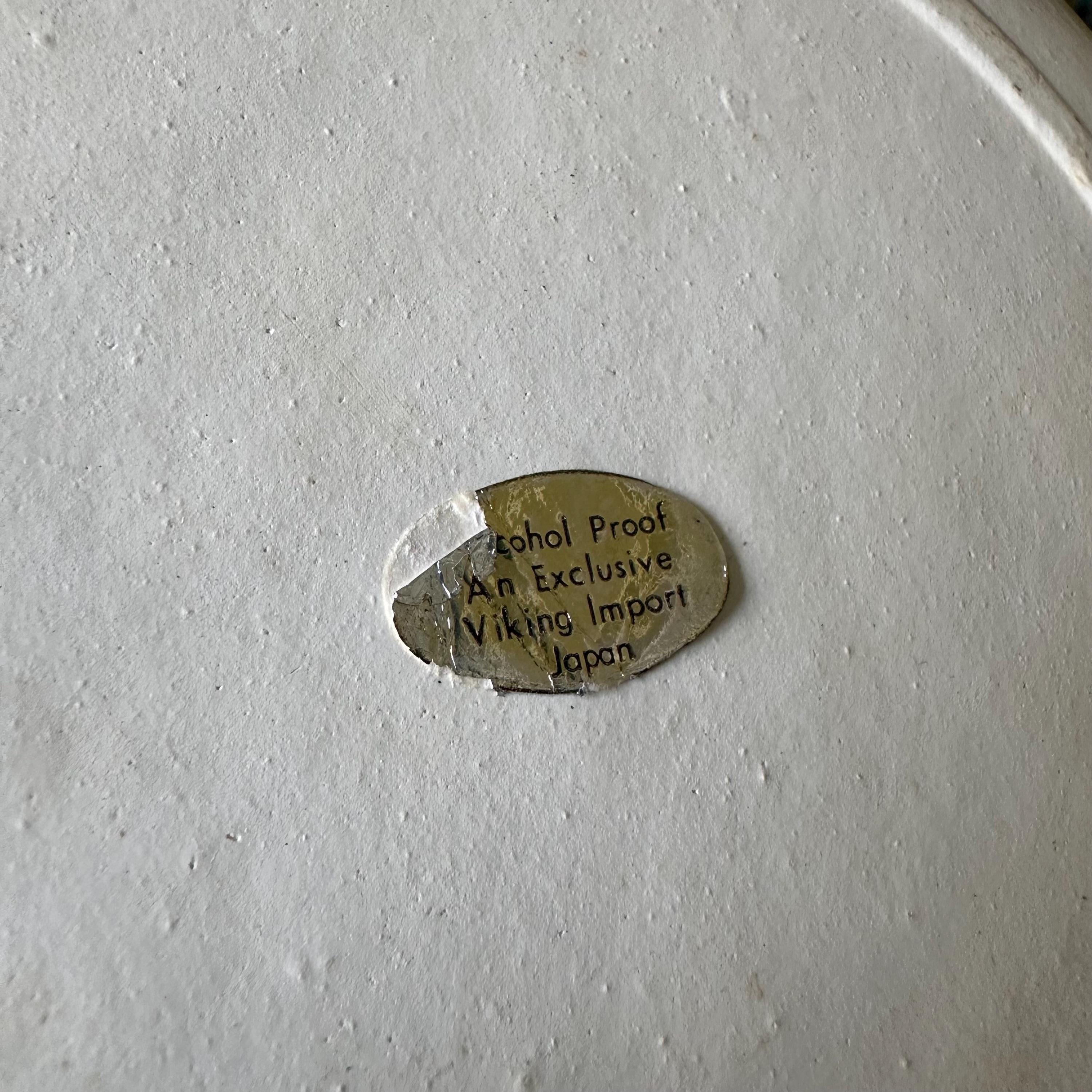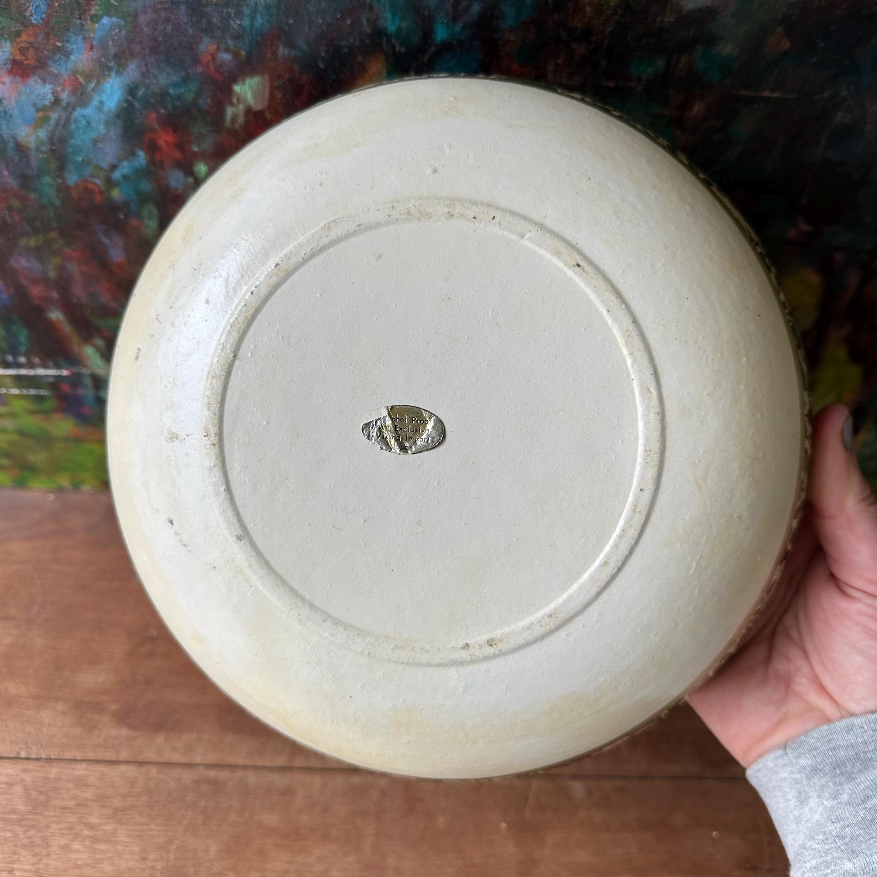 This is a paper mache serving bowl from Viking Imports. It is cream colored with cream colored base and an outer band of gold flowers, vines, and leaves with different types of green tropical birds with a gold border and a gold rim. The inside of the bowl is all covered with the birds and flowers. There is a silver Alcohol Proof An Exclusive Viking Imports Japan sticker on the bottom.