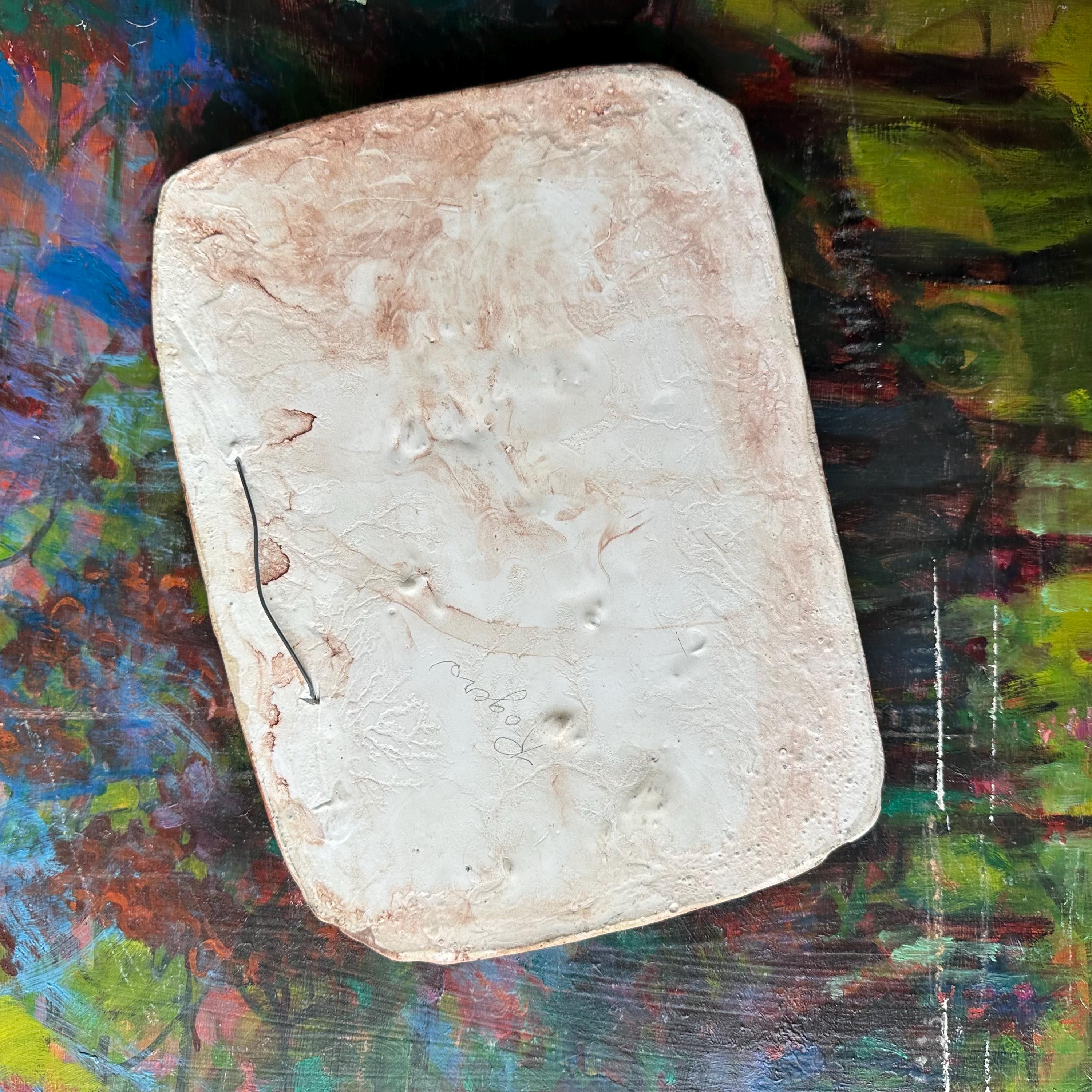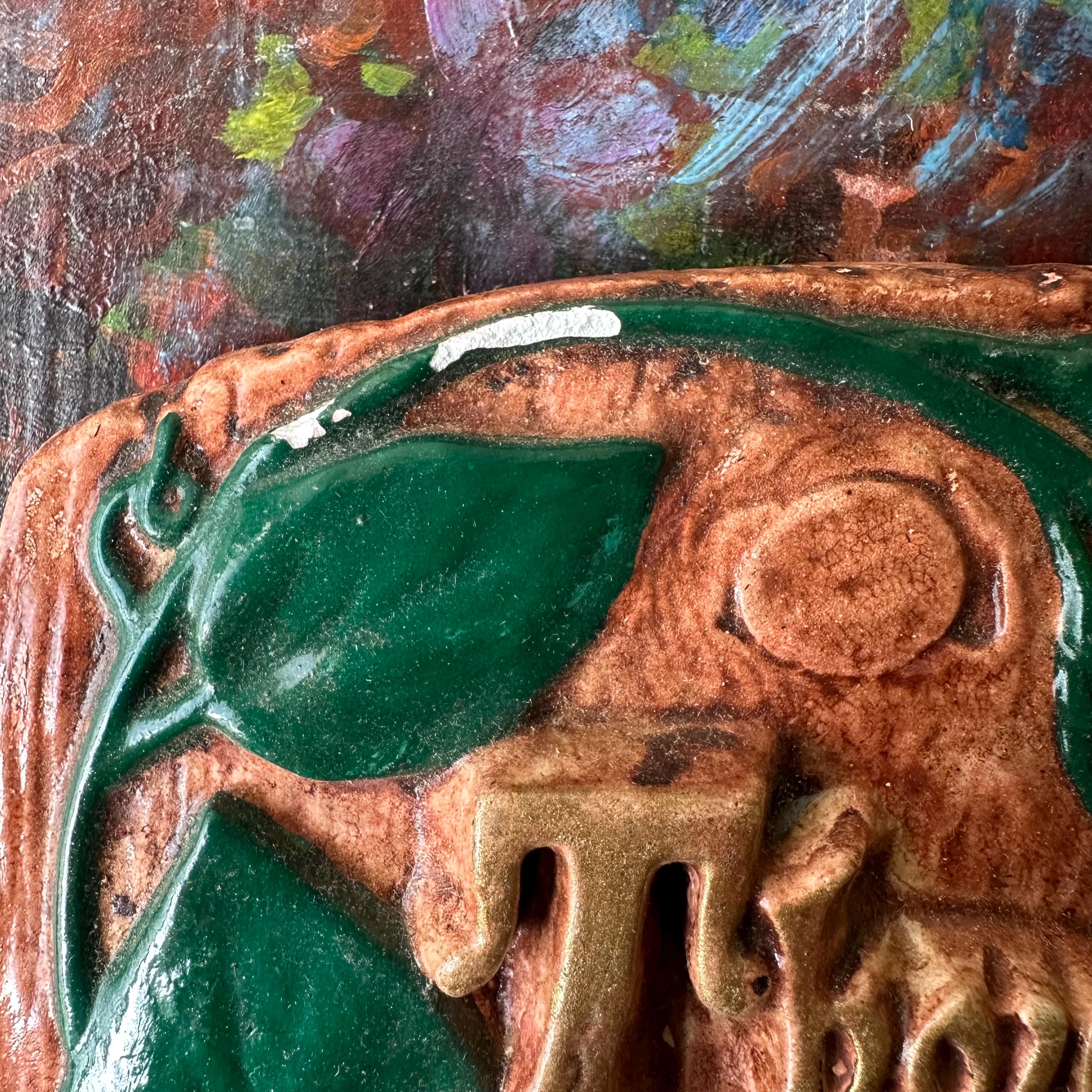 The chalkware is in good vintage condition for its age and use. The colors are still bright and there are no cracks to the chalkware. There are two chips to the top left corner morning glory stem, exposing the white chalk underneath. The wire loop is still embedded firmly.