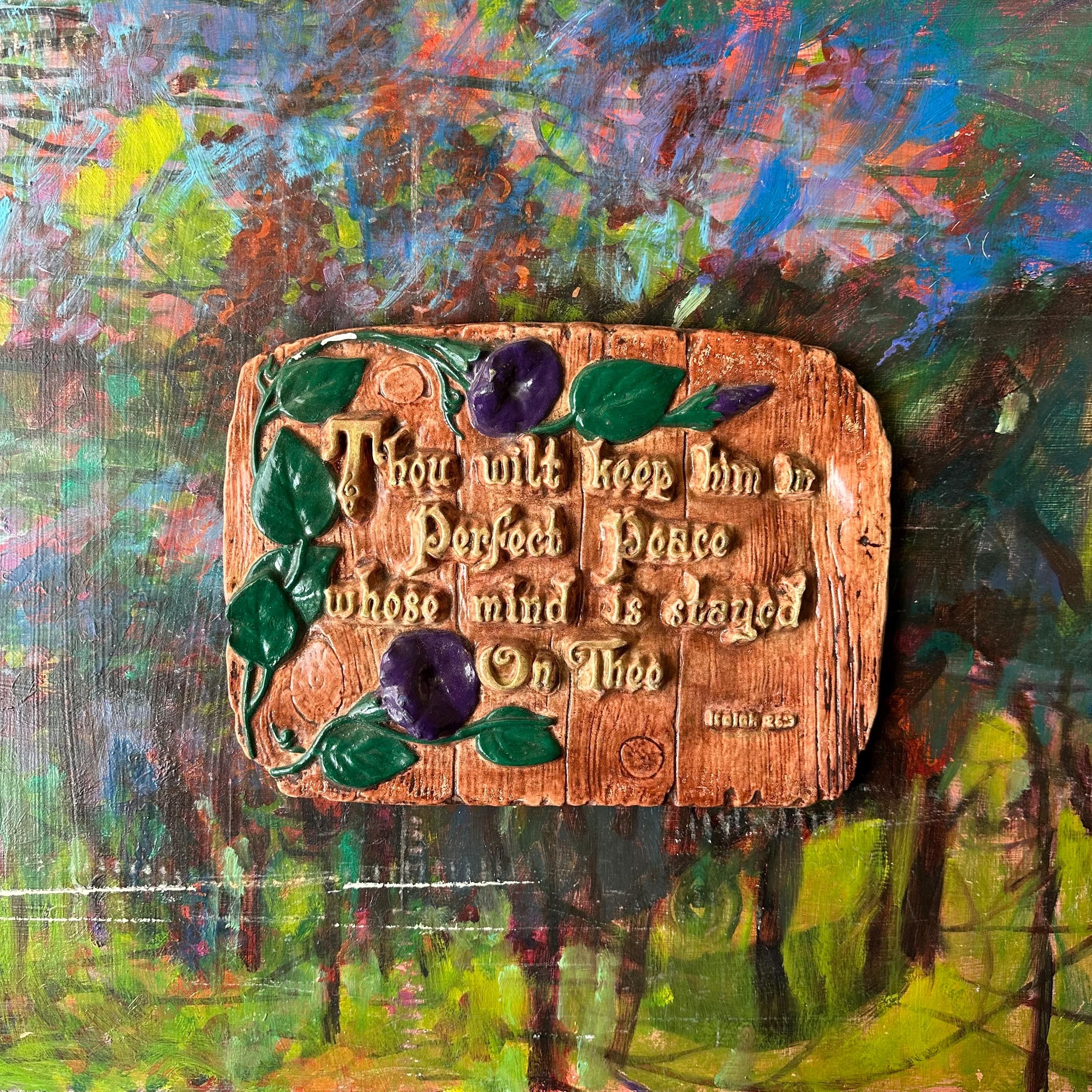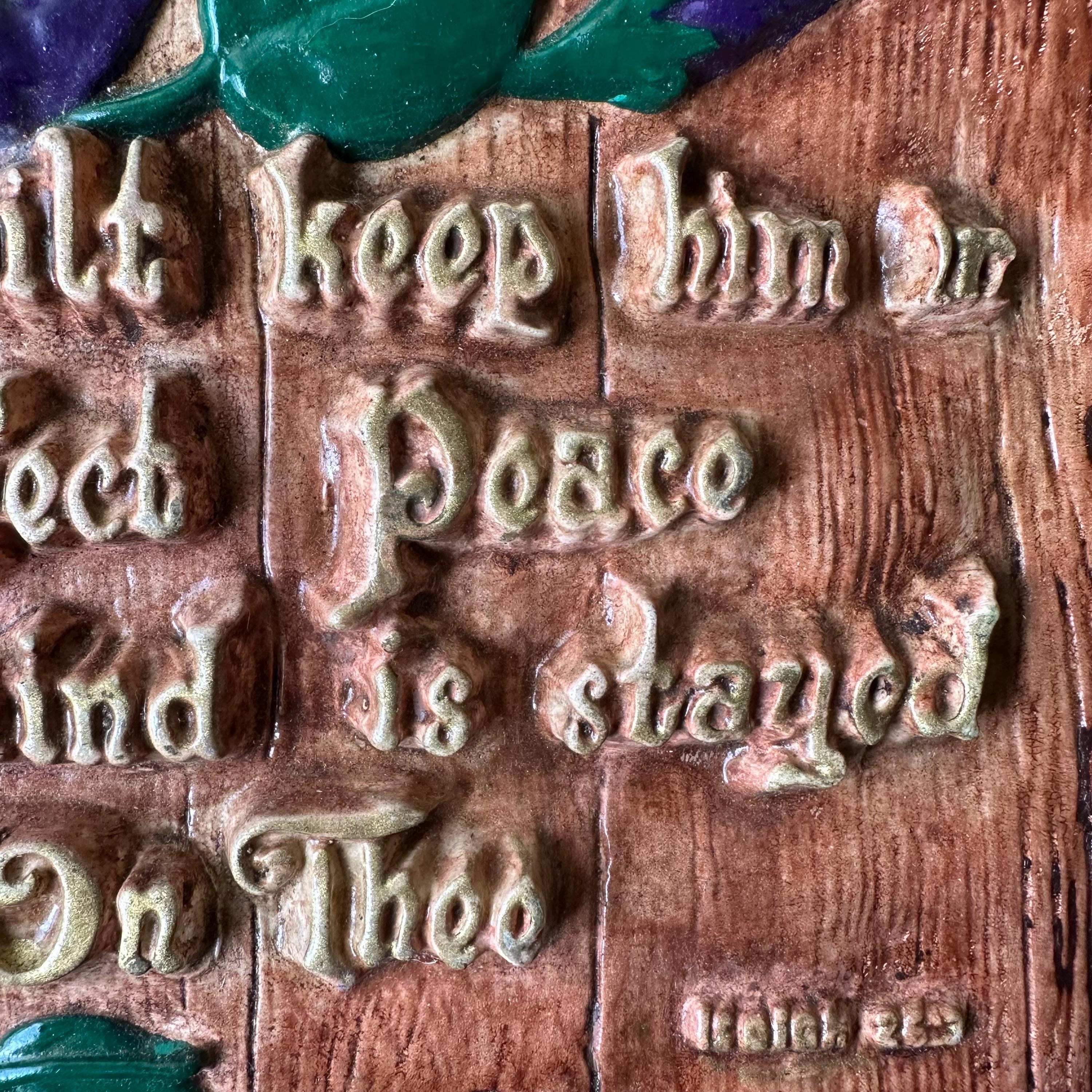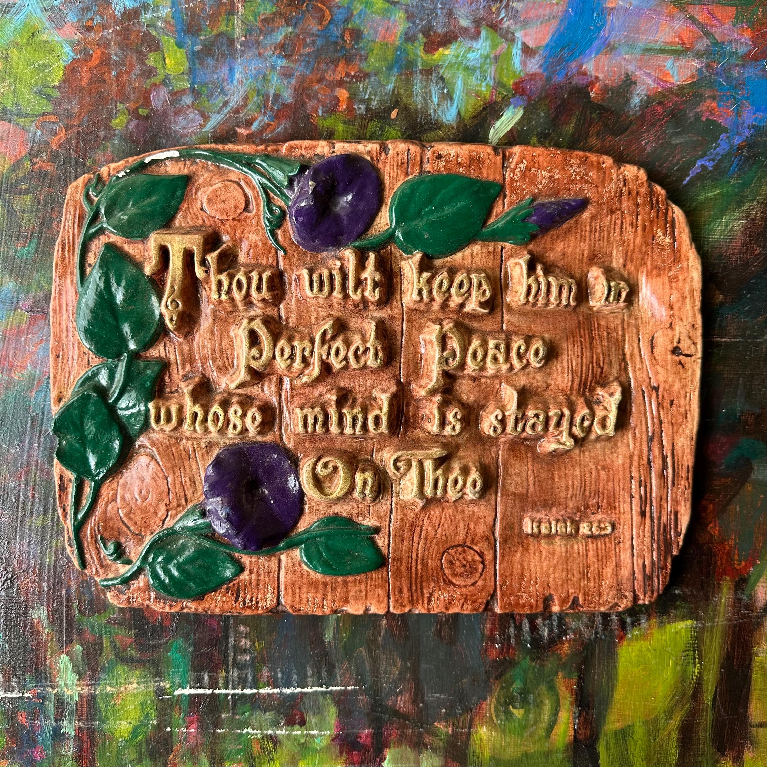 This is a chalkware plaque with a bible verse and morning glories. The chalkware is made to look like weather wood, potentially a fence, with purple morning glory flowers creeping up the left side. The chalkware has the bible verse from Isaiah Chapter 26, Verse 3, "Thou wilt keep him in Perfect Peace whose mind is stayed On Thee." The letters are raised up and painted in gold. The back of the plaque has an embedded wire loop to hang the plaque.