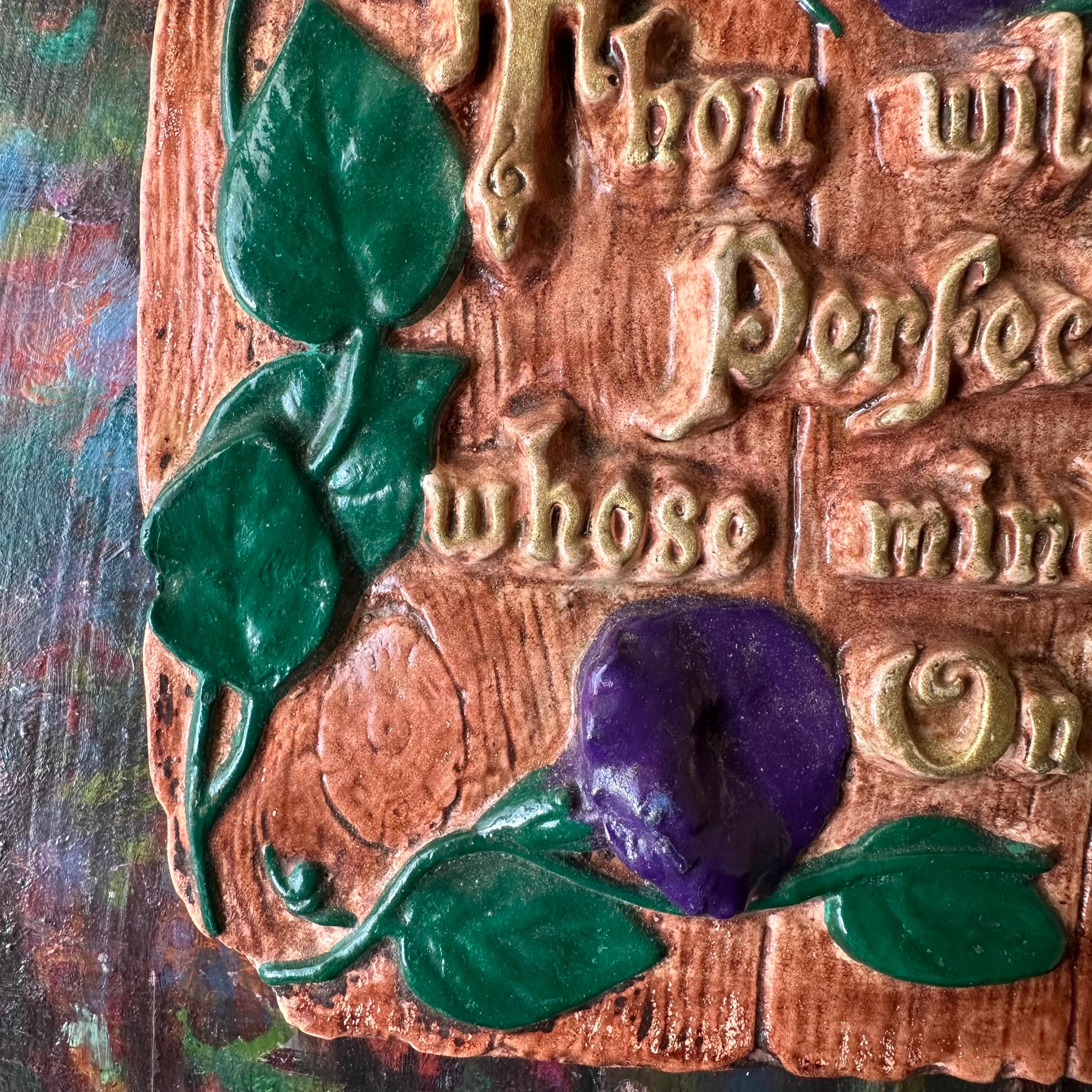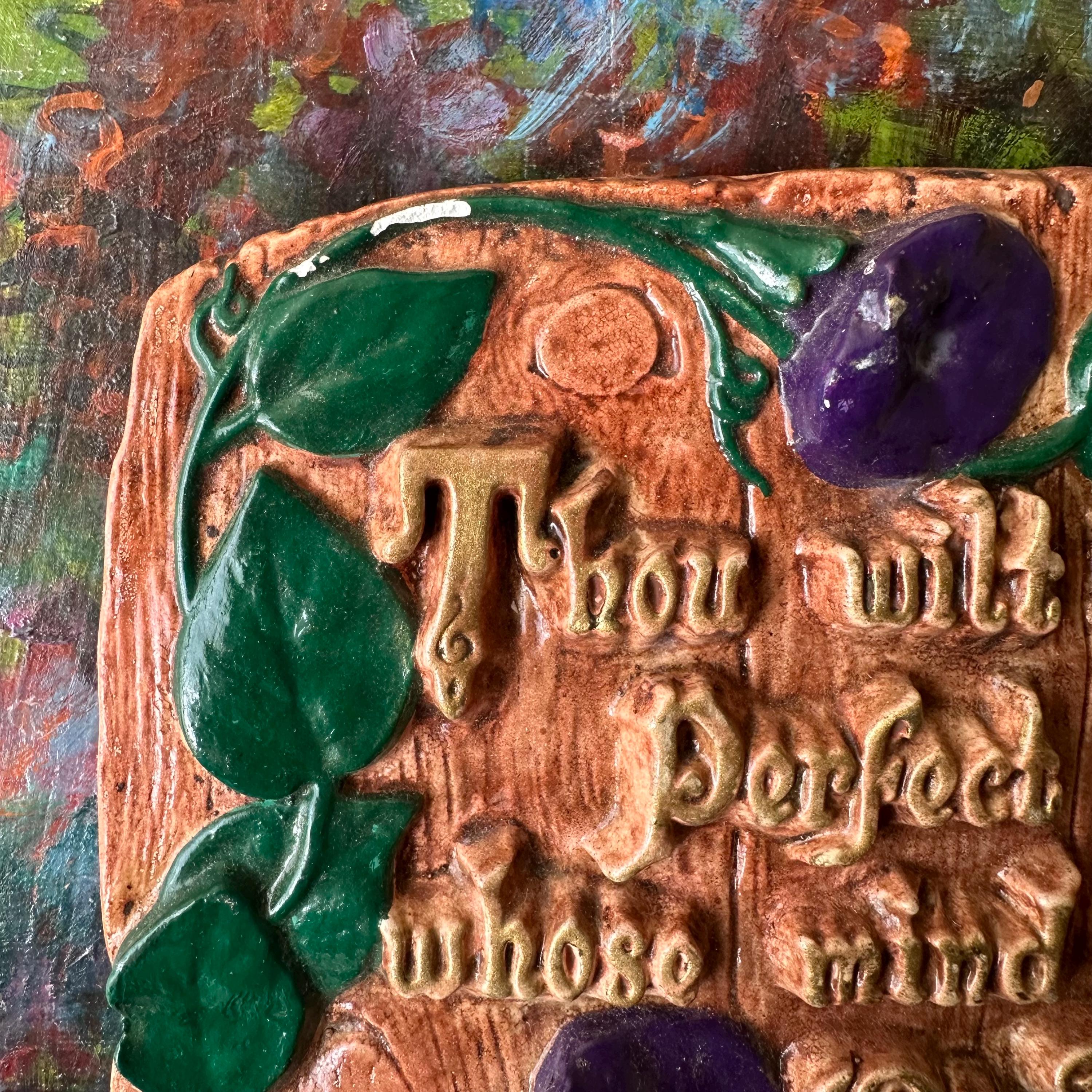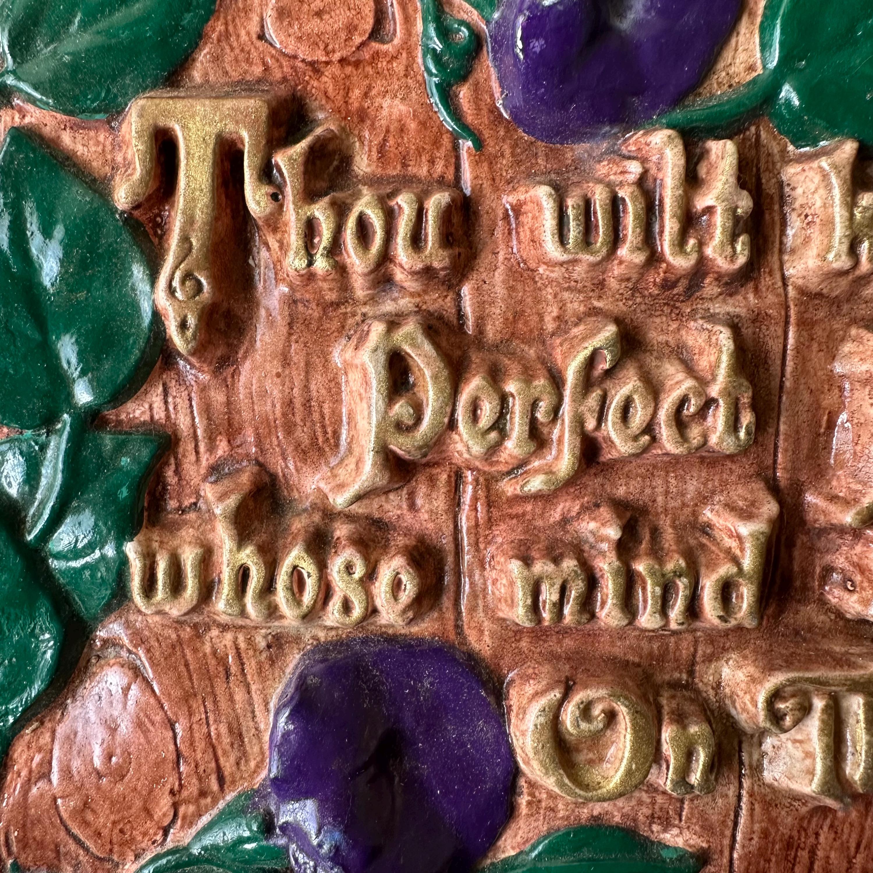 This is a chalkware plaque with a bible verse and morning glories. The chalkware is made to look like weather wood, potentially a fence, with purple morning glory flowers creeping up the left side. The chalkware has the bible verse from Isaiah Chapter 26, Verse 3, "Thou wilt keep him in Perfect Peace whose mind is stayed On Thee." The letters are raised up and painted in gold. The back of the plaque has an embedded wire loop to hang the plaque.