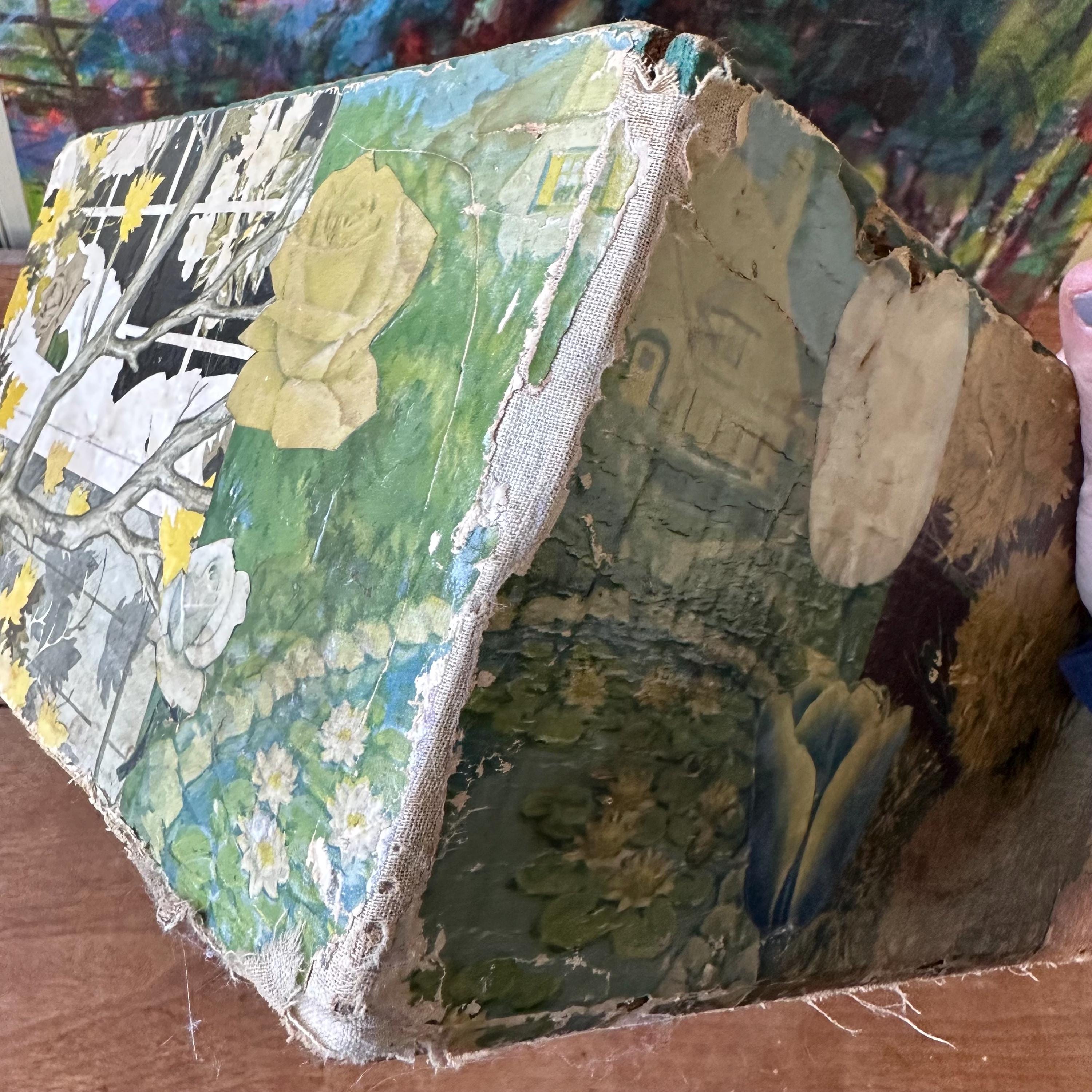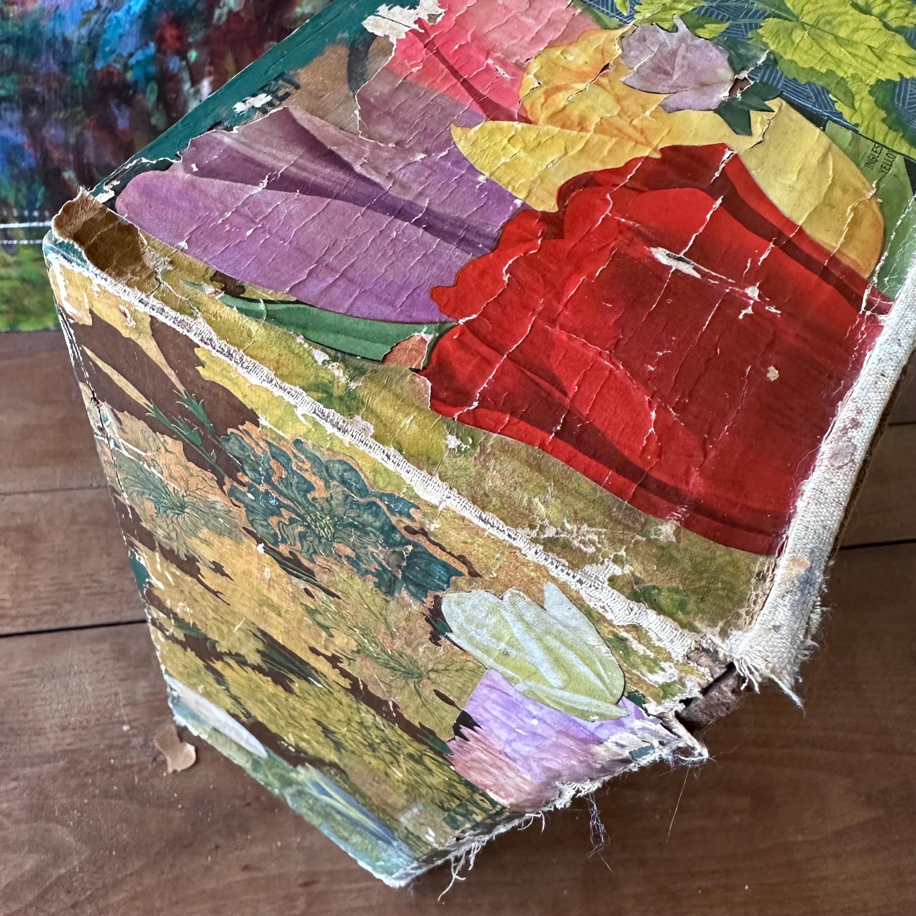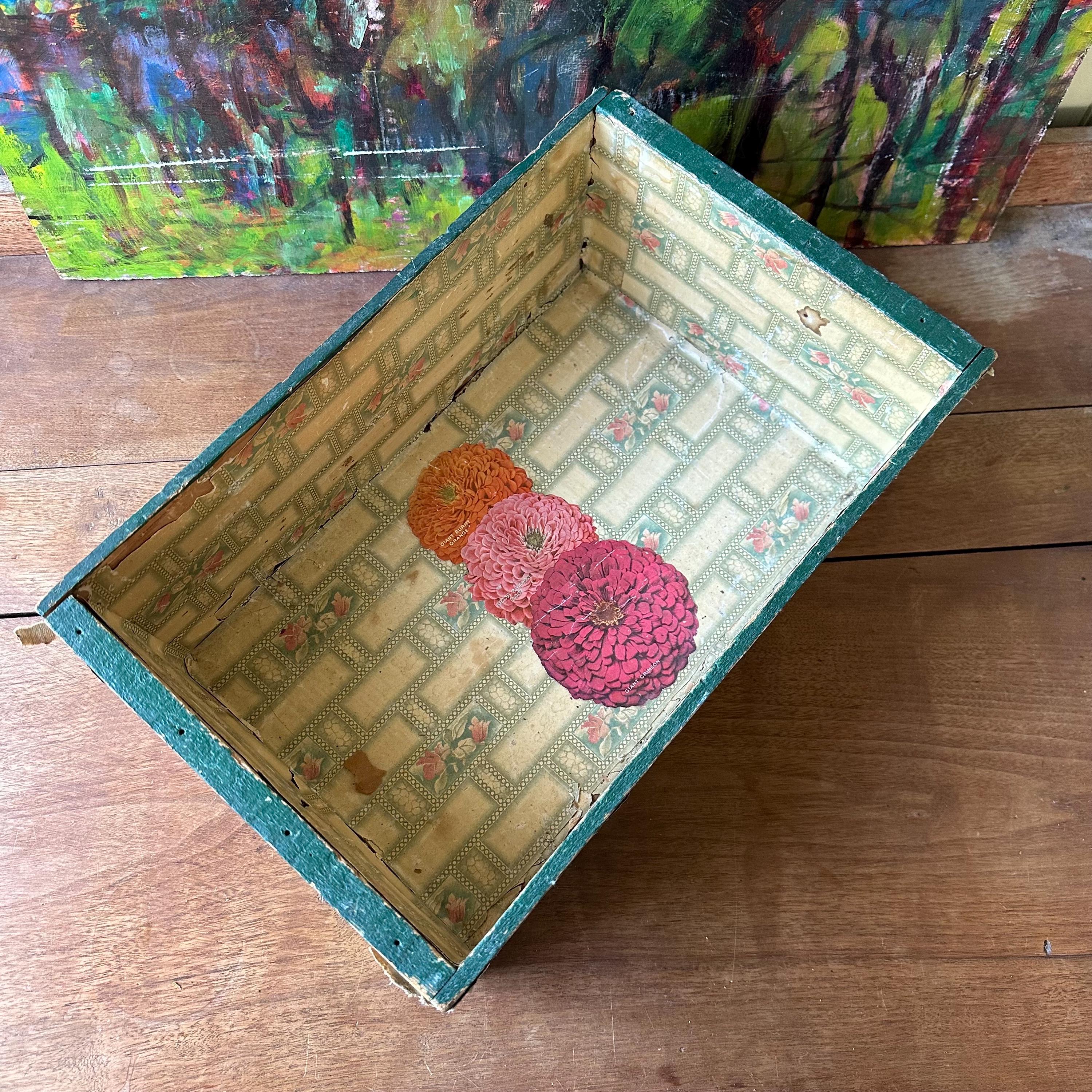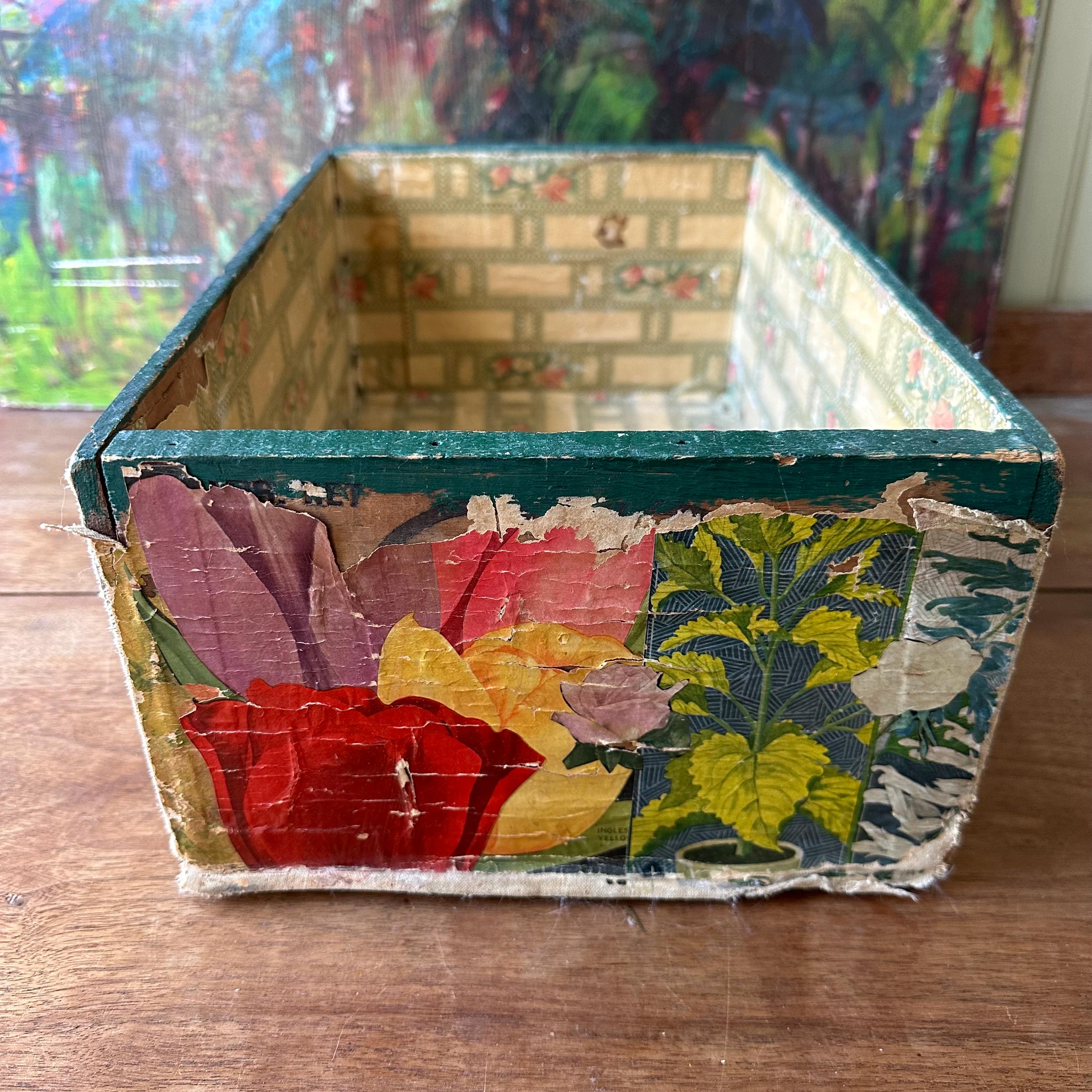 This is a wooden fruit crate that has been decoupaged with floral paper. It has different floral papers all over mostly in shades of brown, green, and yellow that have been added to all four sides as well as the interior. There are also large flowers cut out and collaged on with zinnias in the center of the interior and tulips on the sides. The tops of the crate have been painted dark green. The bottom has been left plain.