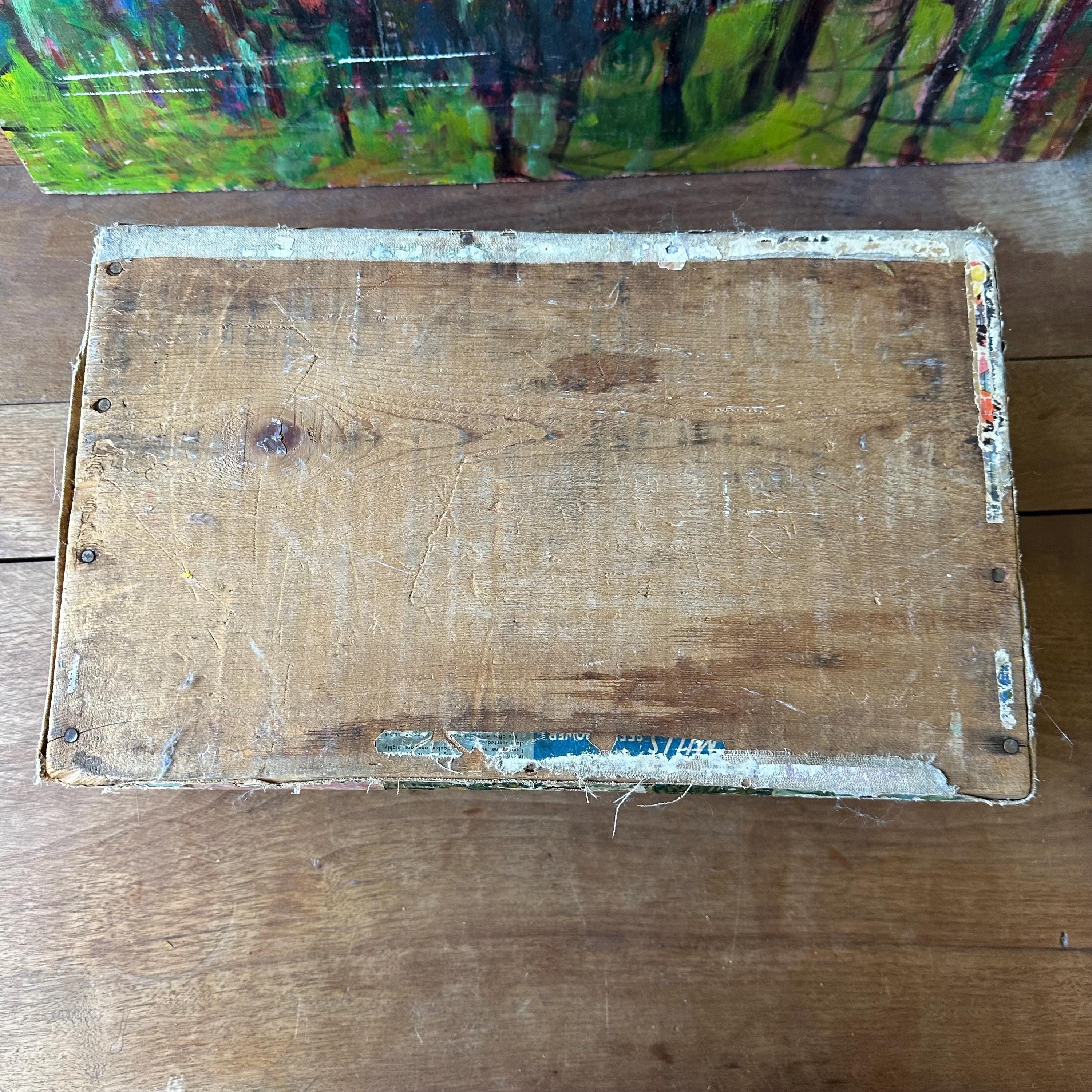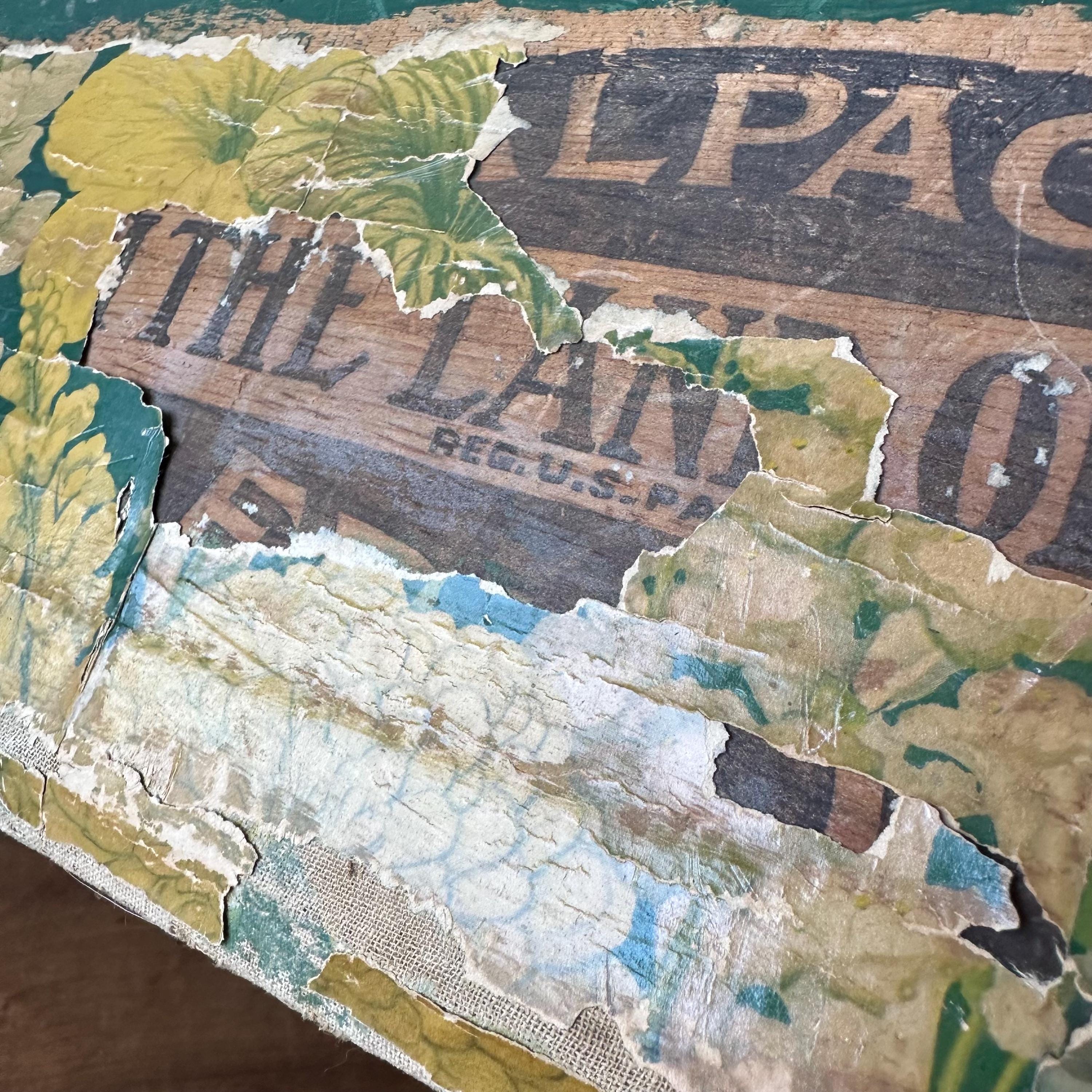 The crate is in good vintage condition for its age and use. The paper is cracked and peeling in several spots, especially on the back side where a lot is missing. It gives the crate a nice shabby chic look. The crate itself is solid and the sides are all nailed together tightly.