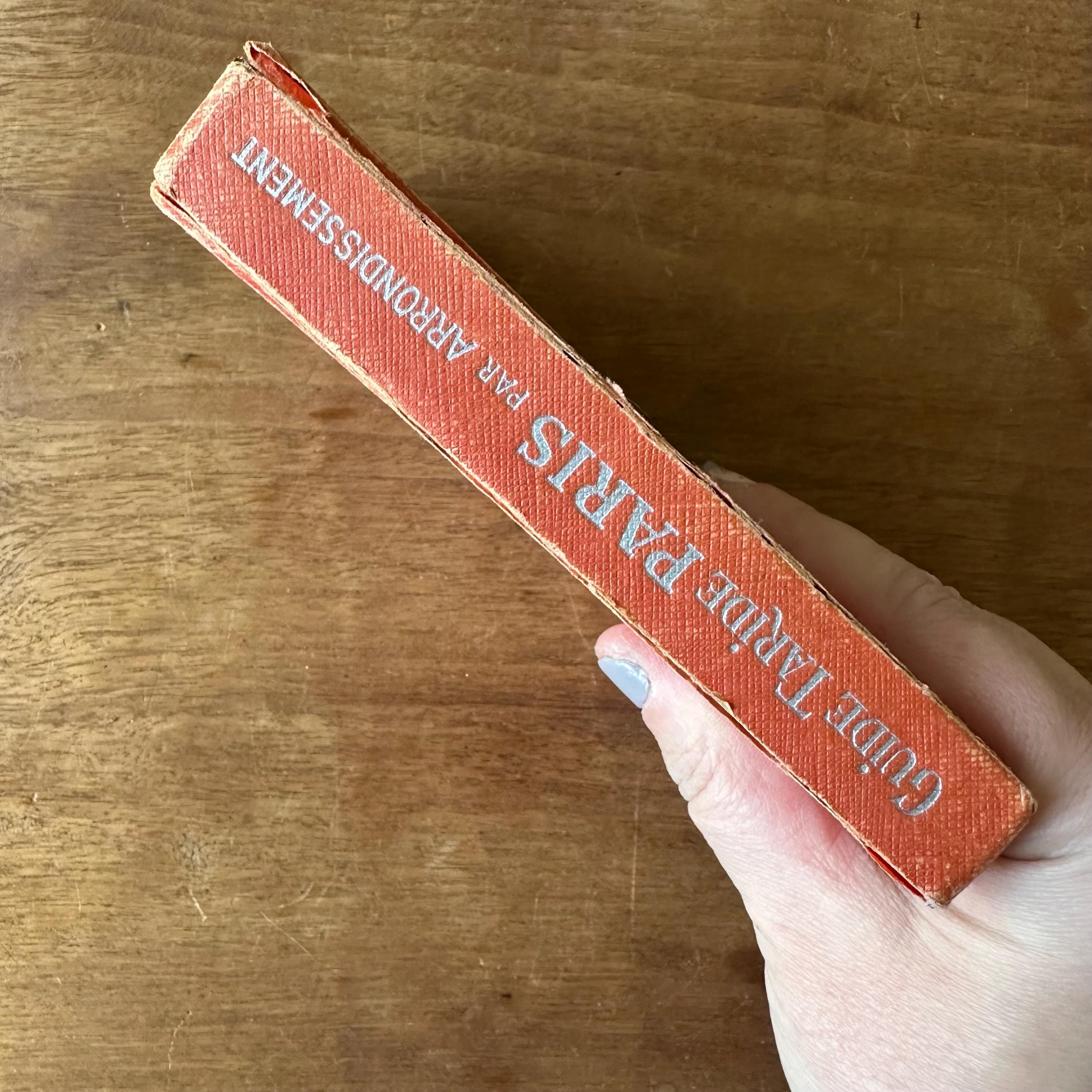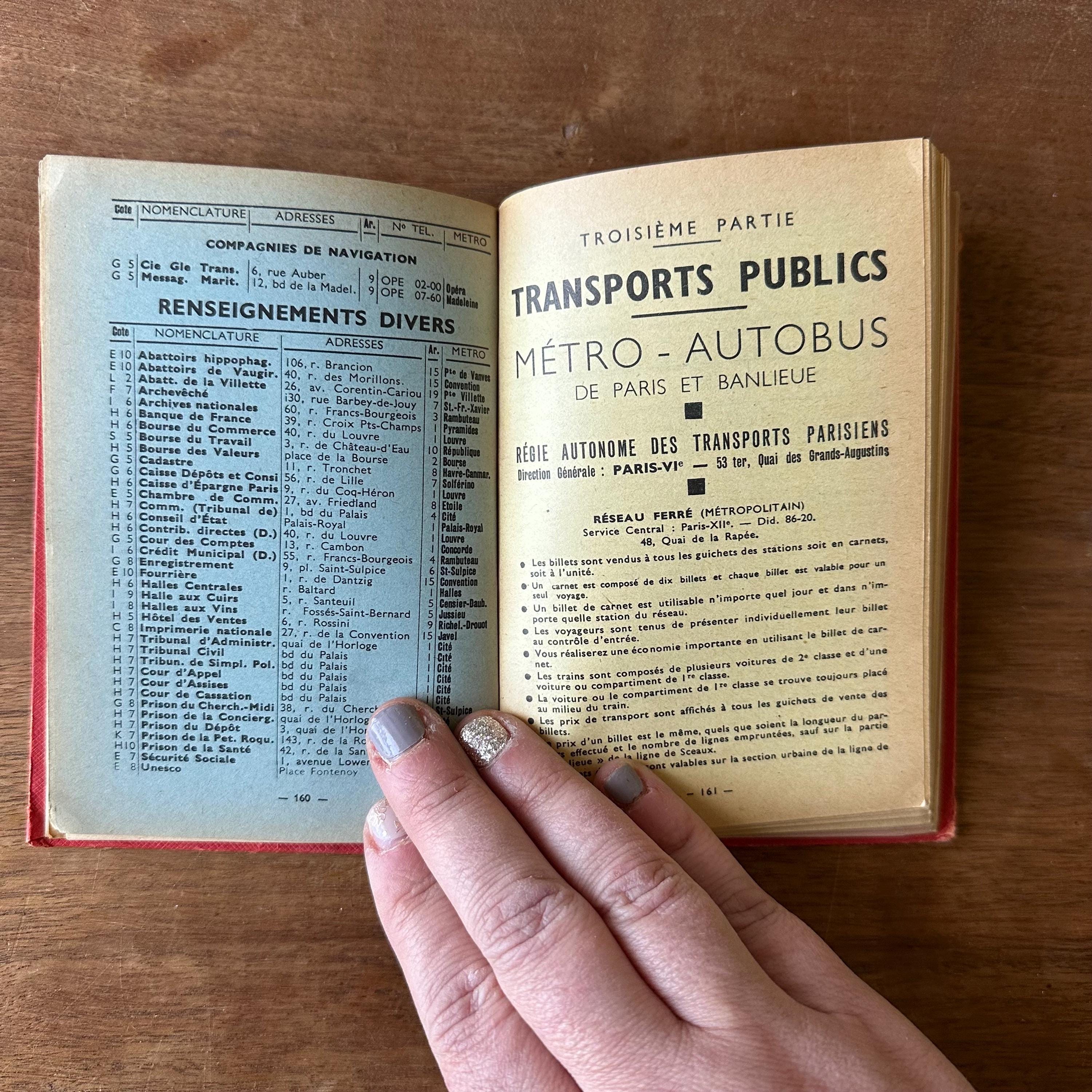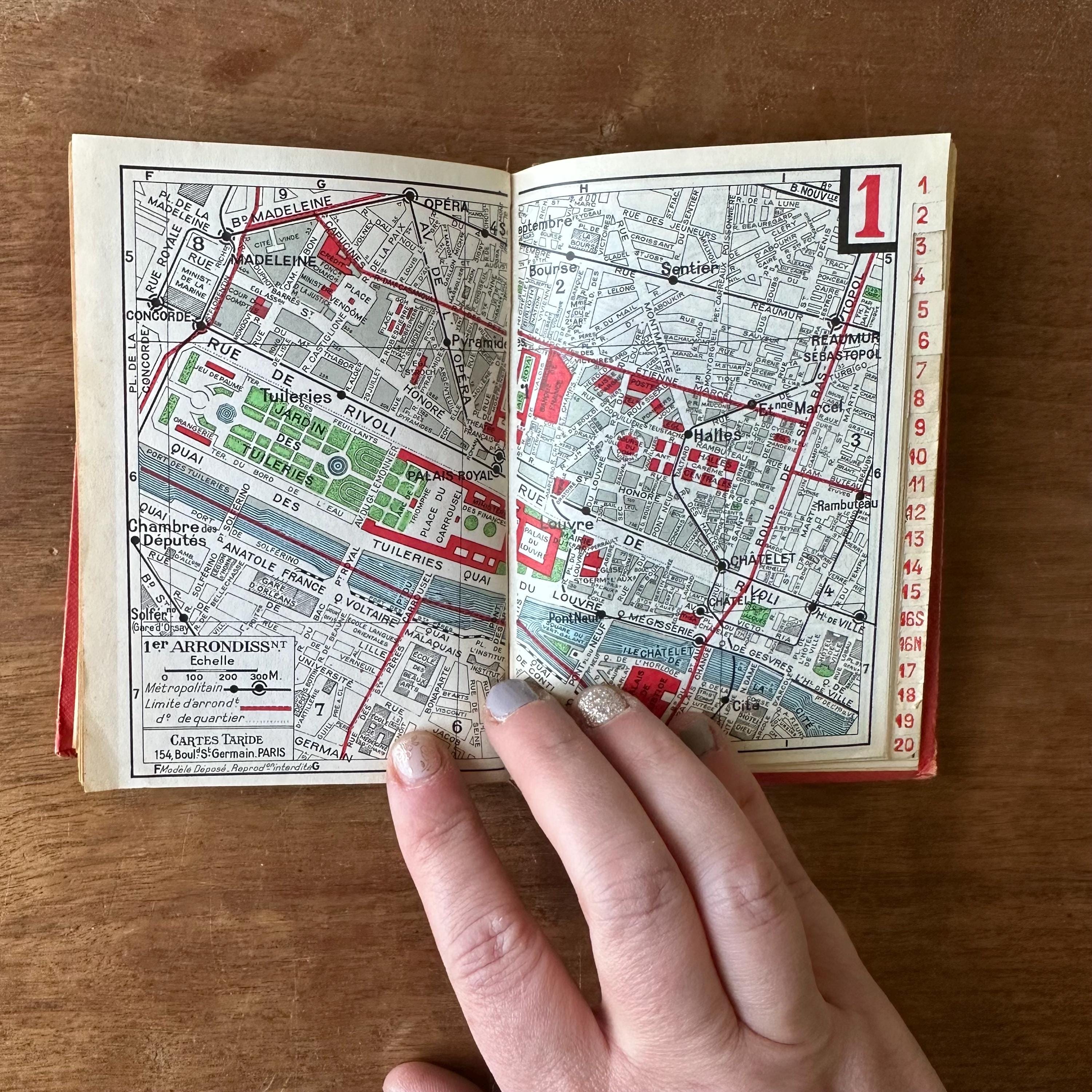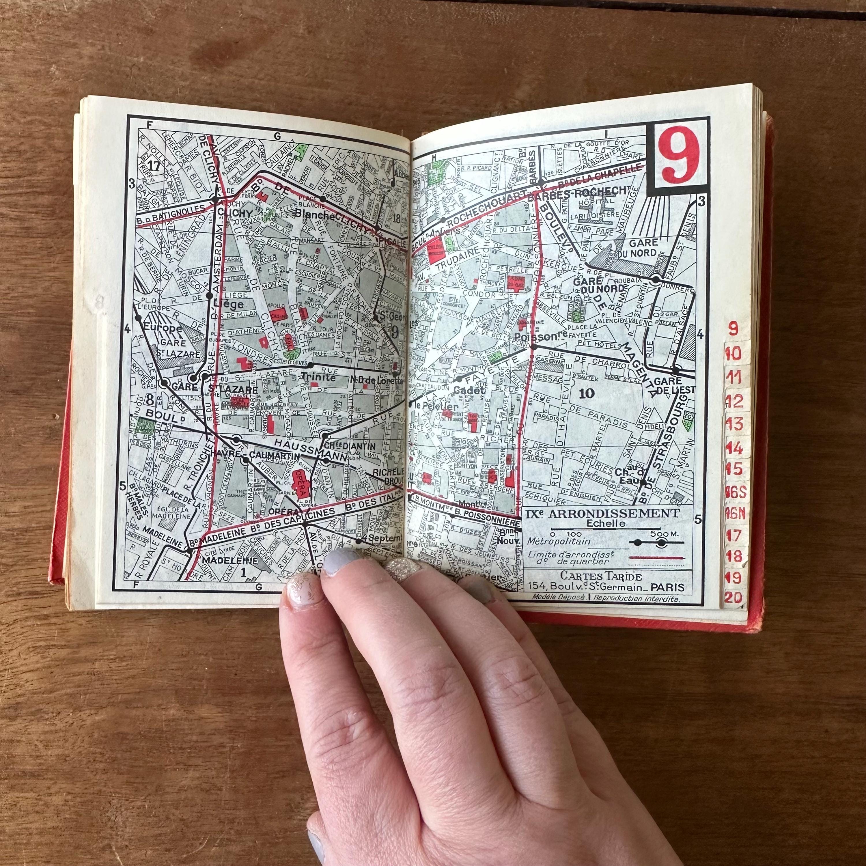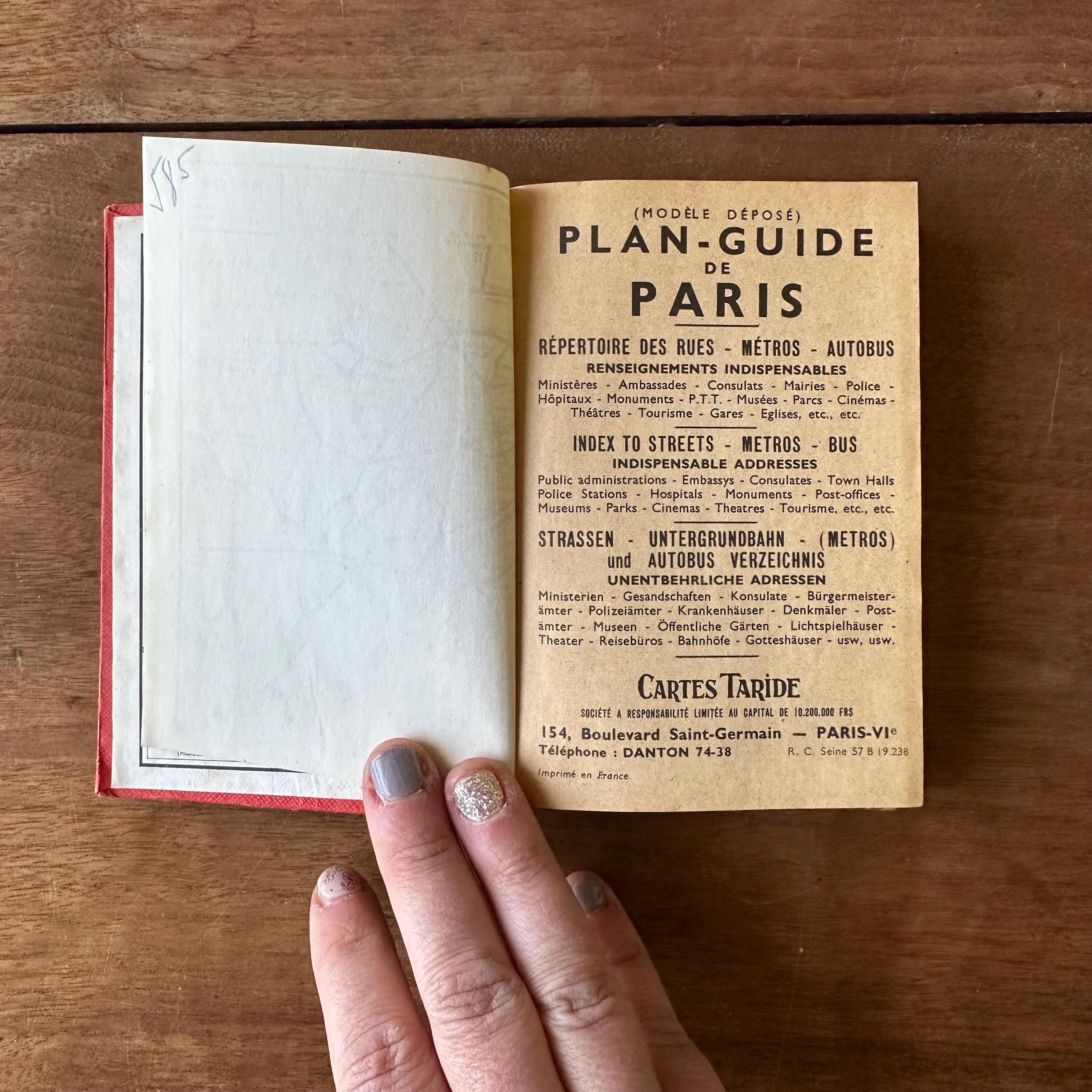 This is the vintage 1959 edition of Paris Par Arrondissement of the Collection des Guides et Plans Taride. It is a guide of metro and autobus maps to get around Paris, written in French. It is has red covers with silver lettering and an illustration of the Arc de Triomphe. The spine is also lettered in gold. The book is filled with full color and black and white illustrated maps of the metro and autobus routes divided by arrondissement or neighborhoods. There are separate color-coded sections.