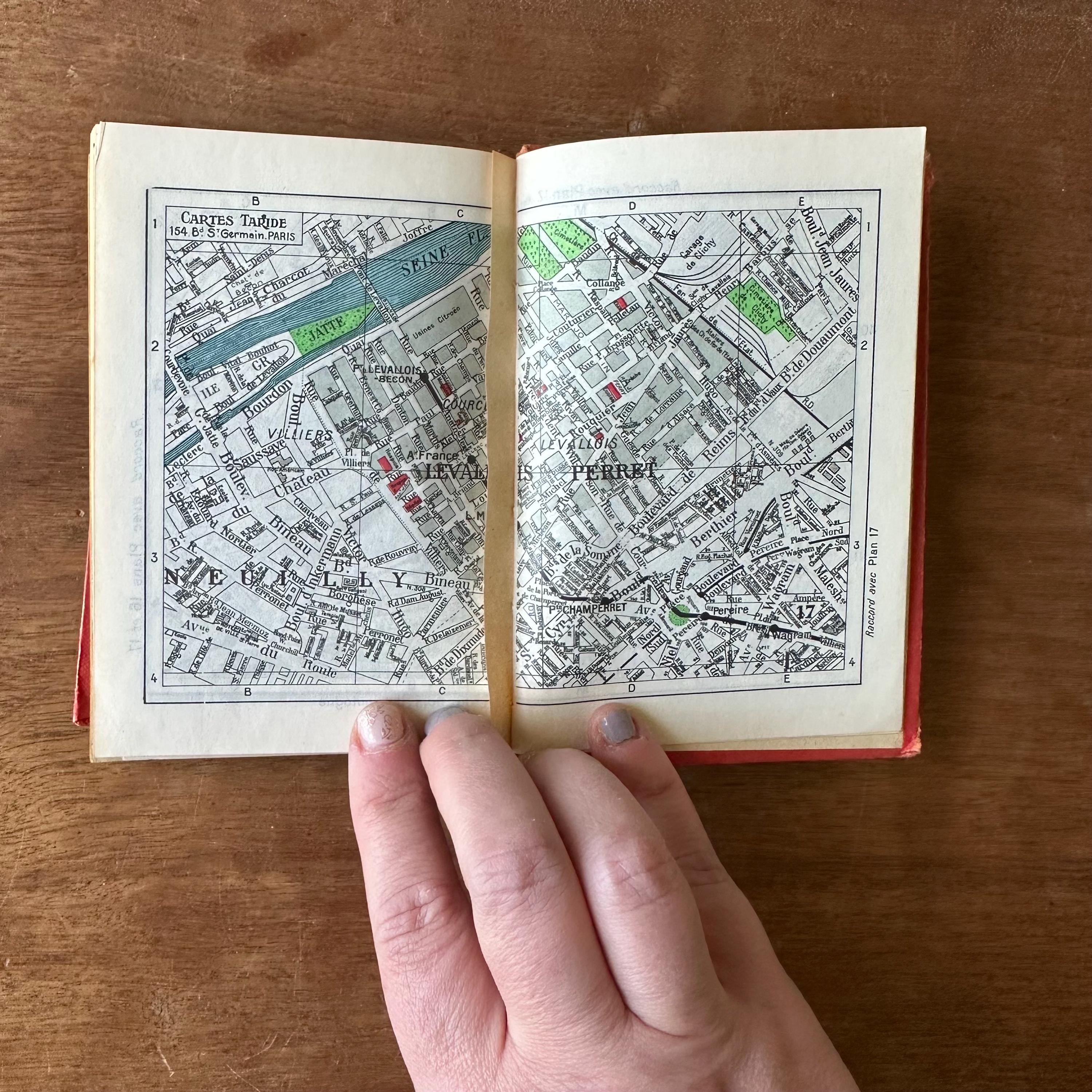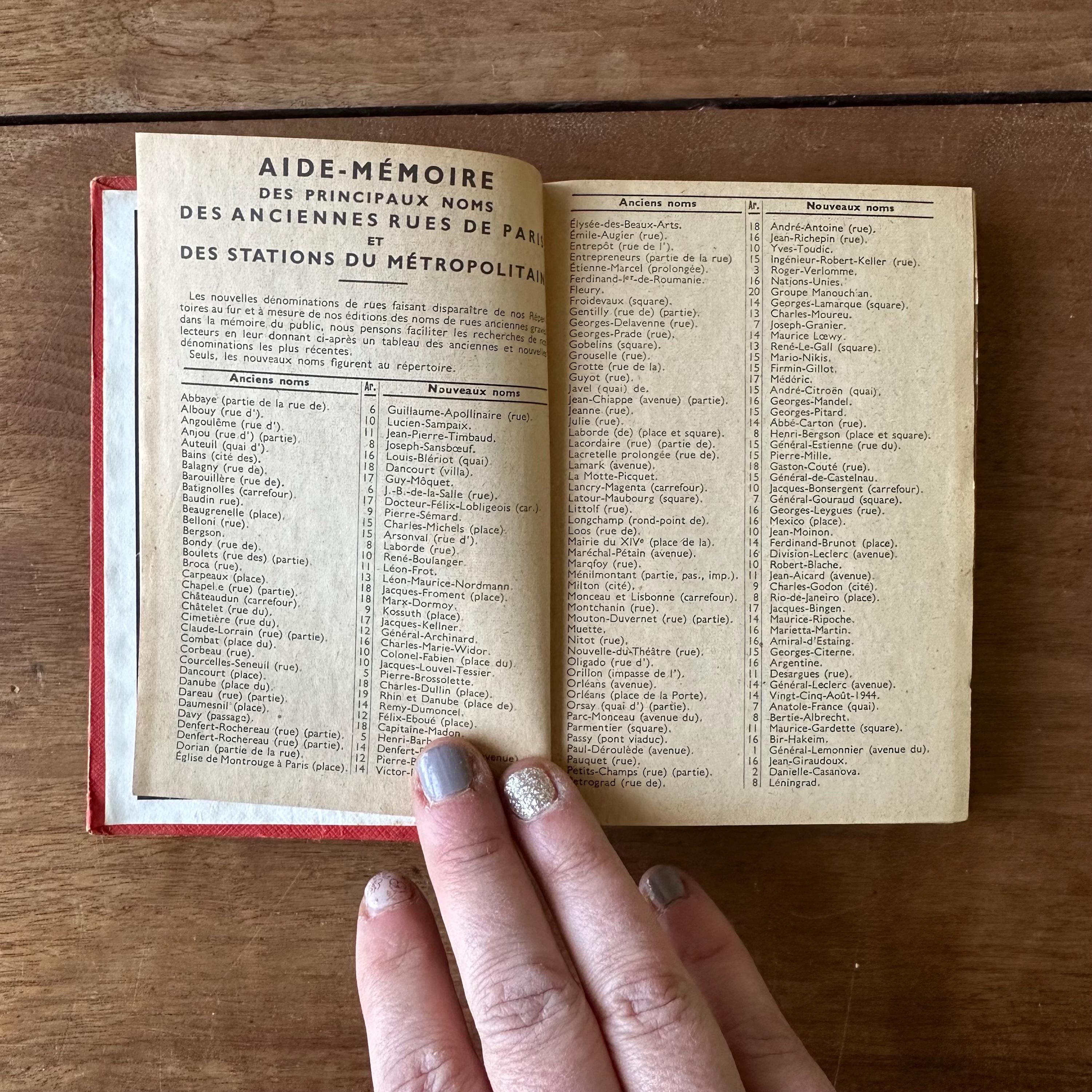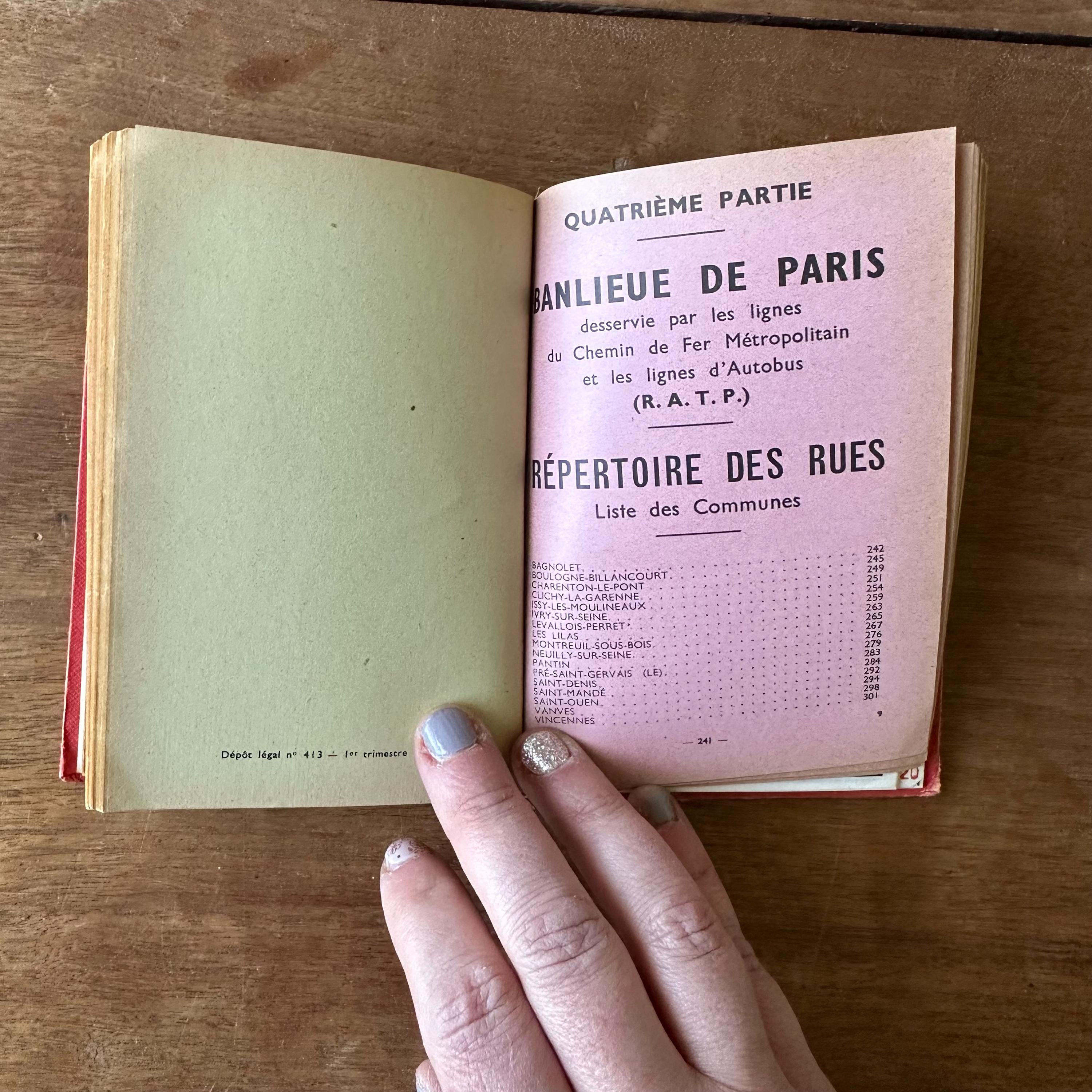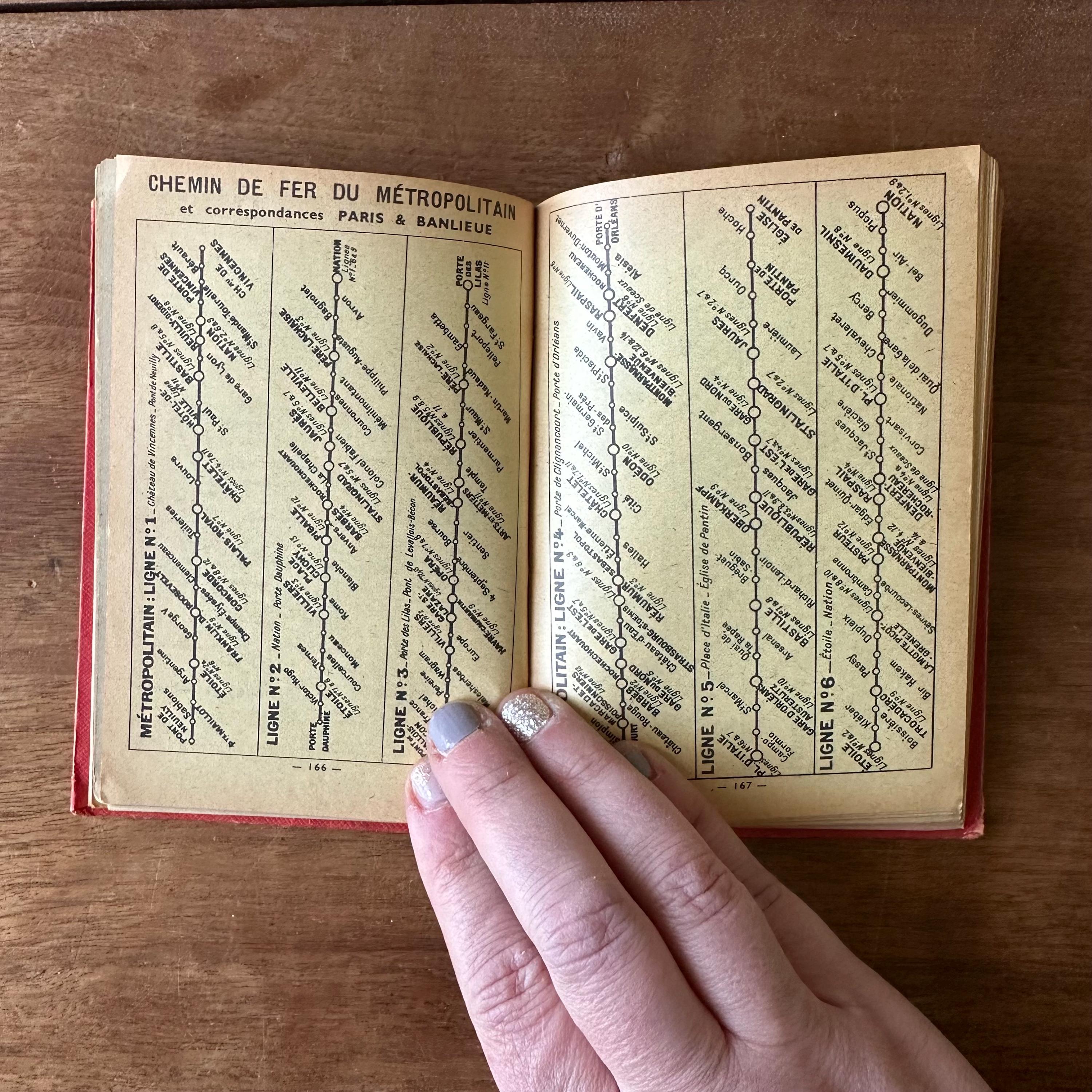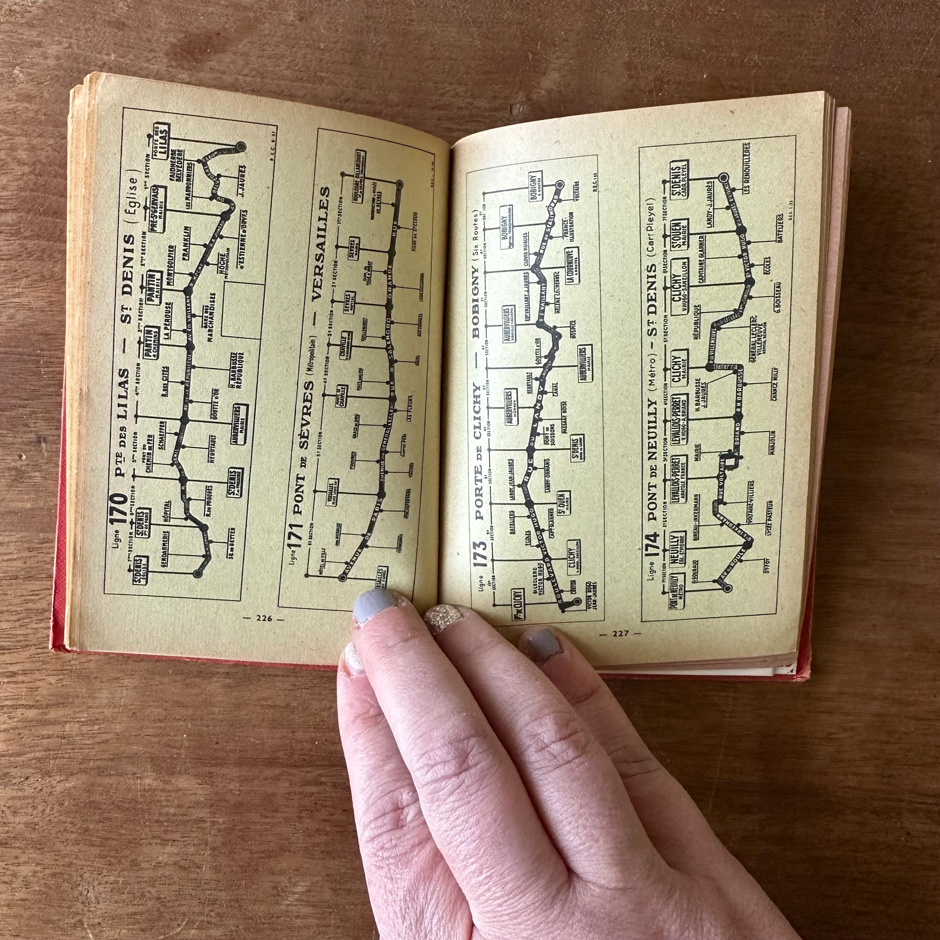 This is the vintage 1959 edition of Paris Par Arrondissement of the Collection des Guides et Plans Taride. It is a guide of metro and autobus maps to get around Paris, written in French. It is has red covers with silver lettering and an illustration of the Arc de Triomphe. The spine is also lettered in gold. The book is filled with full color and black and white illustrated maps of the metro and autobus routes divided by arrondissement or neighborhoods. There are separate color-coded sections.