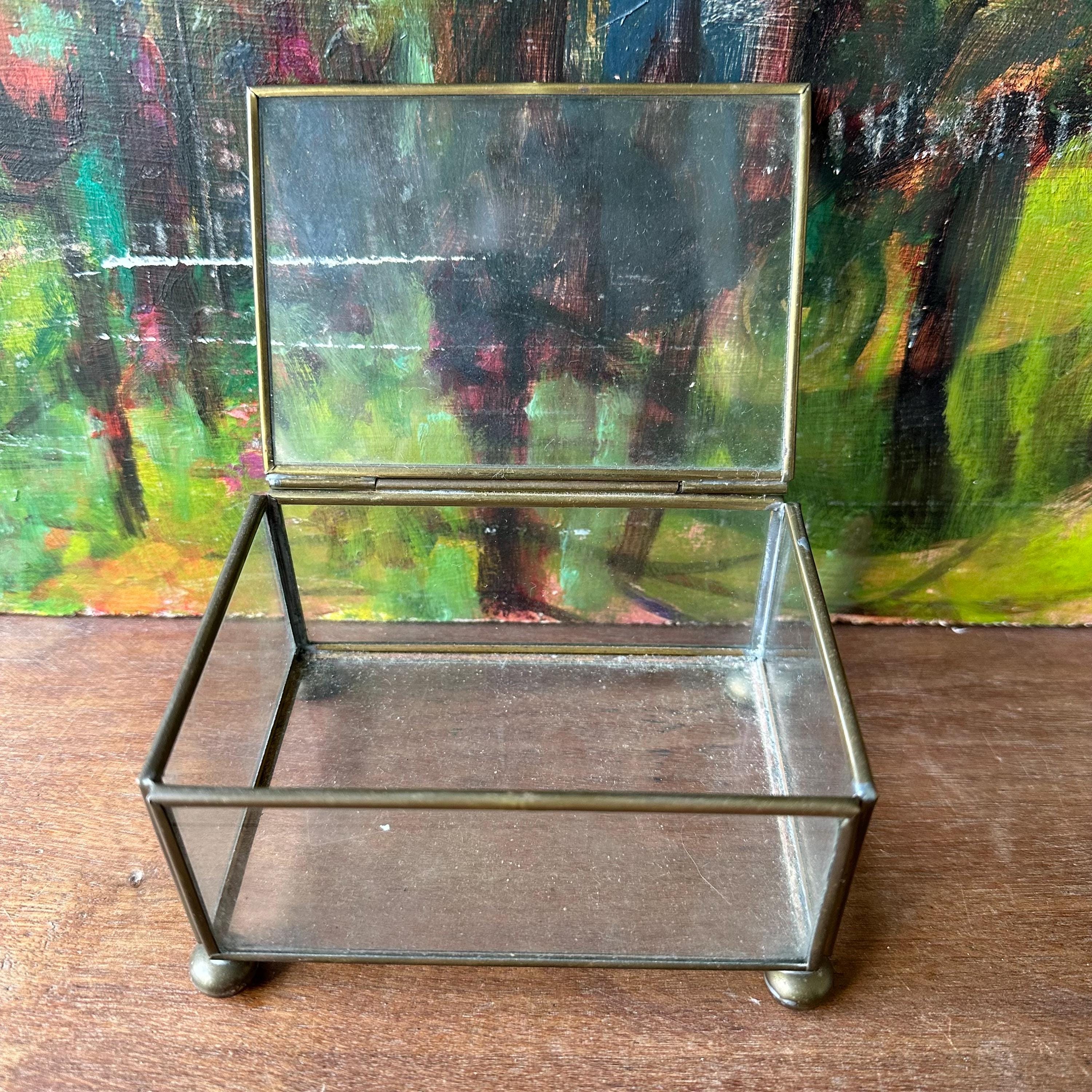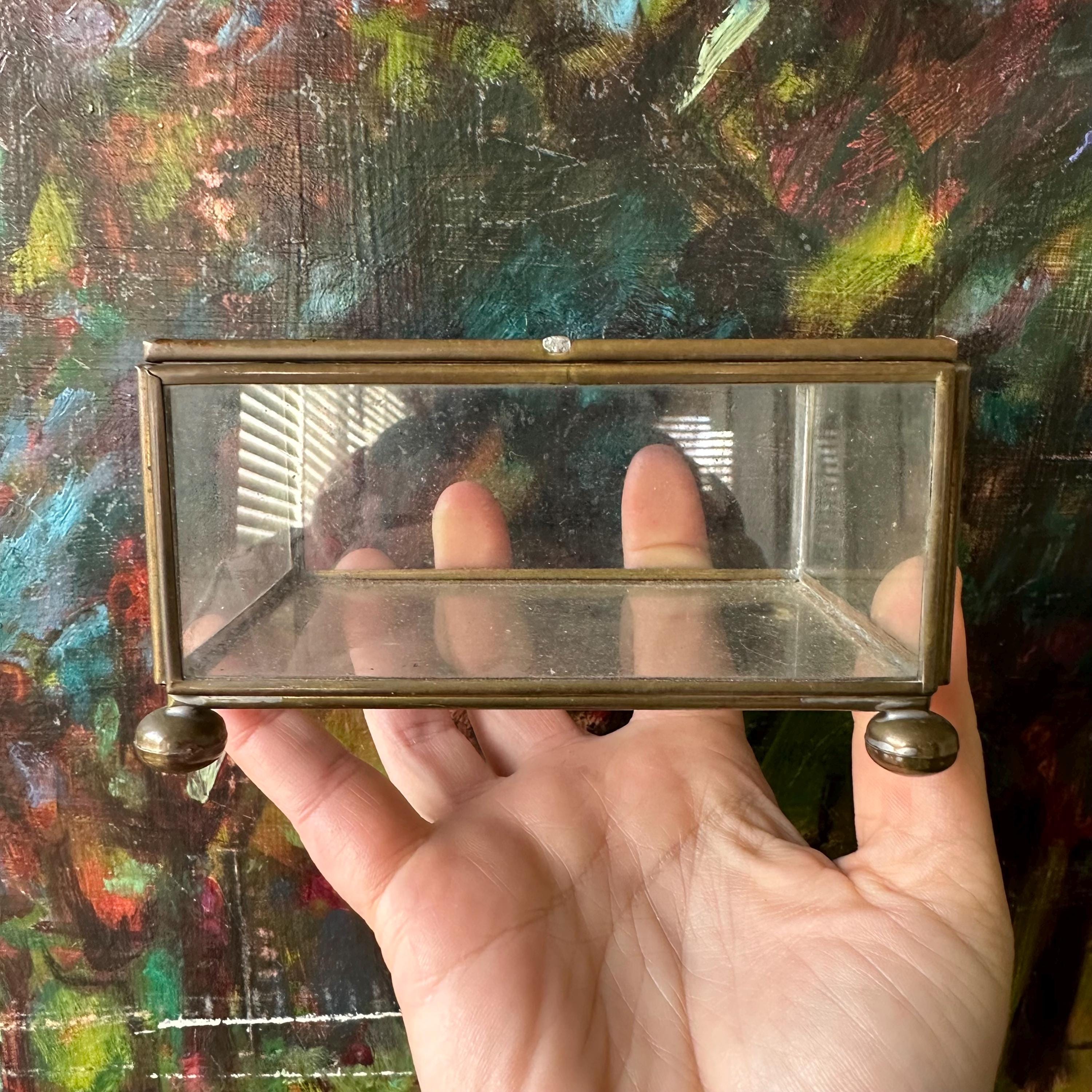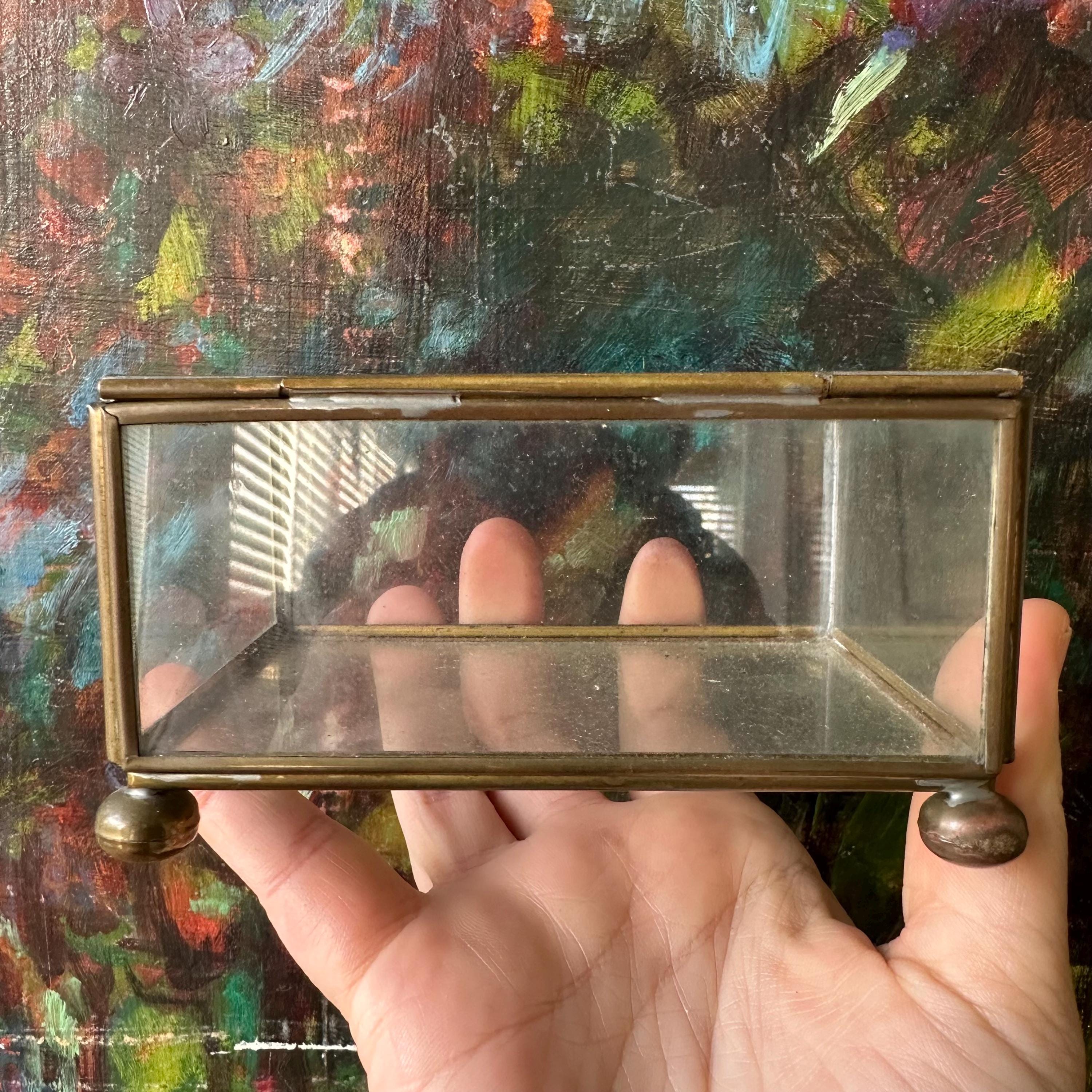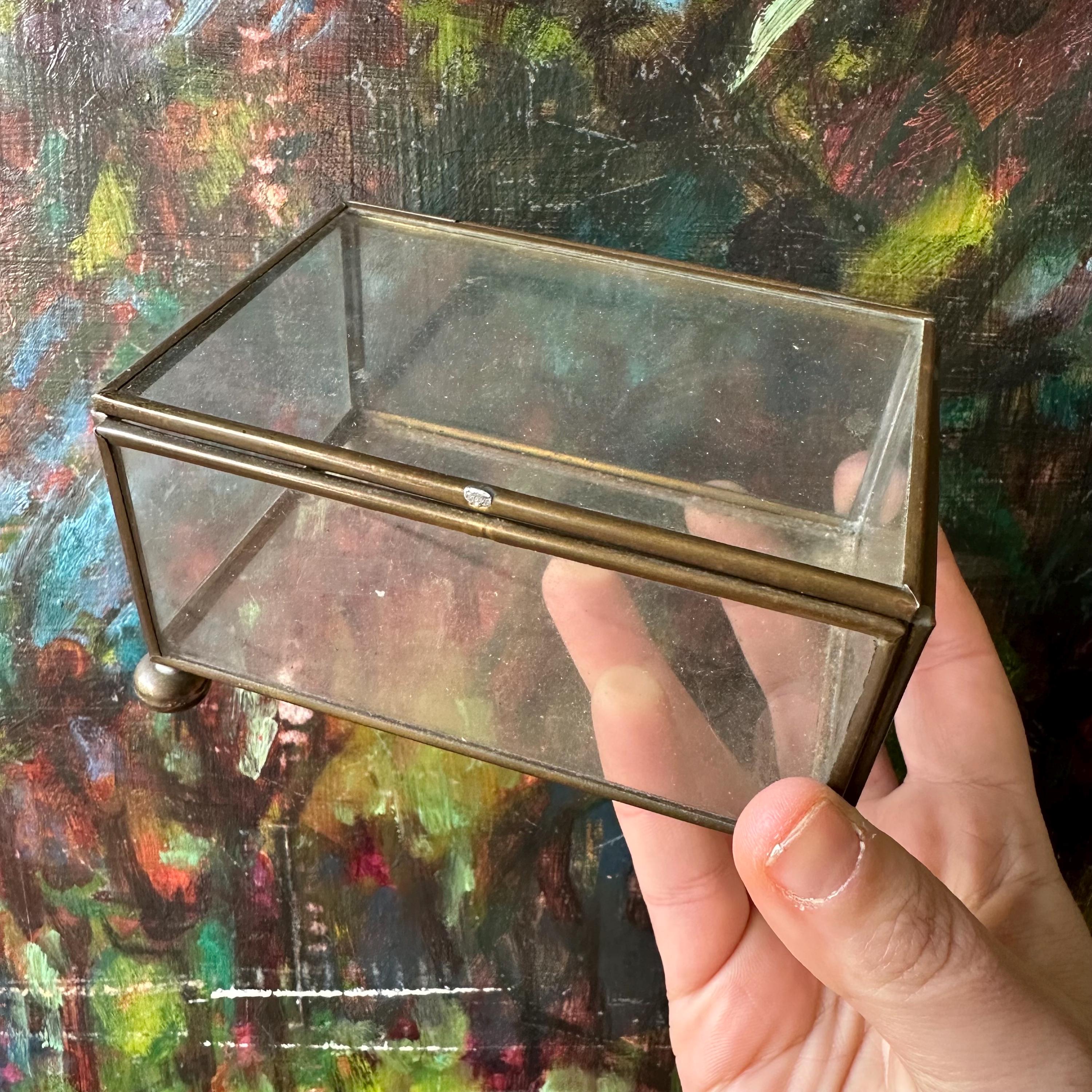 This is a rectangle-shaped glass and brass display box. The box has a hinged lid. The lid, bottom, and sides of the box are clear glass with edging in brass. The box has four brass ball feet. This would make for a nice shadow box or display case.