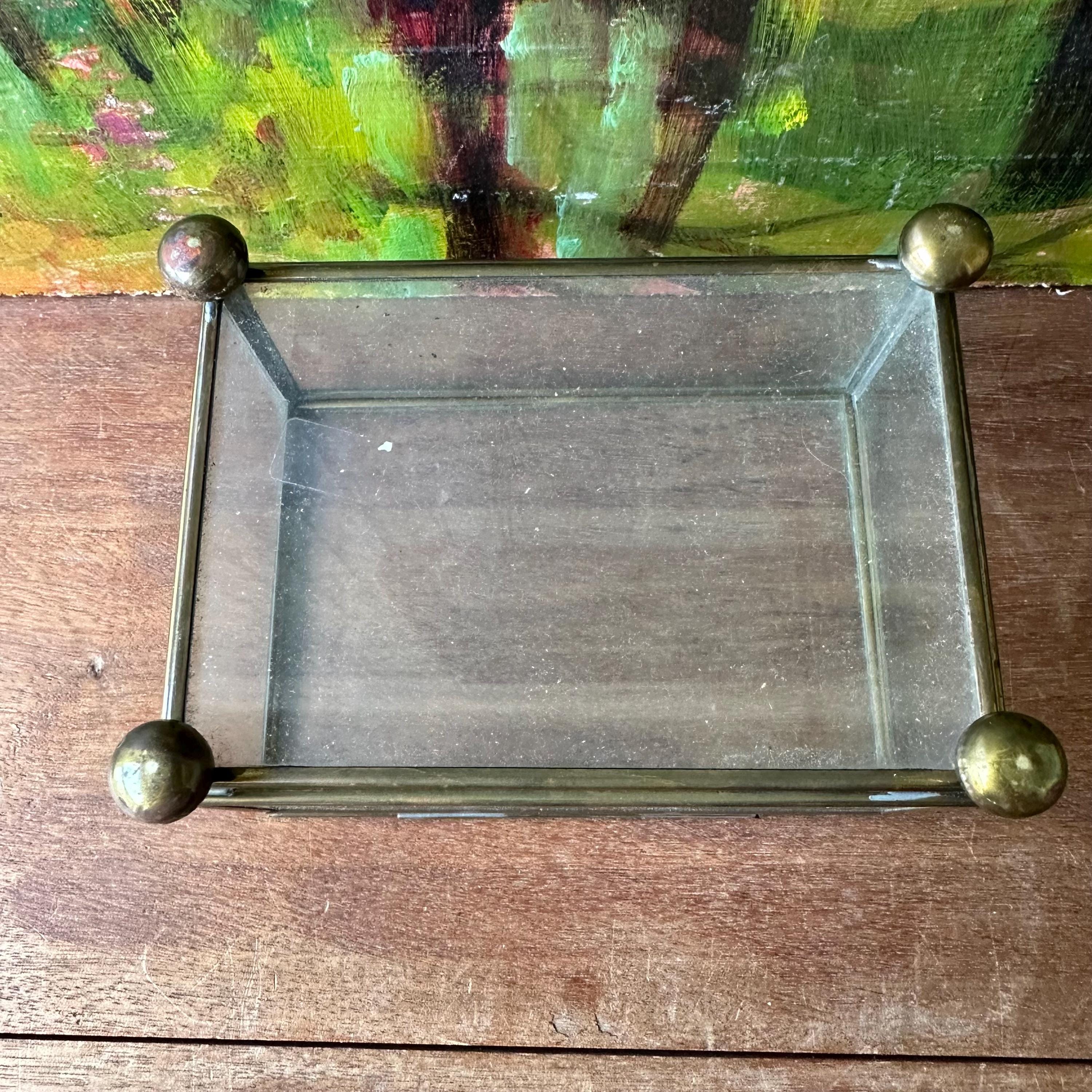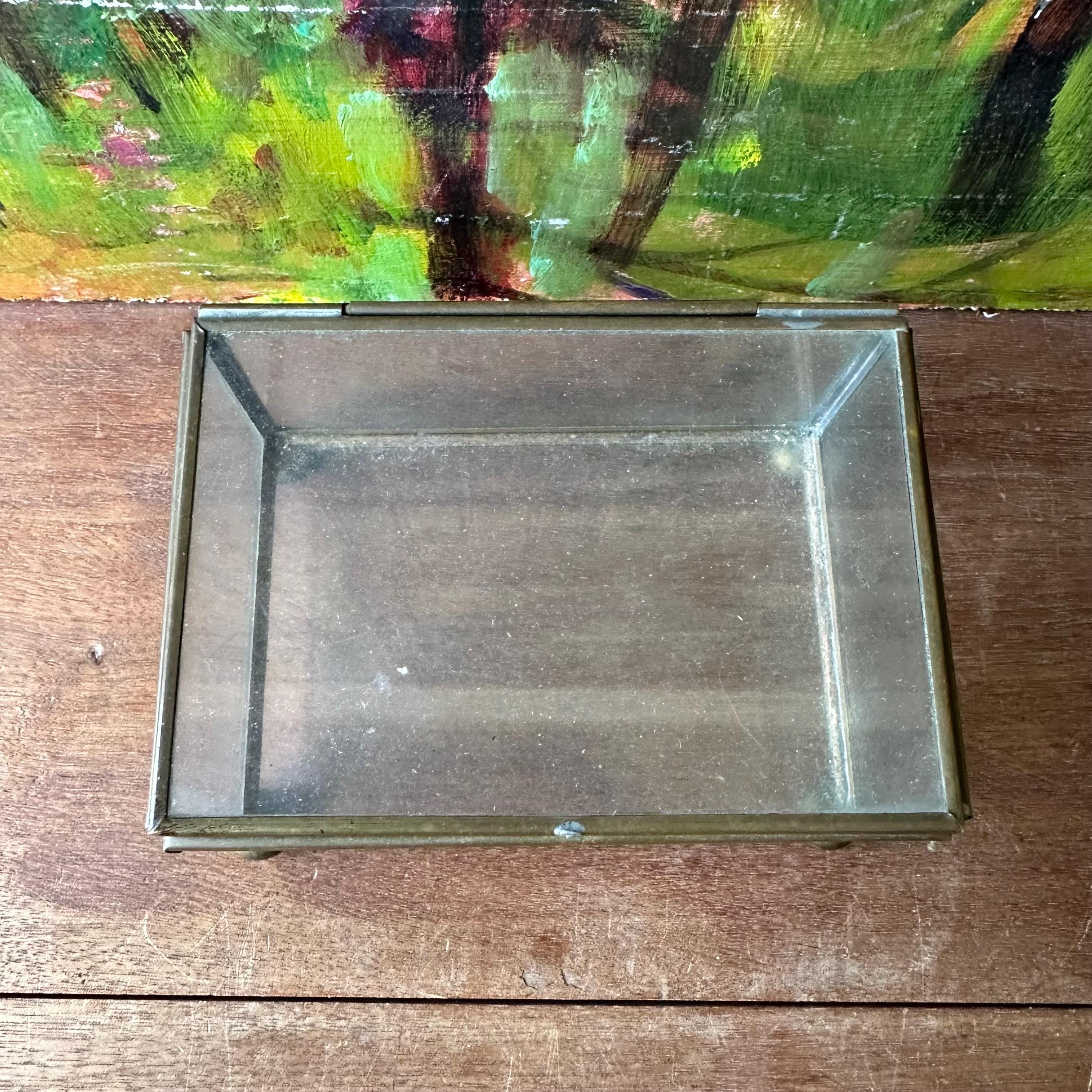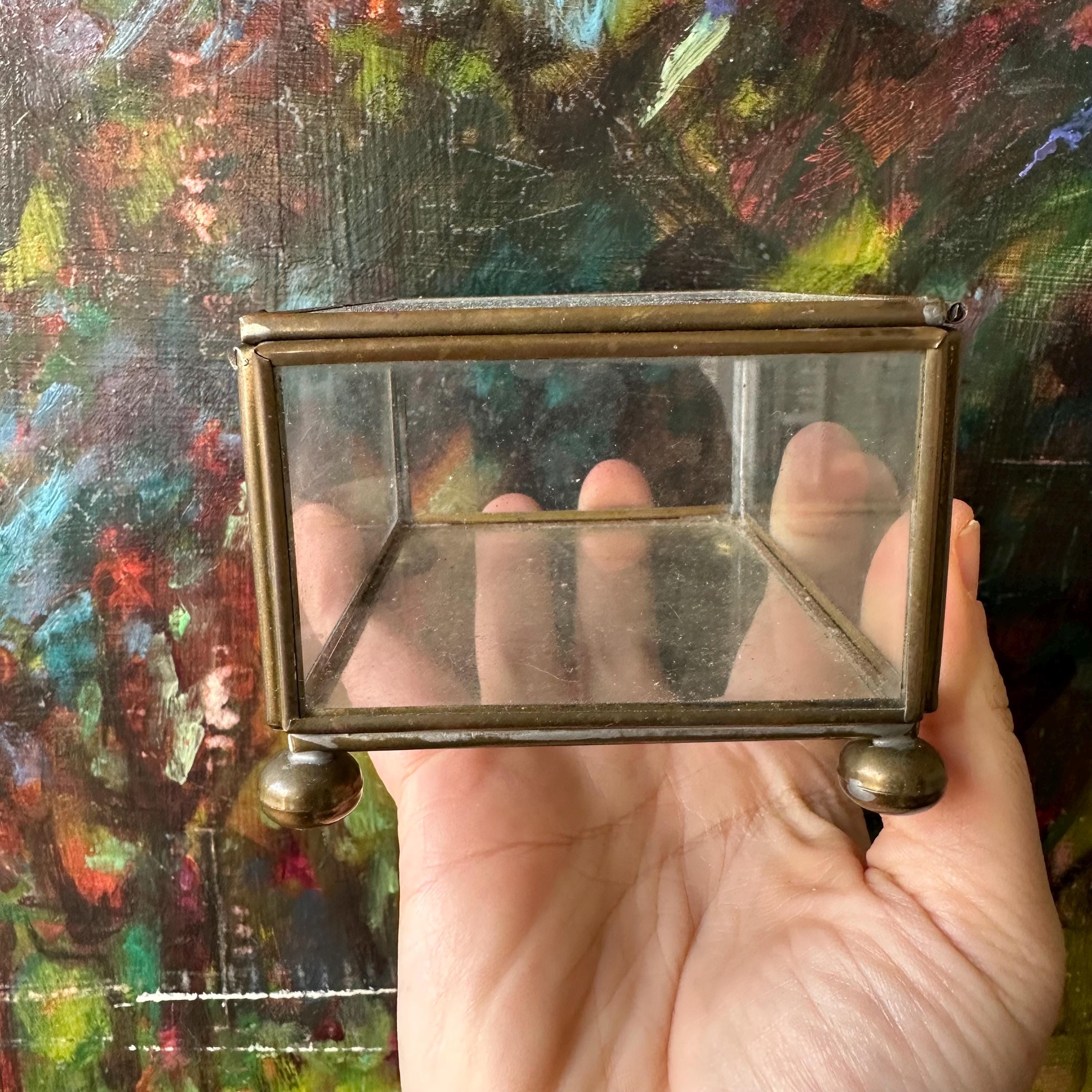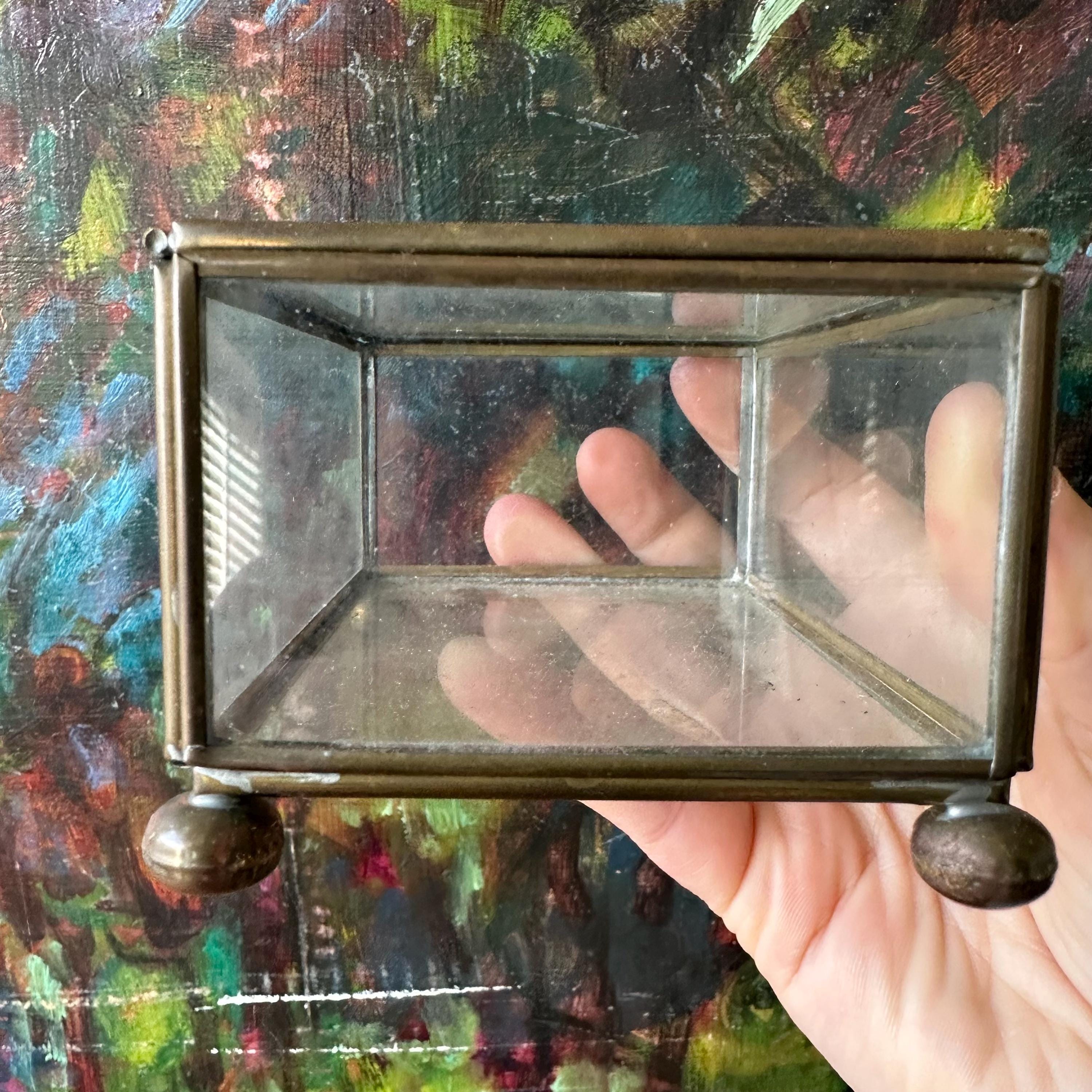 This is a rectangle-shaped glass and brass display box. The box has a hinged lid. The lid, bottom, and sides of the box are clear glass with edging in brass. The box has four brass ball feet. This would make for a nice shadow box or display case.